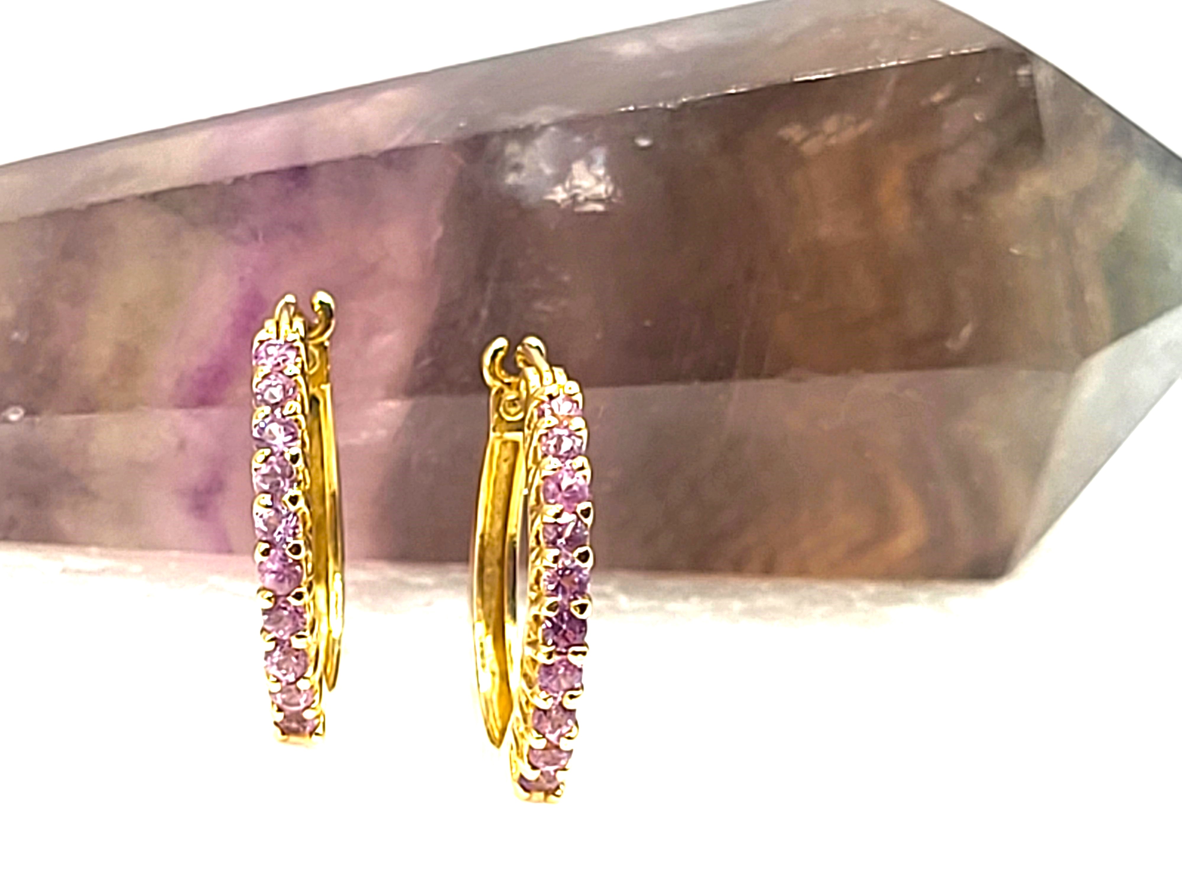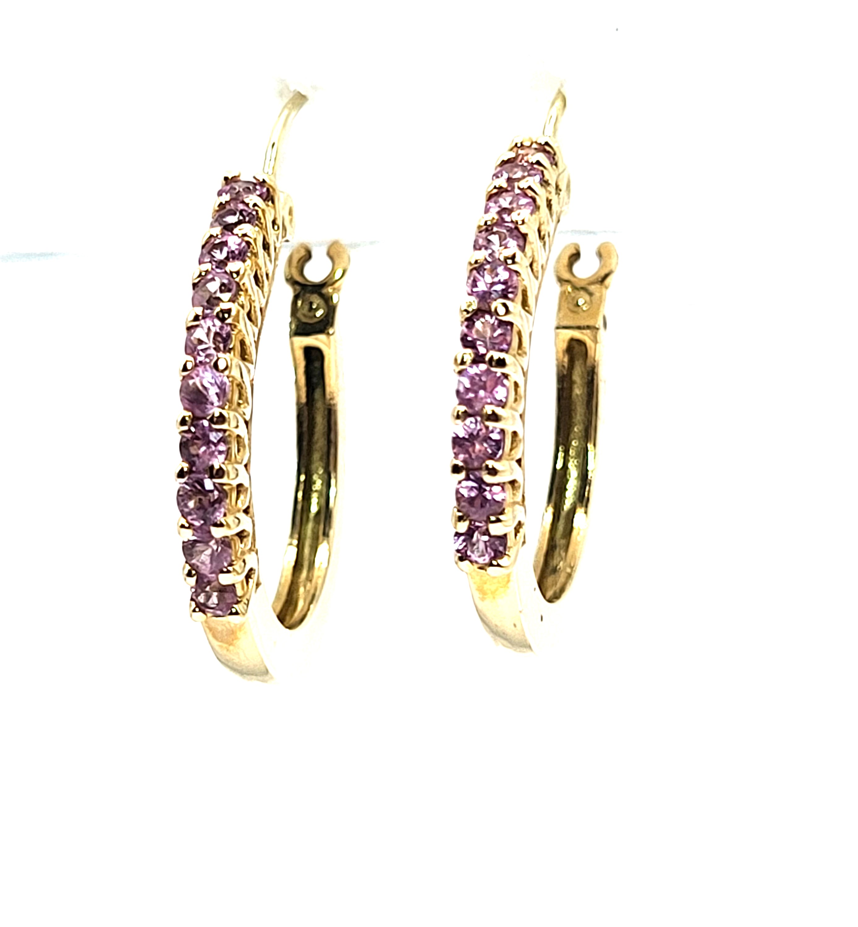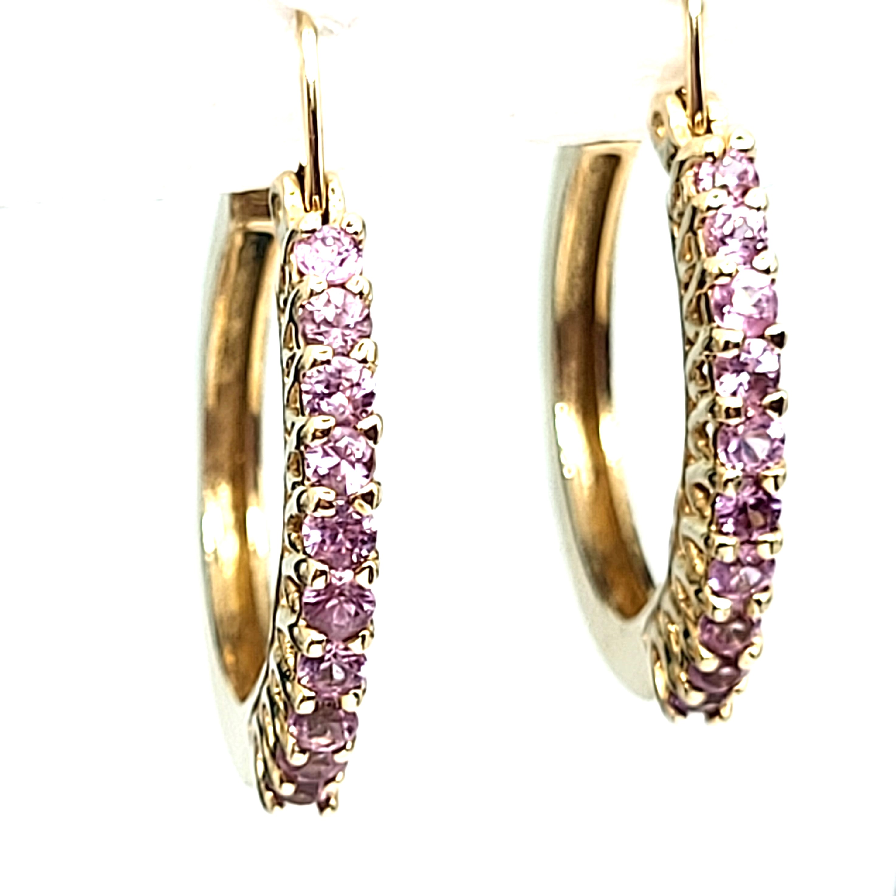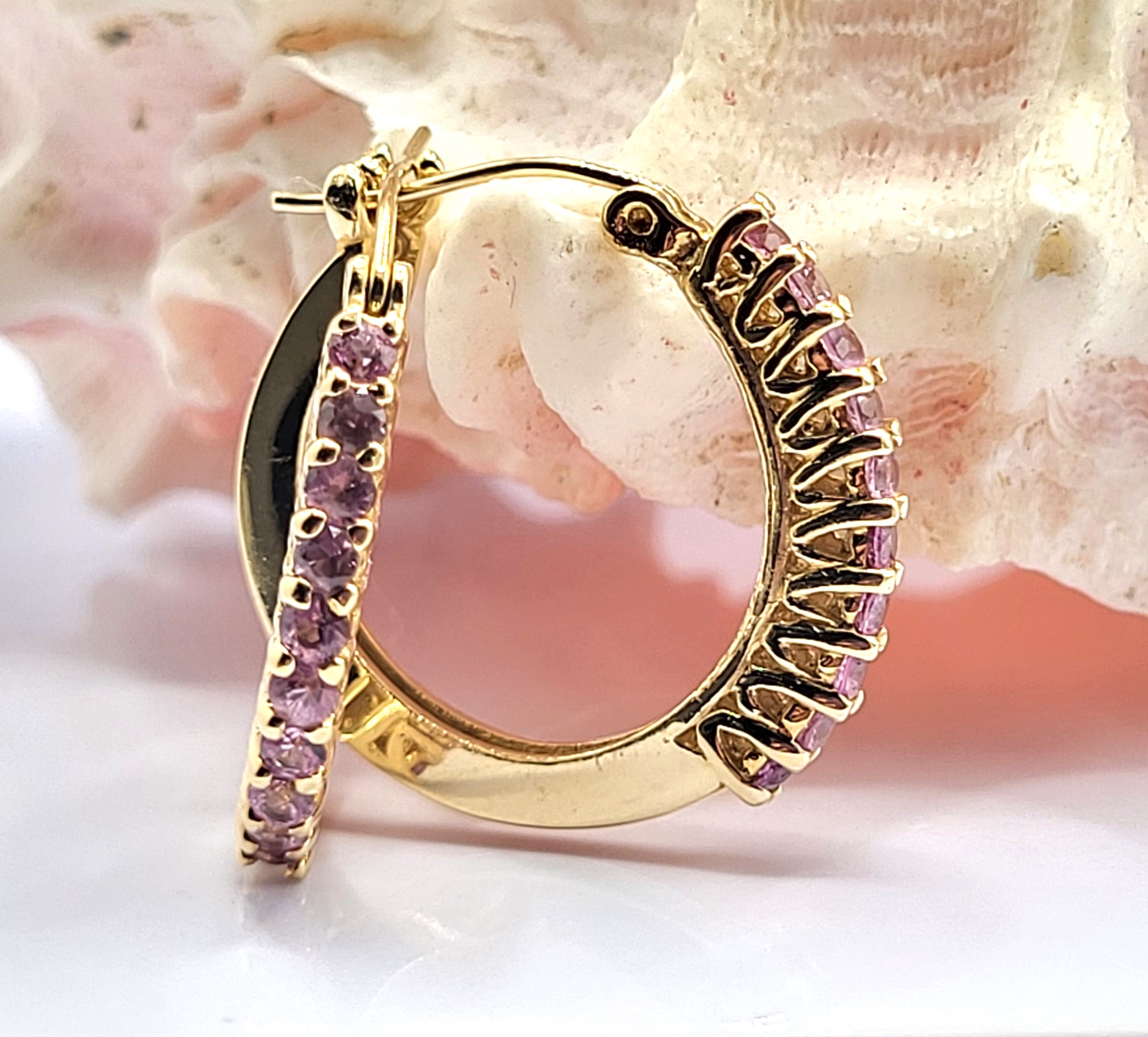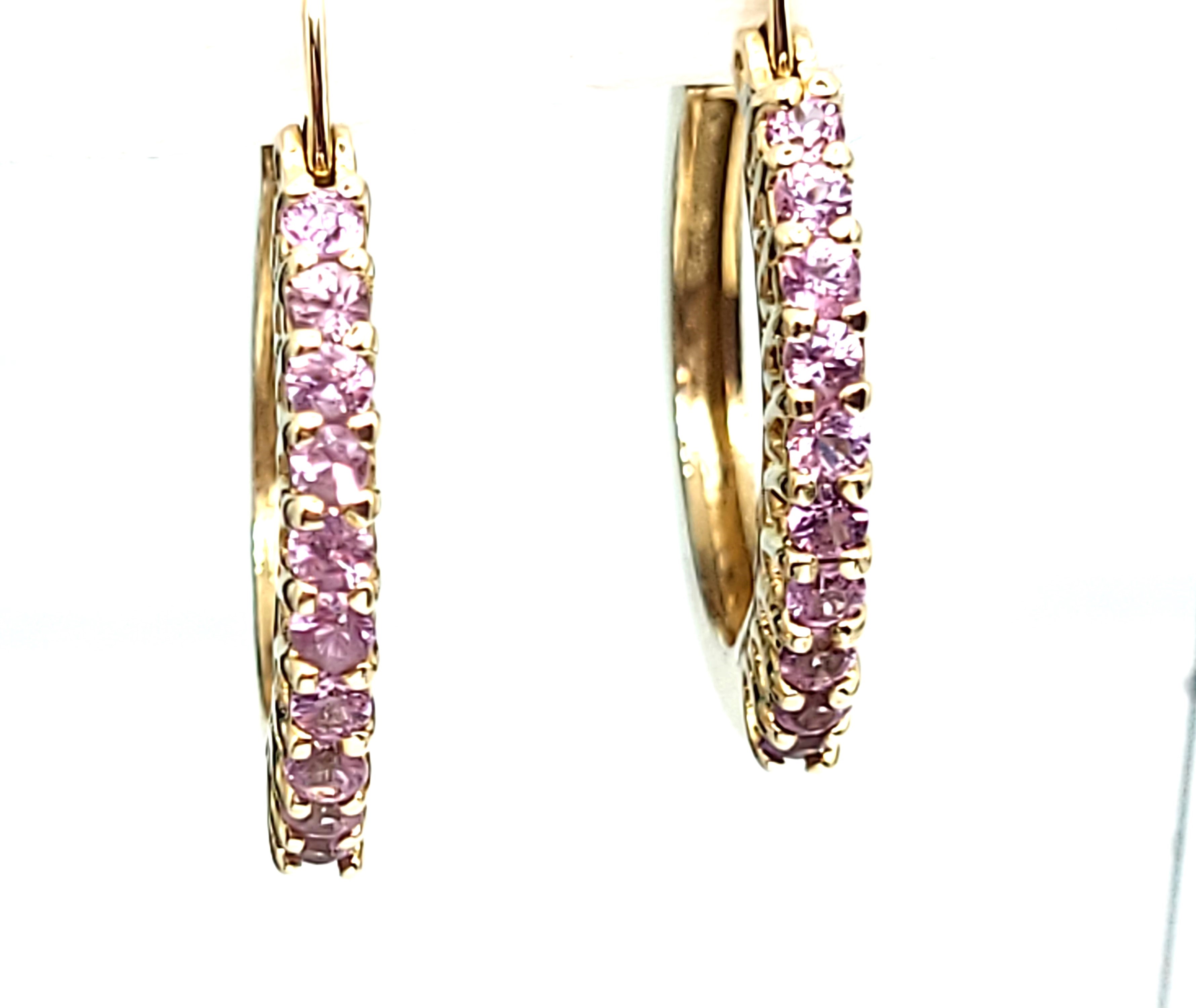 What a great pair of earrings for everyday wear! They are a modest size, at 3/4" diameter, yet sturdy, at 2mm wide and 2.38mm thick. These 14 karat yellow gold earrings have .85 carats total weight of round faceted, prong-set, genuine pink sapphires along the fronts. These earrings attach to the earlobe with hinged posts that lock in the back. Both earrings have a very solid "snap" upon closing! This is a brand new item with manufacturer’s approval to sale in a public auction. It is in excellent condition, but may have fine scratches from shipping or storage. Admin: G11241/33iit