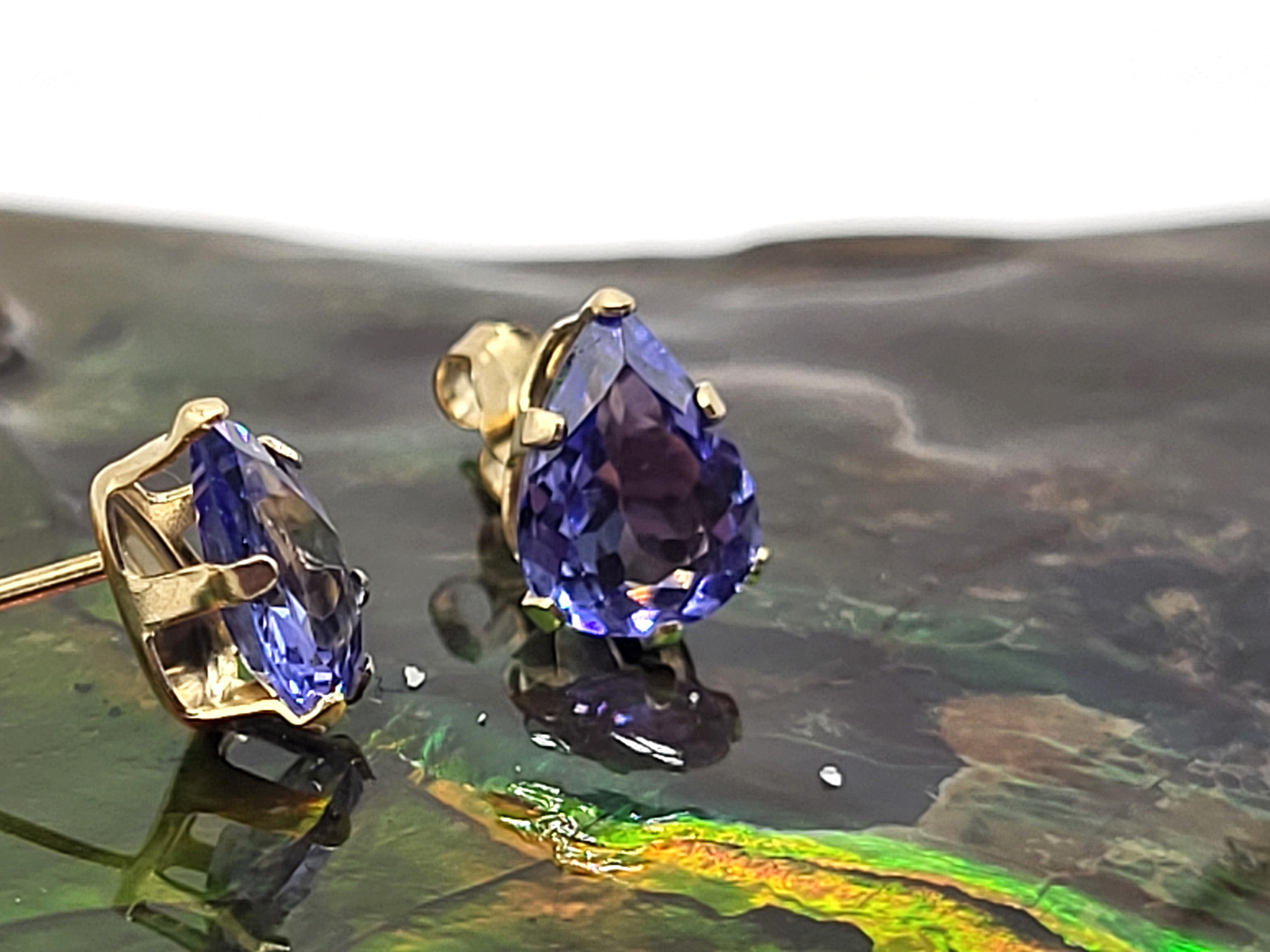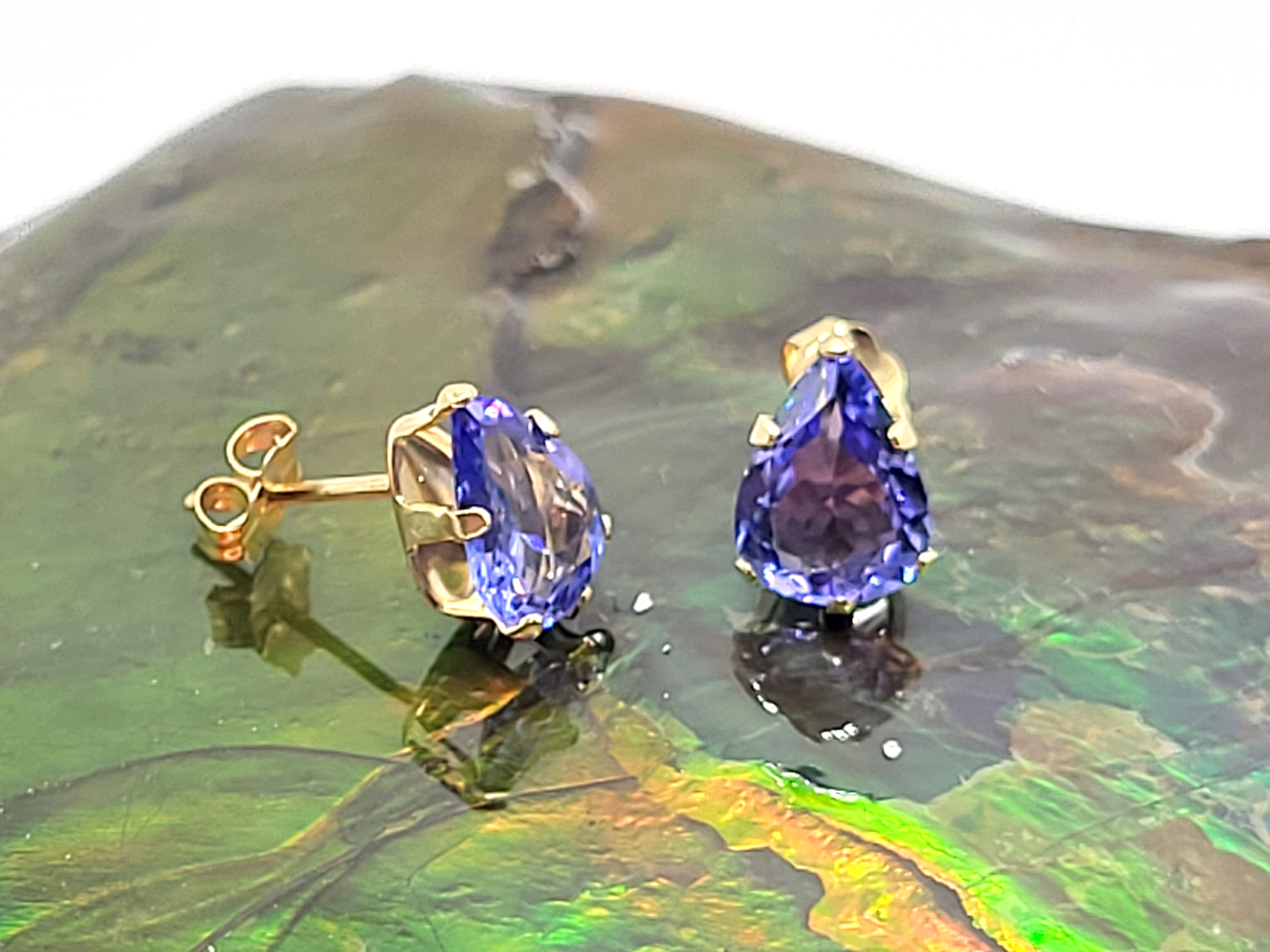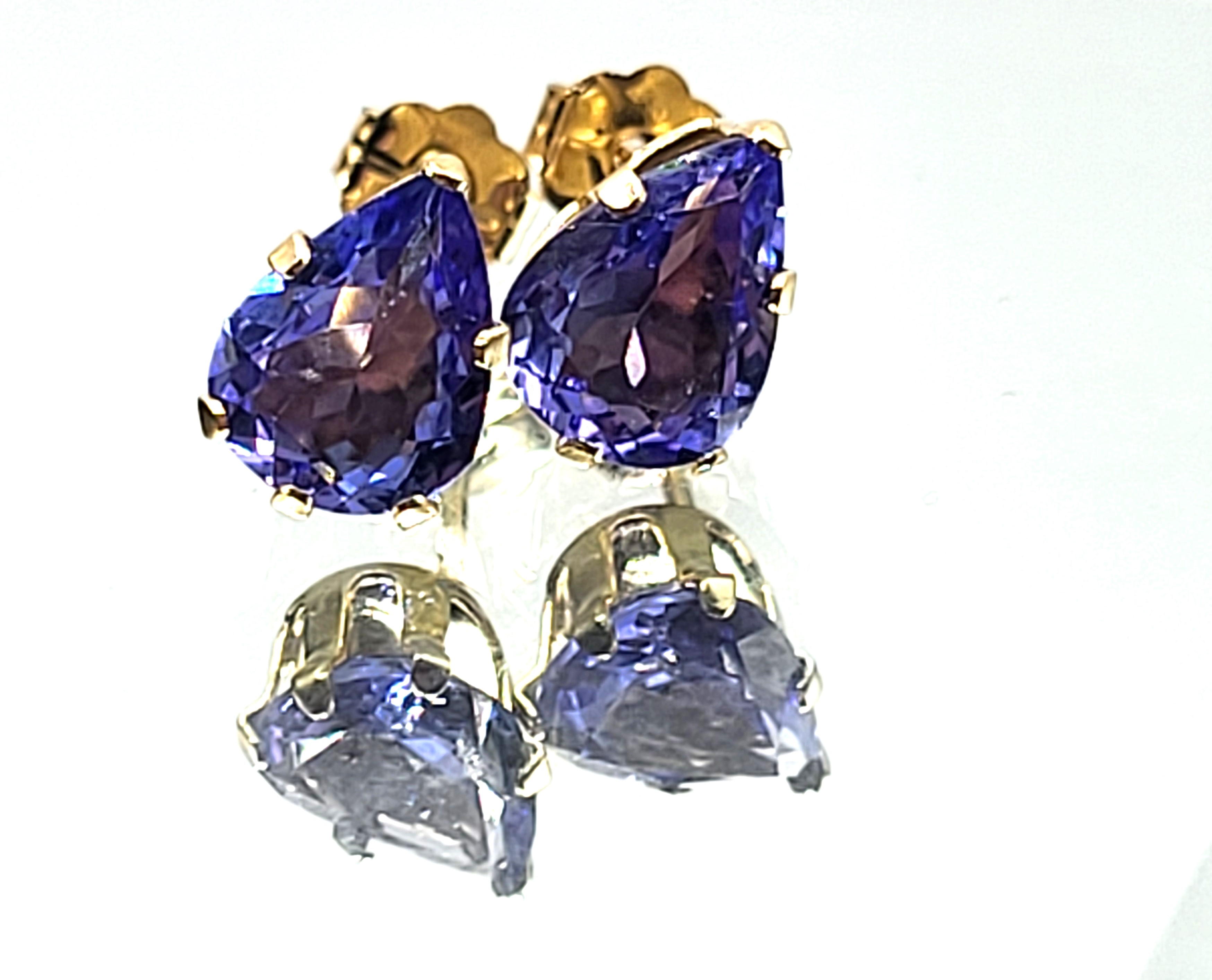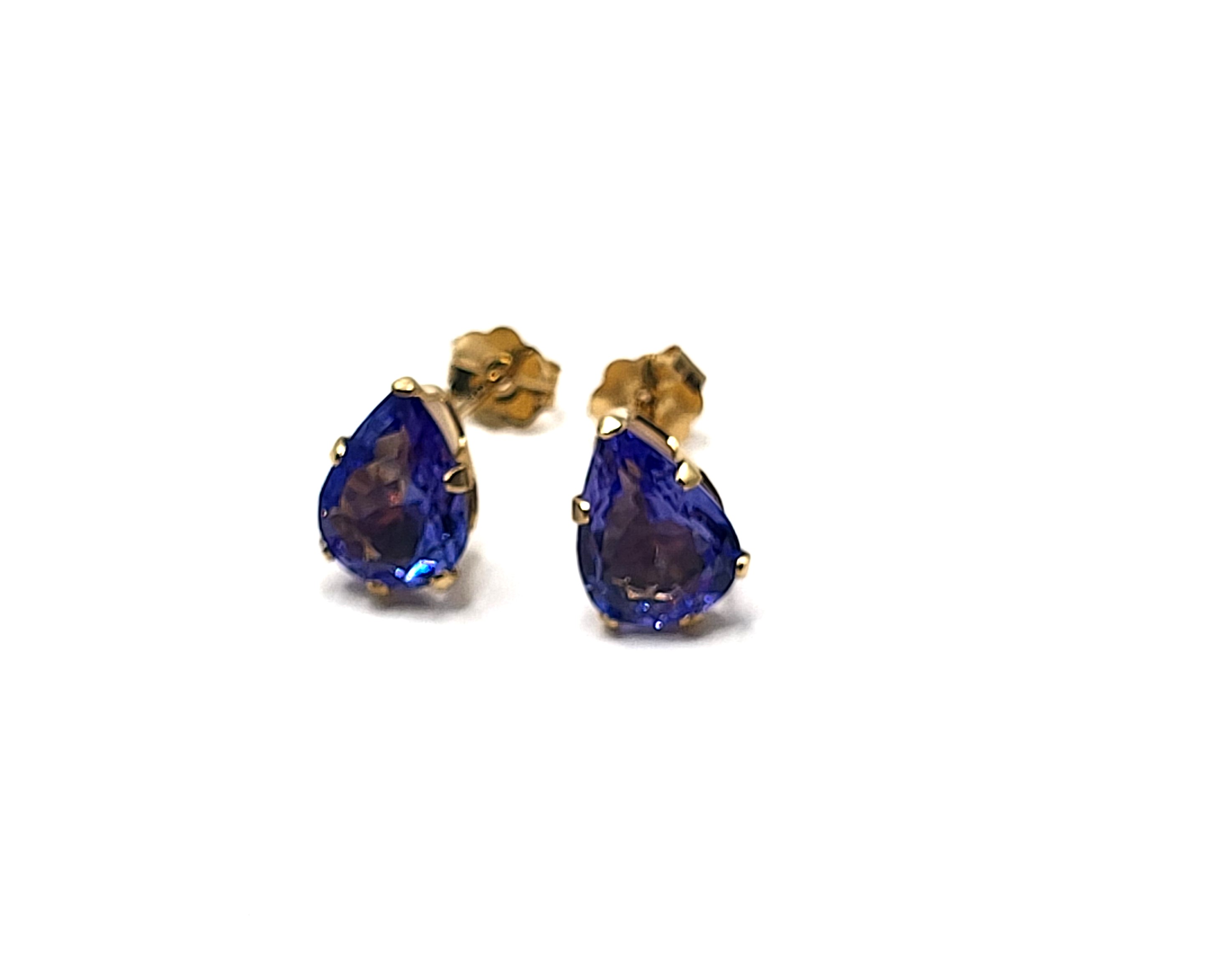 This is a pair of 14 karat yellow gold tanzanite solitaire earrings. Each tanzanite is one-carat, pear-cut, earth-mined, and prong-set. The earrings attach to the earlobe with posts and friction backs. Admin: G11251/28let