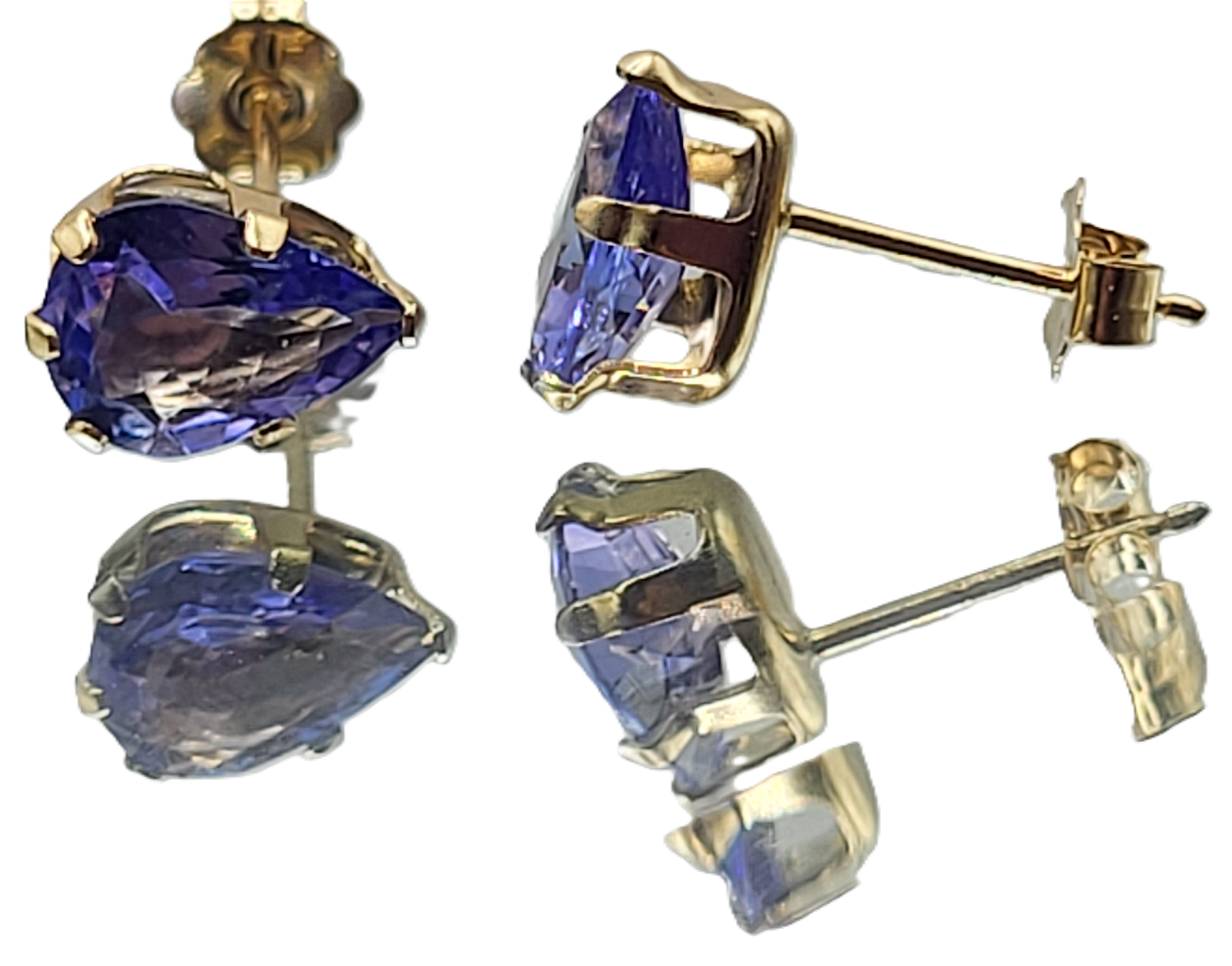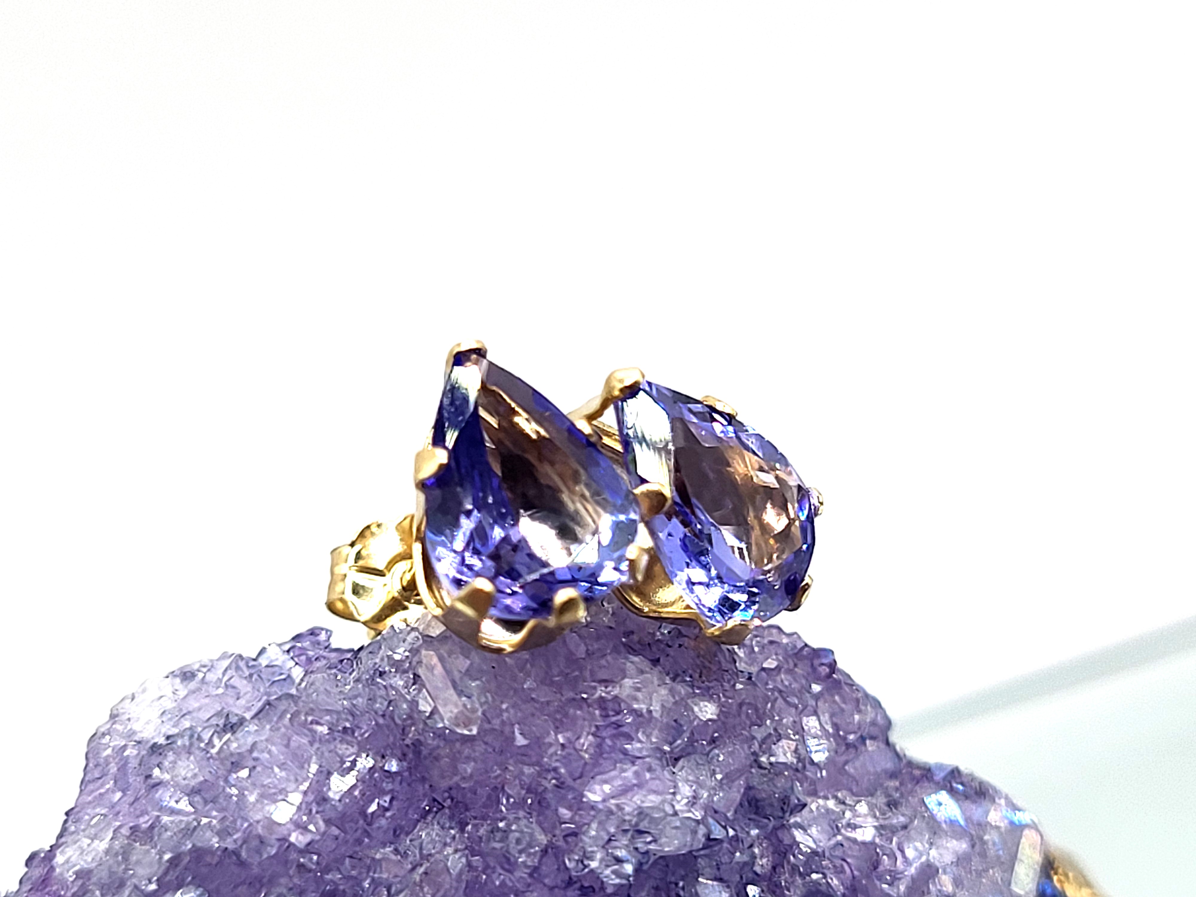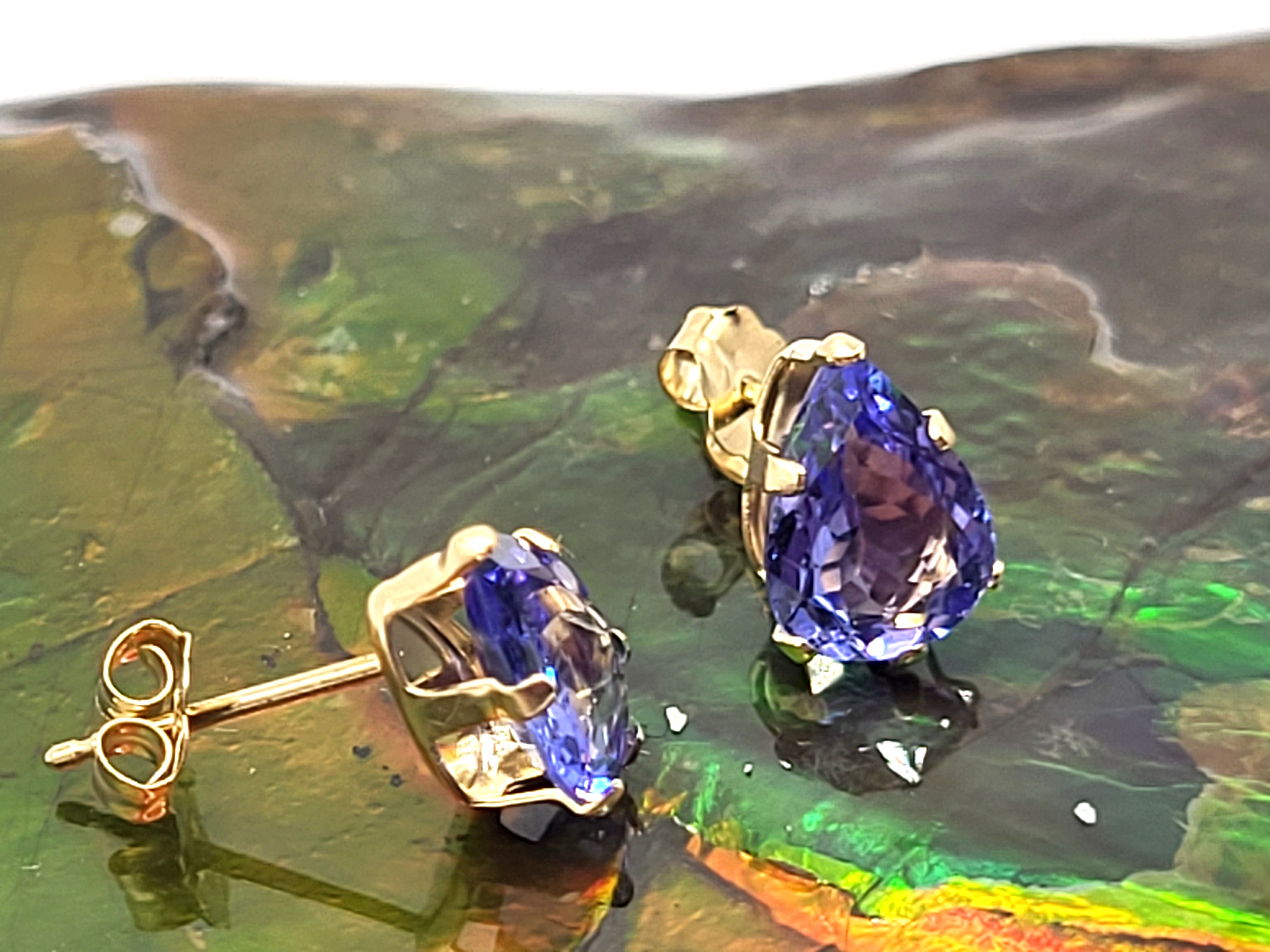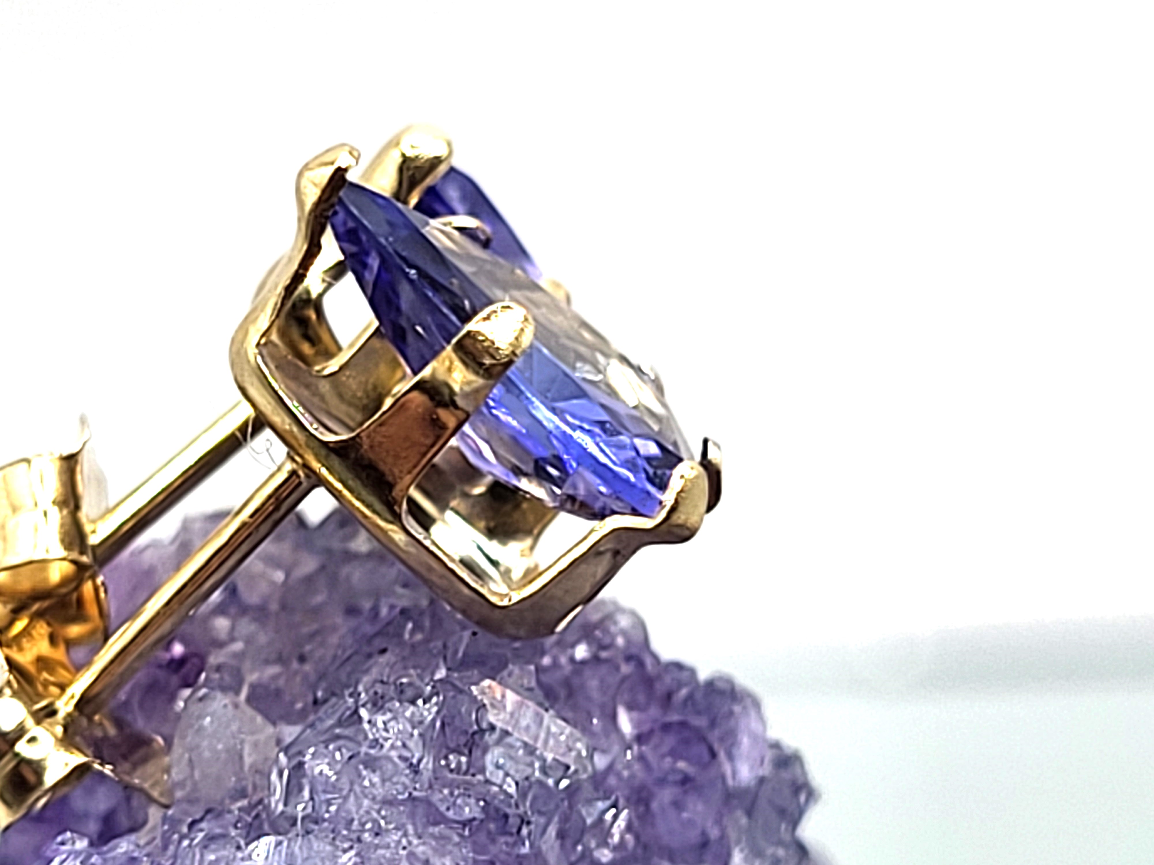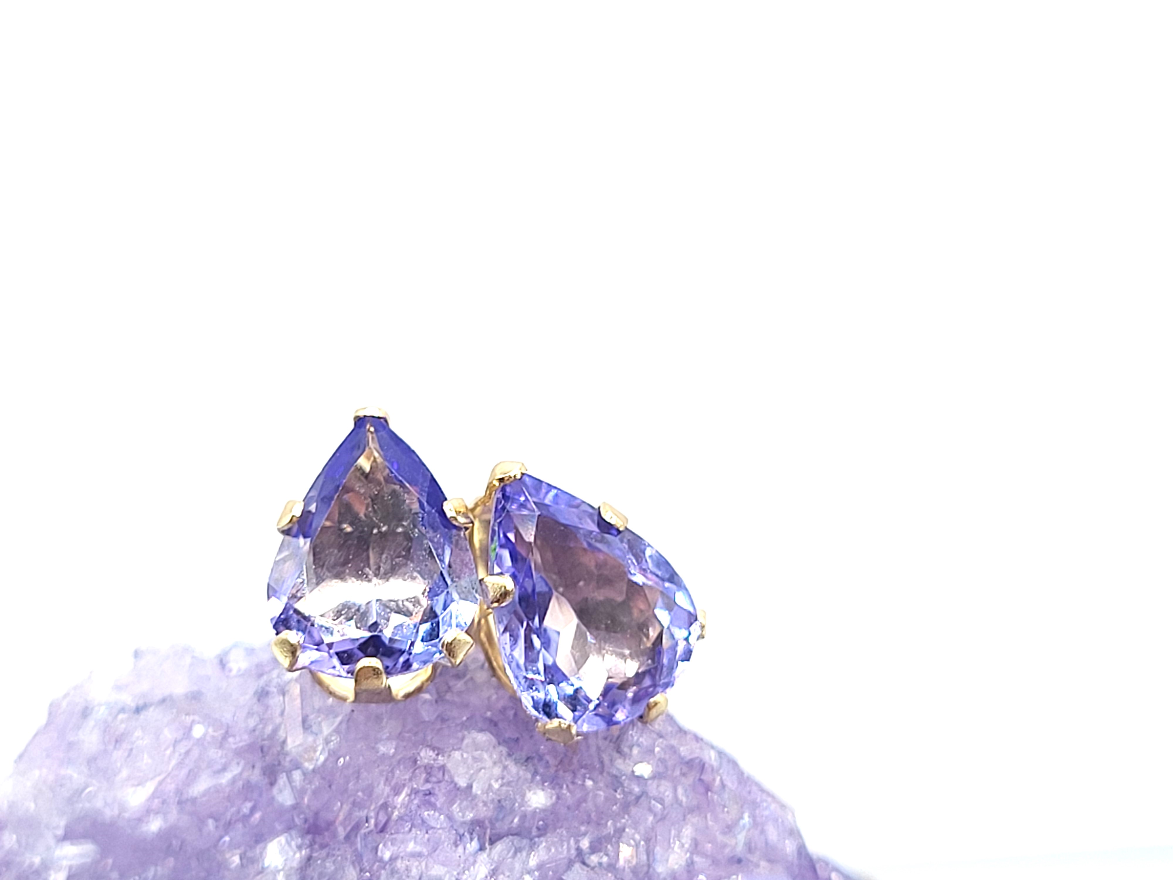 This is a pair of 14 karat yellow gold tanzanite solitaire earrings. Each tanzanite is one-carat, pear-cut, earth-mined, and prong-set. The earrings attach to the earlobe with posts and friction backs. Admin: G11251/28let