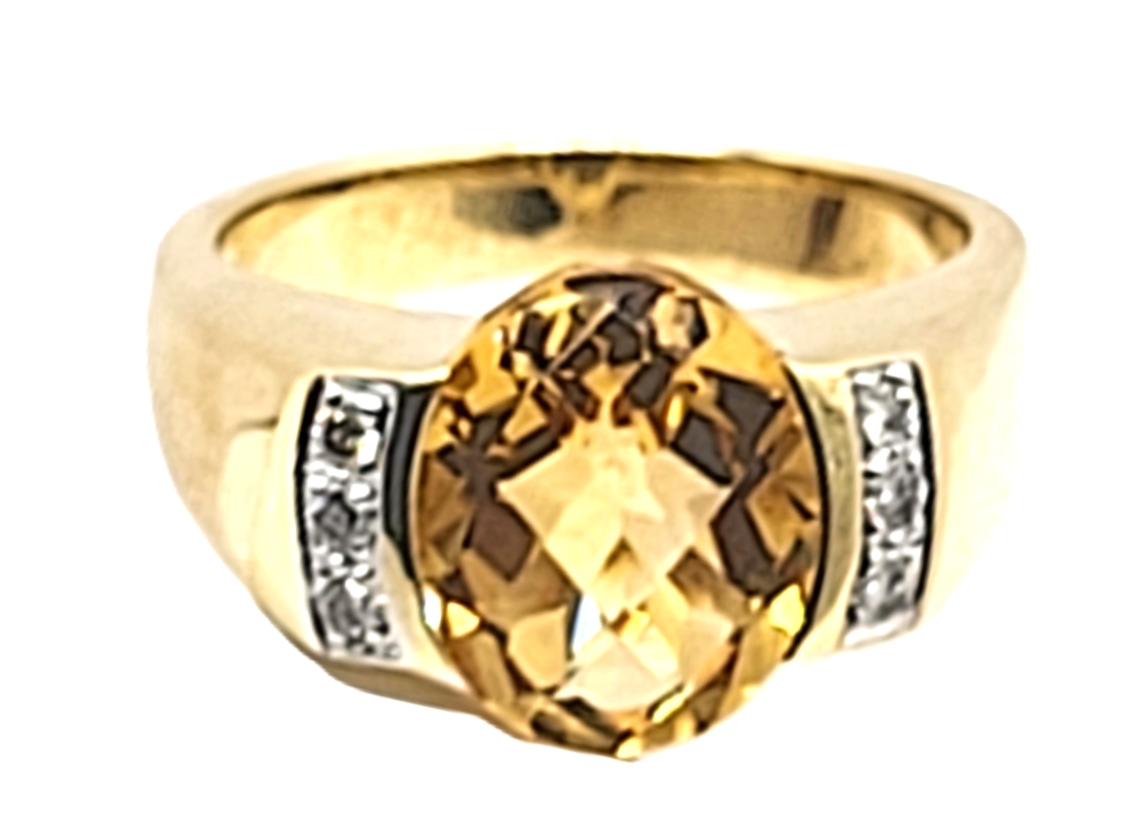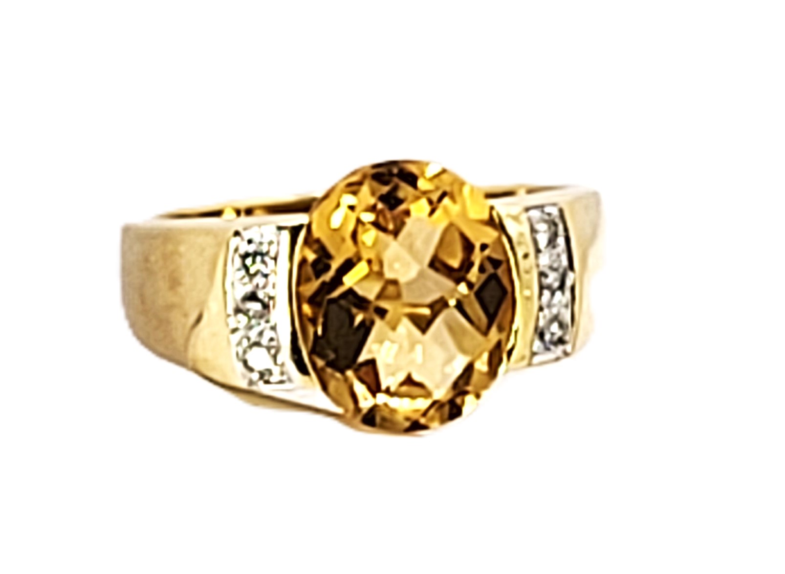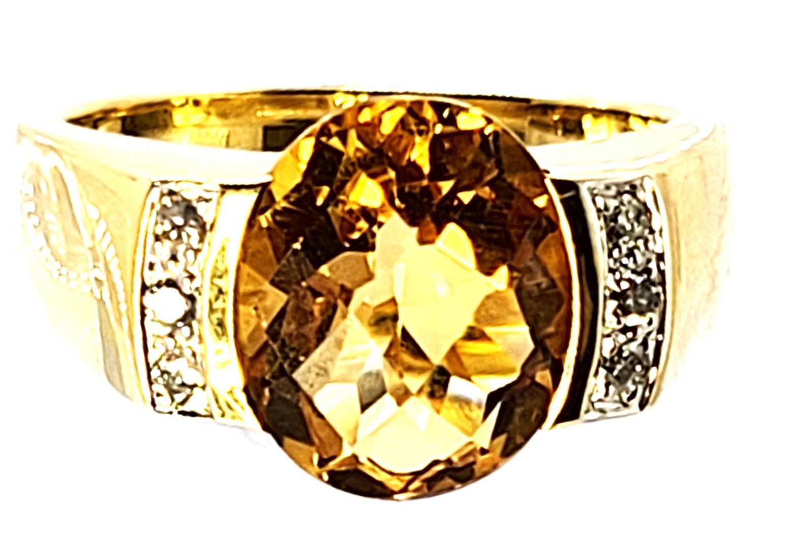 This is a 14 karat yellow gold with an approximate 3.00 carat, oval-cut, top-faceted, semi-bezel set, warm honey-colored citrine with approximately .05 carats total weight of round, brilliant-cut, approximate H-I color, SI2-I1 clarity diamonds on the shoulders.  The ring is approximately 11 x 14 mm on the top and tapers to an approximate 4mm shank. This ring is US size 7 and can be sized for an additional charge.  Admin: 33110/14ieh