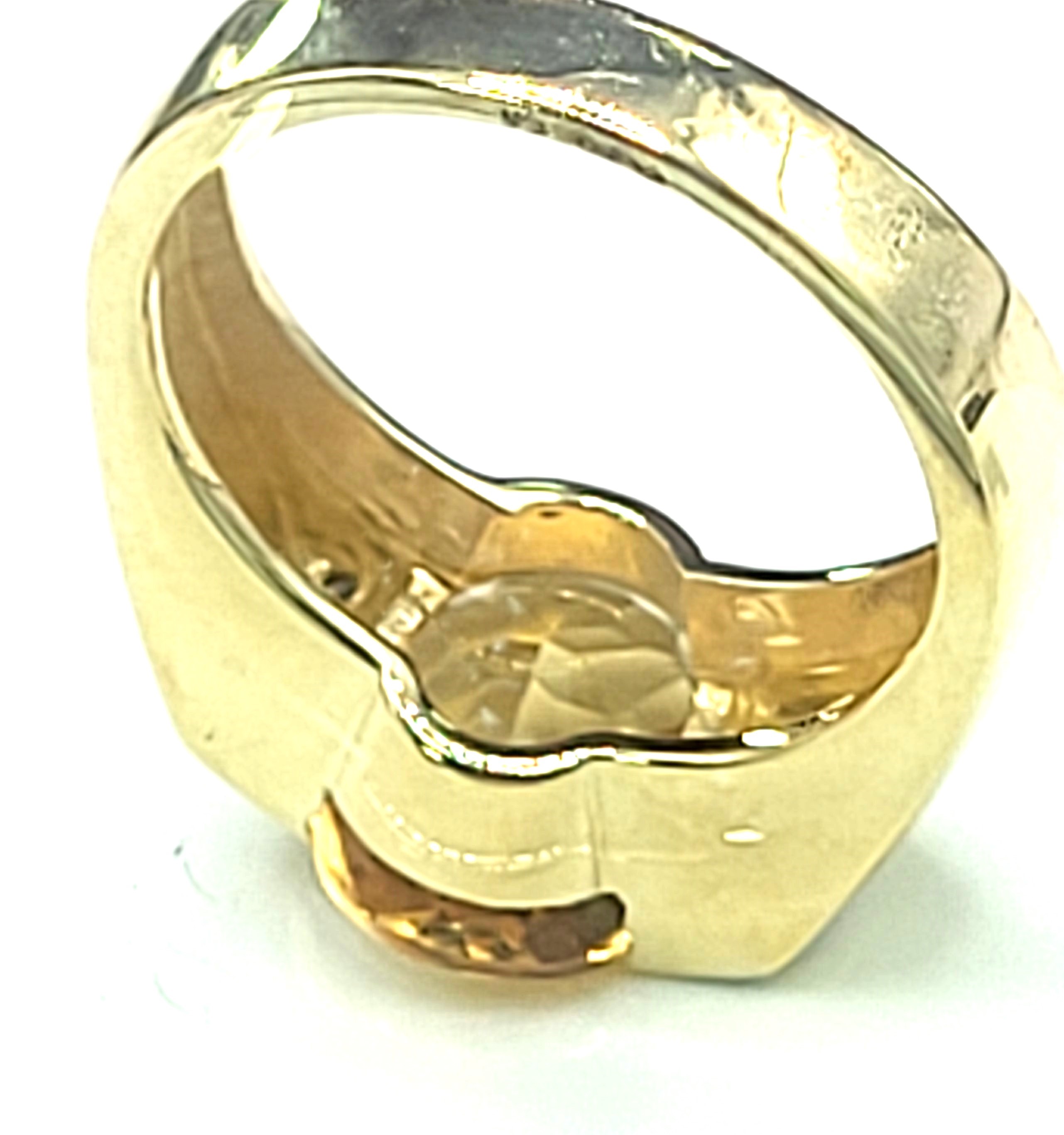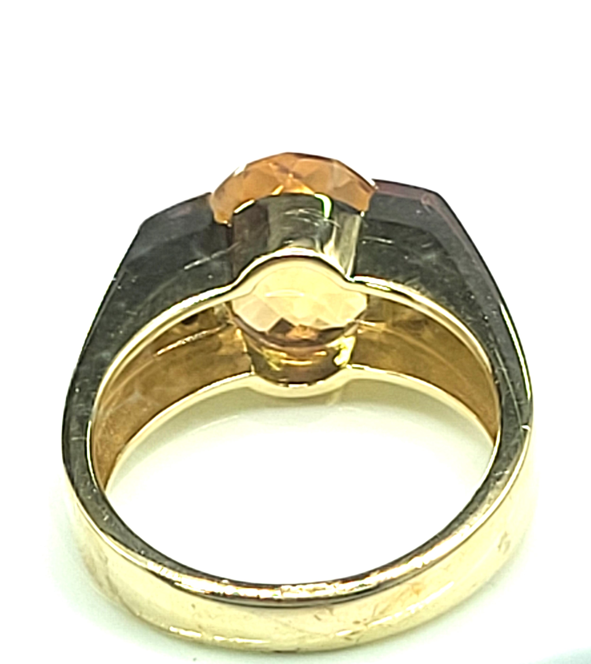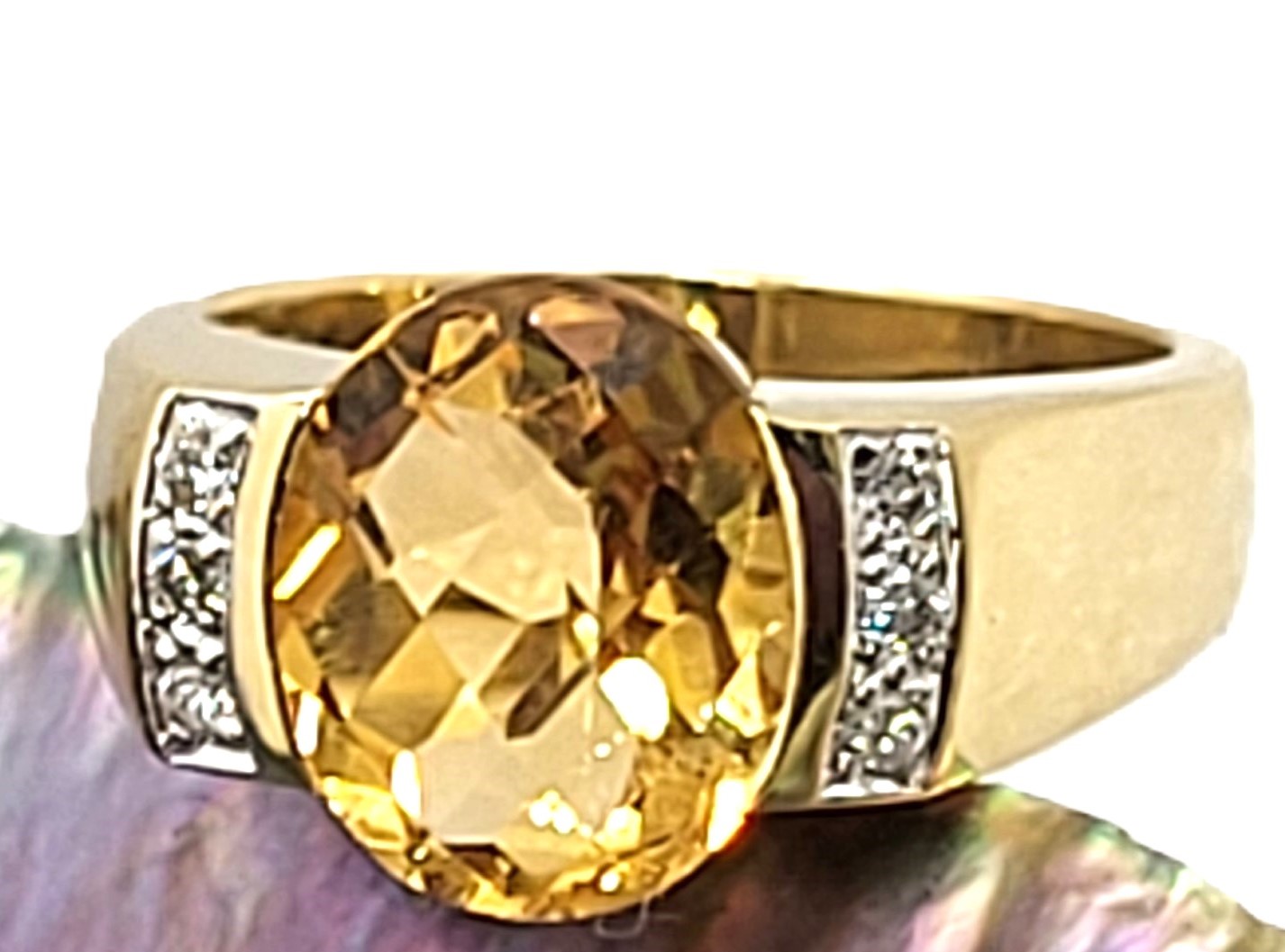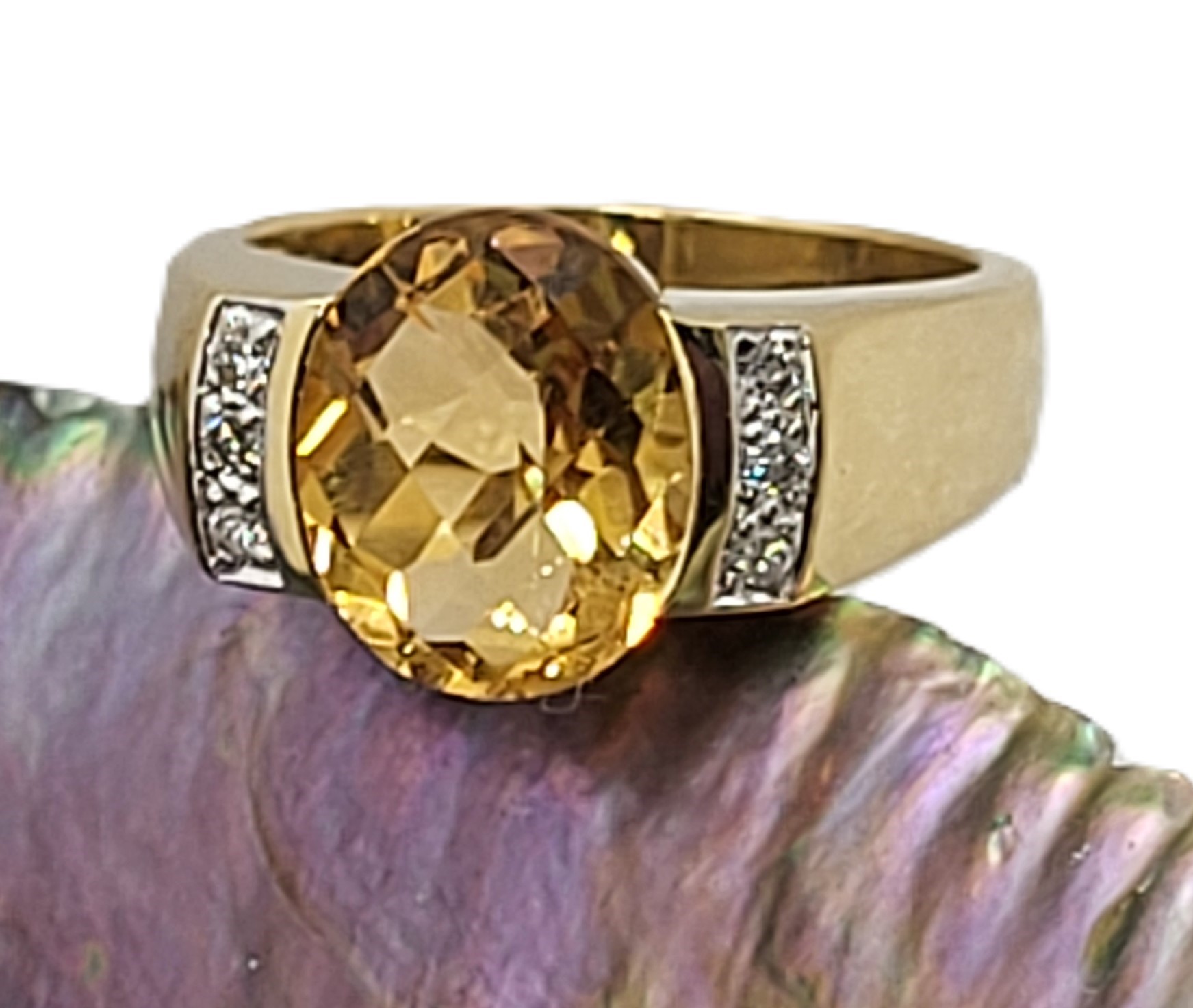 This is a 14 karat yellow gold with an approximate 3.00 carat, oval-cut, top-faceted, semi-bezel set, warm honey-colored citrine with approximately .05 carats total weight of round, brilliant-cut, approximate H-I color, SI2-I1 clarity diamonds on the shoulders.  The ring is approximately 11 x 14 mm on the top and tapers to an approximate 4mm shank. This ring is US size 7 and can be sized for an additional charge.  Admin: 33110/14ieh