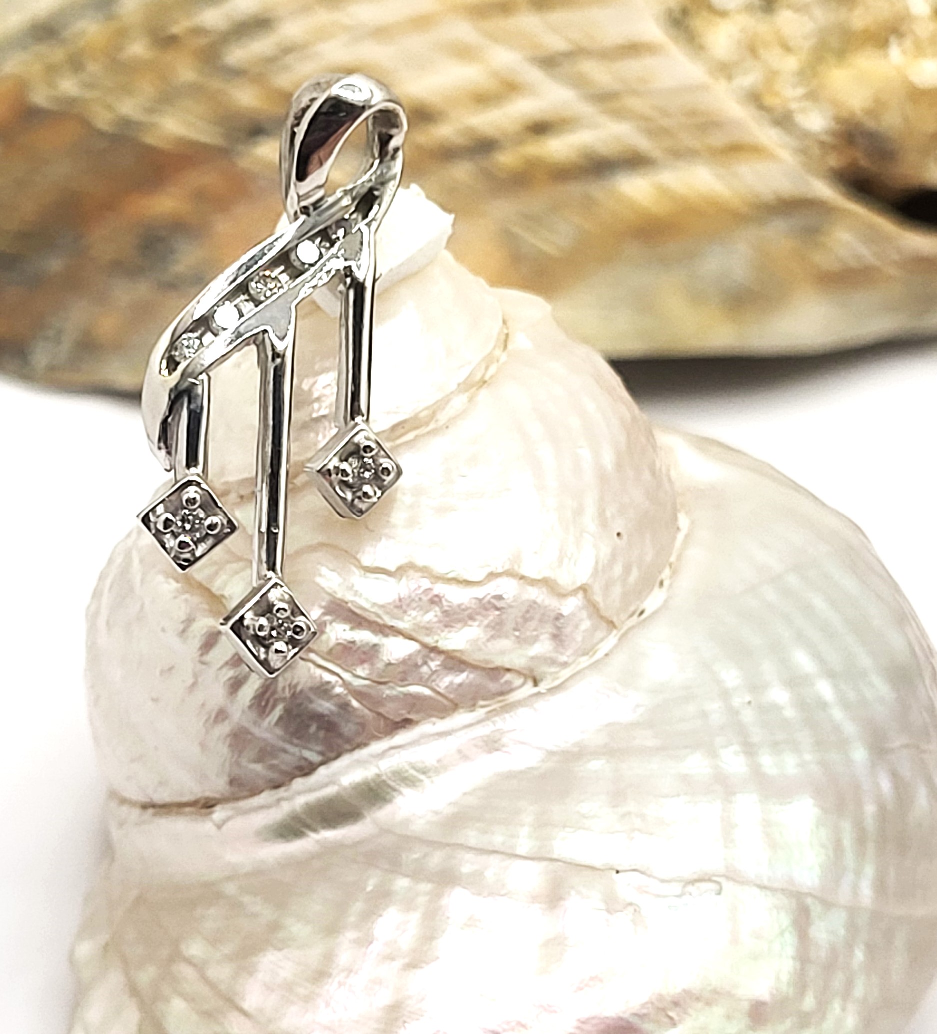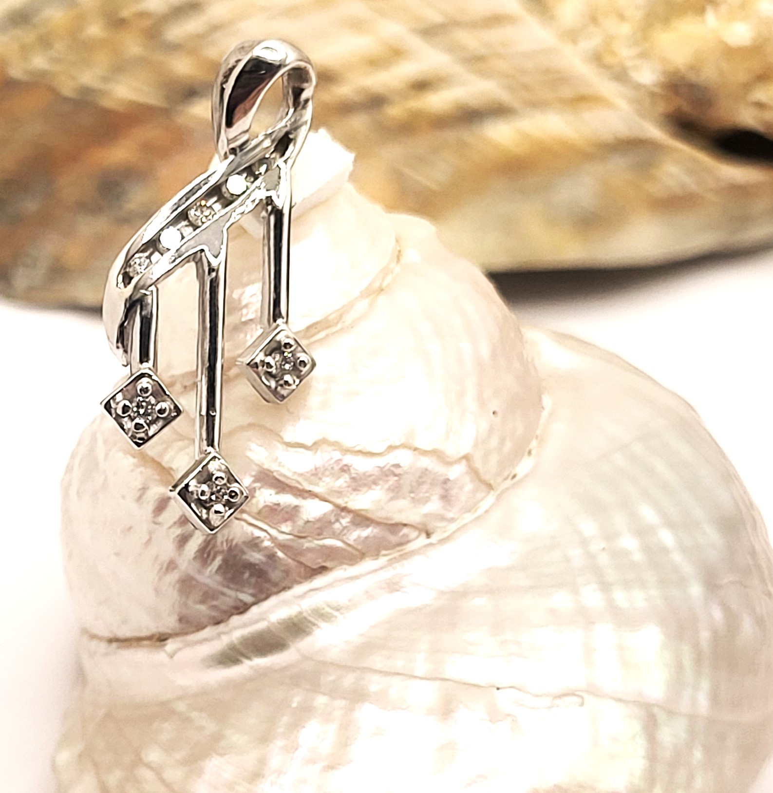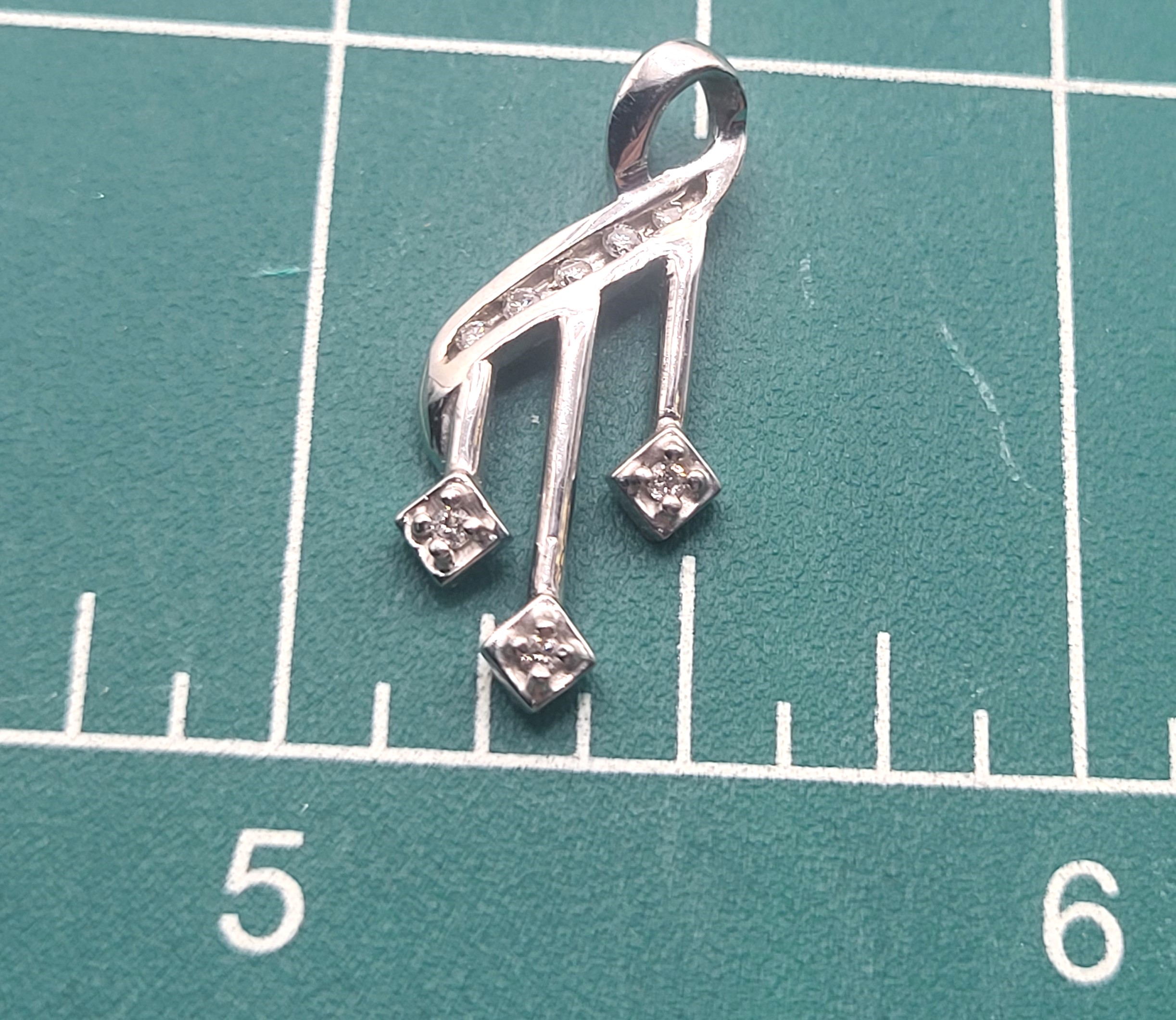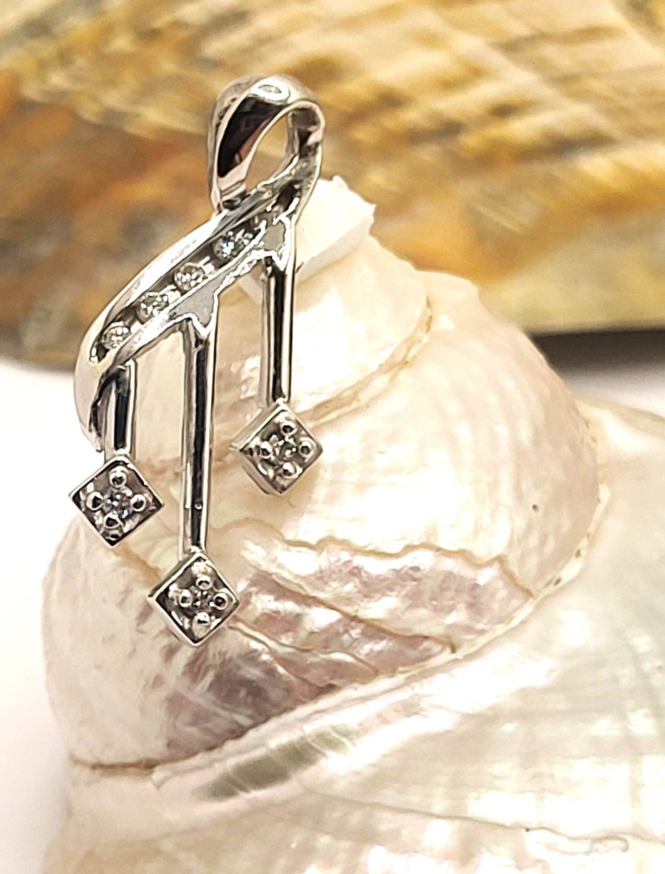 This is a 14 karat white gold minimalist pendant, with a simple design that flows like a musical note. This pendant could be a figural representative for a modern trident, or abstract icicles! It has a solid bail that can accommodate and approximate 2mm wide chain and is approximately 3/4" diameter and features .08 carats total weight of round, brilliant-cut diamonds.