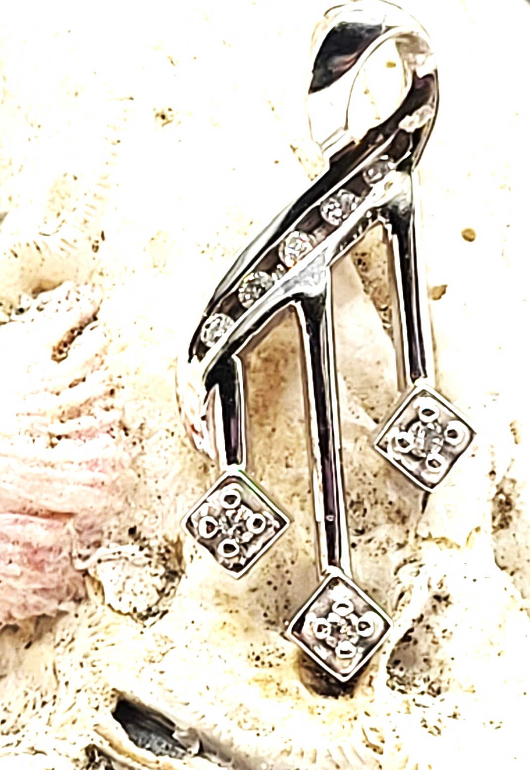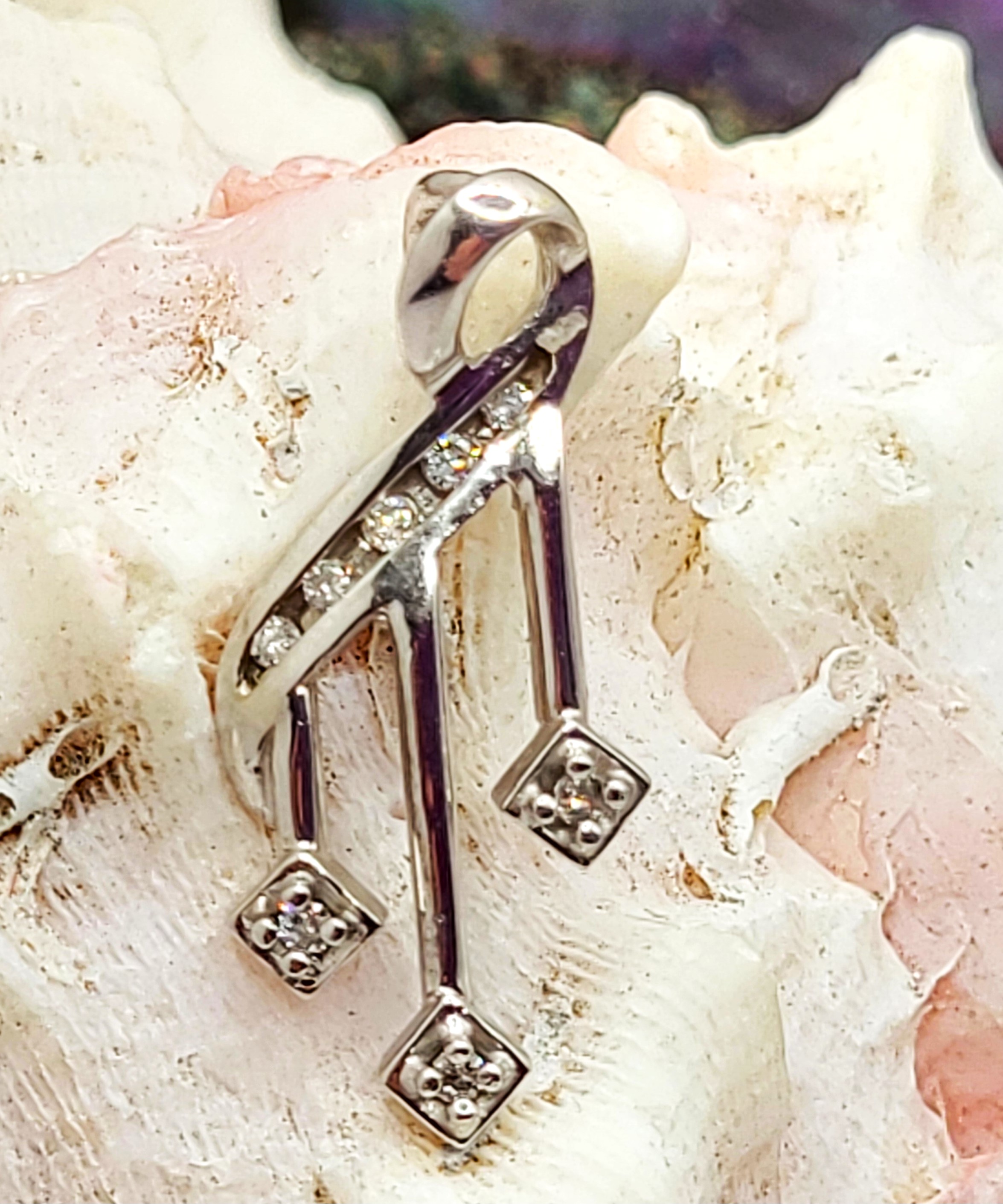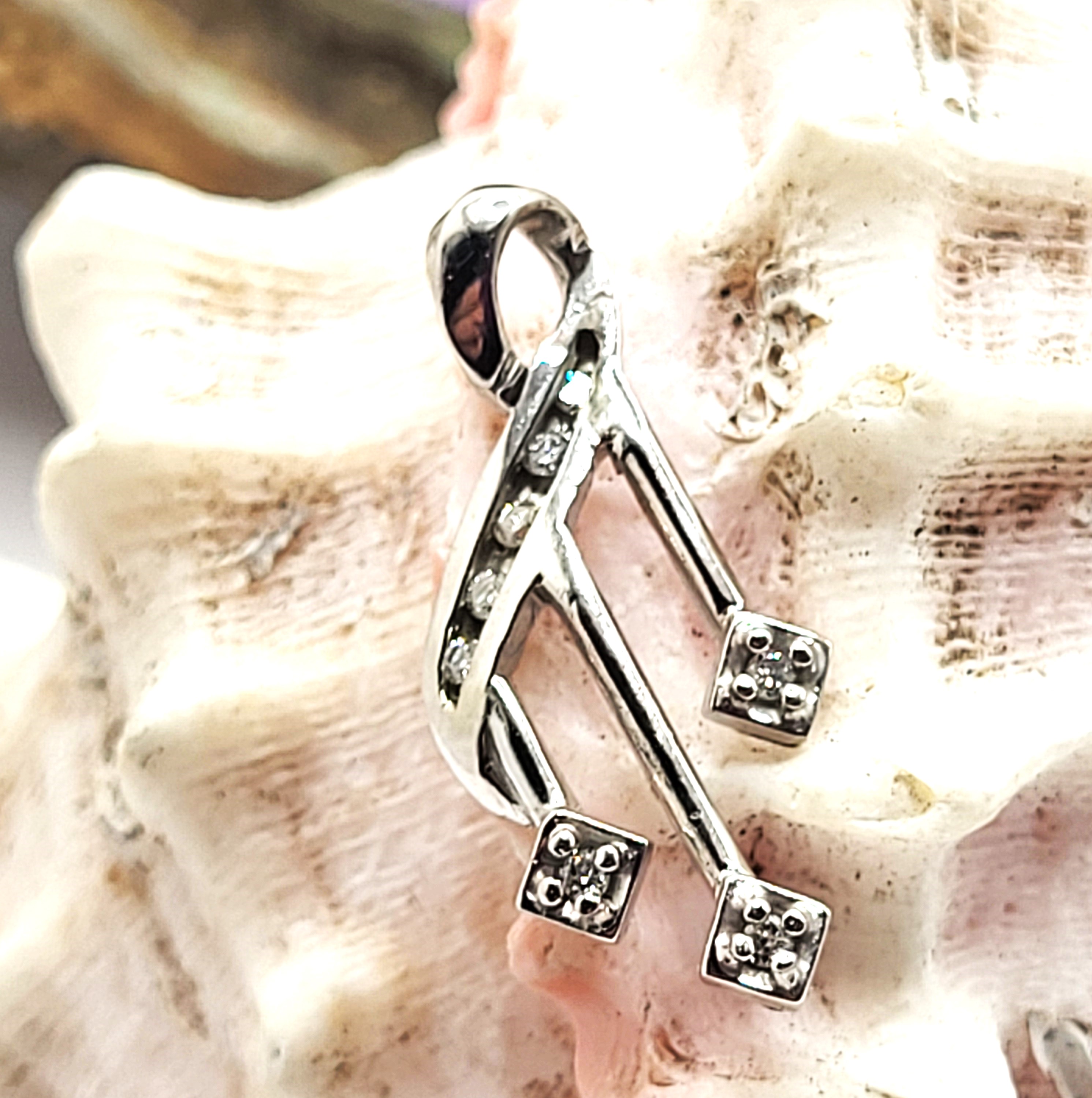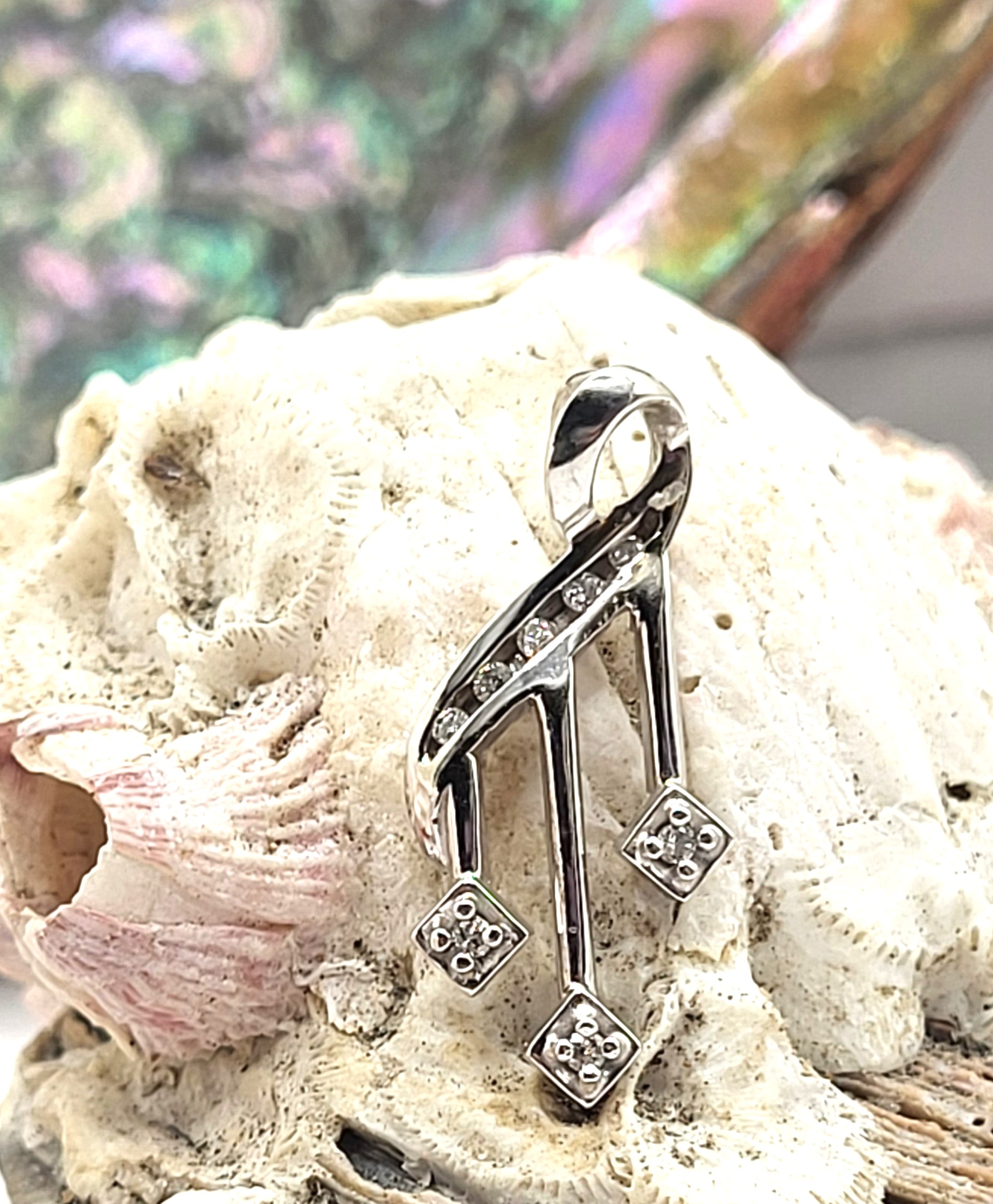 This is a 14 karat white gold minimalist pendant, with a simple design that flows like a musical note. This pendant could be a figural representative for a modern trident, or abstract icicles! It has a solid bail that can accommodate and approximate 2mm wide chain and is approximately 3/4" diameter and features .08 carats total weight of round, brilliant-cut diamonds.