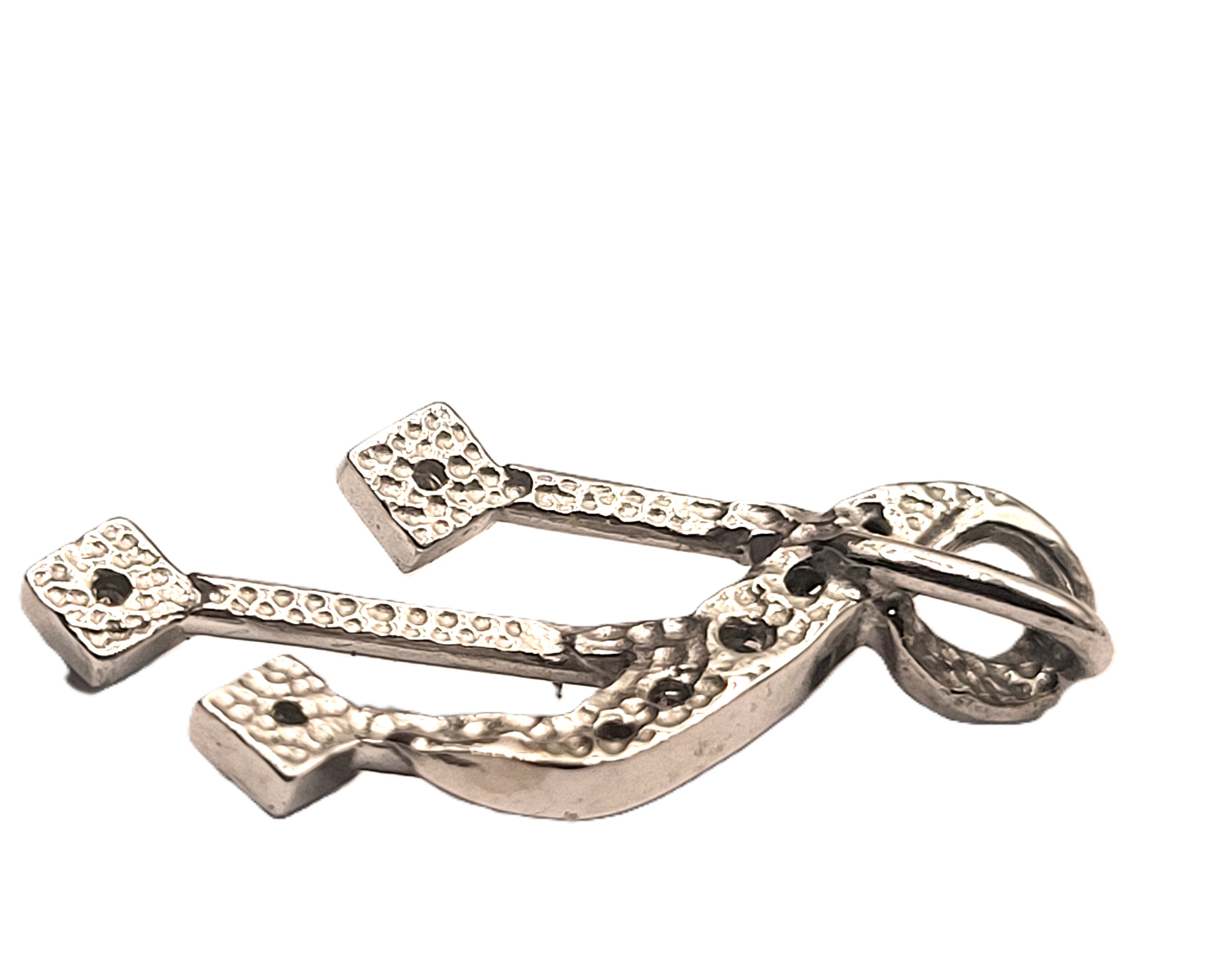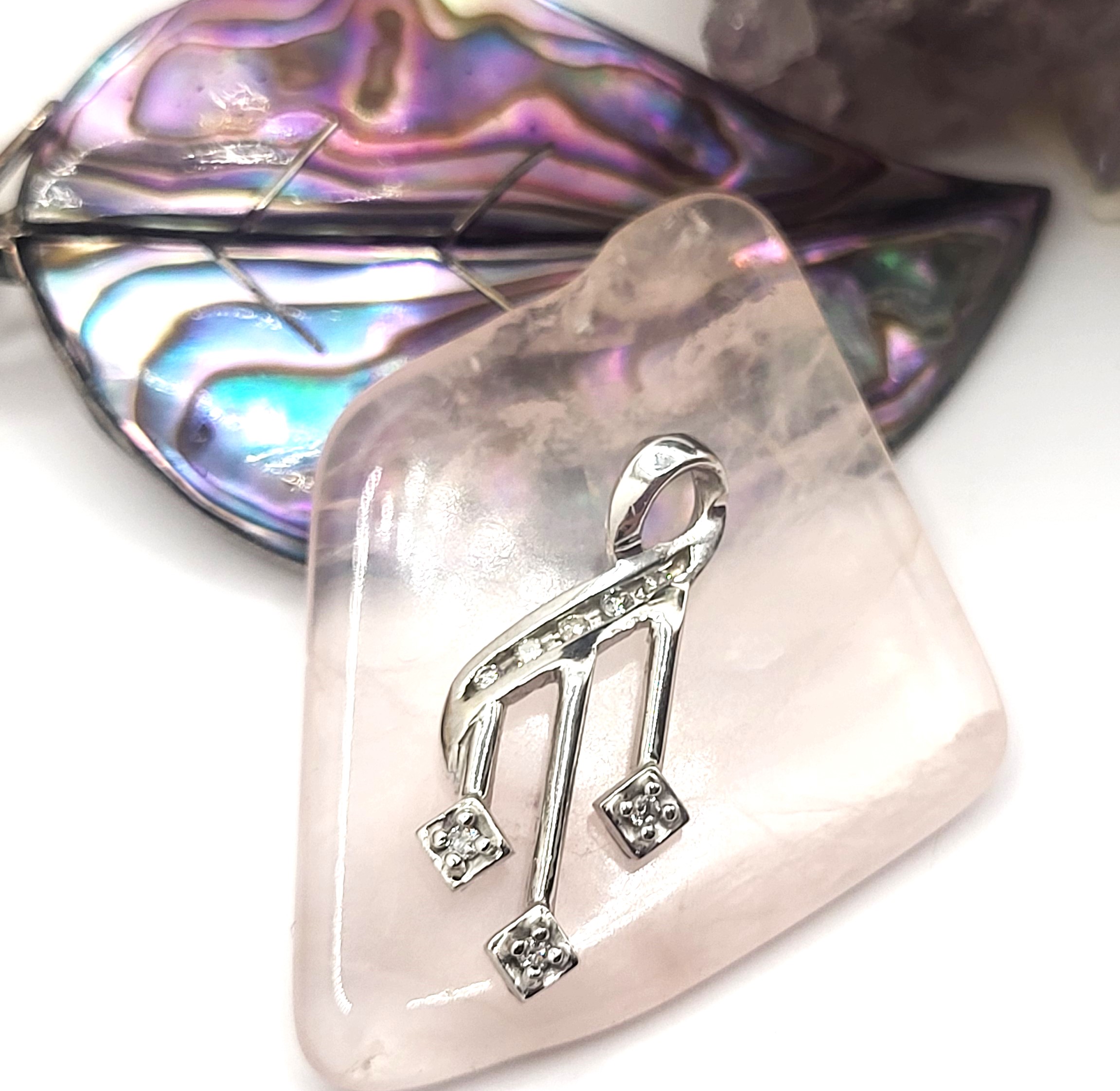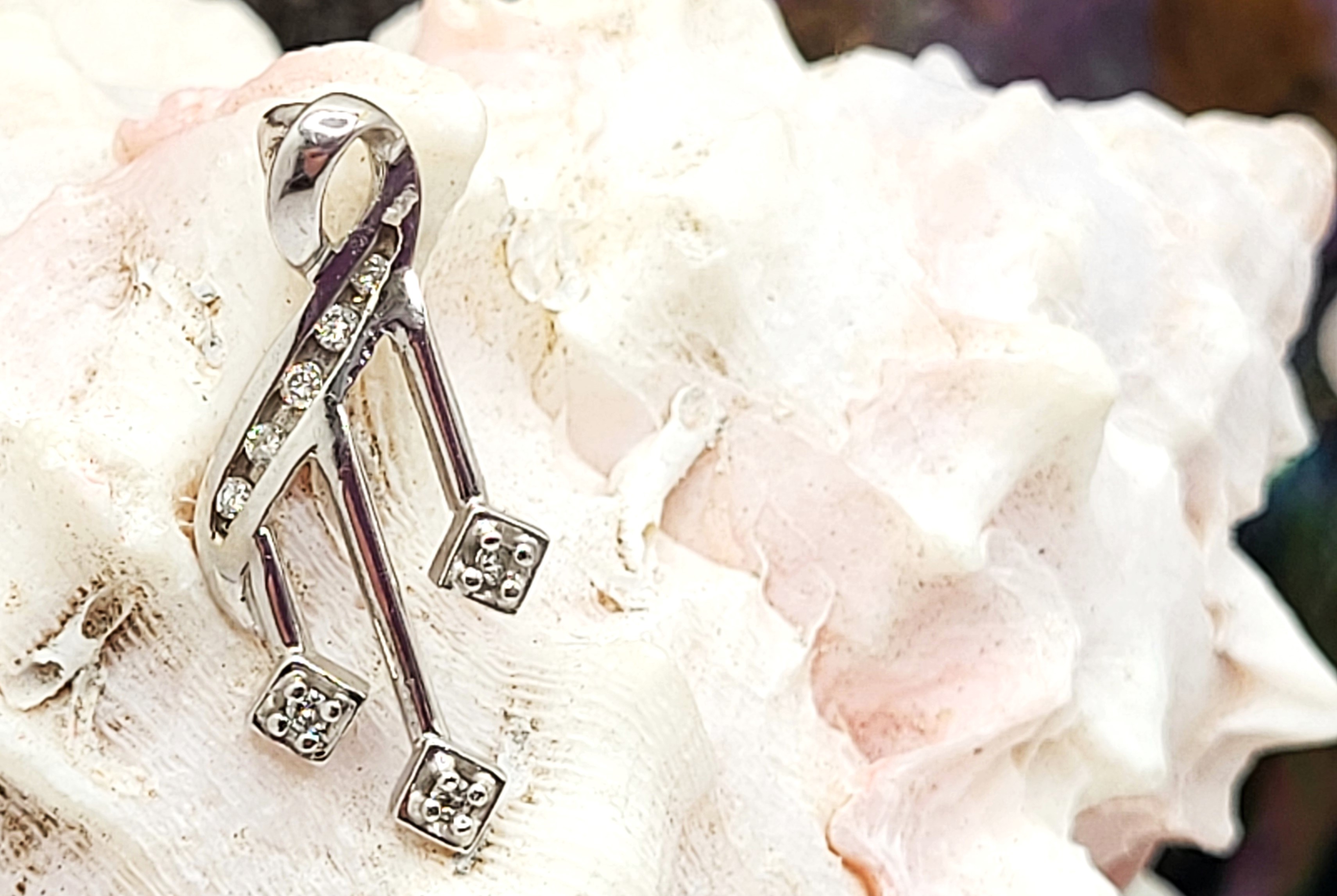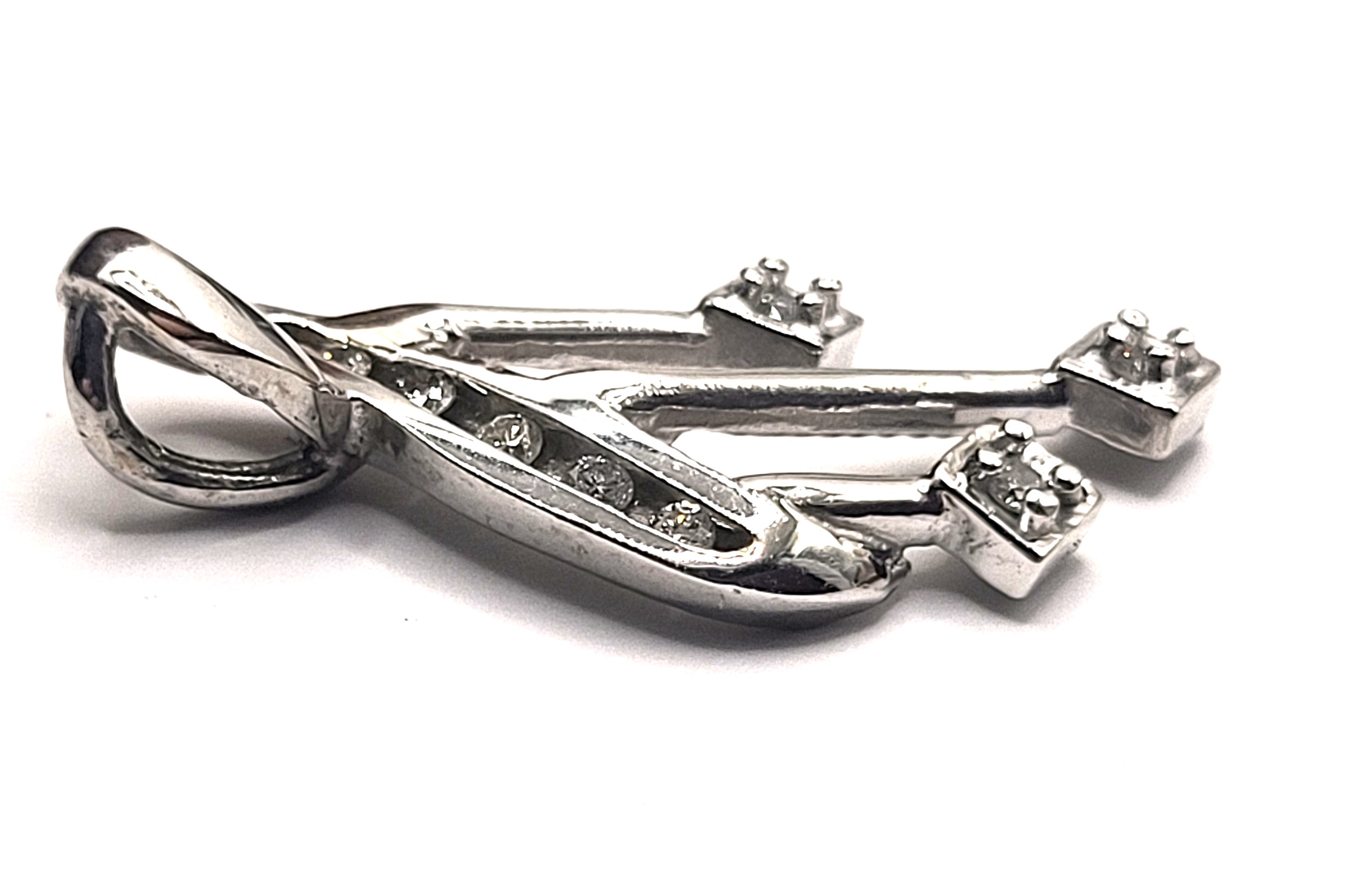 This is a 14 karat white gold minimalist pendant, with a simple design that flows like a musical note. This pendant could be a figural representative for a modern trident, or abstract icicles! It has a solid bail that can accommodate and approximate 2mm wide chain and is approximately 3/4" diameter and features .08 carats total weight of round, brilliant-cut diamonds.