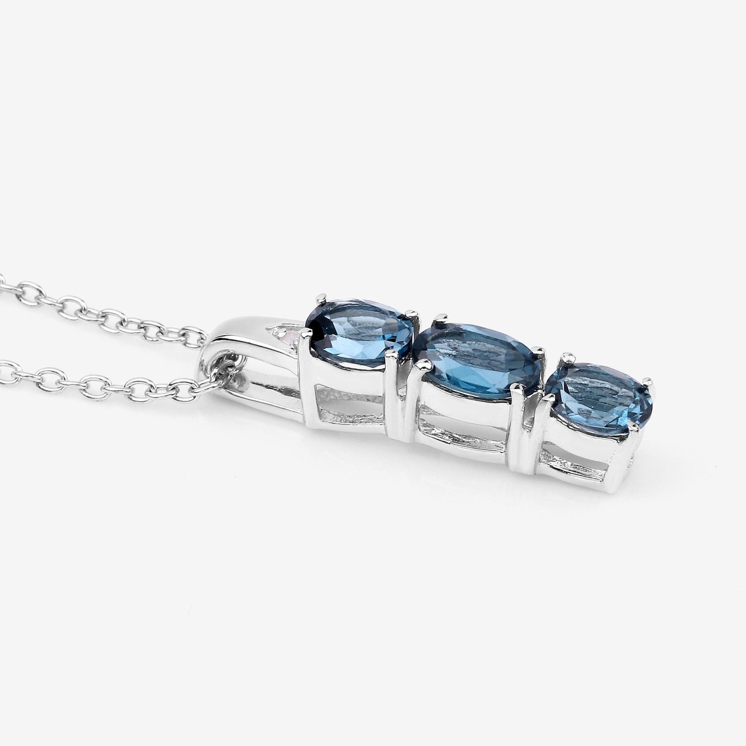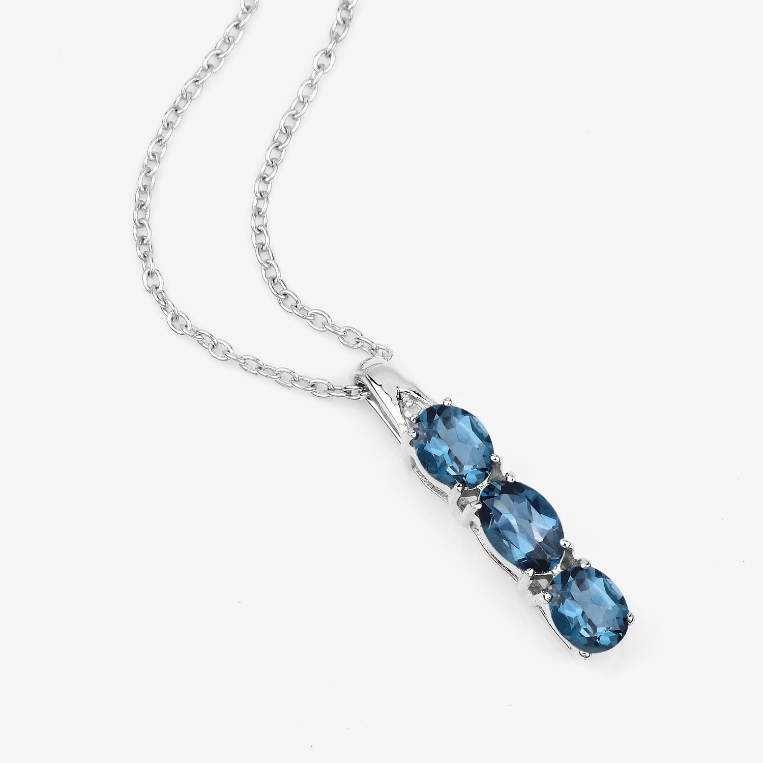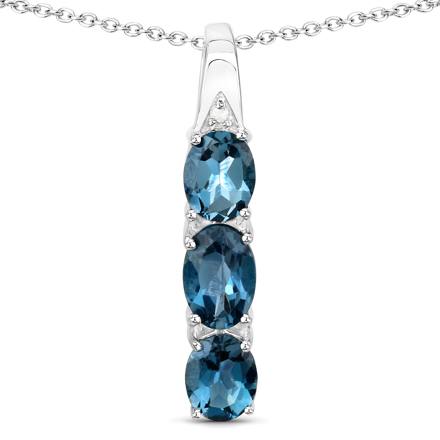 This sterling silver necklace features a pendant with 1.34 carats total weight of oval-cut, prong-set, genuine London blue topaz, in a vertical row. There is a .01 carat, round, faceted, accent diamond at the top of the pendant. It is approximately 7/8" long with a built-in bail that can accommodate up to a 2mm chain. It hangs from an 18" fine link chain with a spring ring clasp. Admin: 86371/9ih