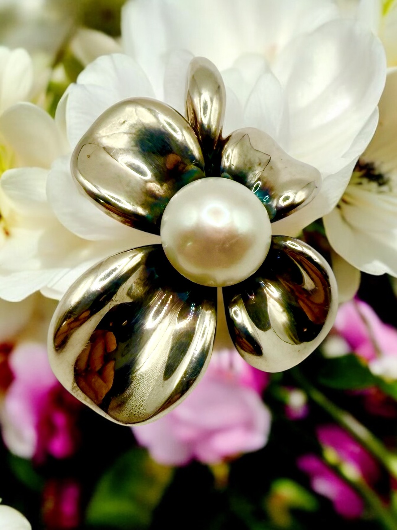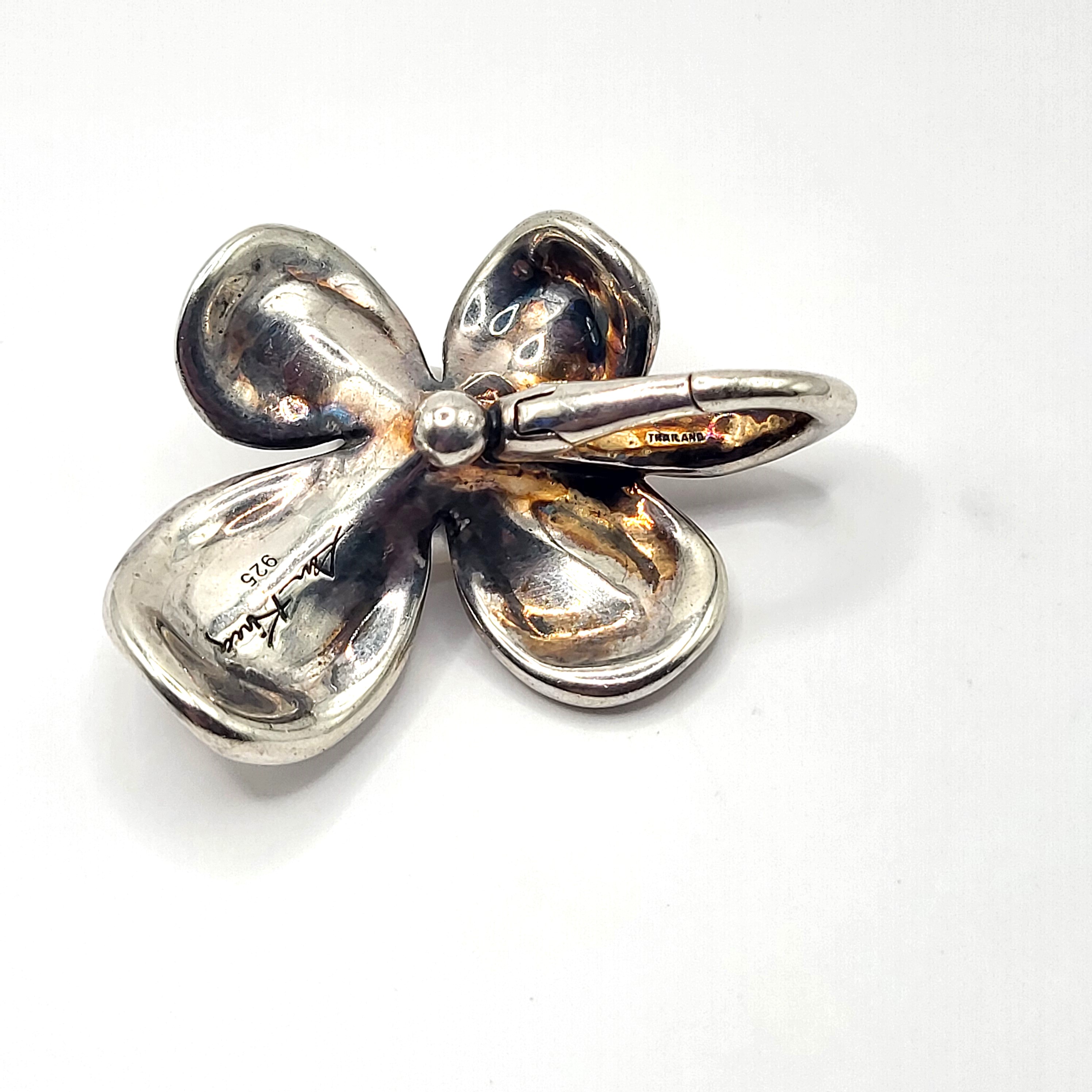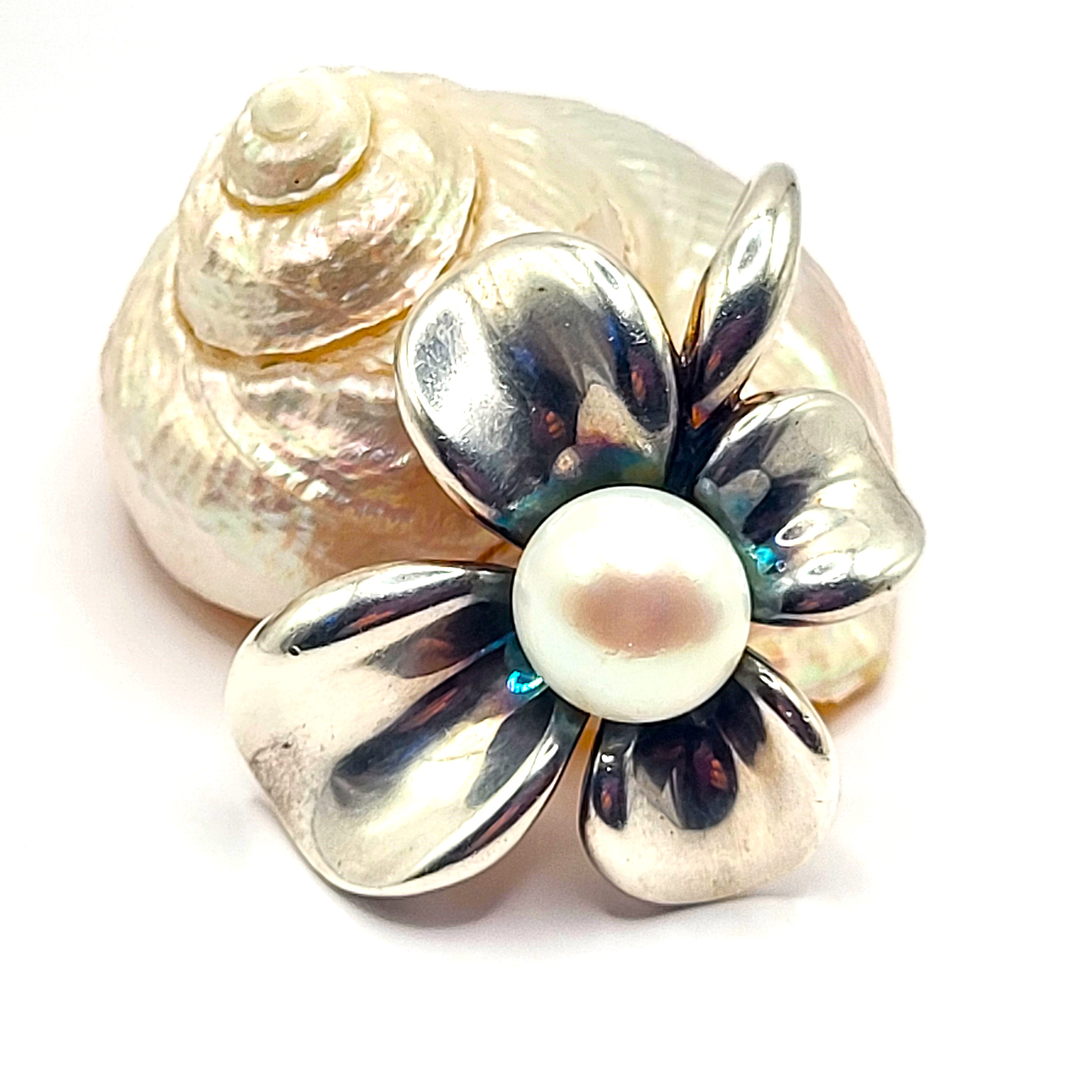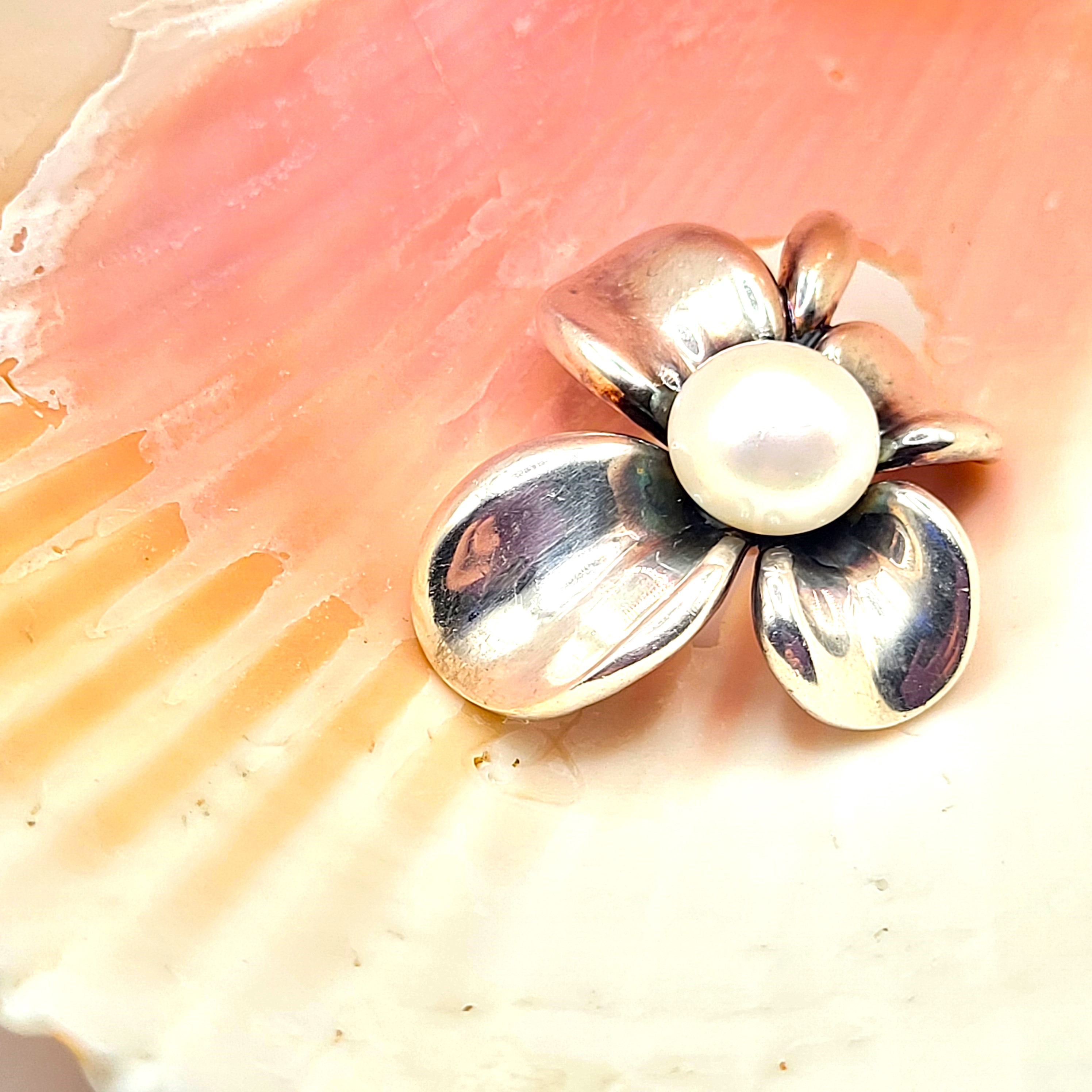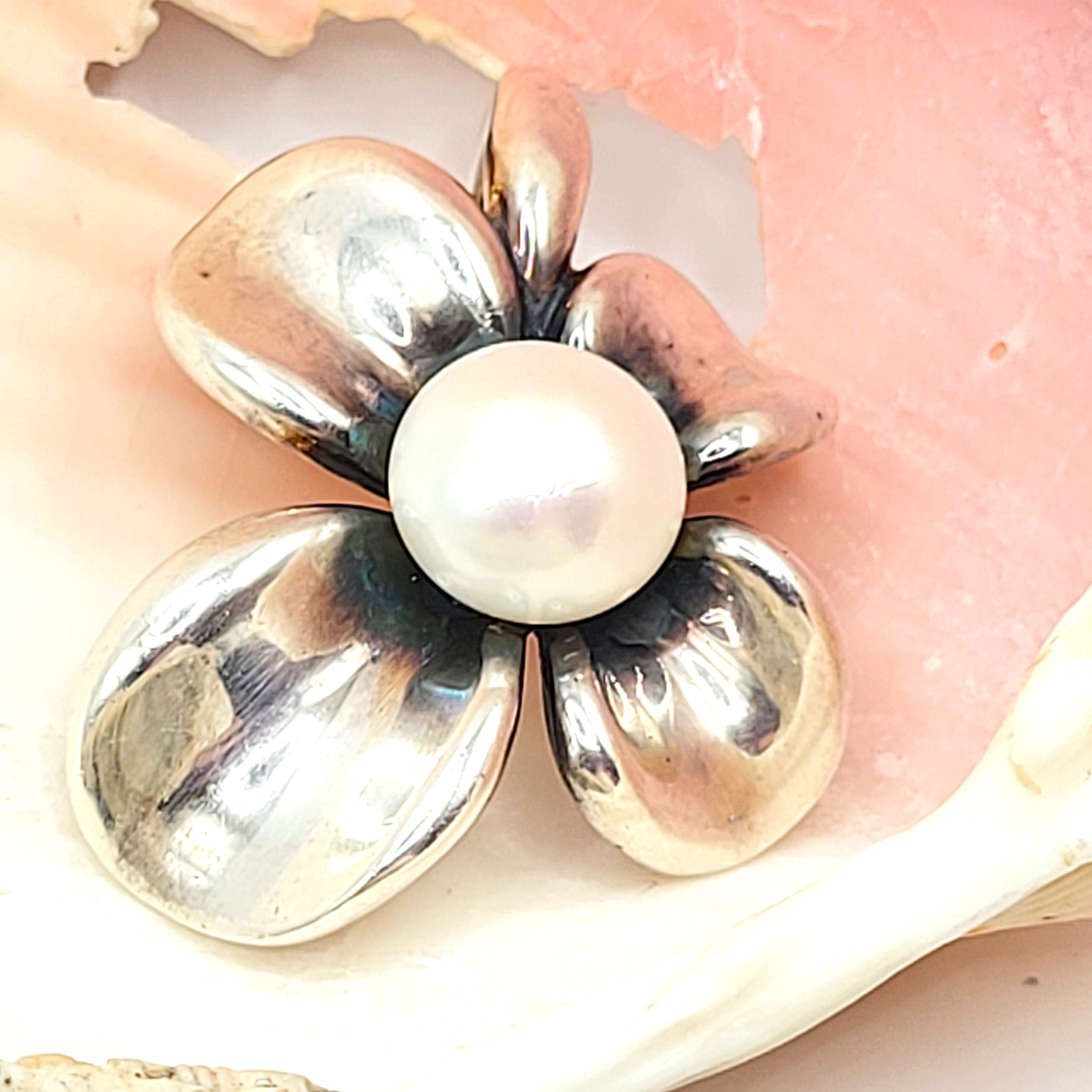 This sterling silver (.925) pendant, represents the figural dogwood flower bloom with an approximate 11x8mm, white, shimmery, button pearl in the center. The