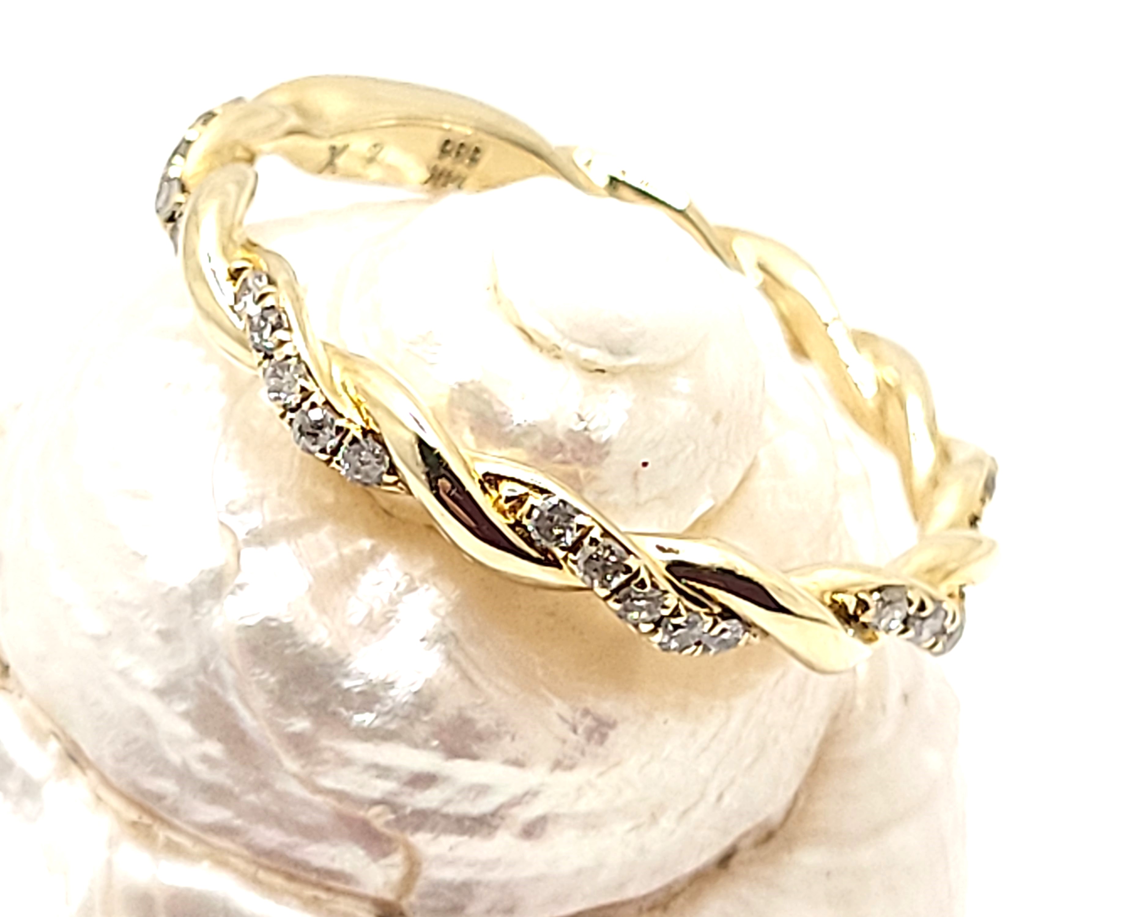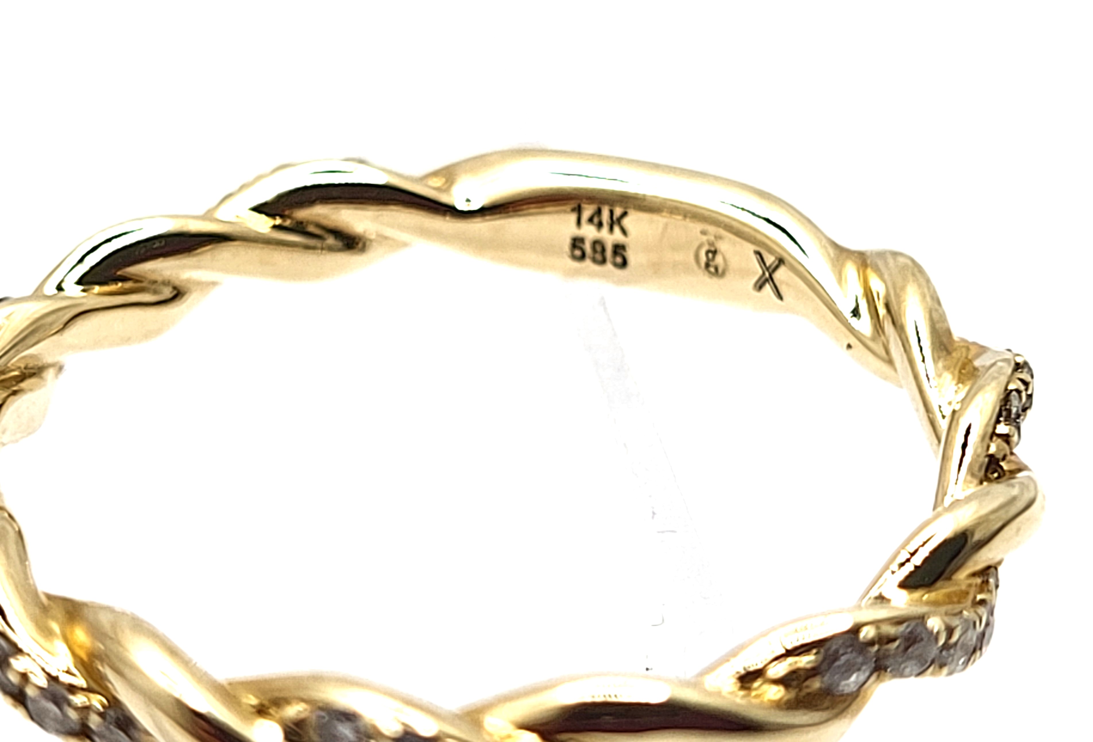 This 14 karat yellow gold ring is like a magical tendril from a vine that has captured your finger. It features .21 carats total weight of round, brilliant-cut, H-I color, SI2-I1 clarity diamonds in its spiraling design. The ring is approximately 2mm thick and US size 7.25. It can be sized for an additional charge. Please contact Bidfair Fine Jewelry for sizing details. This is a brand new item with manufacturer’s approval to sale in a public auction. It is in excellent condition, but may have fine scratches from shipping or storage. Admin: G11241/25ilt