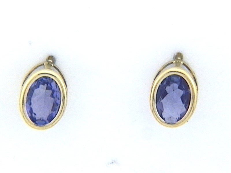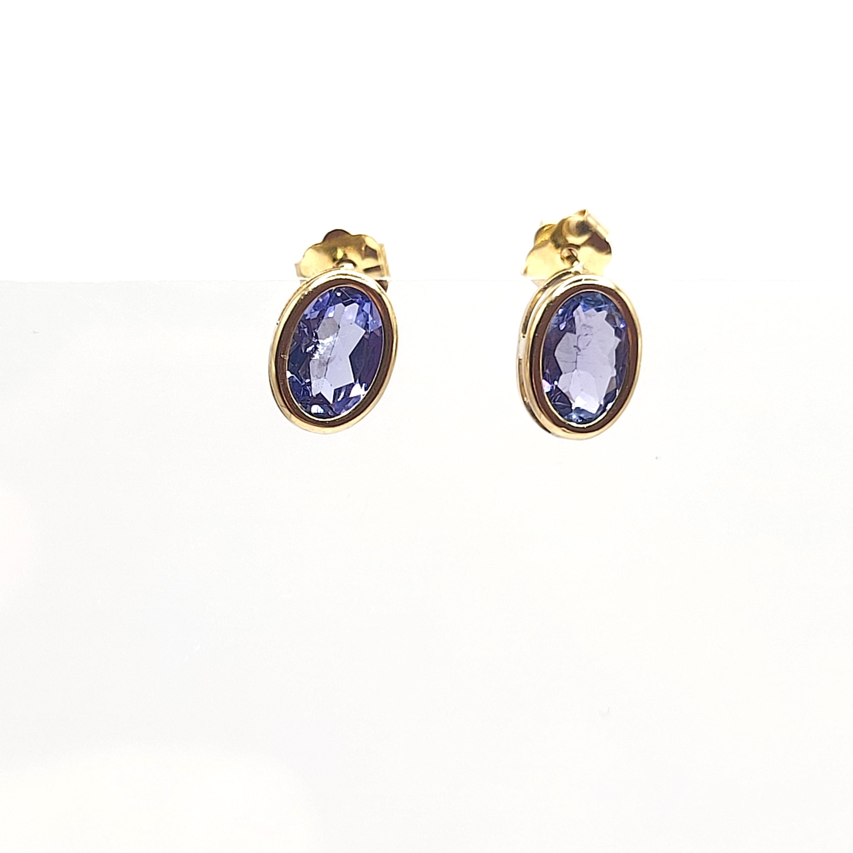 This is a pair of 14 karat yellow gold earrings that feature 1.60 carats total weight of oval-cut, bezel-set, genuine tanzanites. The tanzanites are approximately 6x4mm. The earrings attach to the earlobe with posts and friction backs. Admin: G11241/30ltt