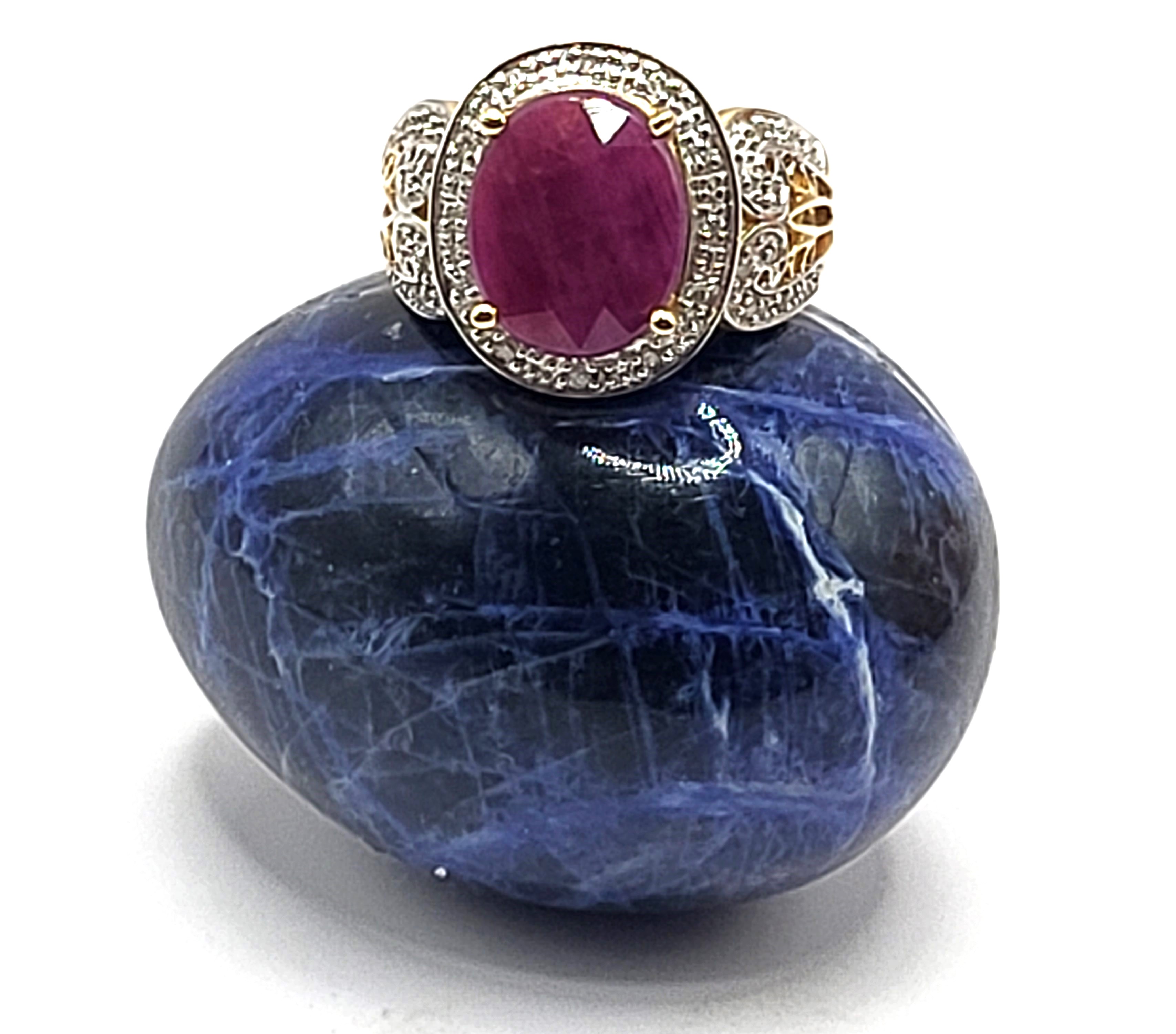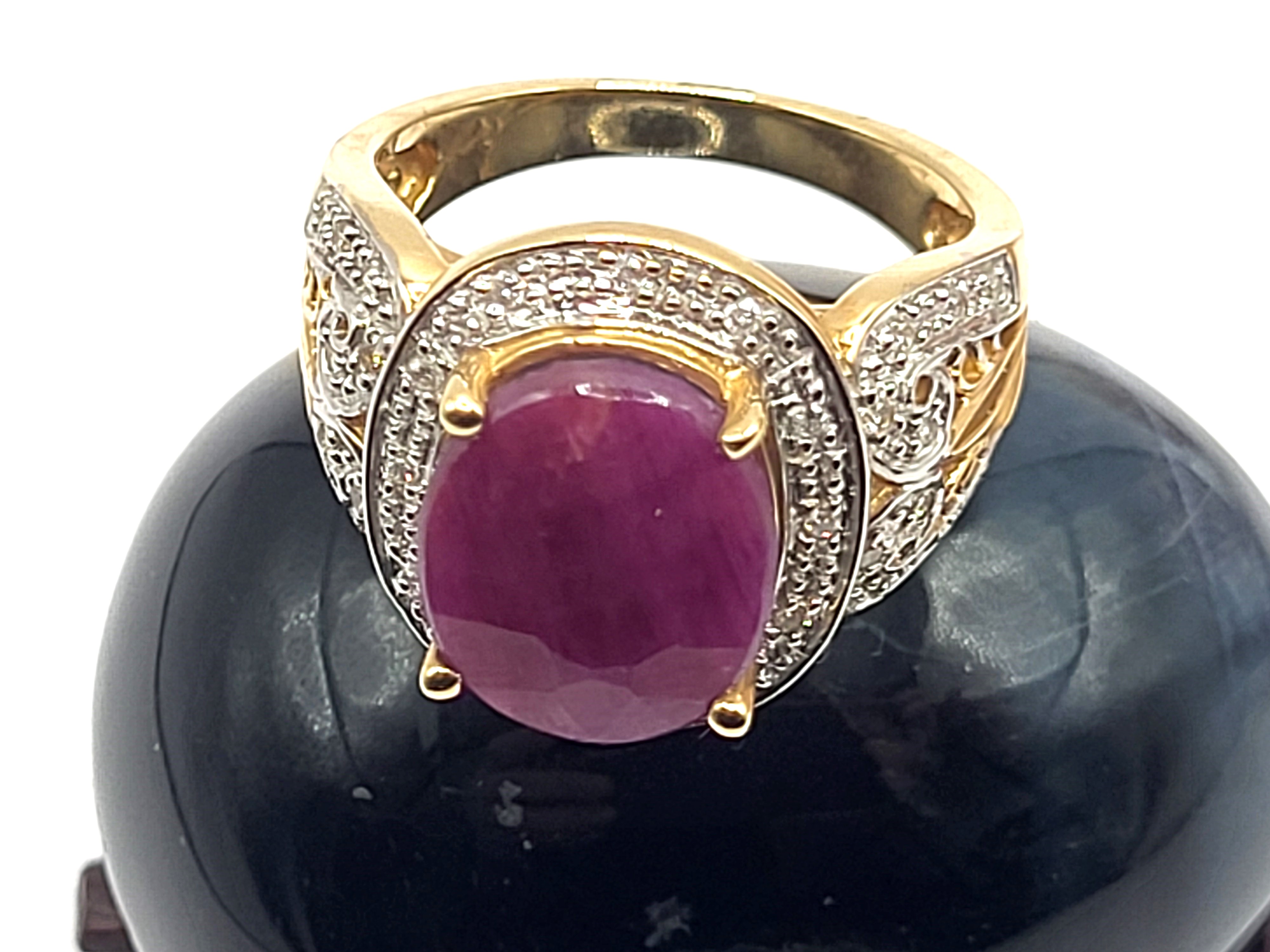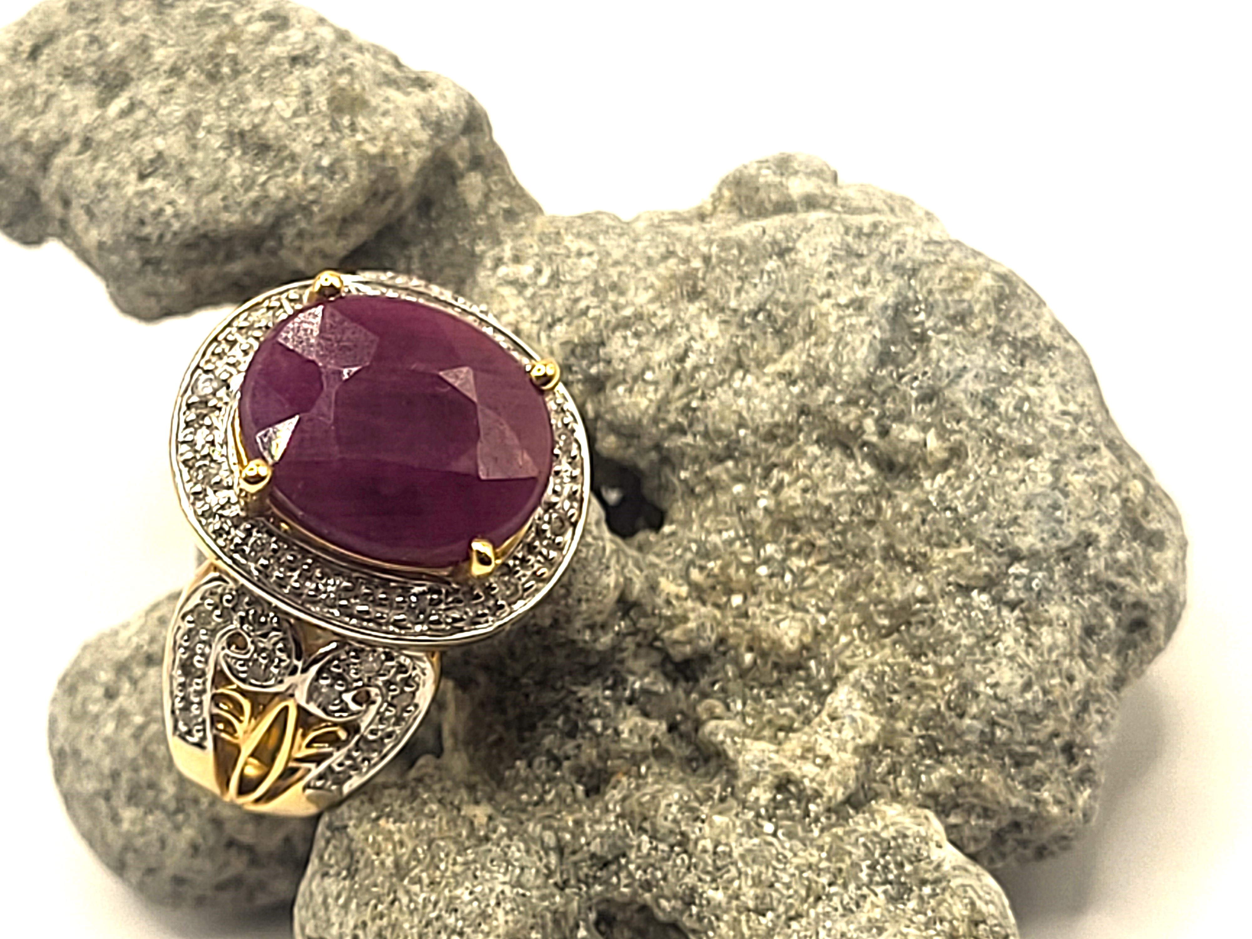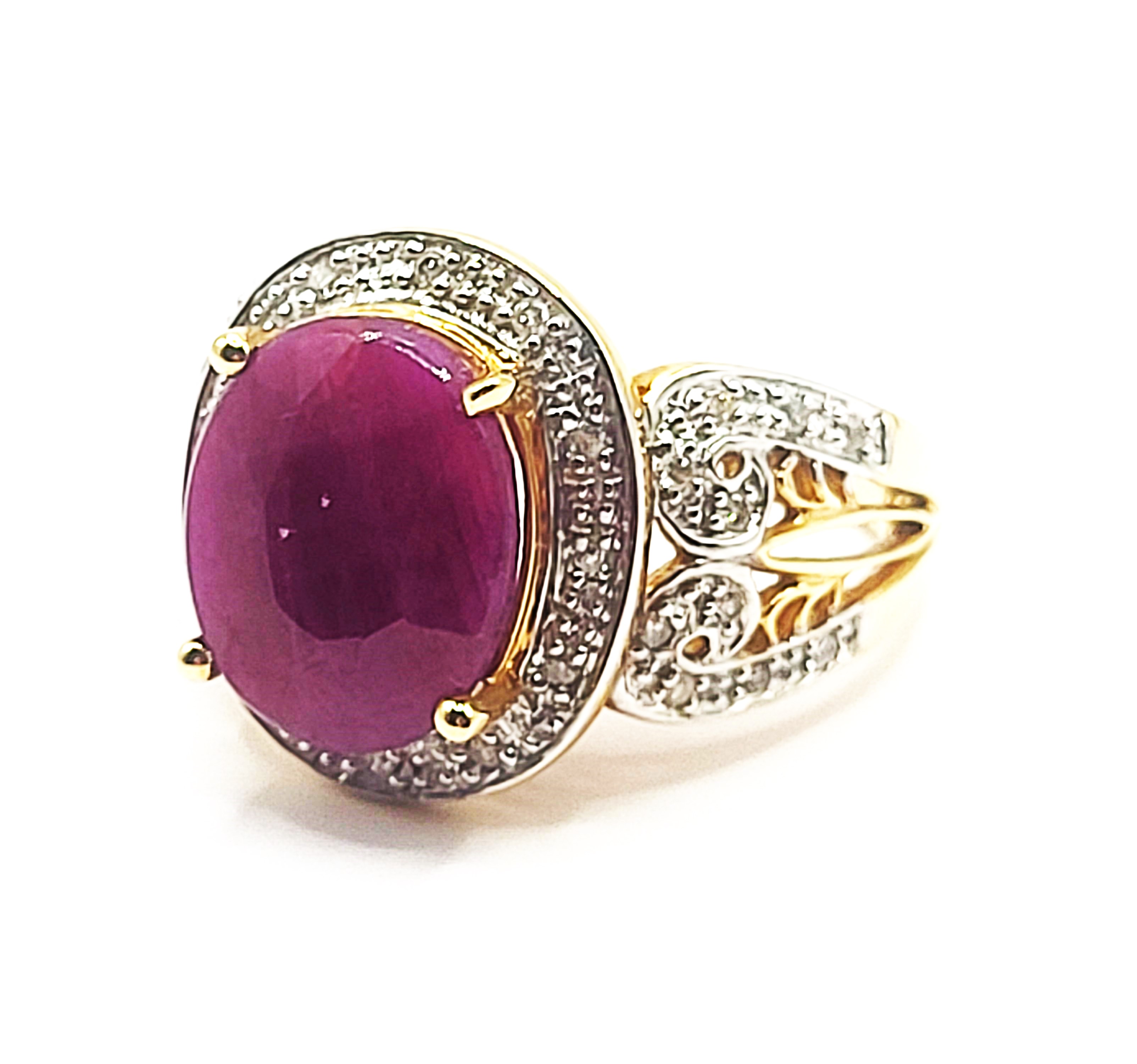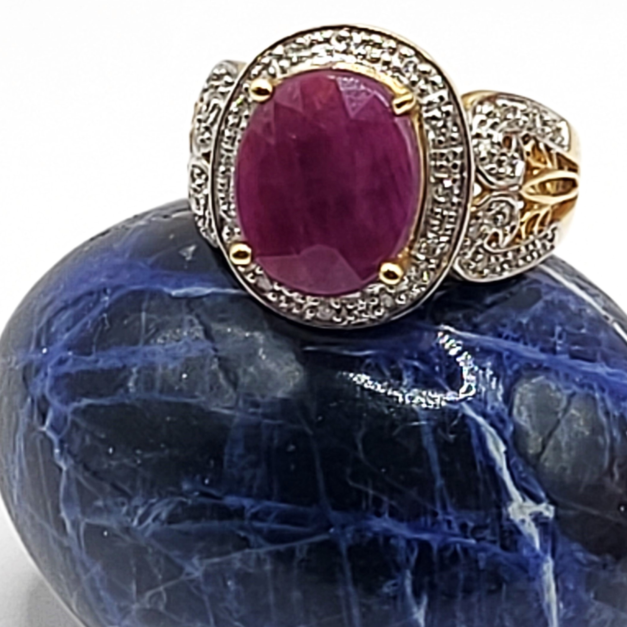 This is a 14 karat yellow gold ring with an approximate 5.00 carat, oval-cut, prong-set, genuine ruby (treated*) and approximately .25 carat total weight of round, faceted, H-I color, I1 clarity diamonds. This ring is US size 7.25 and can be sized for an additional charge. Please contact Bidfair Fine Jewelry for sizing details.