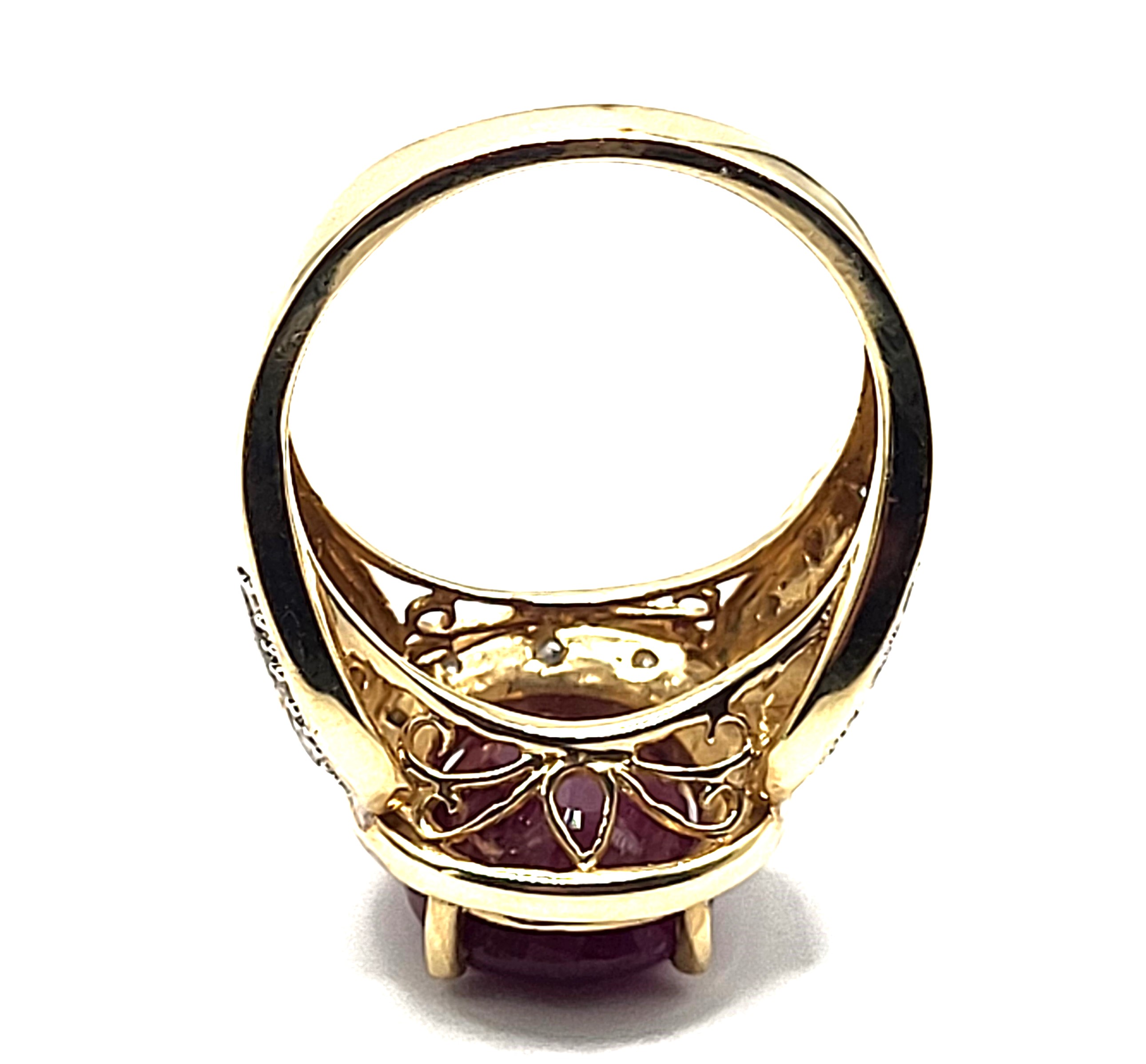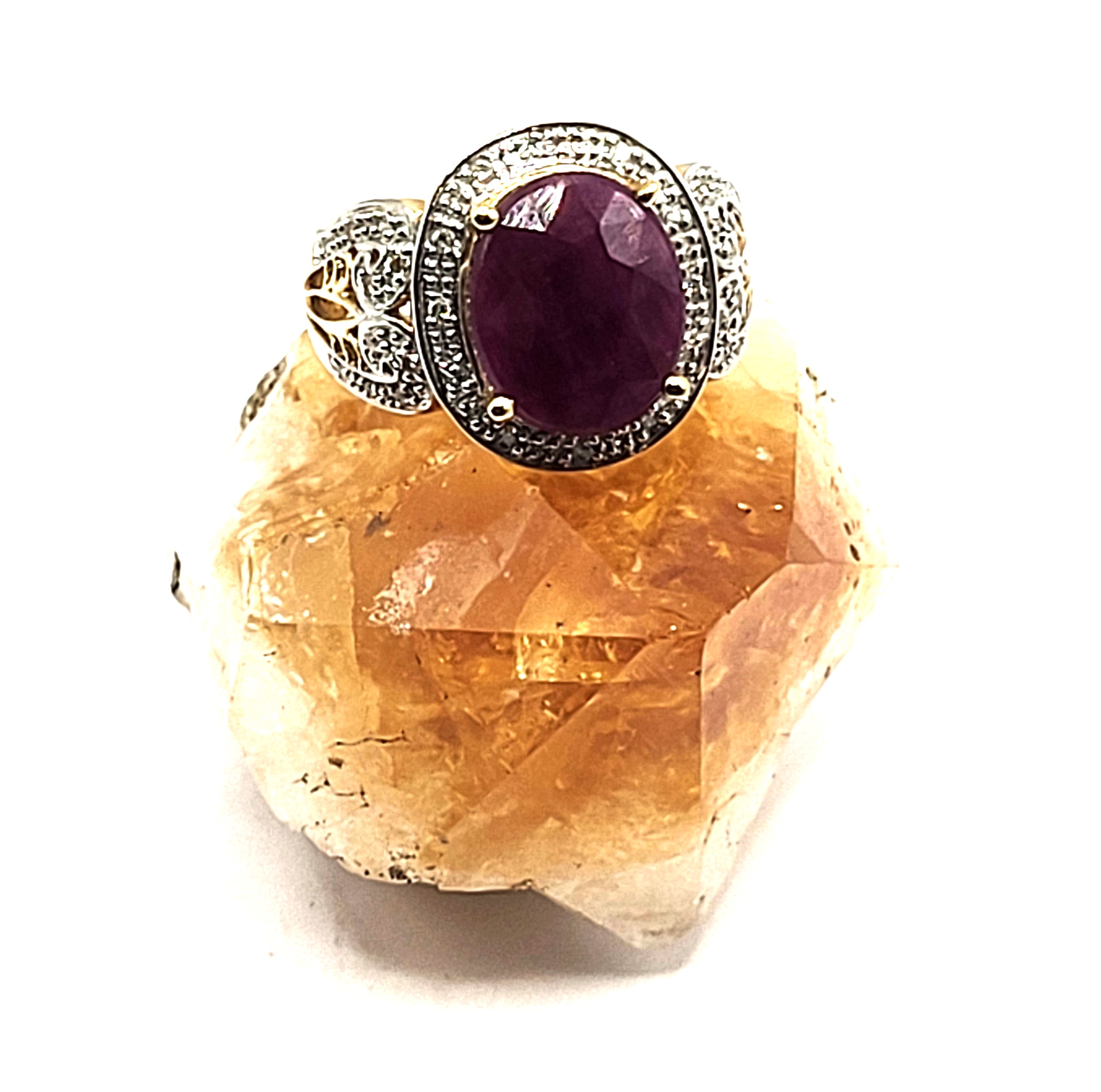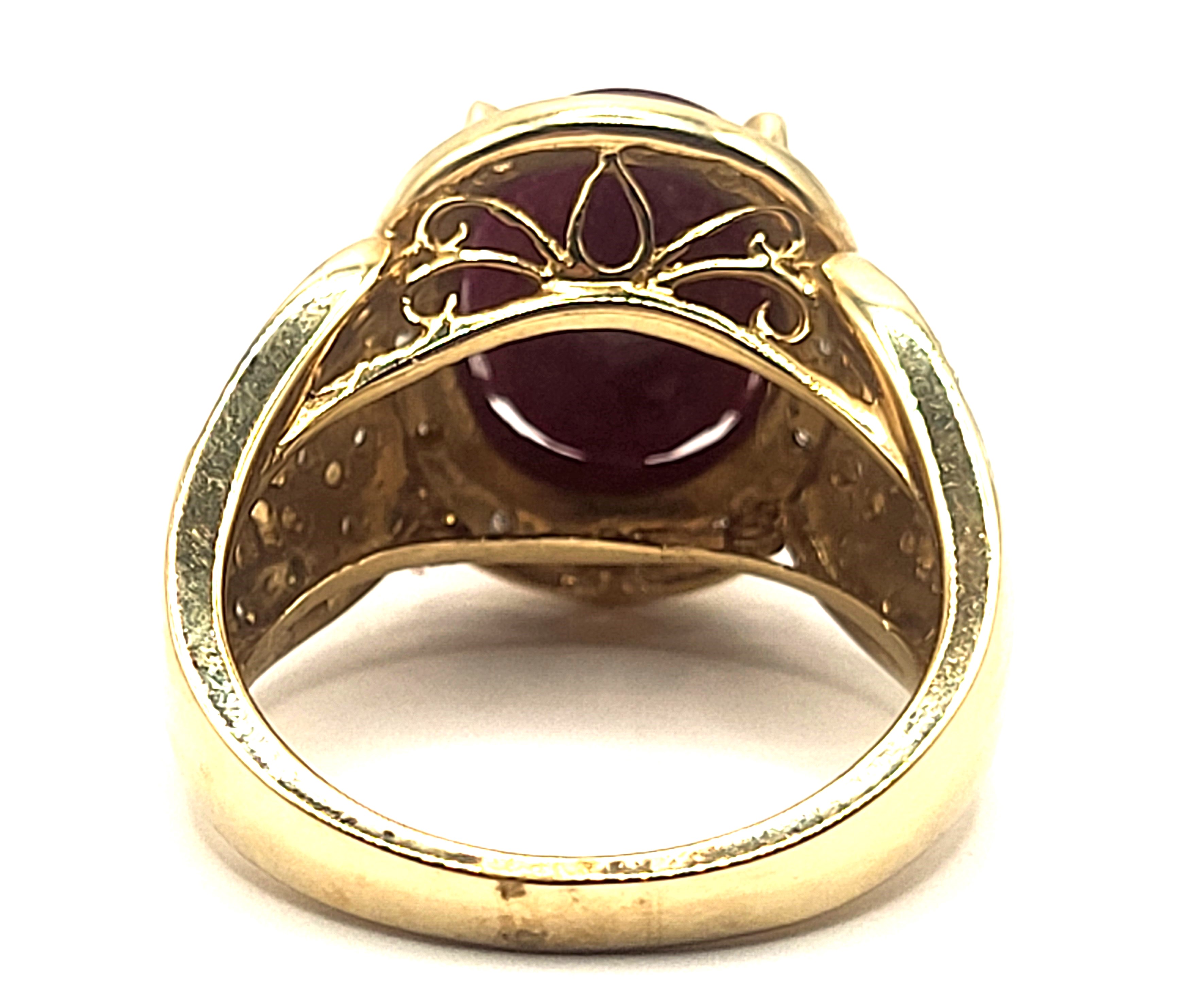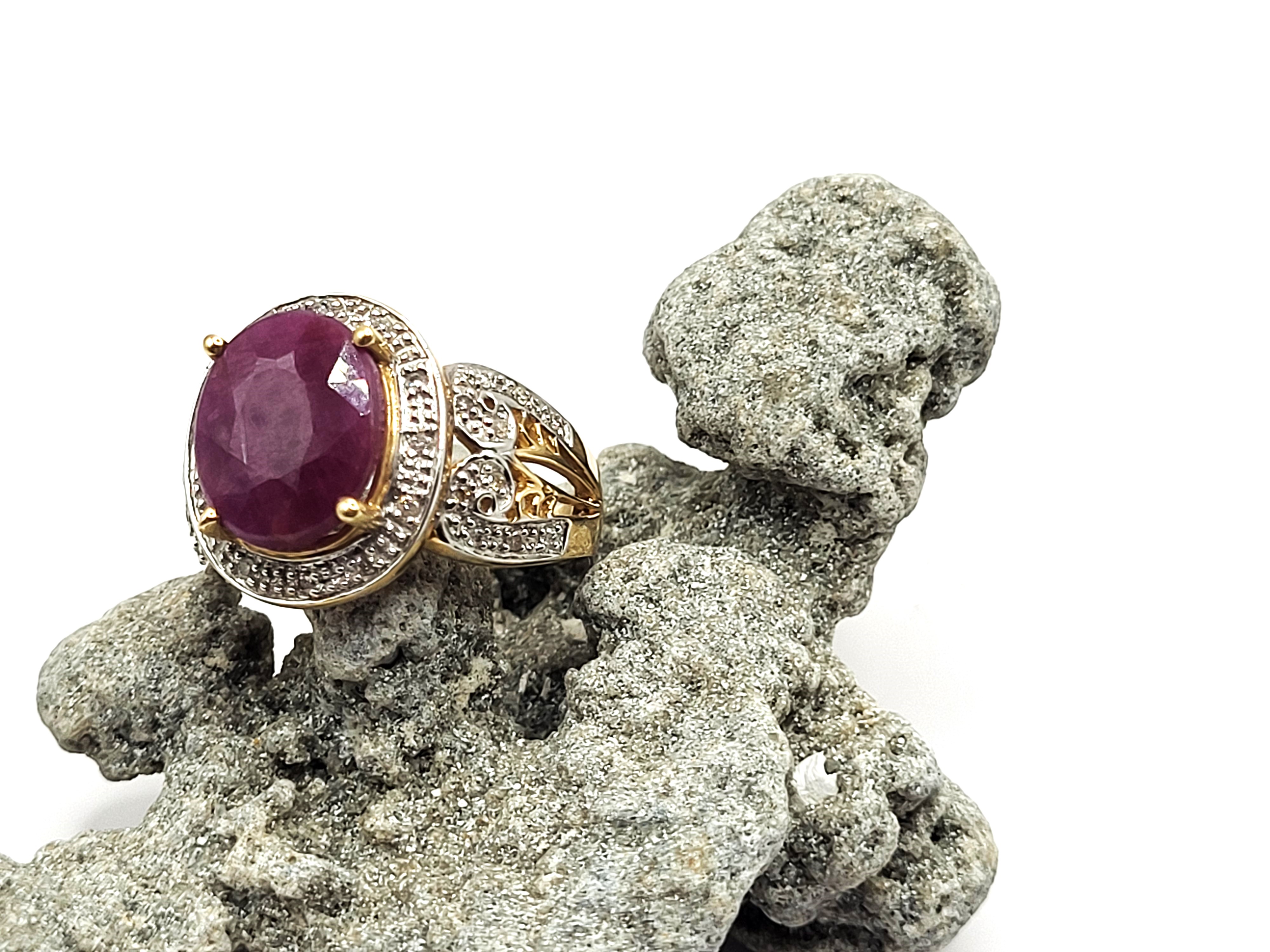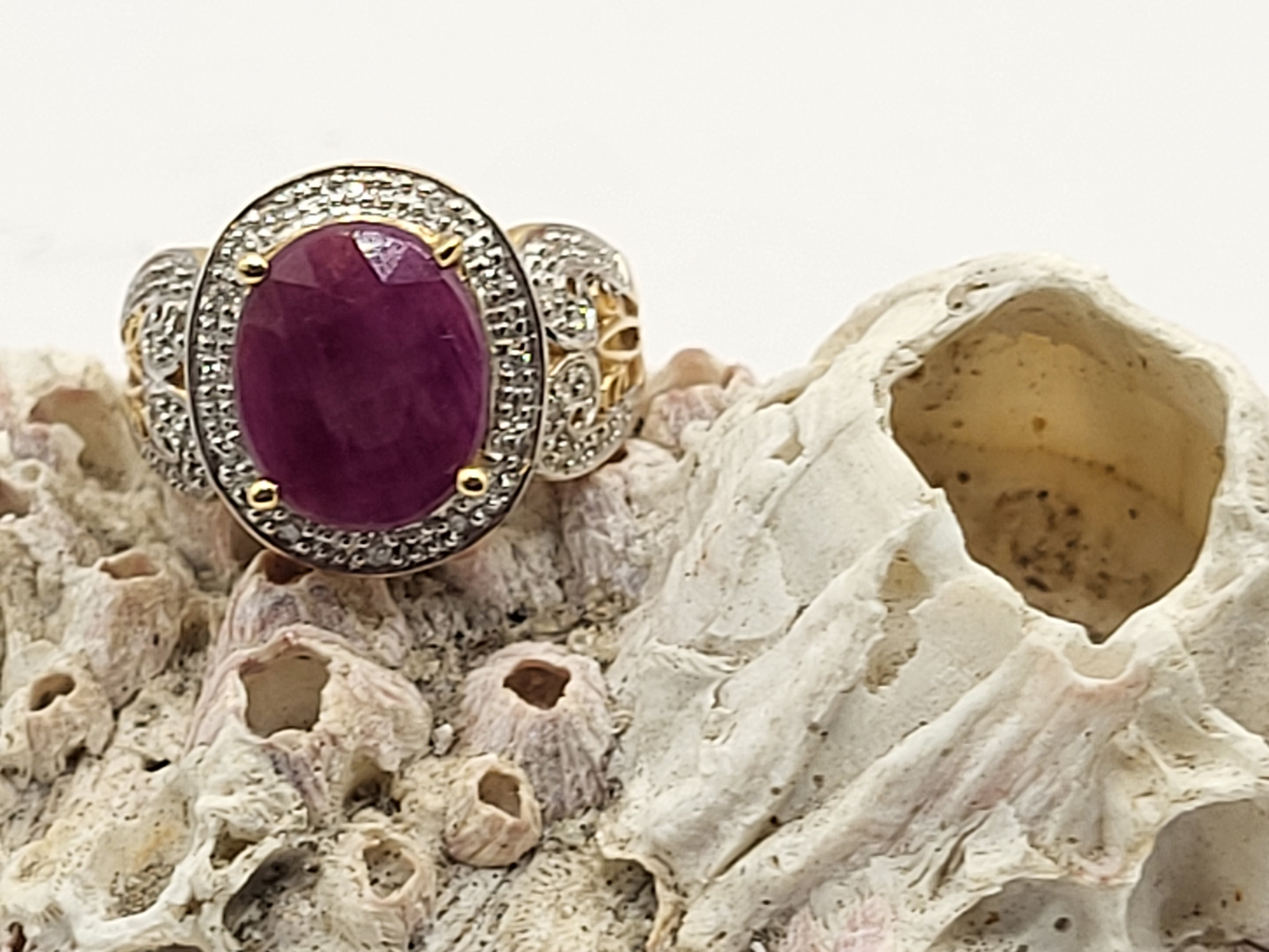This is a 14 karat yellow gold ring with an approximate 5.00 carat, oval-cut, prong-set, genuine ruby (treated*) and approximately .25 carat total weight of round, faceted, H-I color, I1 clarity diamonds. This ring is US size 7.25 and can be sized for an additional charge. Please contact Bidfair Fine Jewelry for sizing details.