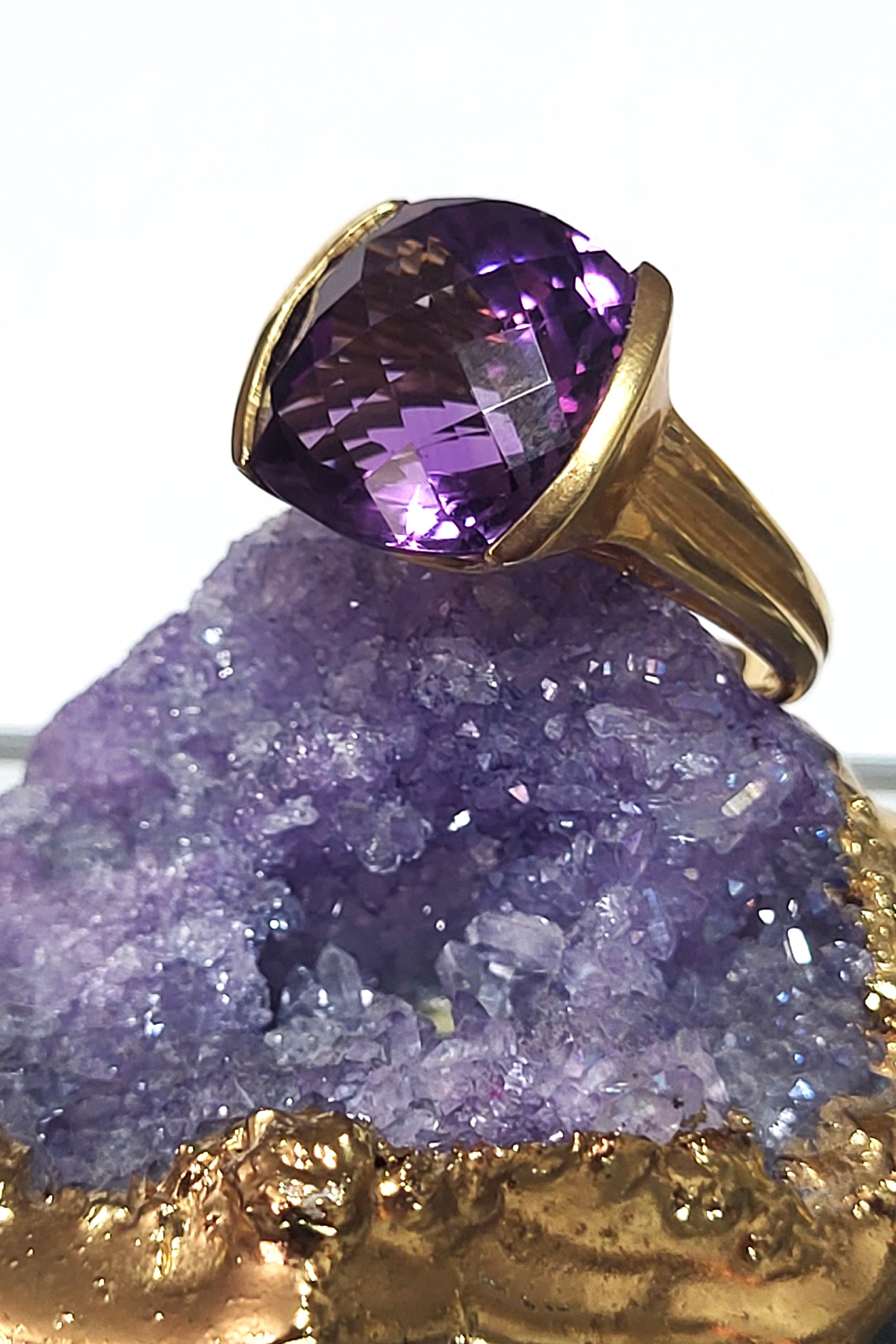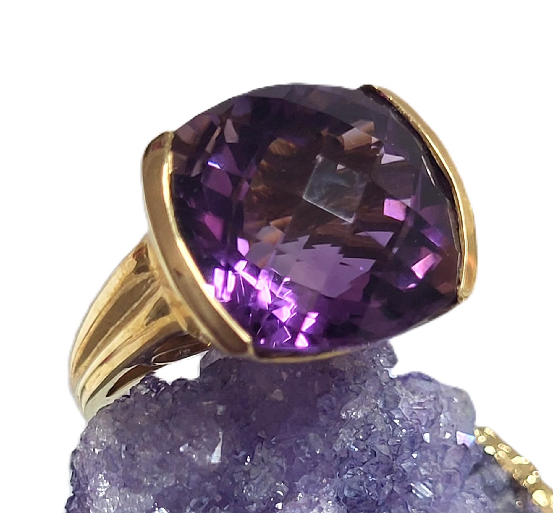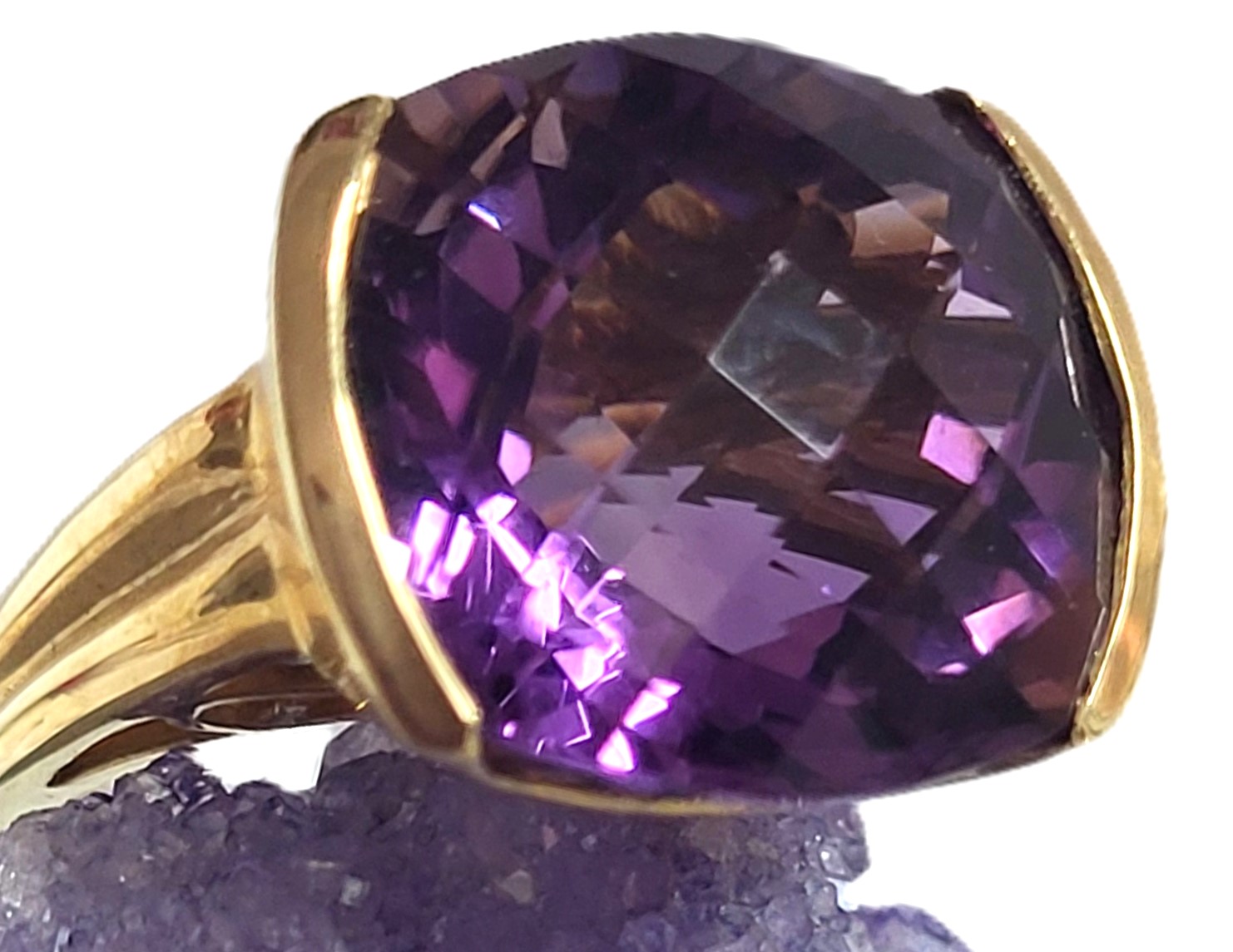 An approximate 11.00 carat, cushion-cut, top-faceted, genuine deep purple amethyst is semi-bezel set in this 14 karat yellow gold ring with a glamorous swirled bridge and solid, ribbed cathedral shoulders, which taper to an approximate 2.5mm shank. The ring is US size 7 and can be sized for an additional charge. This item is eligible for appraisal at a discounted rate, from an independent appraiser (with qualifying credentials from GIA) with no affiliation to Bidfair Fine Jewelry. Please contact Bidfair Fine Jewelry for more information on appraisals and sizing. Admin: 33109/19nbl