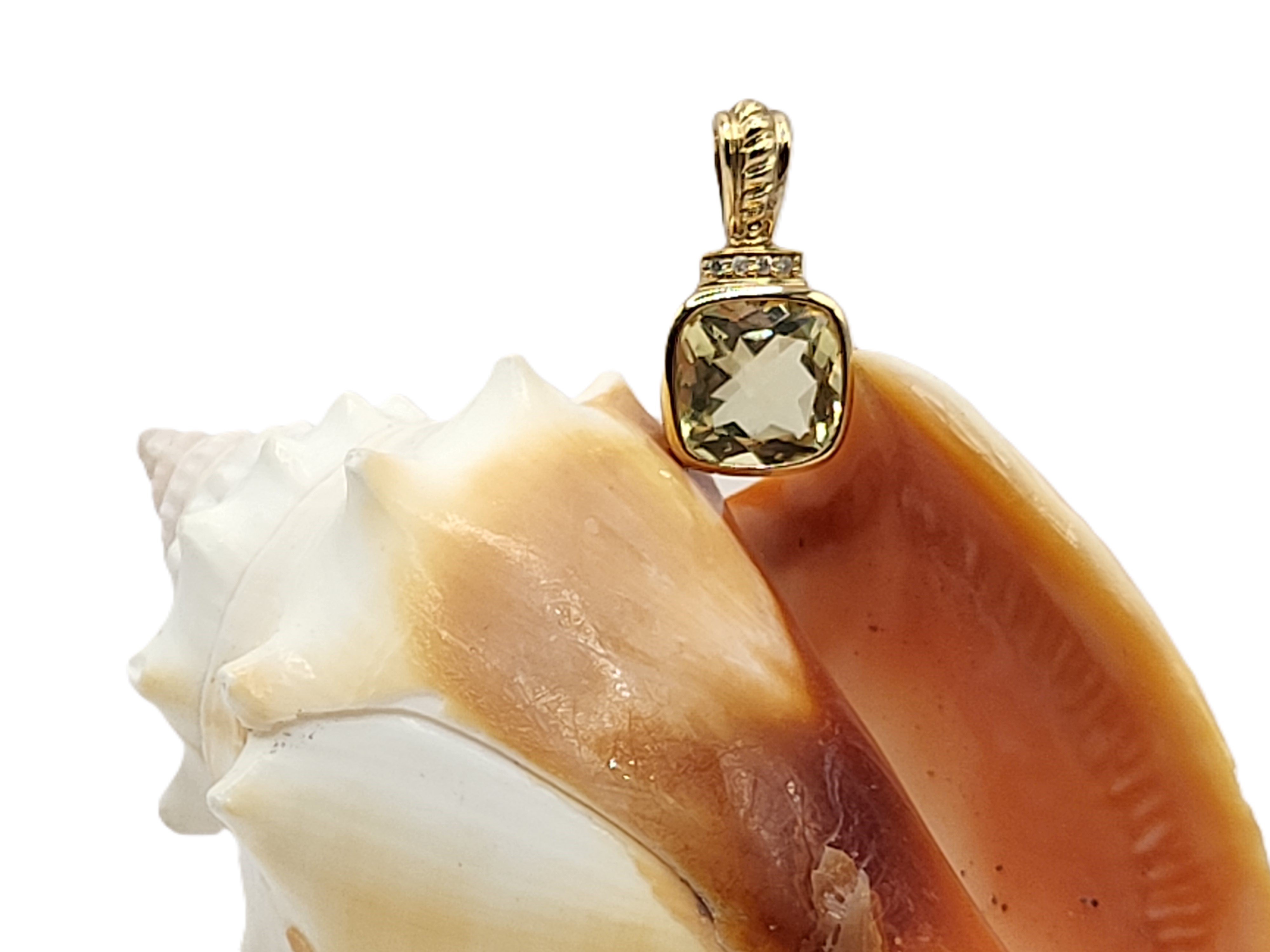 This is a pair of 14 karat yellow gold earrings that feature 6.75 carats total weight of cushion-cut, bezel-set, genuine lemon quartz and .04 carats total weight round, brilliant-cut, H color, SI2 clarity accent diamonds. These earrings have twisted rope designs at the bottoms, that curve back as part of the Omega back closure.