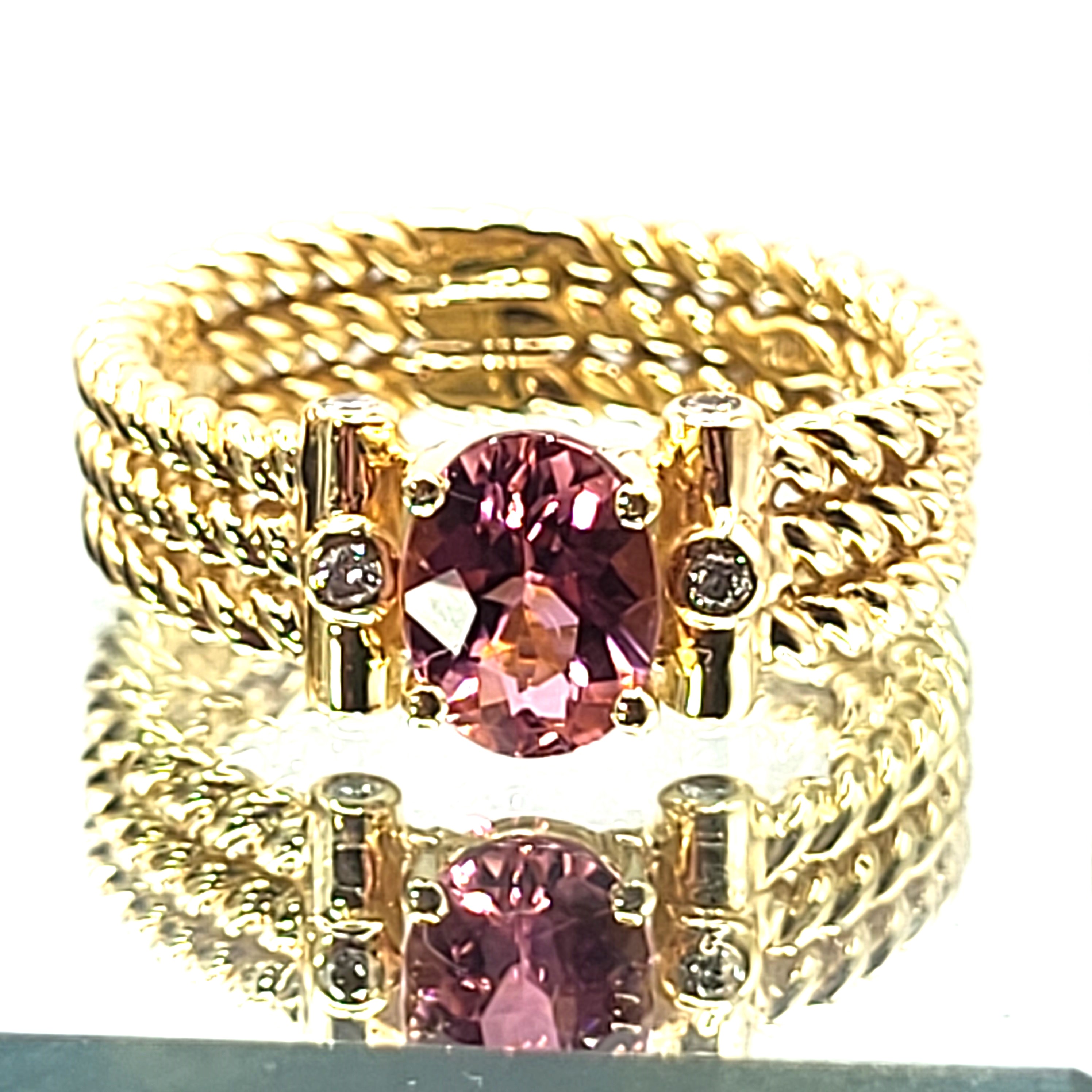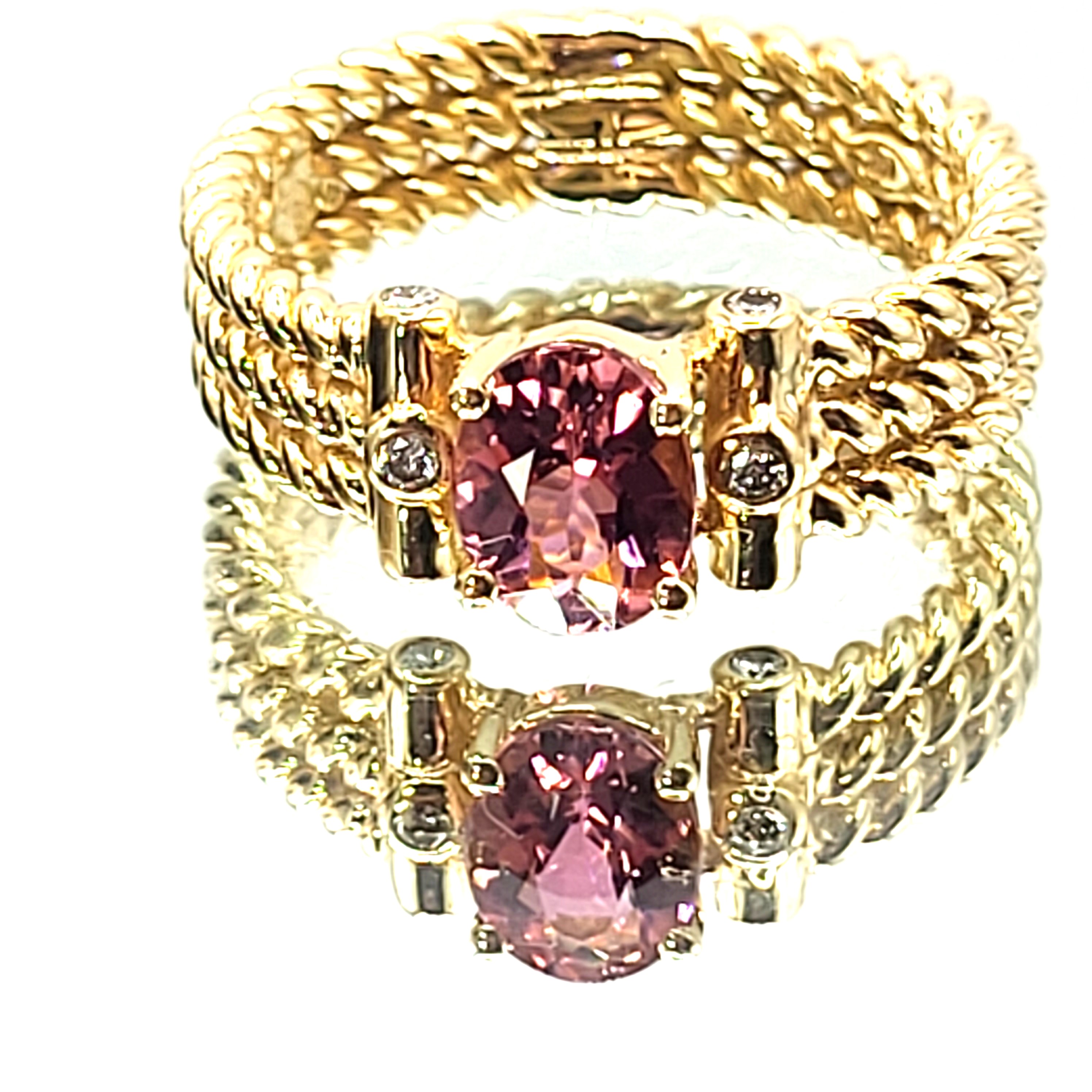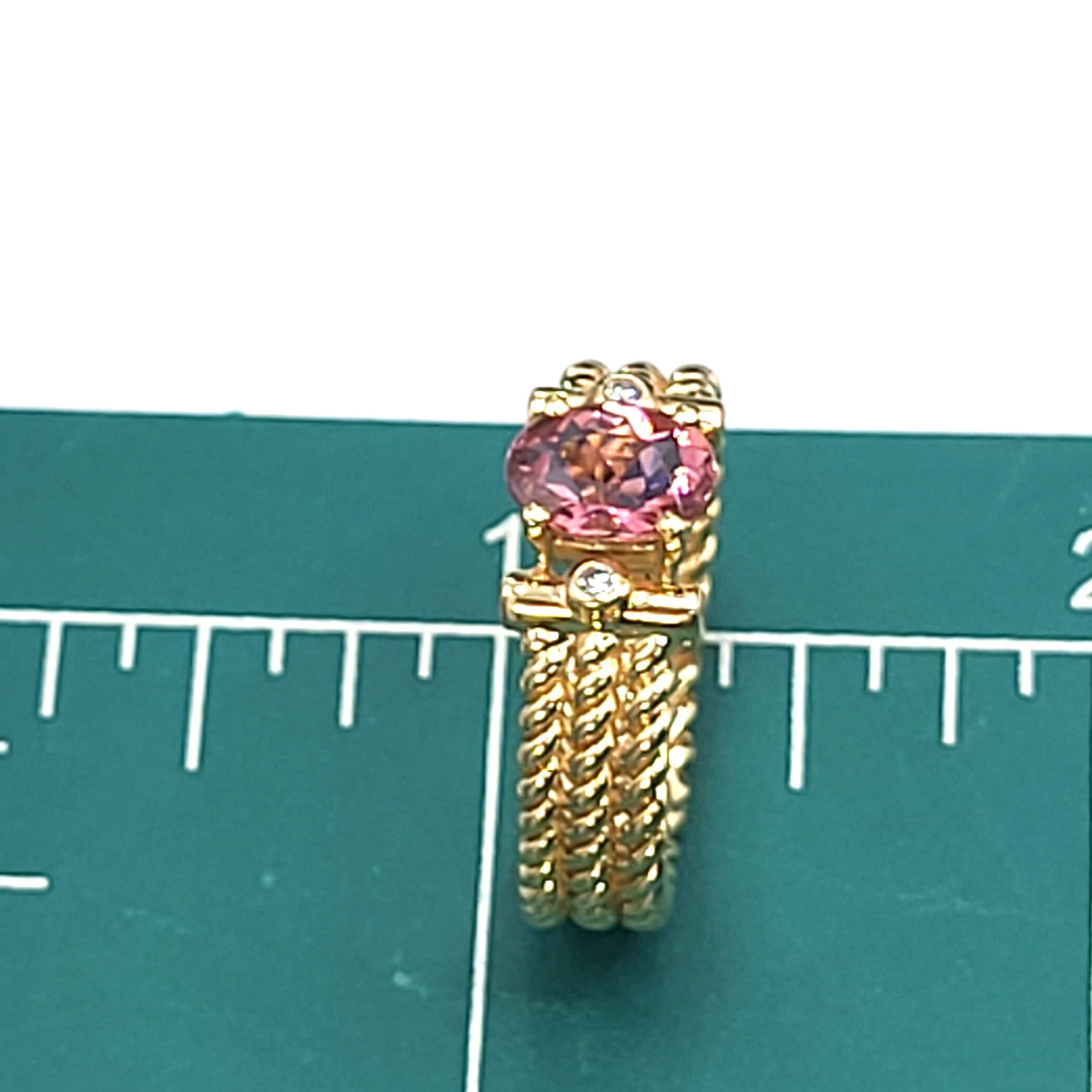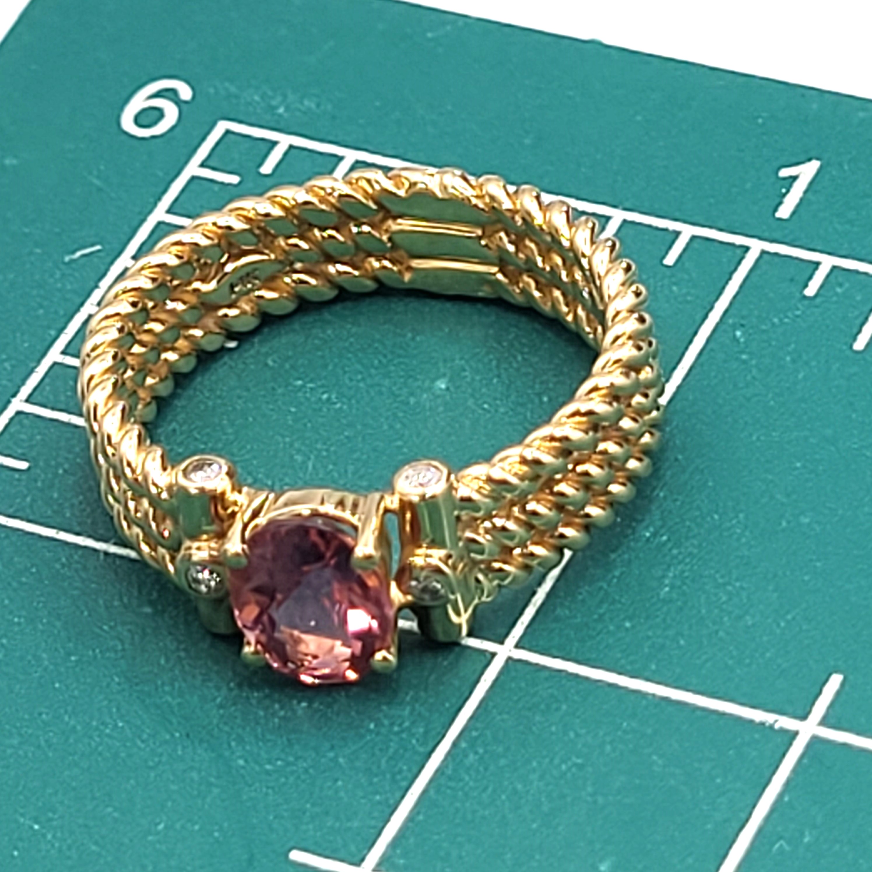 Three rows of solid 14 karat yellow gold twisted rope form the shank of this ring with an approximate 1.25 carat warm and vibrant, oval-cut pink tourmaline that is prong-set with approximately .12 carats total weight of round, brilliant-cut, approximate H color, SI2 clarity diamonds that are bezel-set in the the shoulders. The ring is approximately 6mm wide and tapers slightly at the bottom. The pink tourmaline is low profile to prevent some hitting and snagging that can occur throughout the day while wearing. It is a size 9 and can be sized for an additional charge. Admin: 33109/7iha