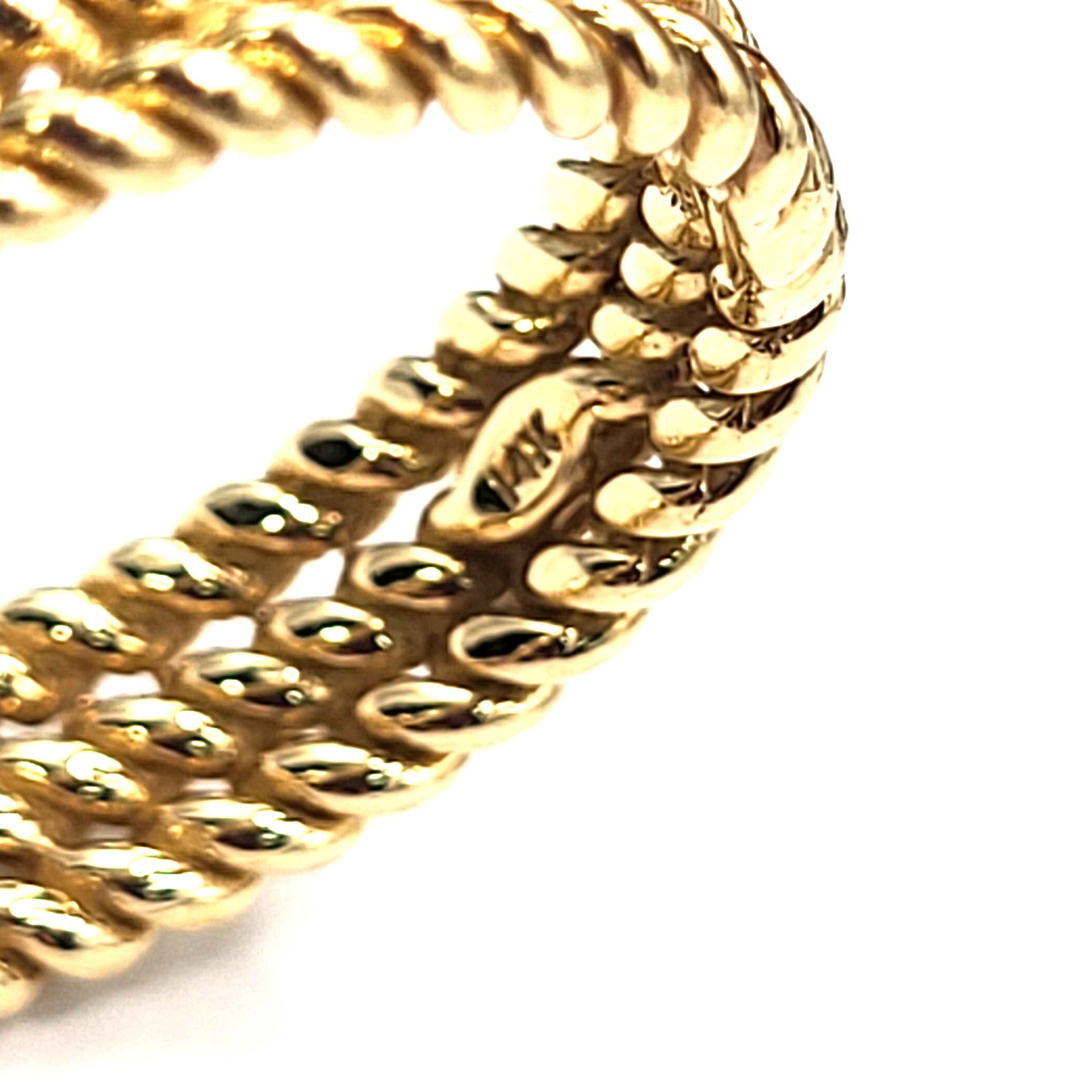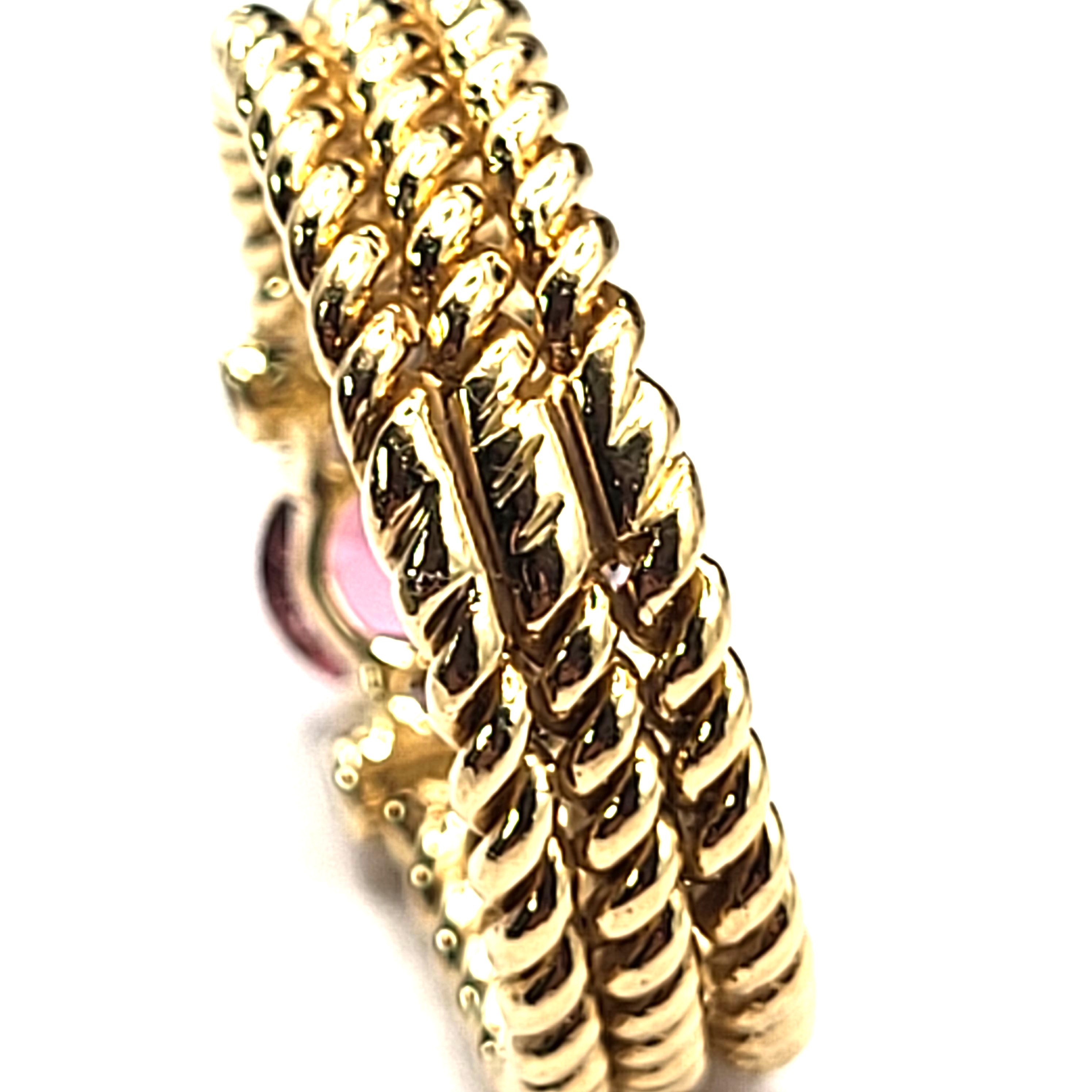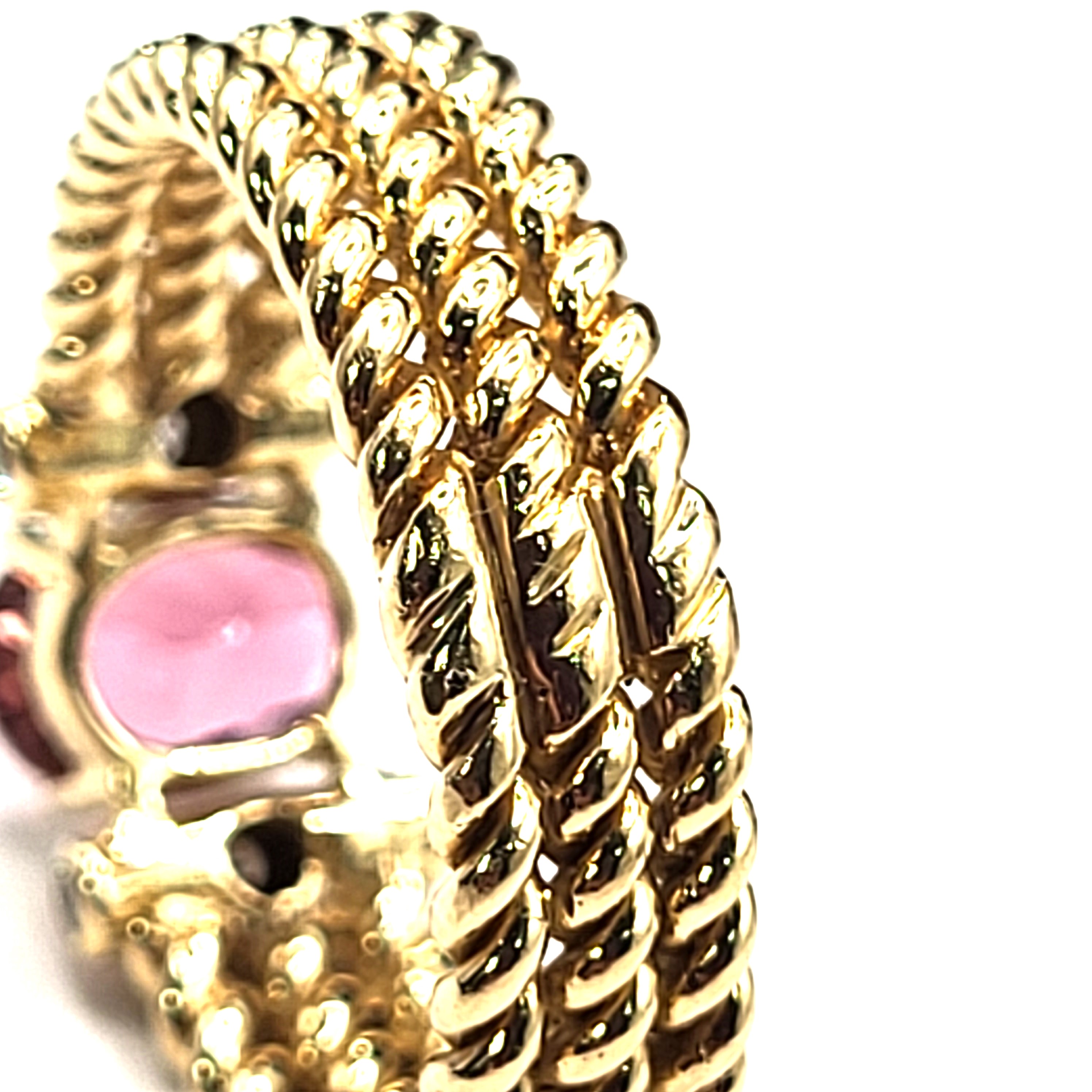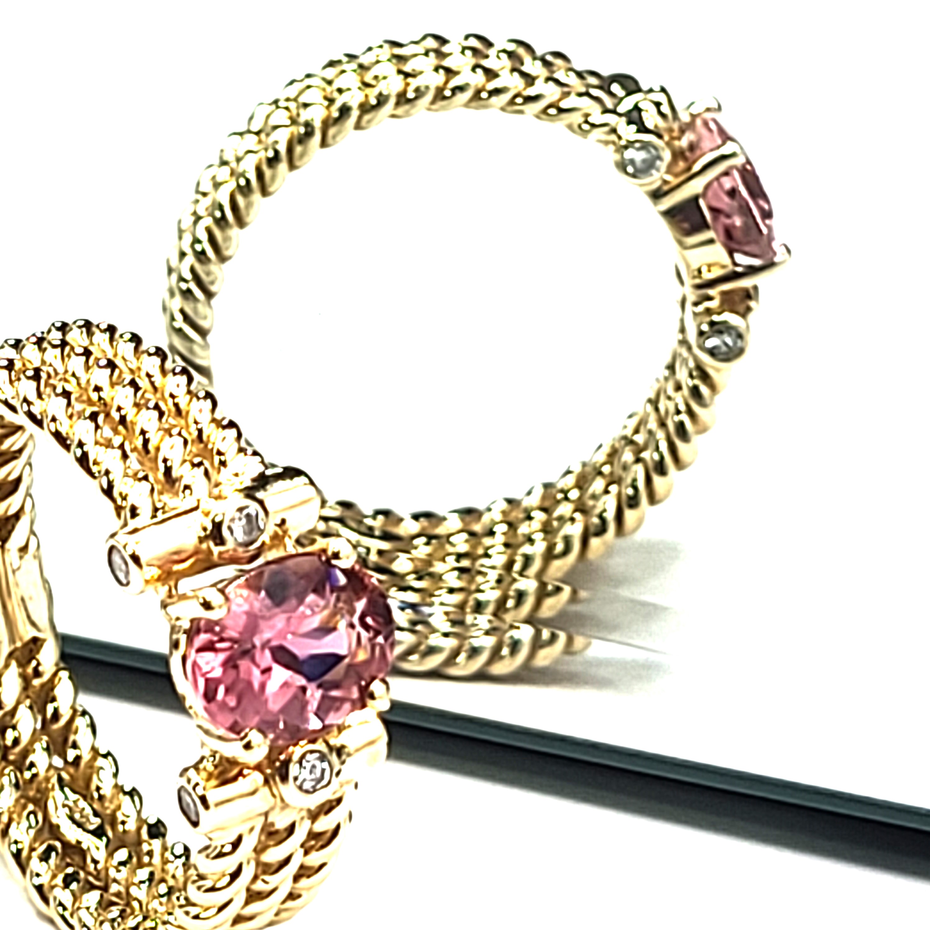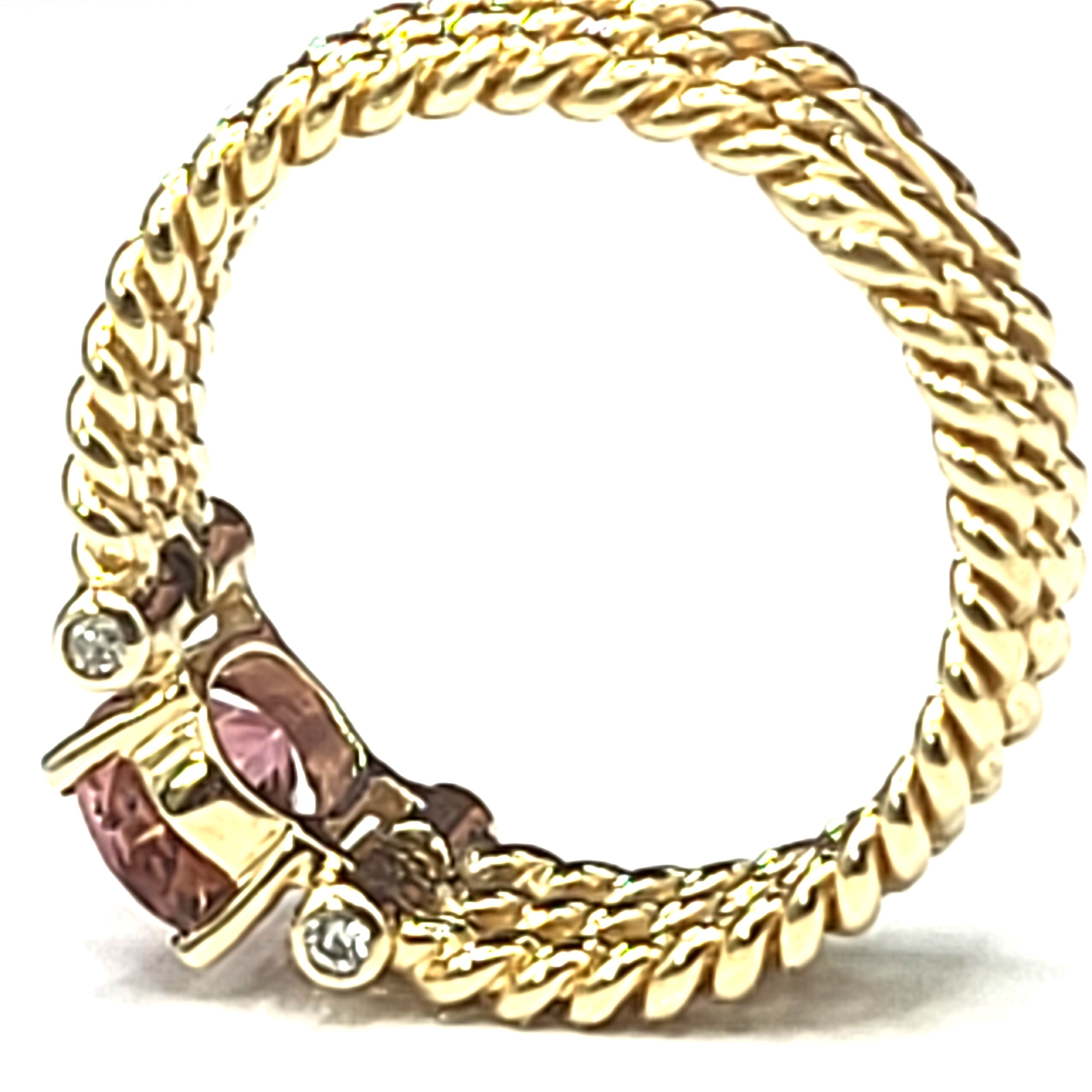 Three rows of solid 14 karat yellow gold twisted rope form the shank of this ring with an approximate 1.25 carat warm and vibrant, oval-cut pink tourmaline that is prong-set with approximately .12 carats total weight of round, brilliant-cut, approximate H color, SI2 clarity diamonds that are bezel-set in the the shoulders. The ring is approximately 6mm wide and tapers slightly at the bottom. The pink tourmaline is low profile to prevent some hitting and snagging that can occur throughout the day while wearing. It is a size 9 and can be sized for an additional charge. Admin: 33109/7iha