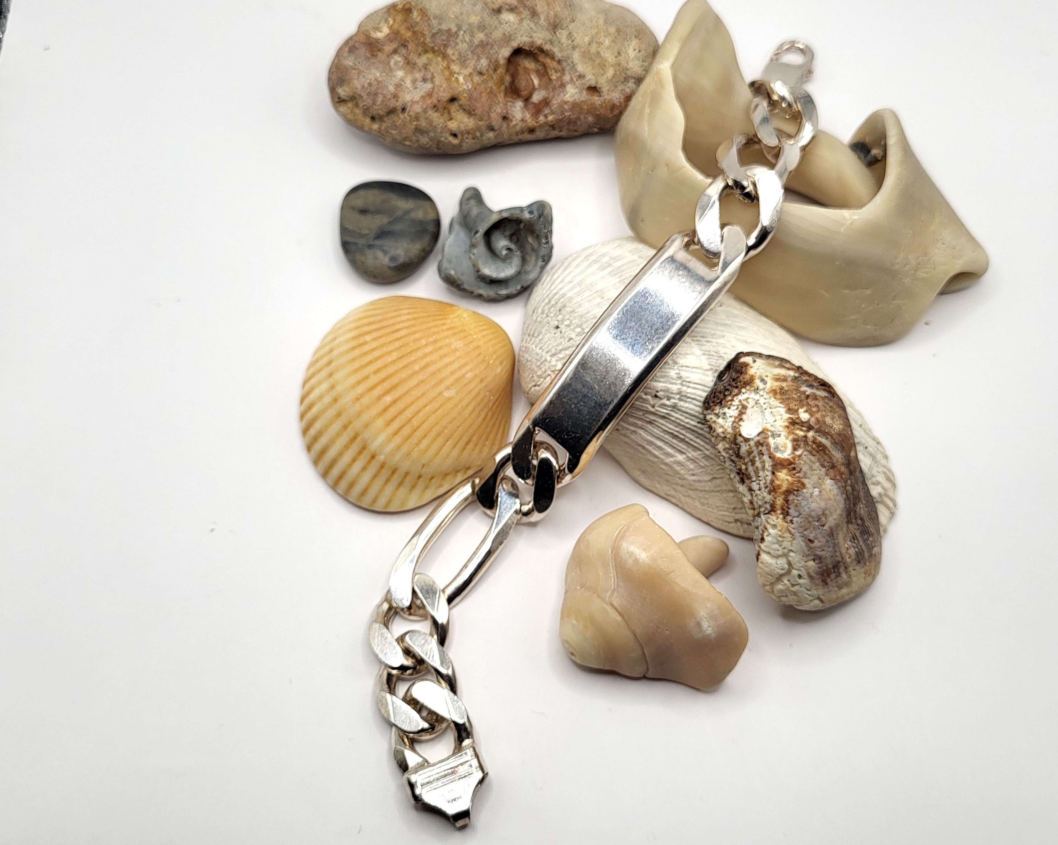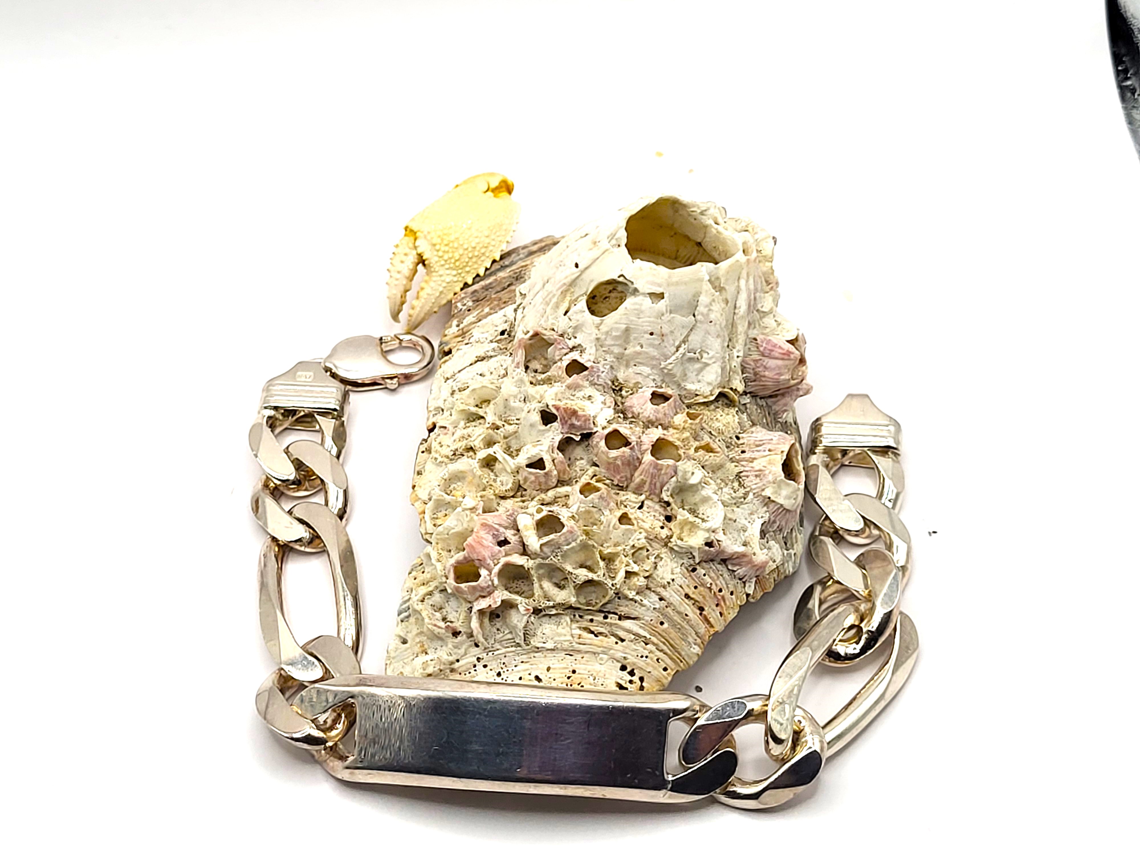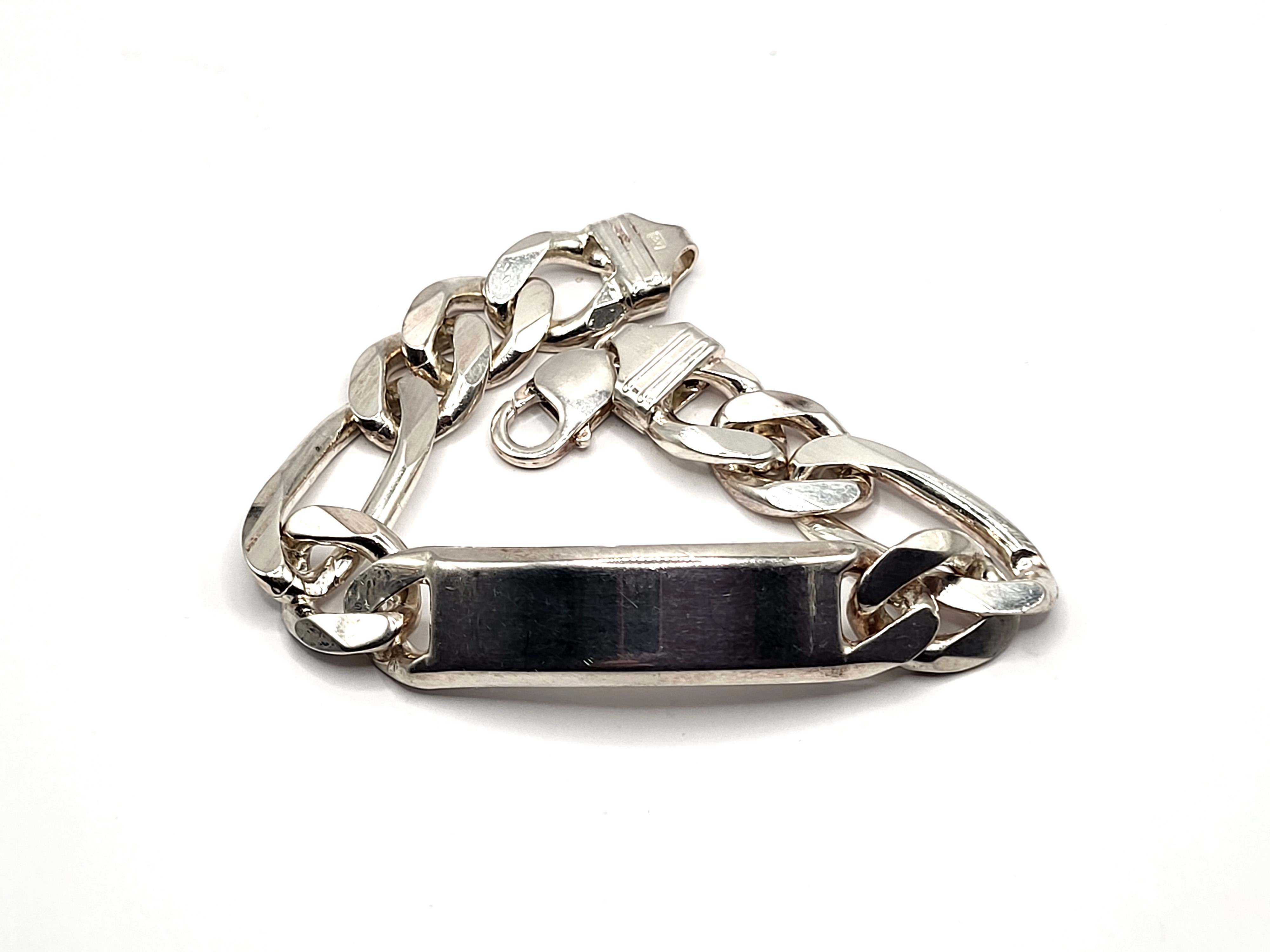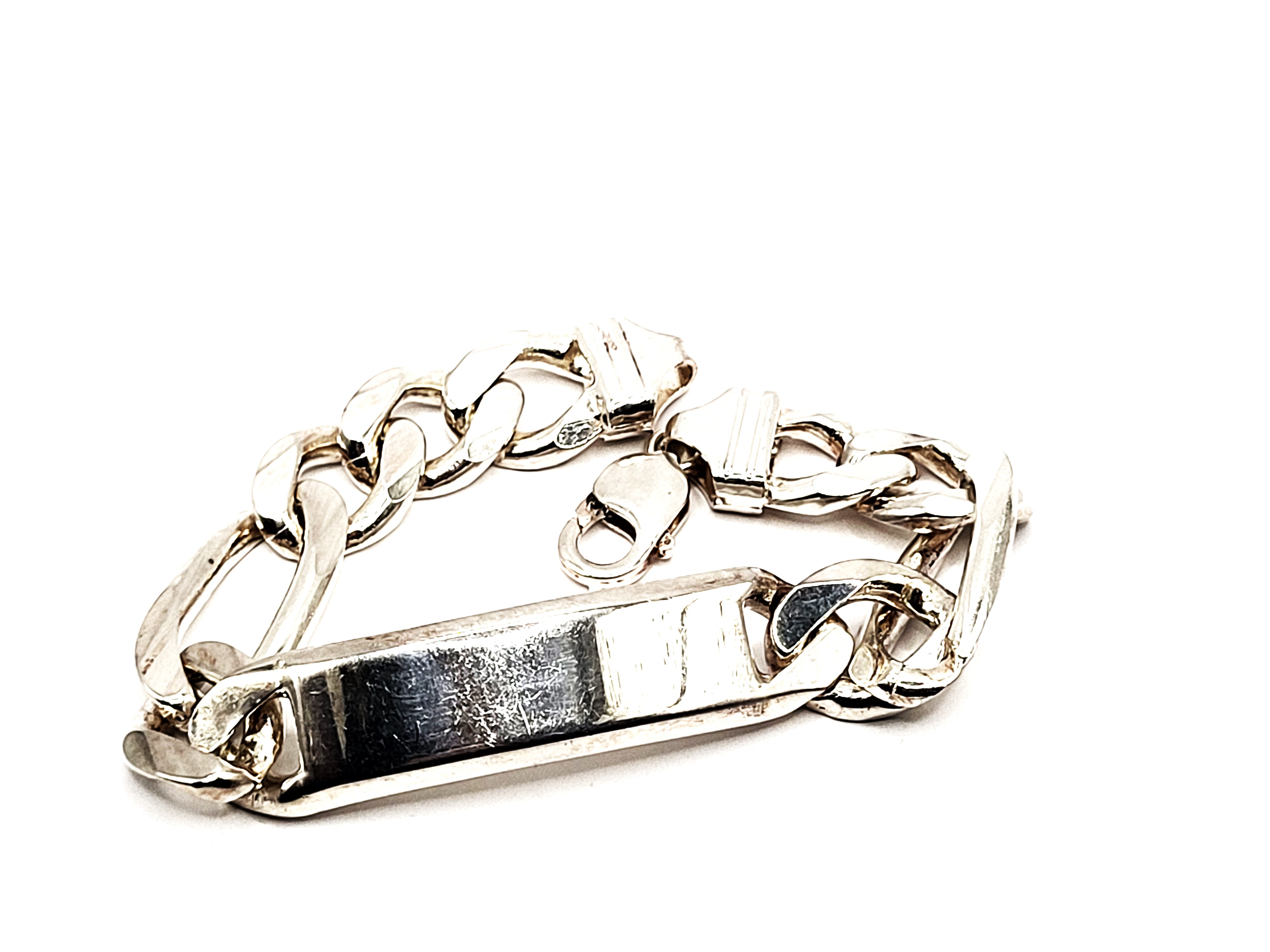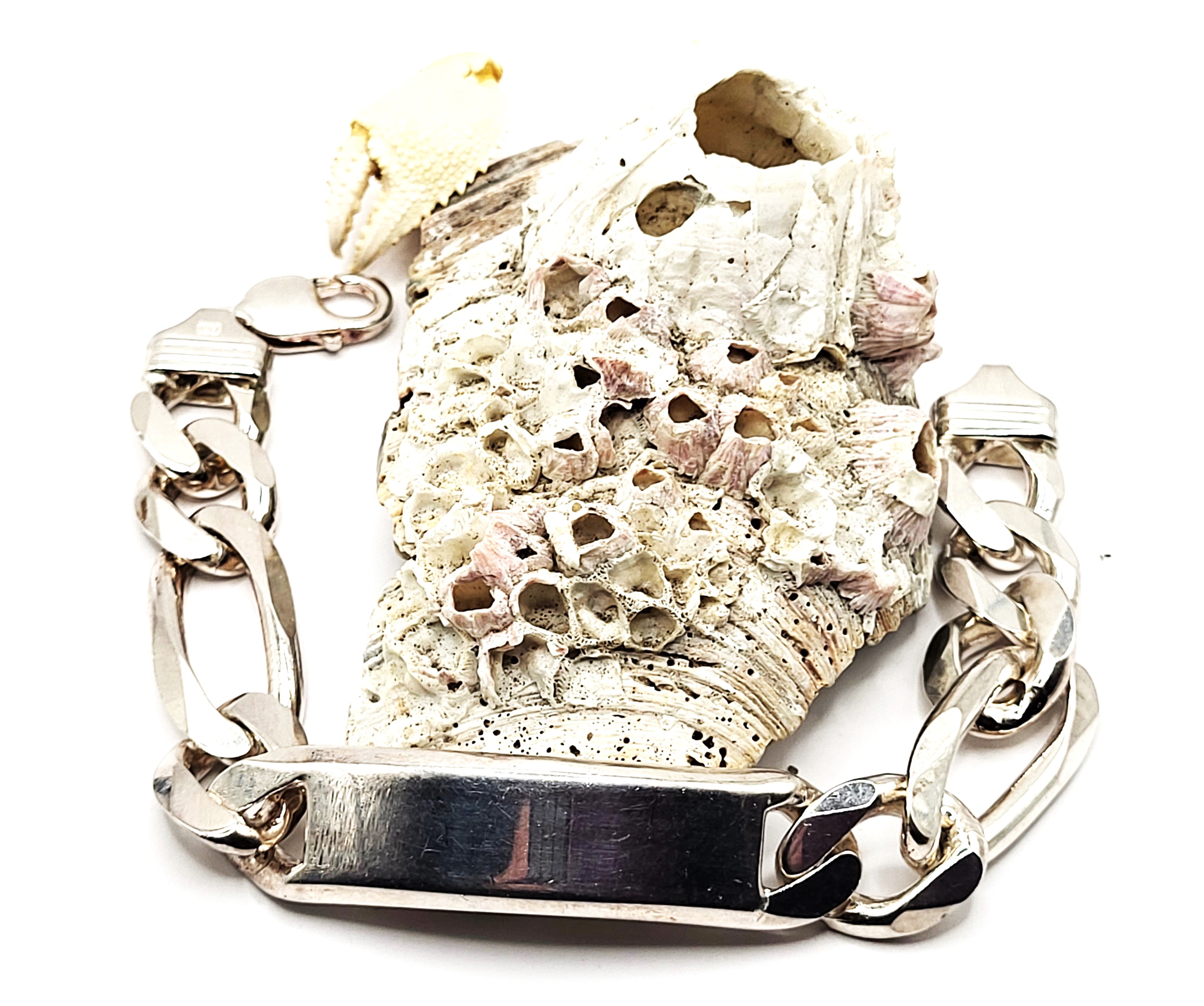 This is a very heavy sterling silver ID bracelet that is 8.25" long and has a lobster clasp.  The convex, engravable plate is approximately 2" long, 5/8" wide, and 4.25mm thick. The figaro links are approximately 17mm wide. Admin: 33120/3ae