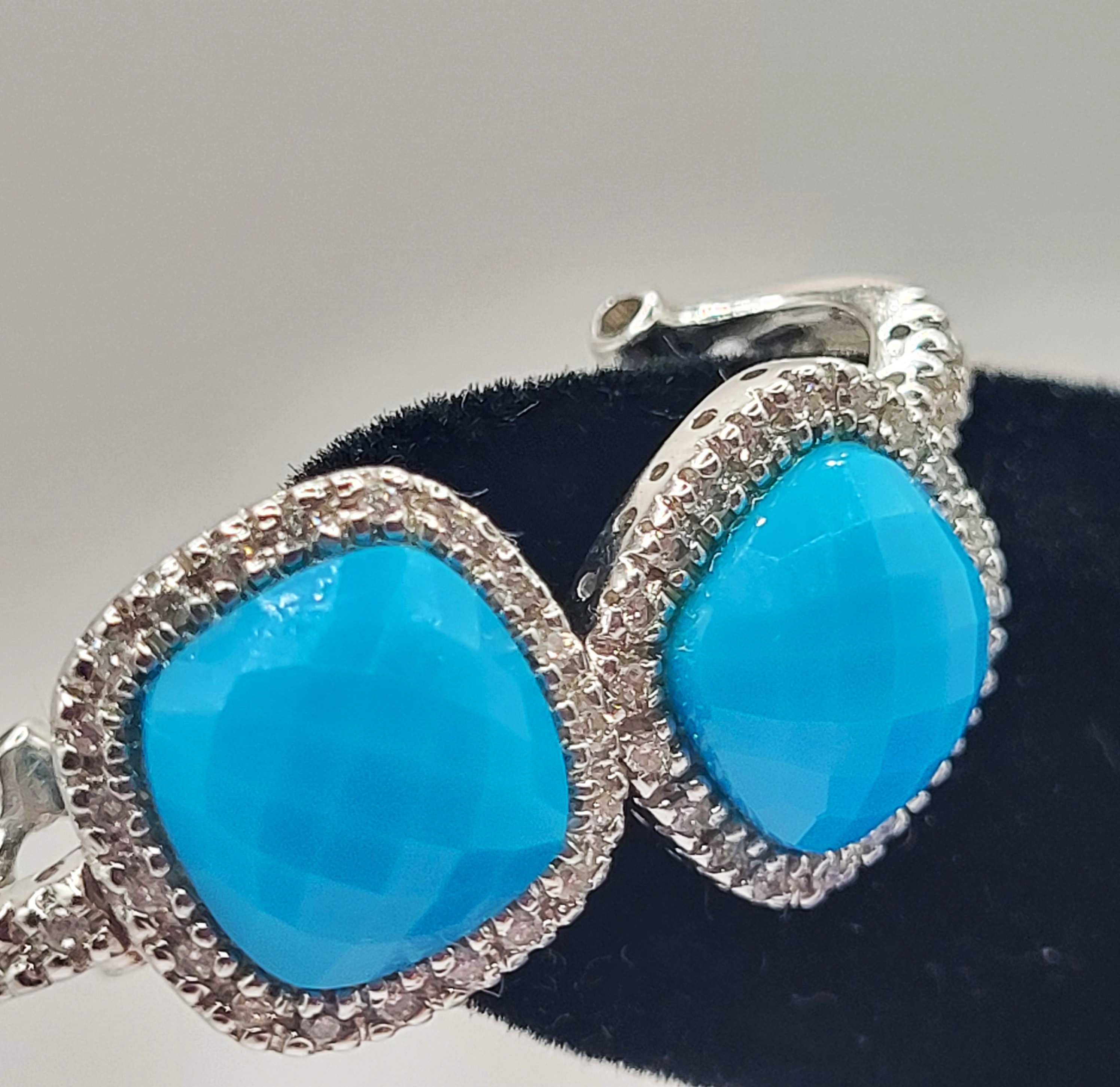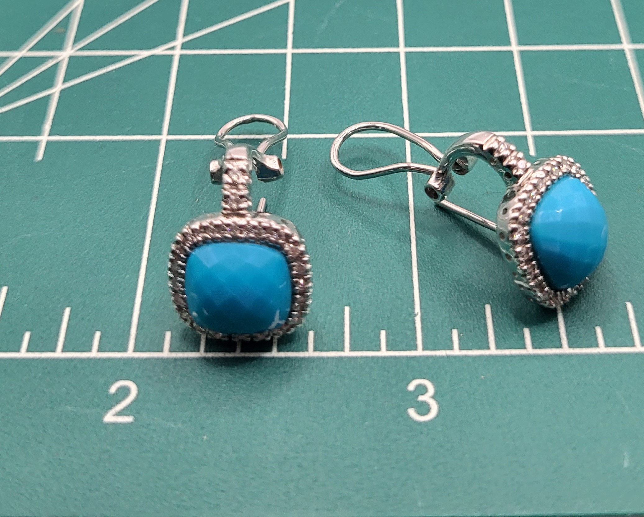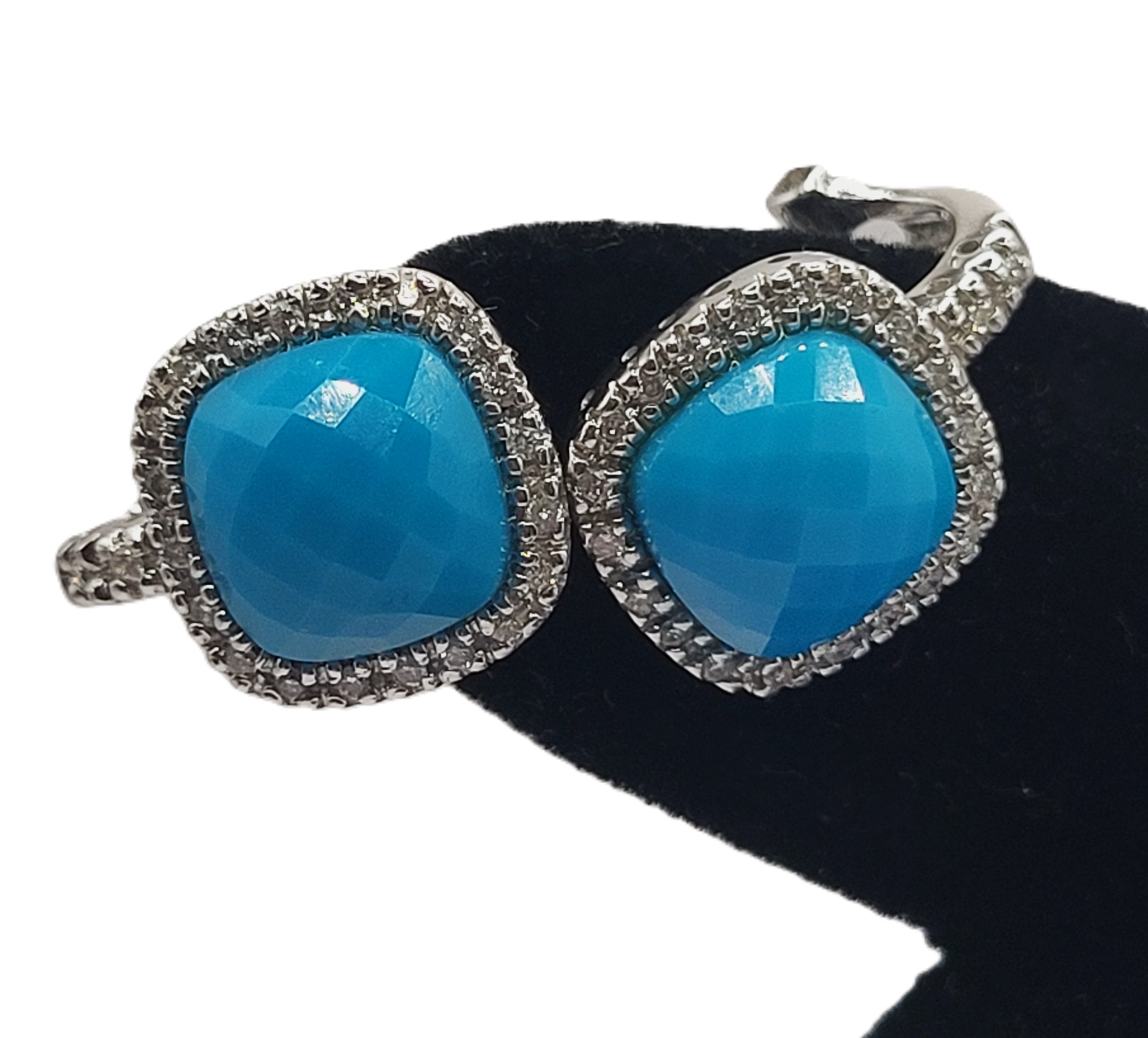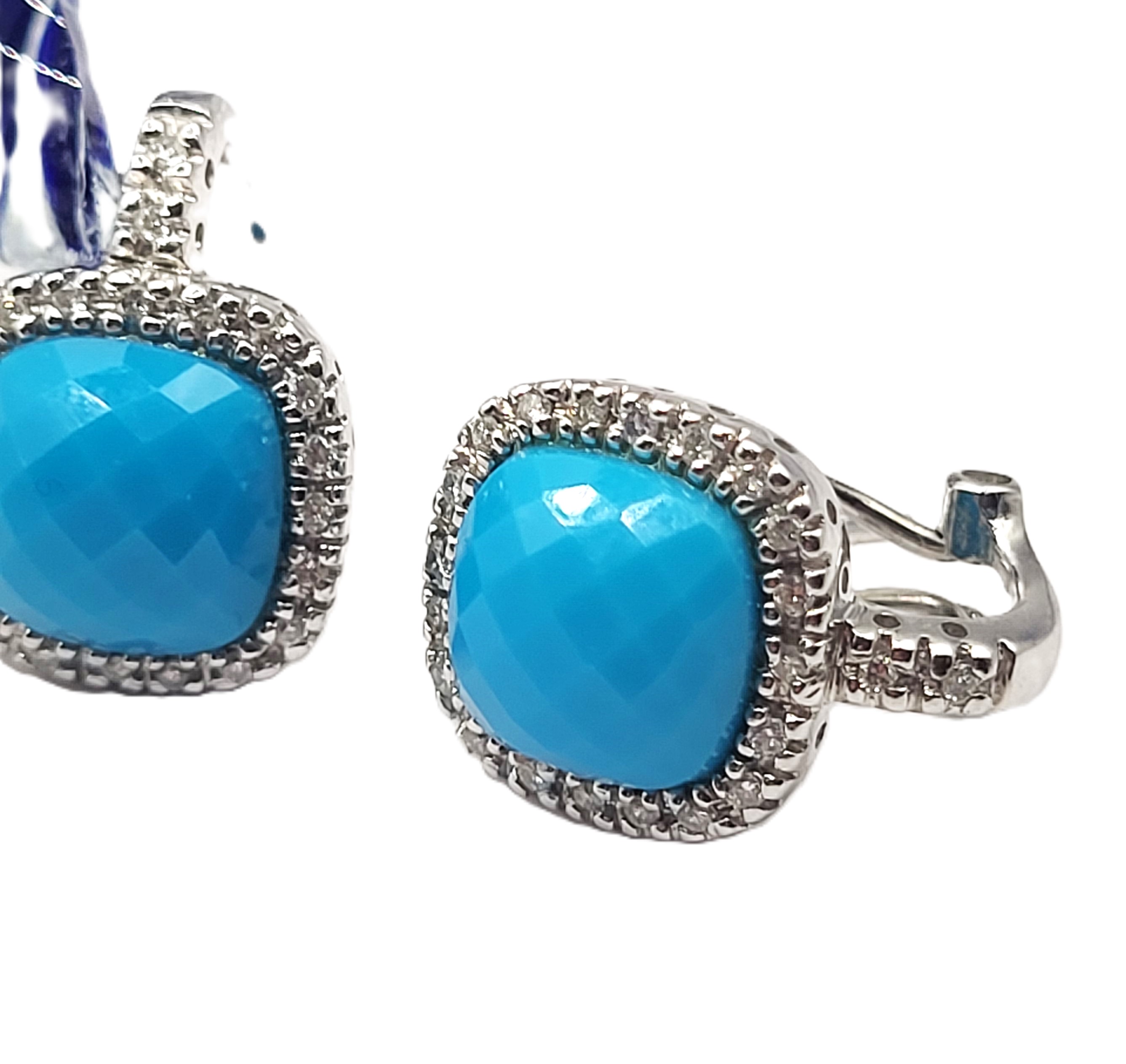 This is a pair of 14 karat white gold earrings that feature 6.30 carats total weight of top-faceted, cabochon-cut, genuine blue turquoise and .24 carats total weight of round, brilliant-cut, H-I color, Si2-I1 clarity diamonds in the halos and stems. These earrings attached to the earlobe with posts and Omega backs. They are approximately 5/8" in diameter. Admin Code: G11241/36lrt