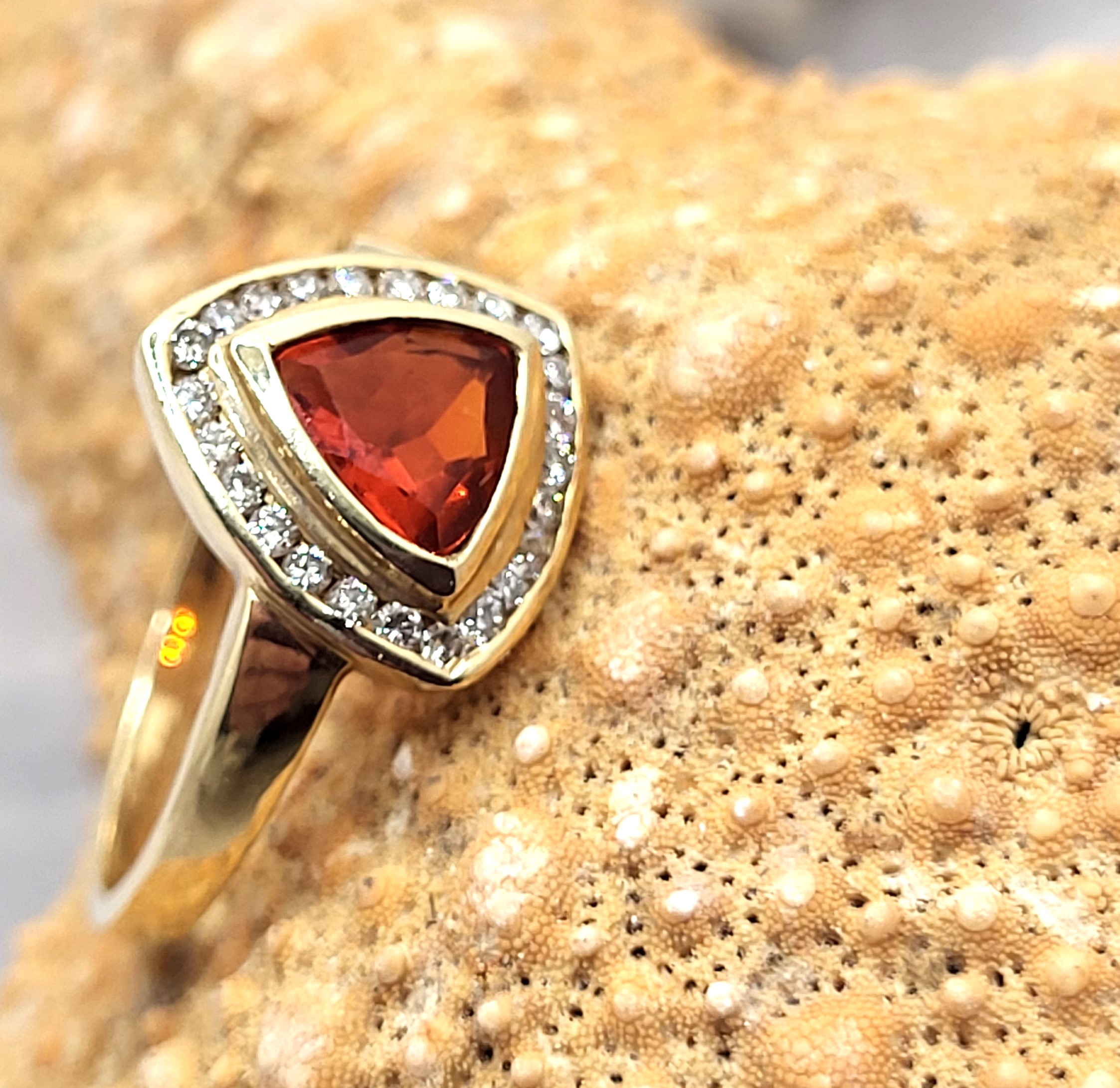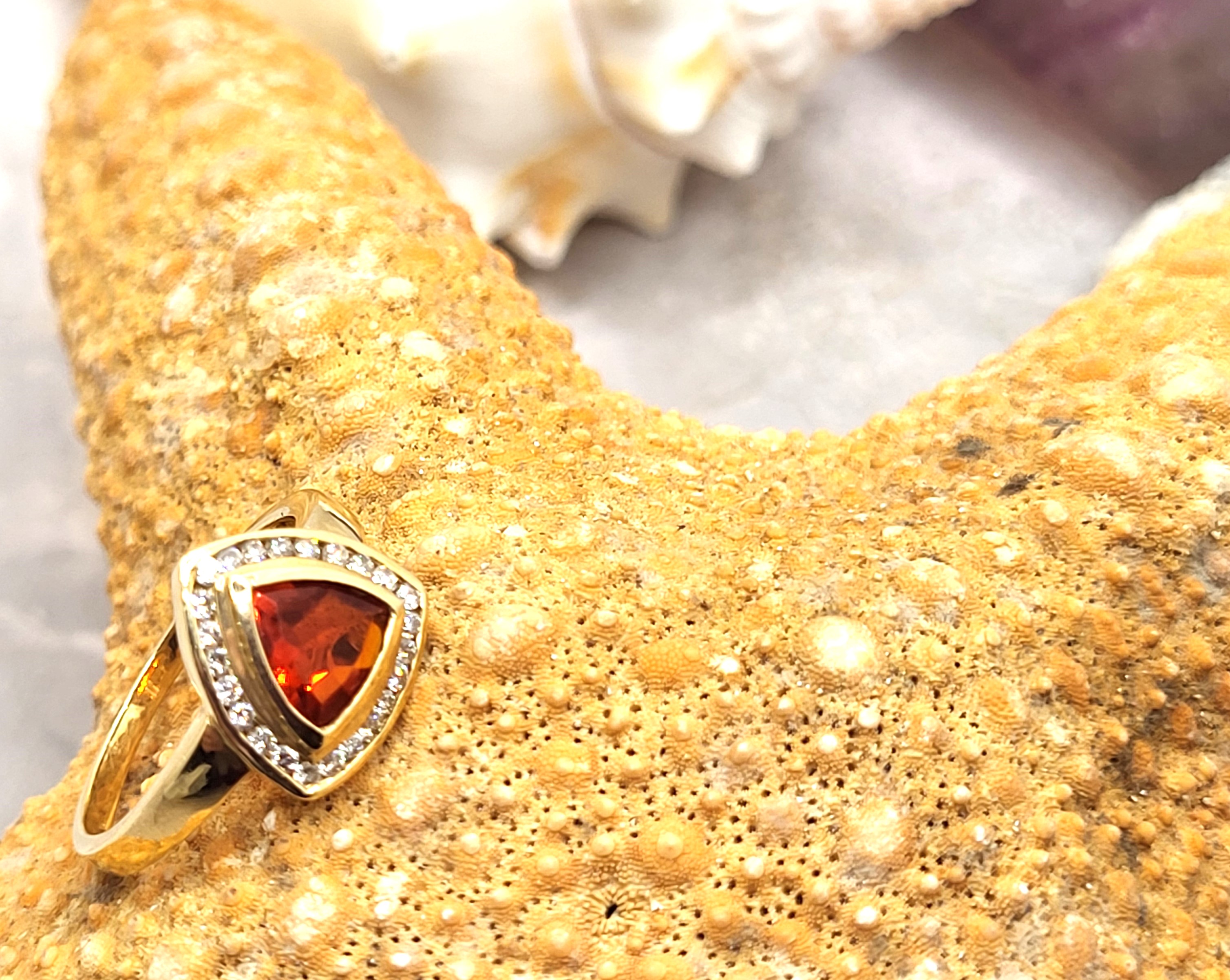 Clear and bright! This 14 karat yellow gold ring presents an approximate .50 carat, trilliant-cut, bezel-set, bright orange Fire Opal with a frame of approximately .25 carats total weight, round-brilliant-cut, approximate H-I color, I1 clarity diamonds. This ring is US size 6.5 and can be sized for an additional charge. This ring is eligible for appraisal at a discounted rate, by an independent appraiser (with qualifying credentials from GIA) and no affiliation to Bidfair Fine Jewelry. Please contact Bidfair Fine Jewelry for more information on appraisals and sizing.. This is a brand new item that has been held in back stock. It is in excellent condition, but may have minor signs of storage, such as fine scratches or patina. Admin: 3110/12bnn