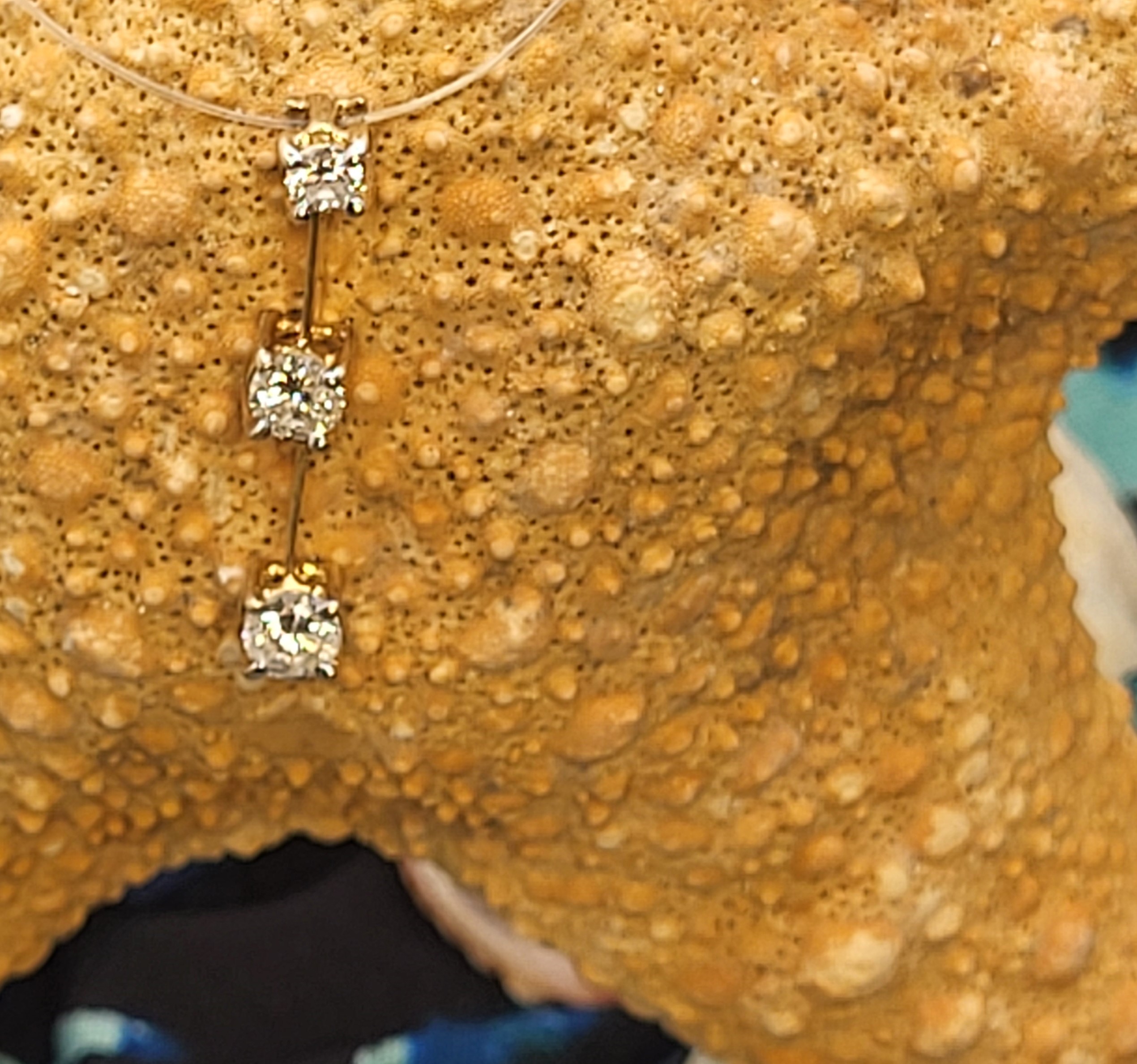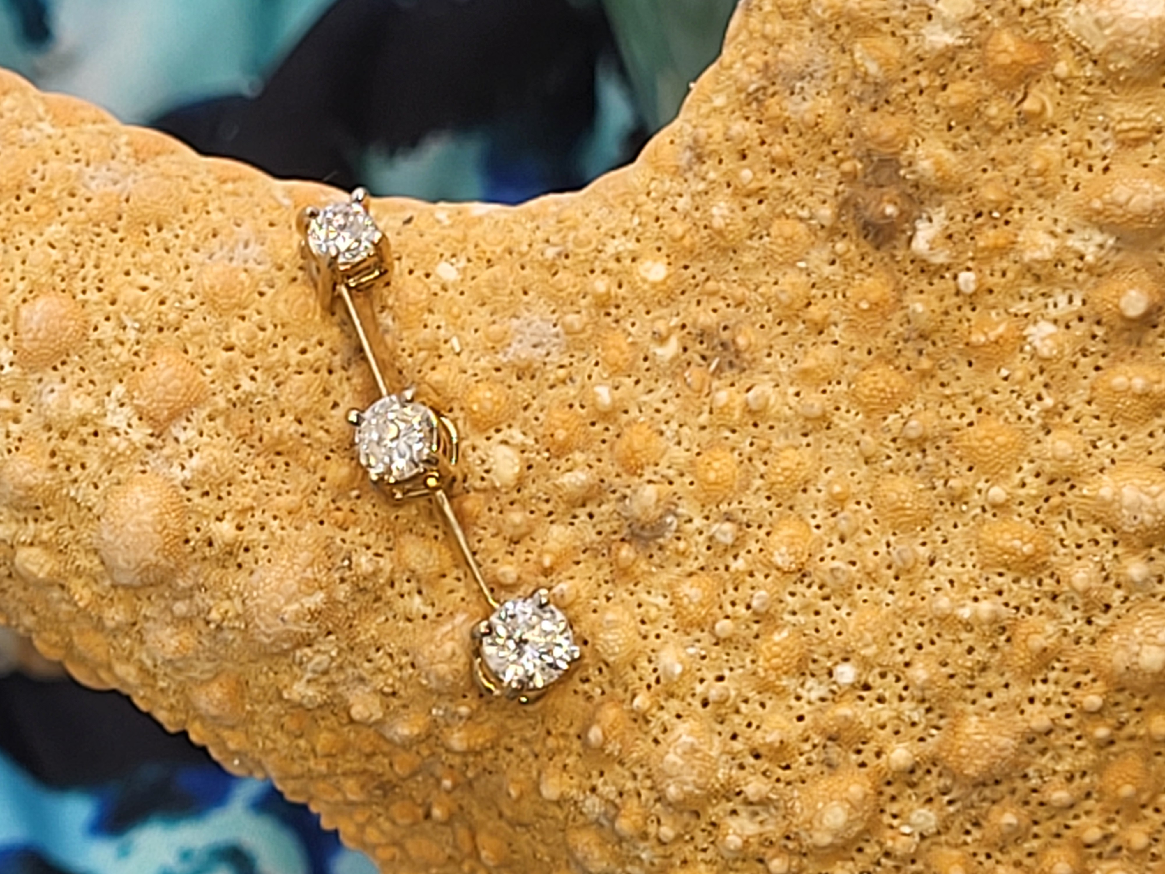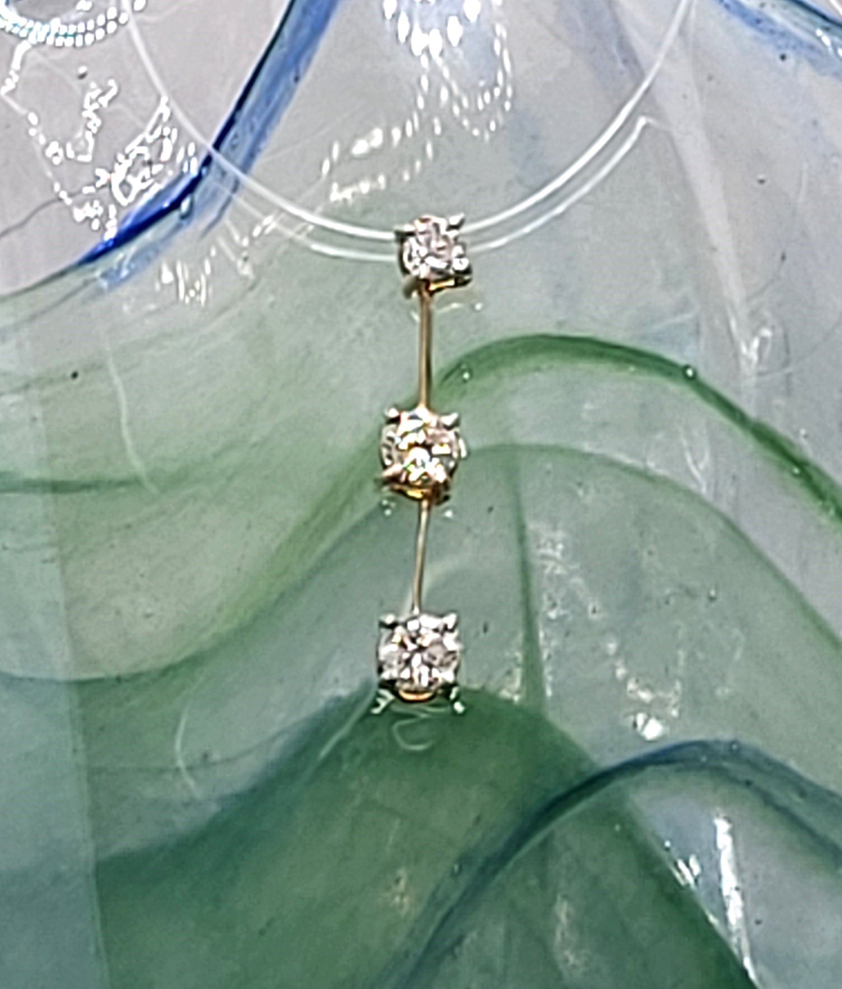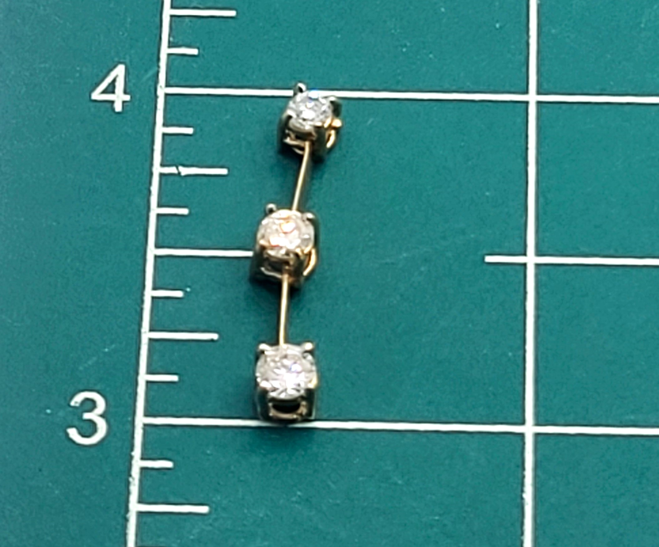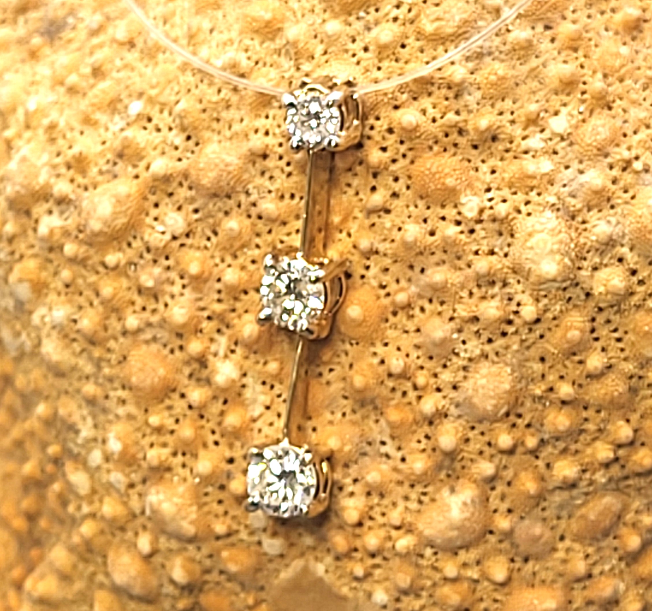 This is a 14 karat yellow gold pendant with three diamonds in a vertical row, that has long been associated with the Past, Present, and Future! There are approximately .60 carats total weight of H, SI2, round, brilliant-cut diamonds. The vertical pendant is constructed with 2 segments that are hinged together, allowing the pendant to move, as a dangling earring would. The pendant is approximately 7/8" long with a built-in bail. The pendant bears the hallmark CI, for Caspian International, a jewelry manufacturing company that is/was in North Carolina. Admin: 12kj329/hh