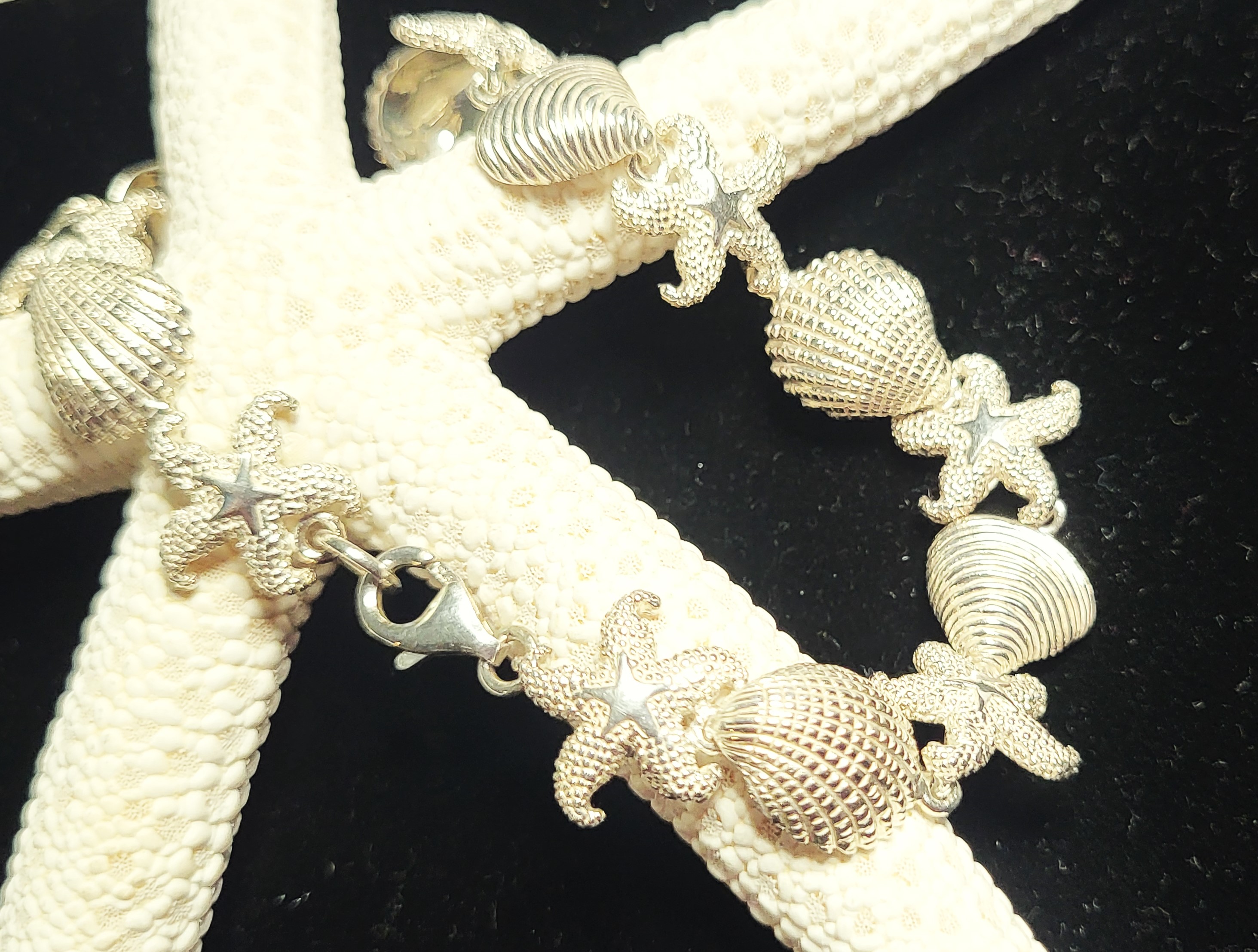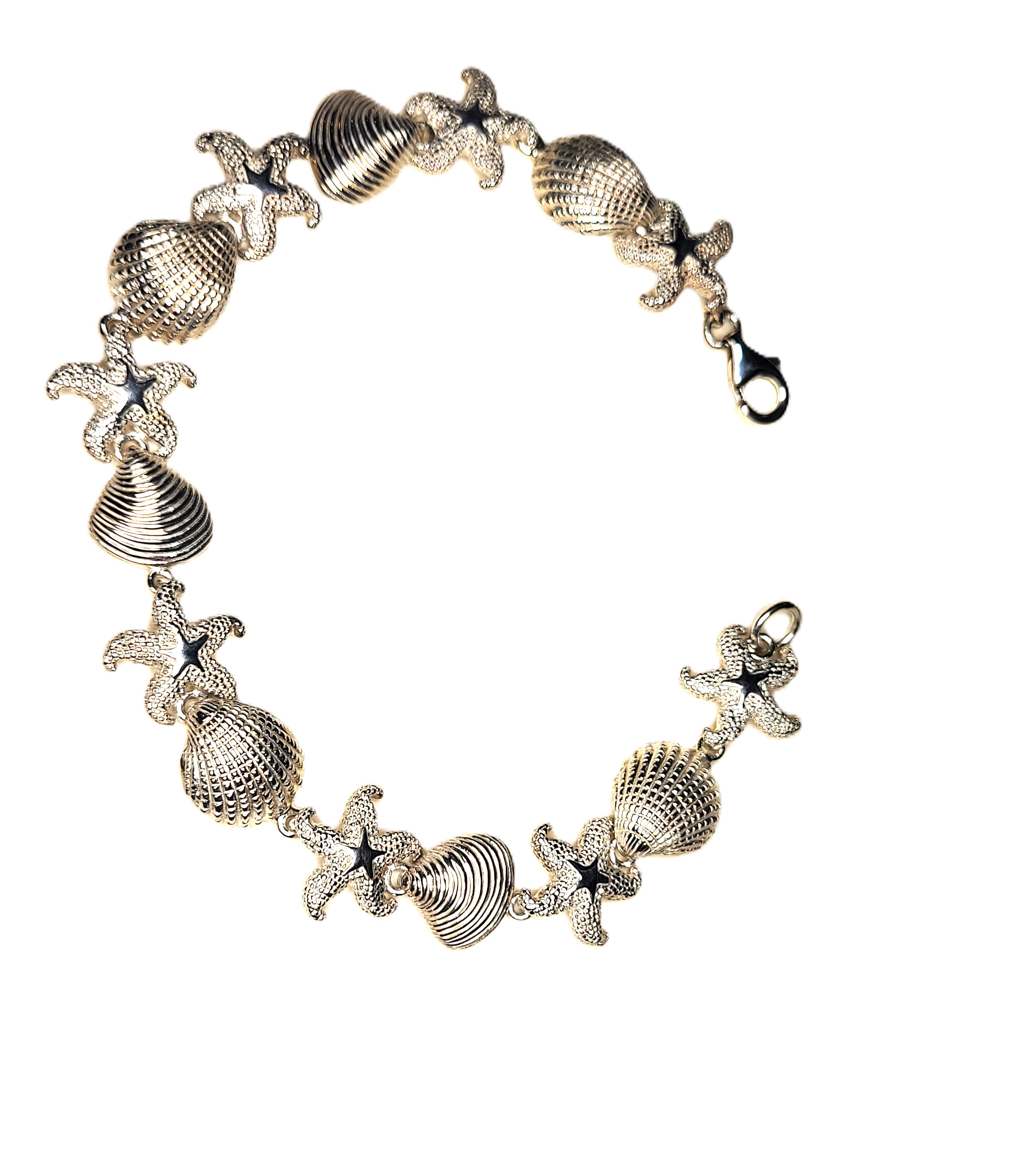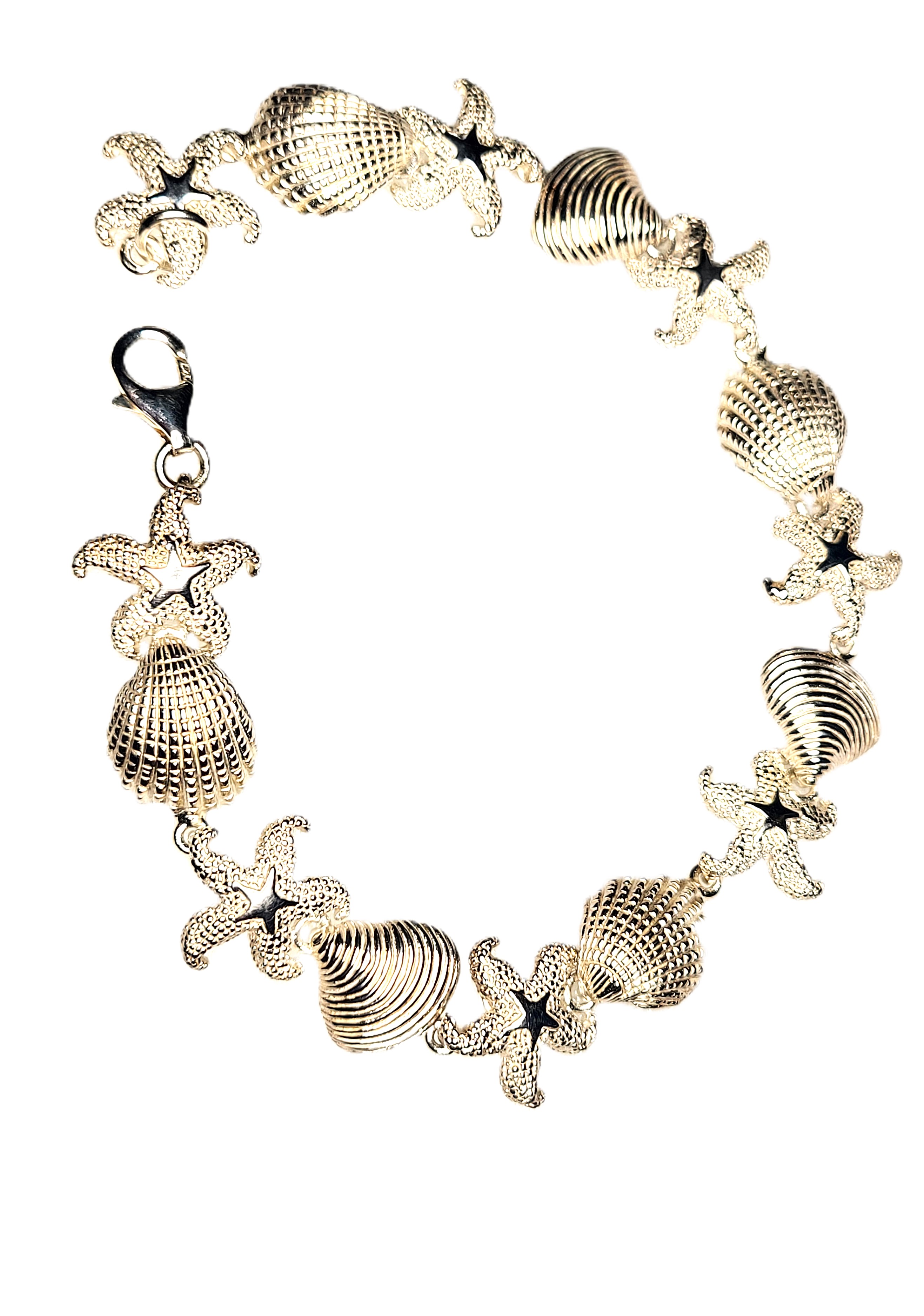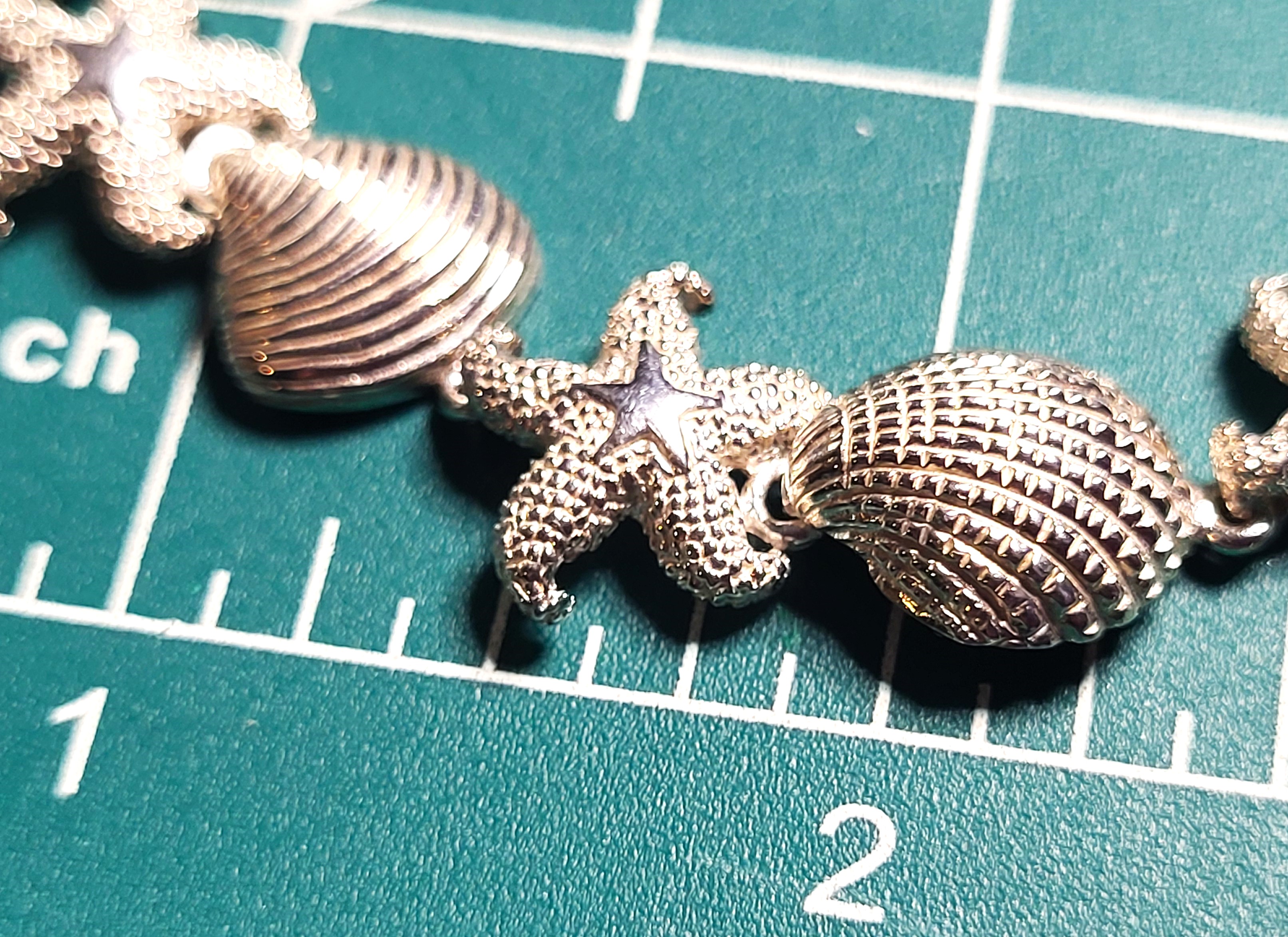This is a sterling silver bracelet with a nautical motif. Each link of the bracelet represents a cockle shell, sand dollar, starfish, or scallop shell continuously for 7.5", ending with a lobster clasp. The bracelet is approximately 5/8" long. Admin: 33121/1bg