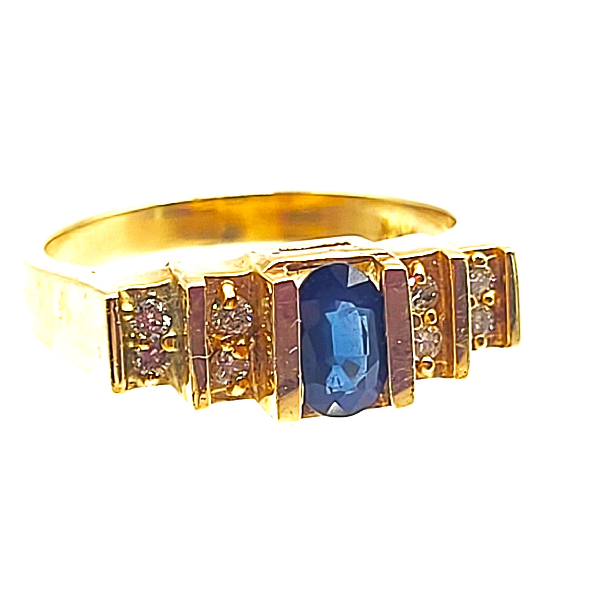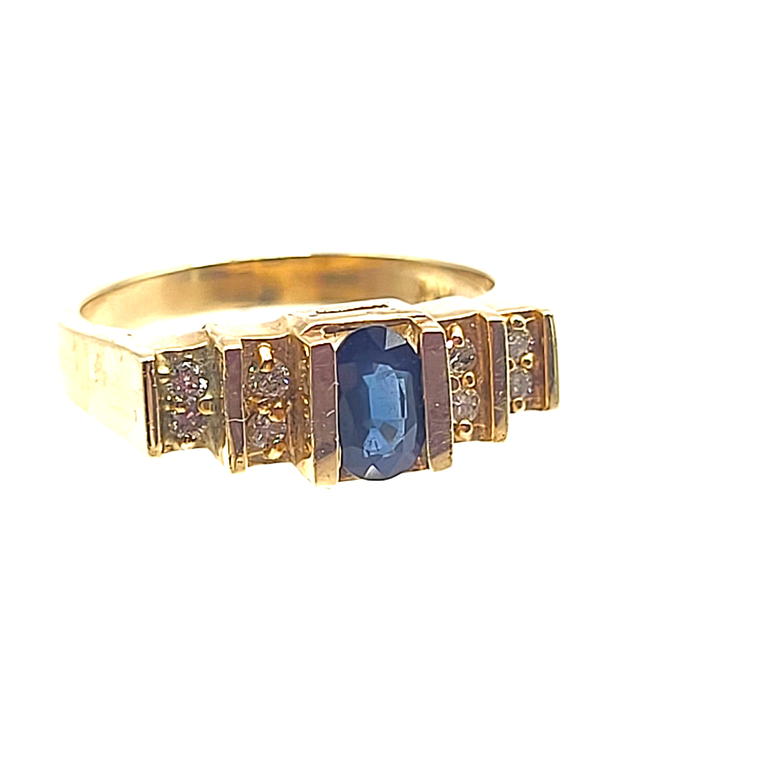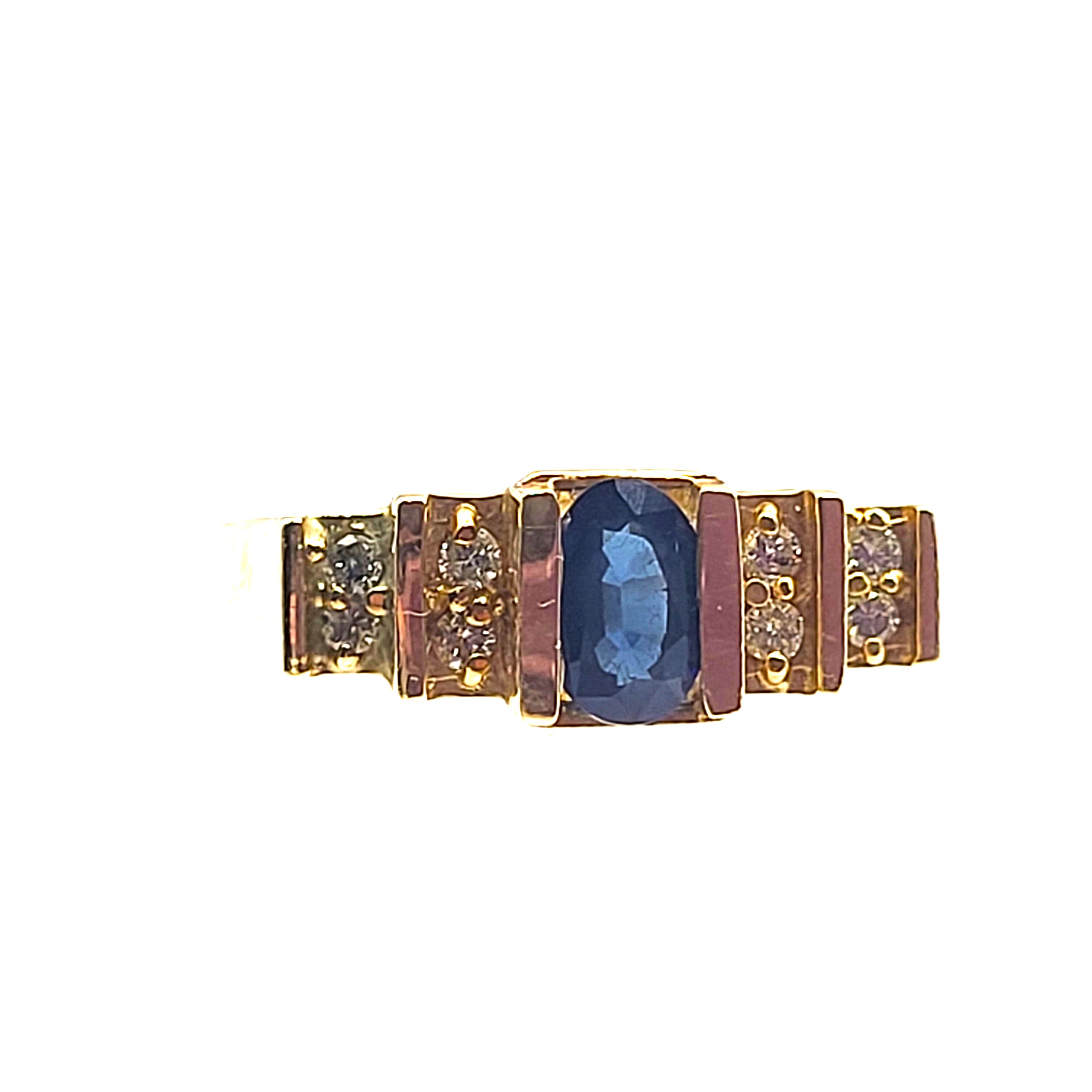 This 14 karat yellow gold ring features a .60 carat oval-cut blue sapphire that is tension-mounted with .16 carats total weight of round, brilliant-cut, I color, I1-I2 clarity diamonds, also tension-mounted in terraced shoulders that taper into a polished shank. This ring is US size 7 and can be sized for an additional charge. Additionally, is eligible for appraisal at a discounted rate, from an independent appraiser (with qualifying credentials from GIA) with no affiliation to Bidfair Fine Jewelry. Please contact Bidfair Fine Jewelry for more information on appraisals and sizing. Admin: G11241/10itt