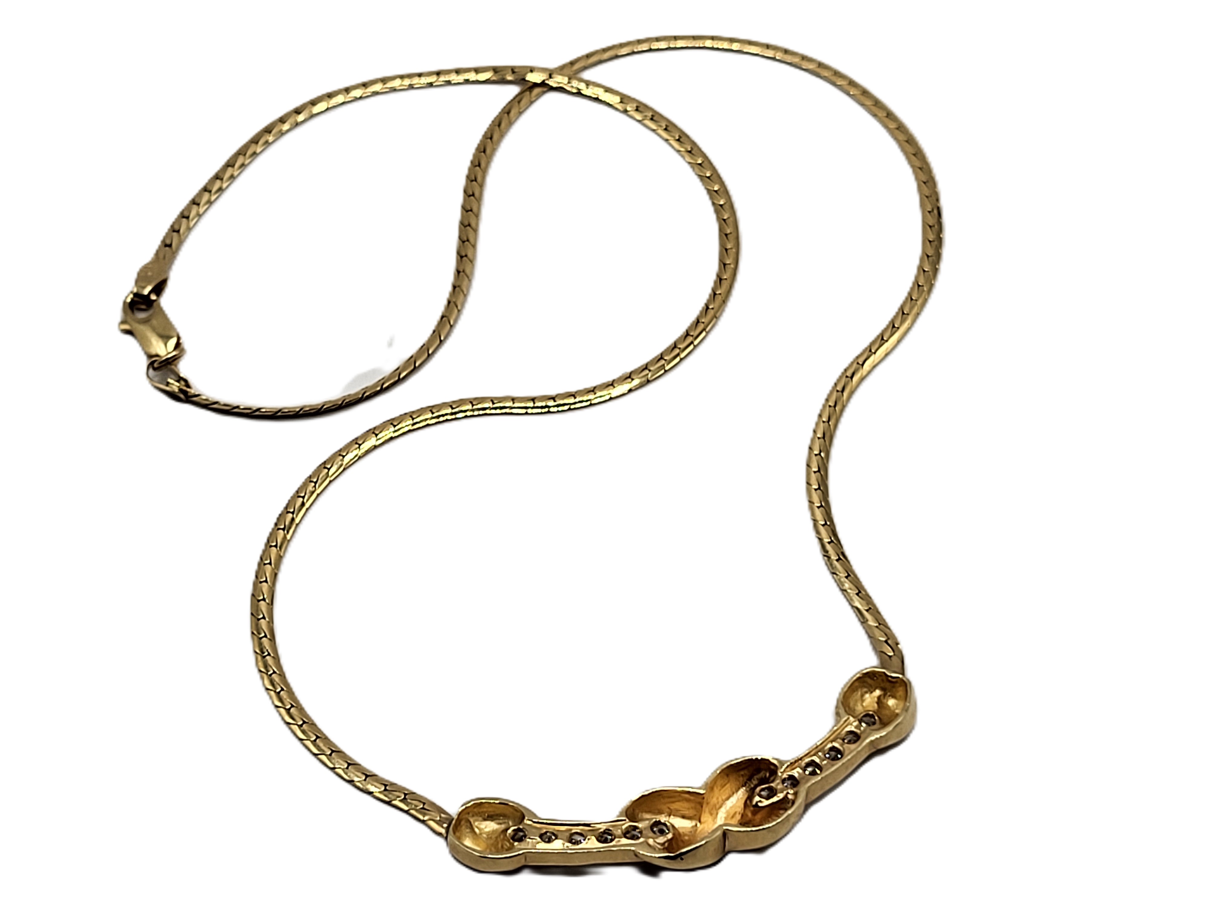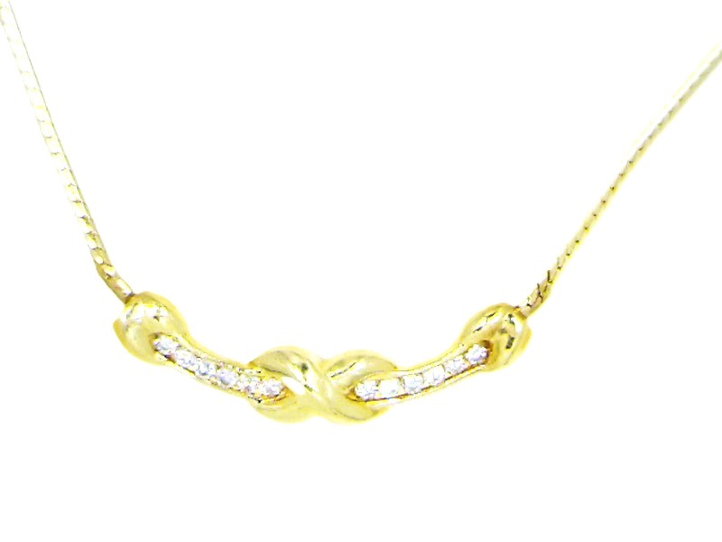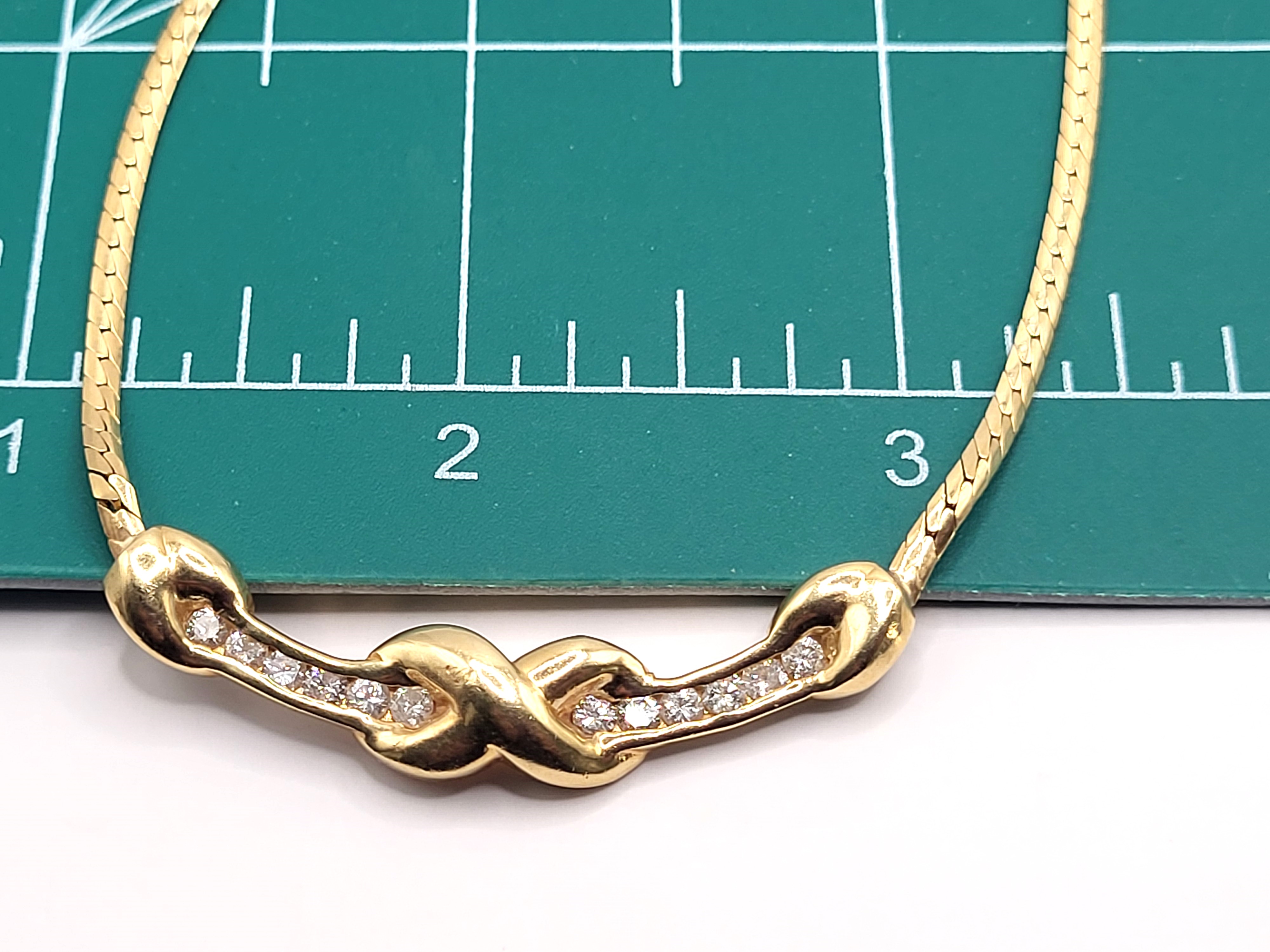 This is a very elegant 14 karat yellow gold necklace that features .66 carats total weight round, brilliant-cut, G-H color, SI2-I1 clarity diamonds along the curved bar with the "X" kiss. The bar is stationary on the flat cobra chain. The entire necklace is 17" long with a spring ring. . Admin: G11241/12tit
