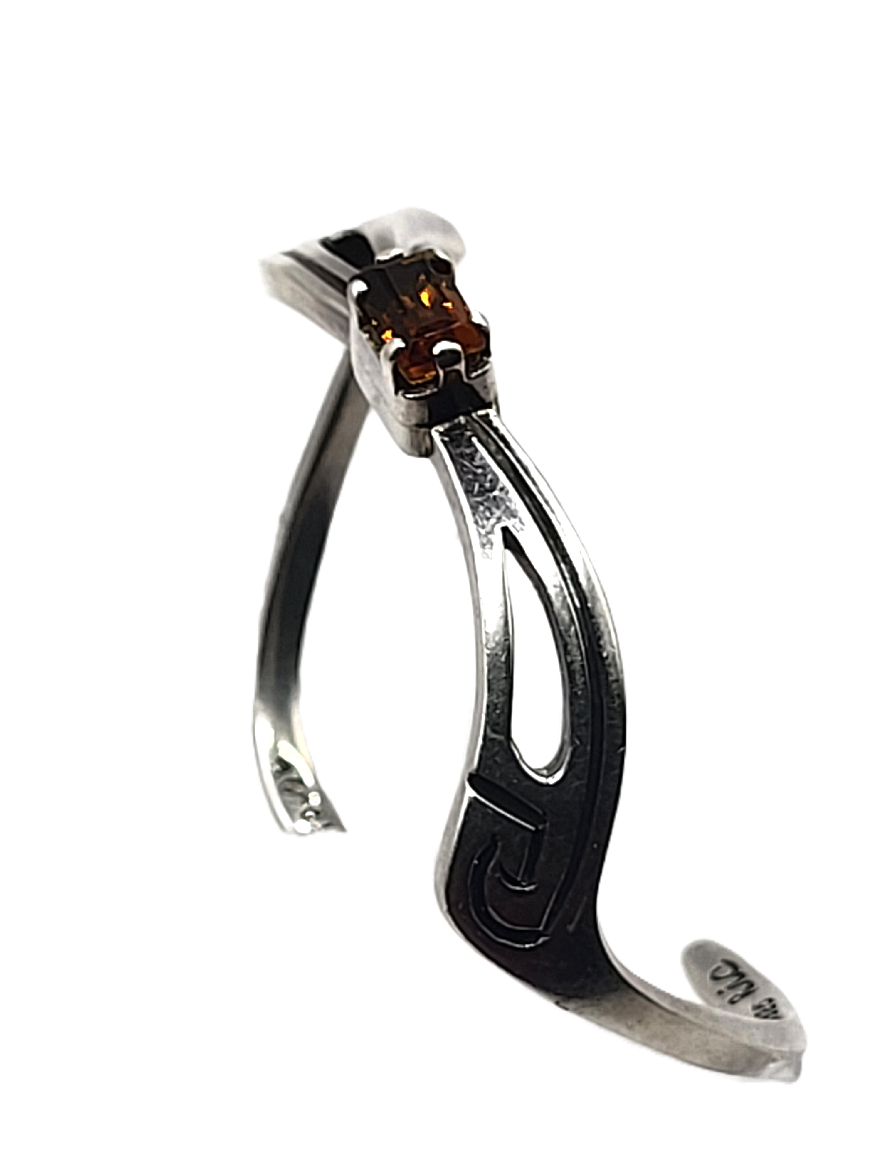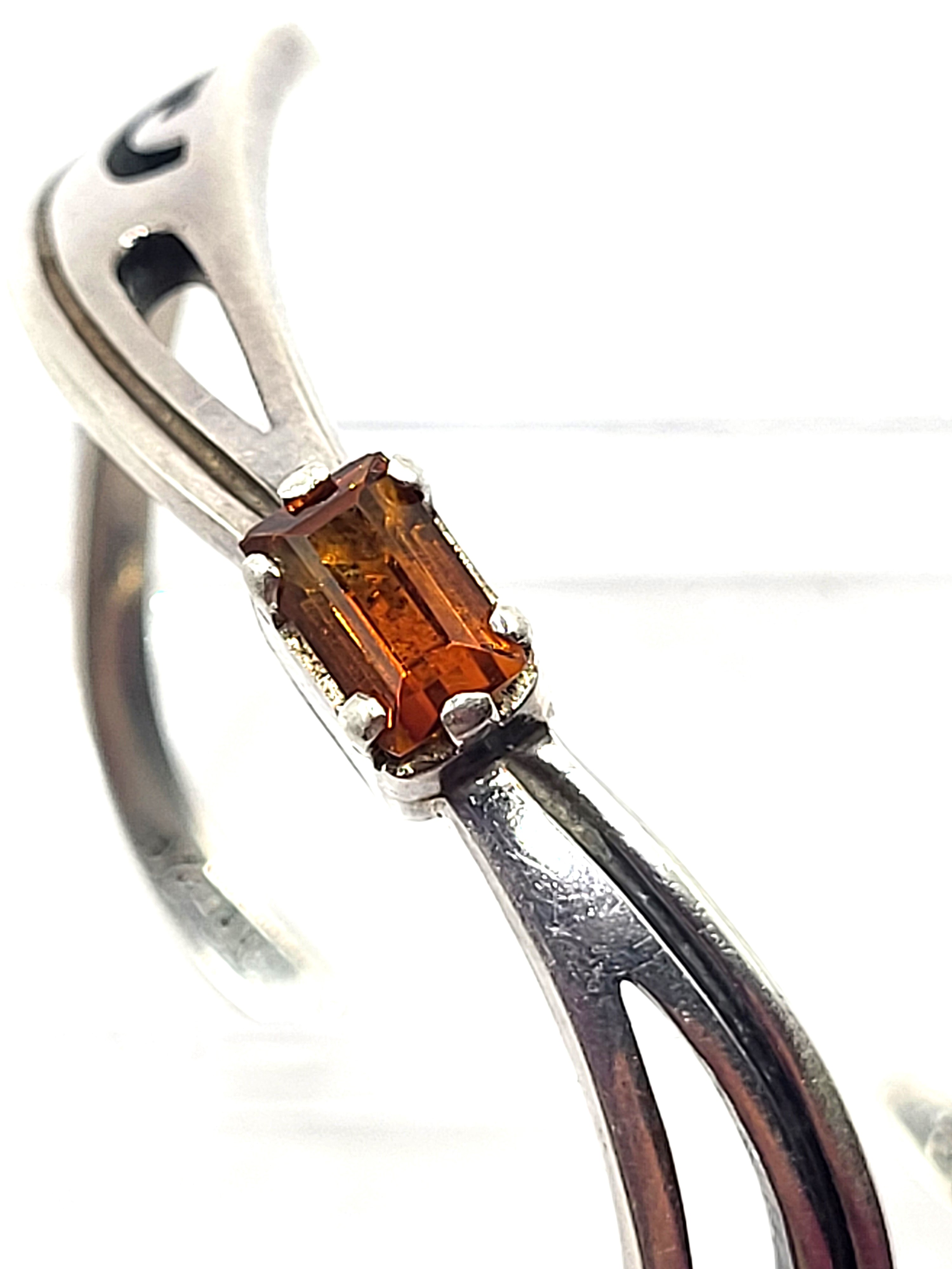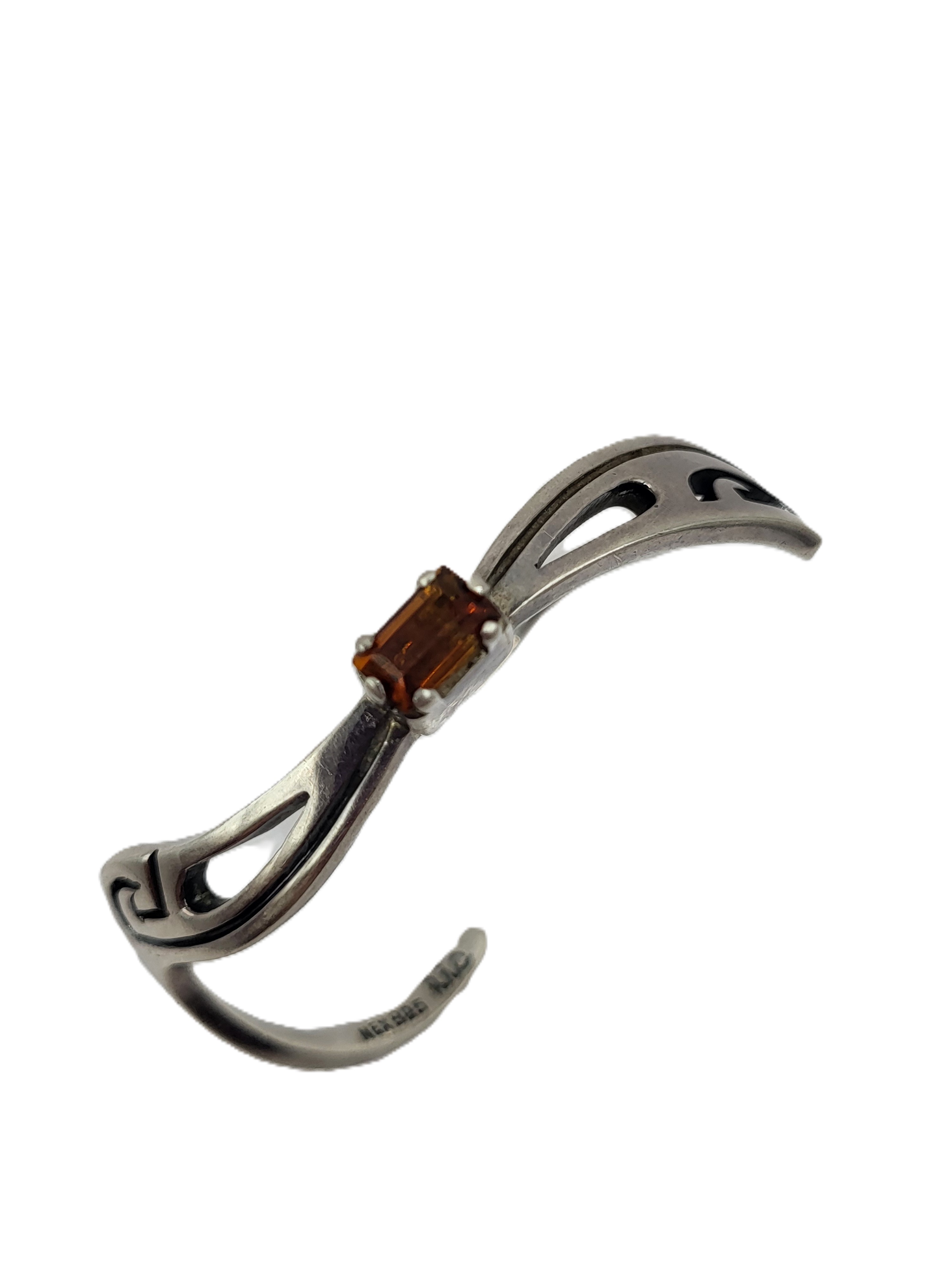 This is a vintage sterling silver cuff bracelet from designer Erika Hult de Corral, Modernist Taxco Mexico Silversmith, who studied in France at the Paris Branch of Parsons School of Design. This bracelet is approximately a size 5 and features an approximate 1.25 carats emerald-cut, prong-set, genuine citrine. It is estimated to be circa mid- to late 1970’s. Admin: 33120/20lh