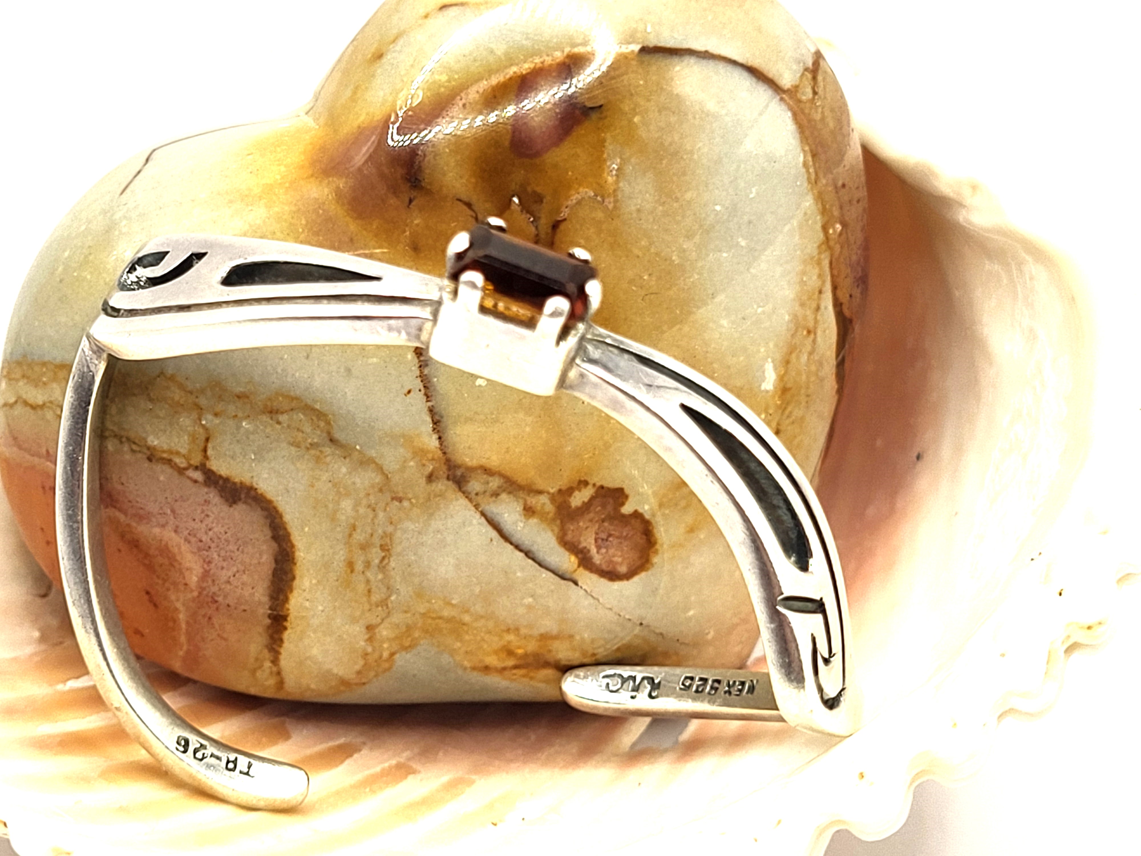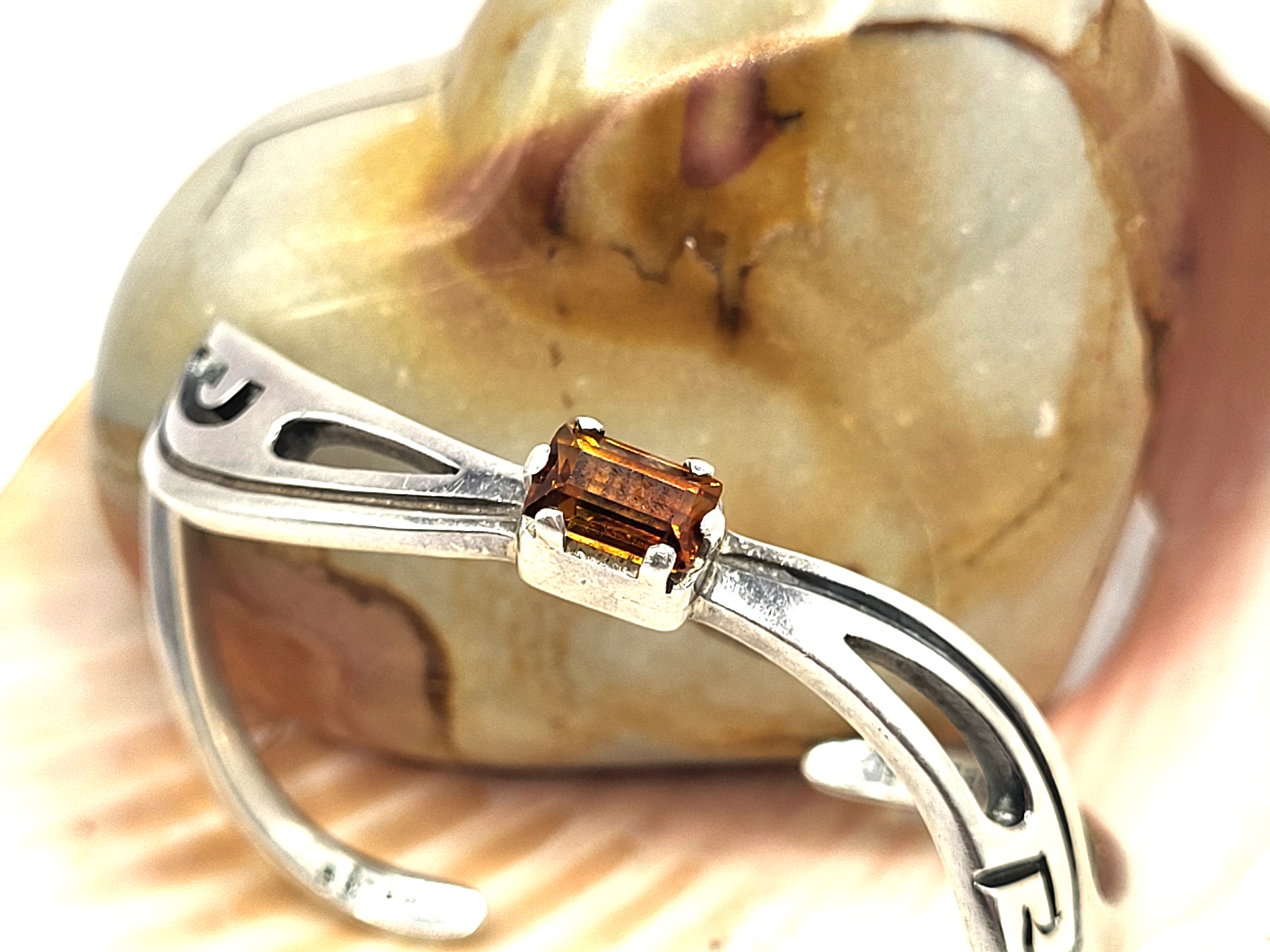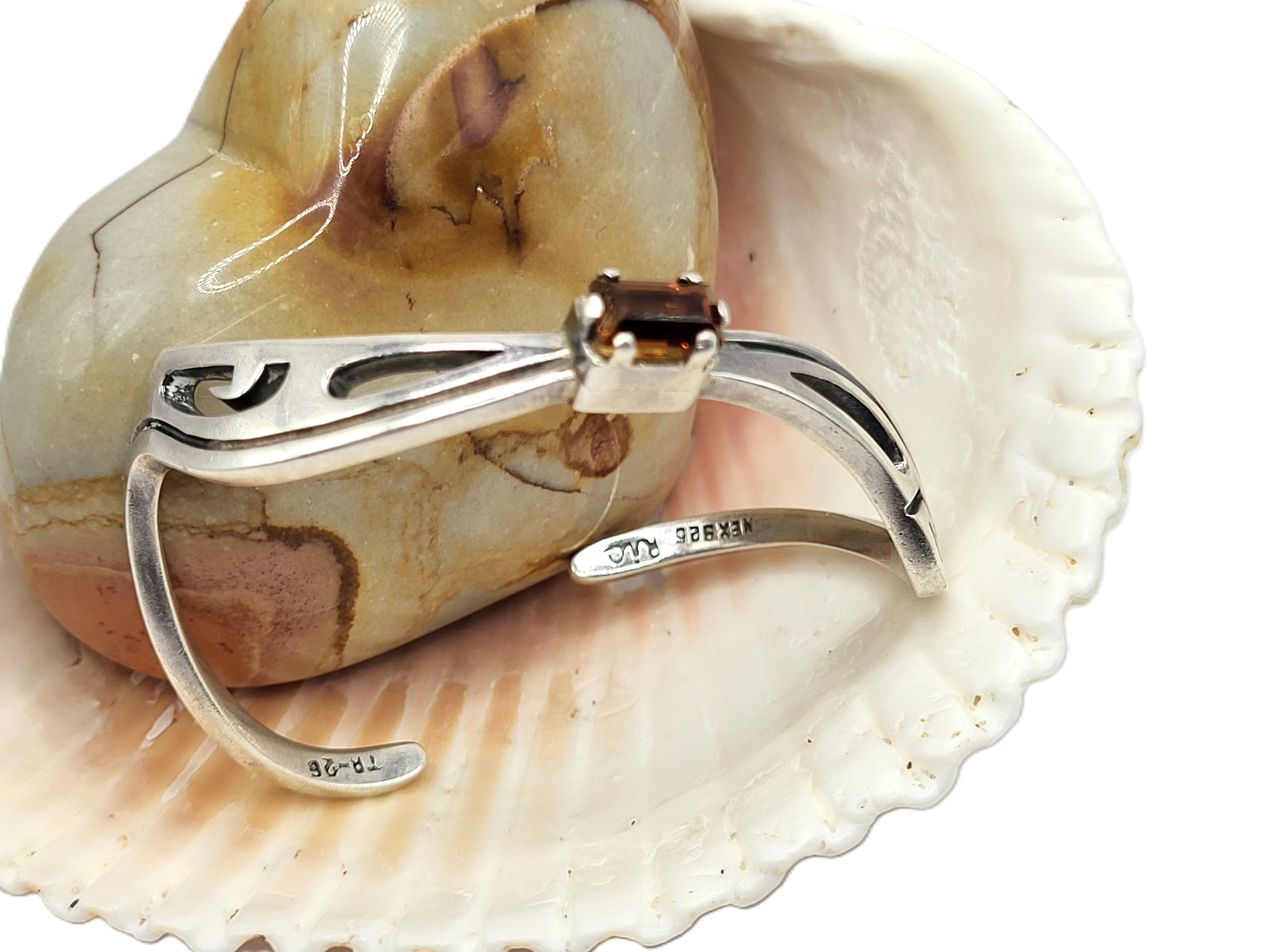 This is a vintage sterling silver cuff bracelet from designer Erika Hult de Corral, Modernist Taxco Mexico Silversmith, who studied in France at the Paris Branch of Parsons School of Design. This bracelet is approximately a size 5 and features an approximate 1.25 carats emerald-cut, prong-set, genuine citrine. It is estimated to be circa mid- to late 1970’s. Admin: 33120/20lh