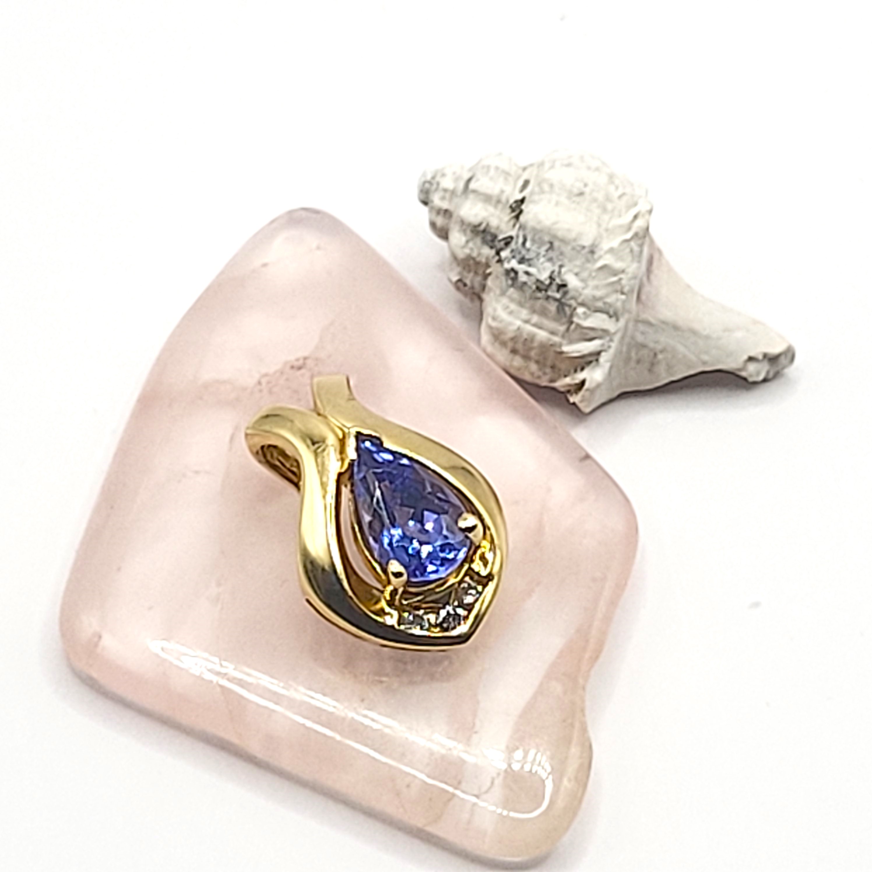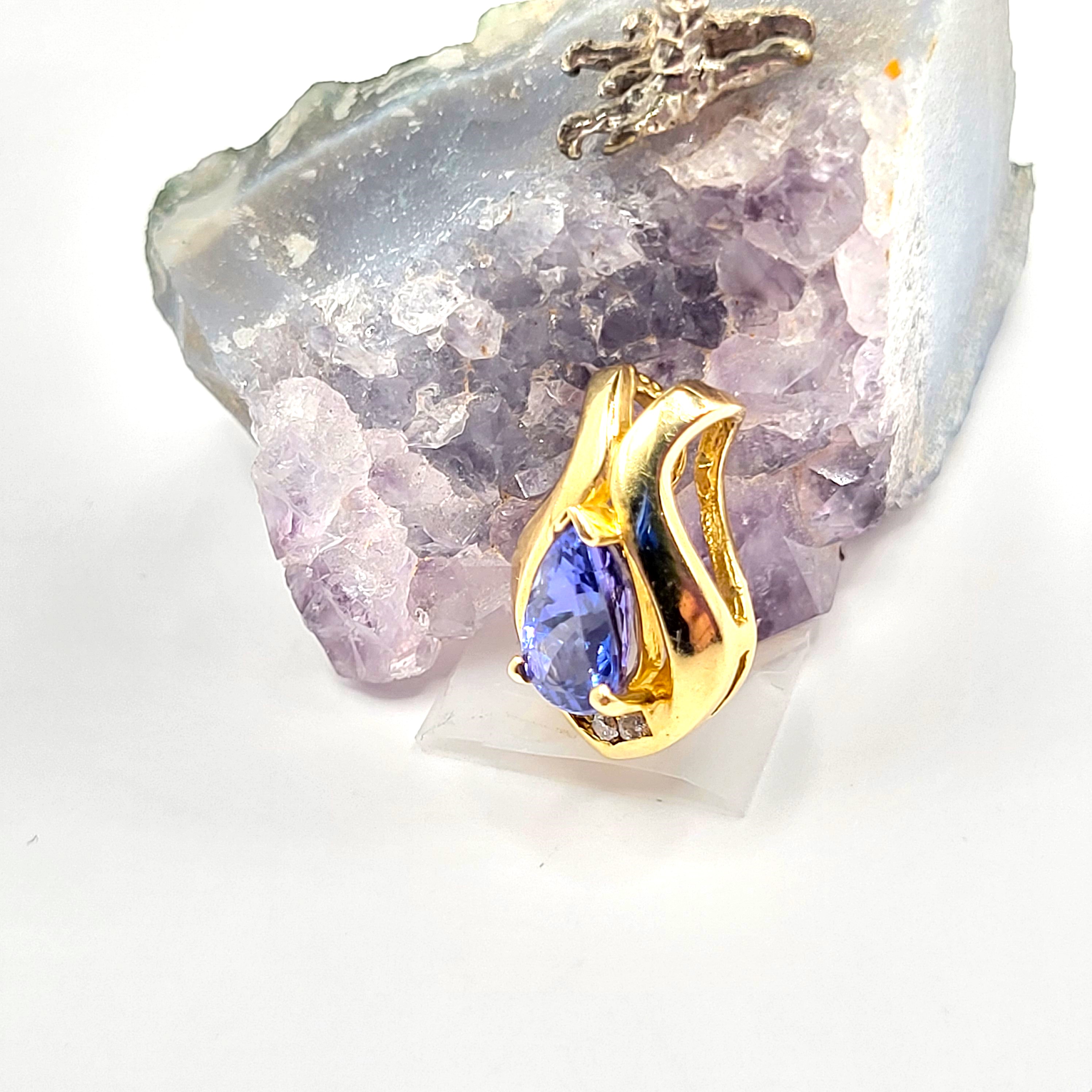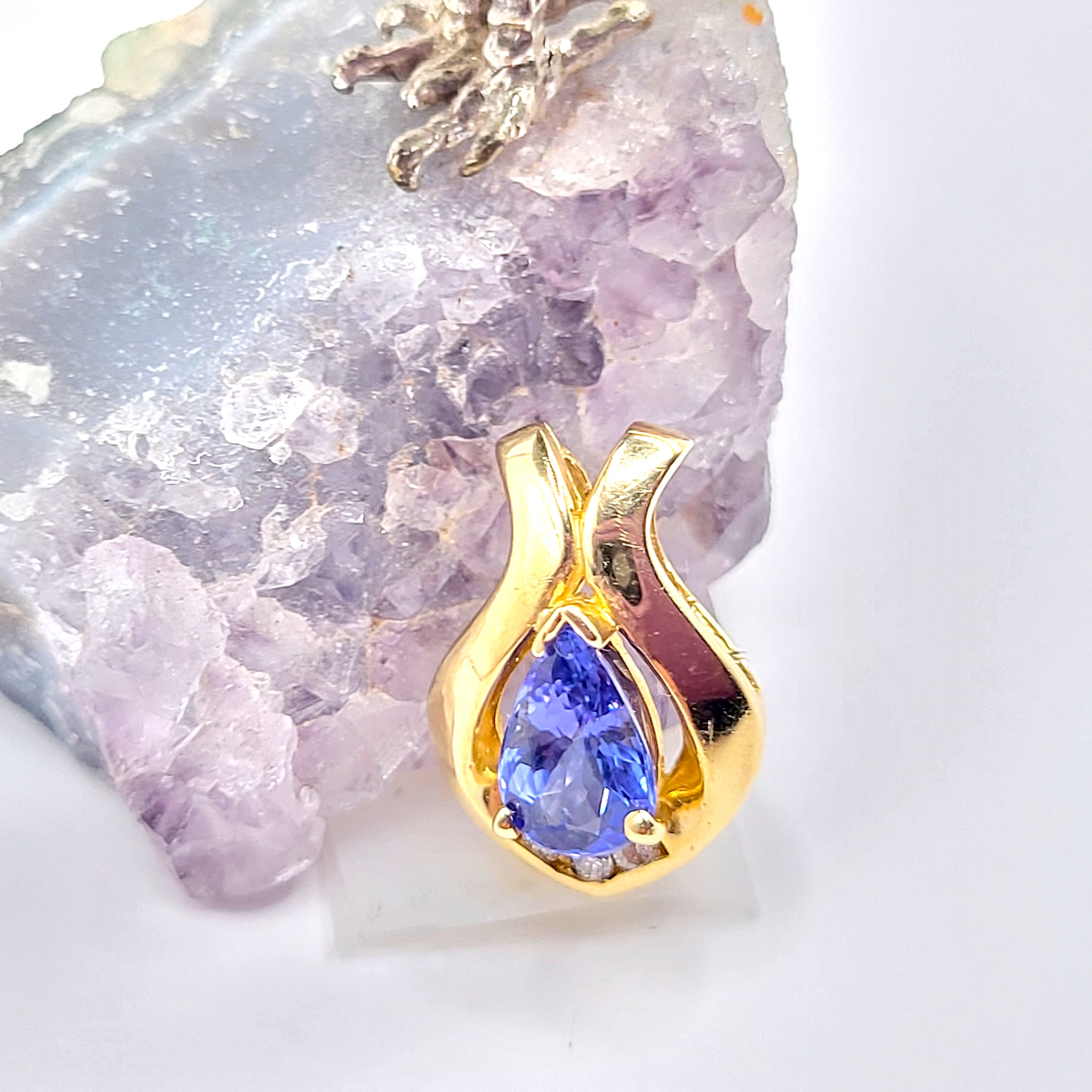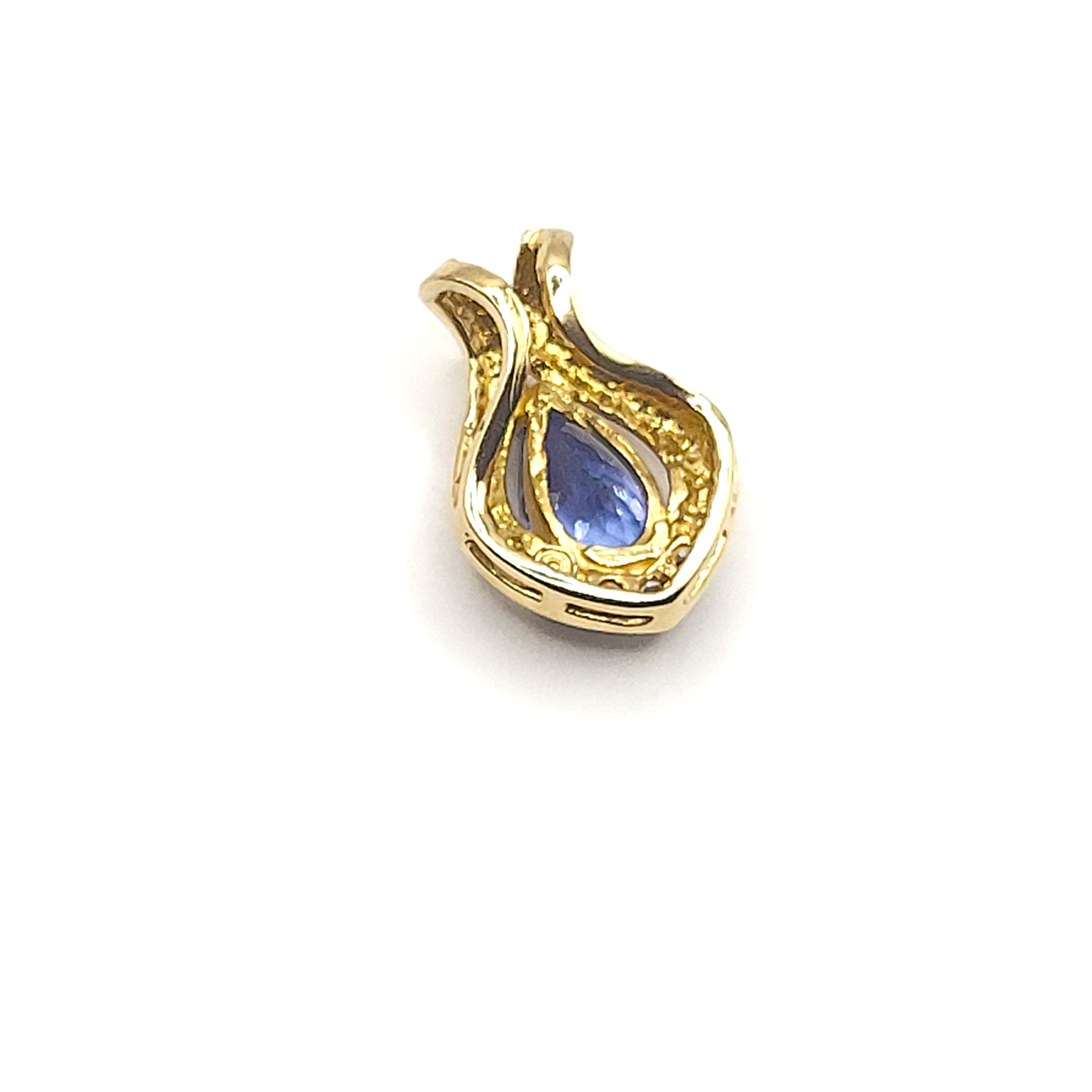 This is a 14 karat yellow gold pendant that features a 1.12 carat pear-cut, prong-set, rich bluish purple, genuine tanzanite. Channel-set at the bottom of the curvy yellow gold frame are .05 carats of round, brilliant-cut, H, SI2 clarity accent diamonds. The pendant is approximately 5/8" diameter and has a built-in bail that can accommodate an approximate 3.75mm wide chain. Admin: G11241/15grt