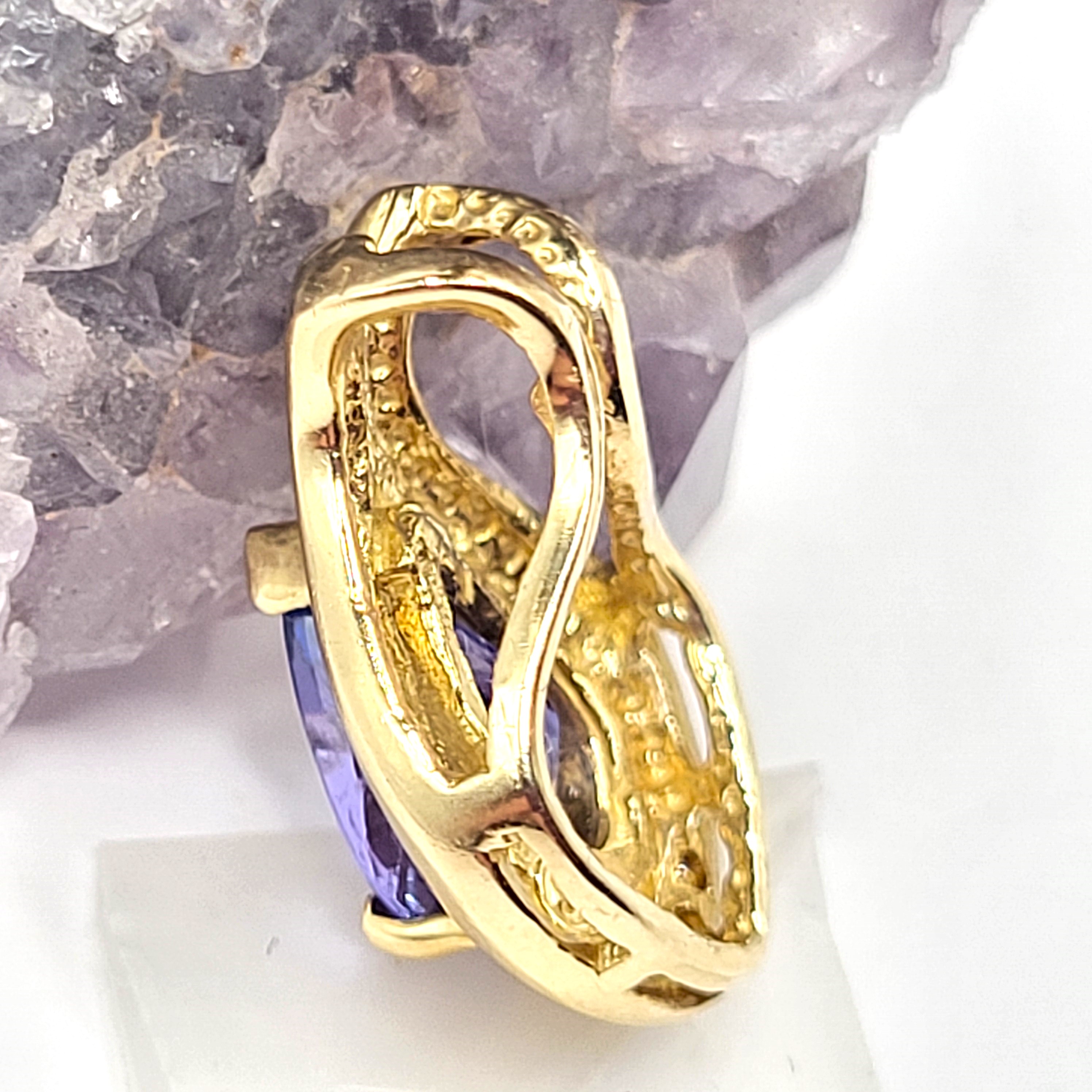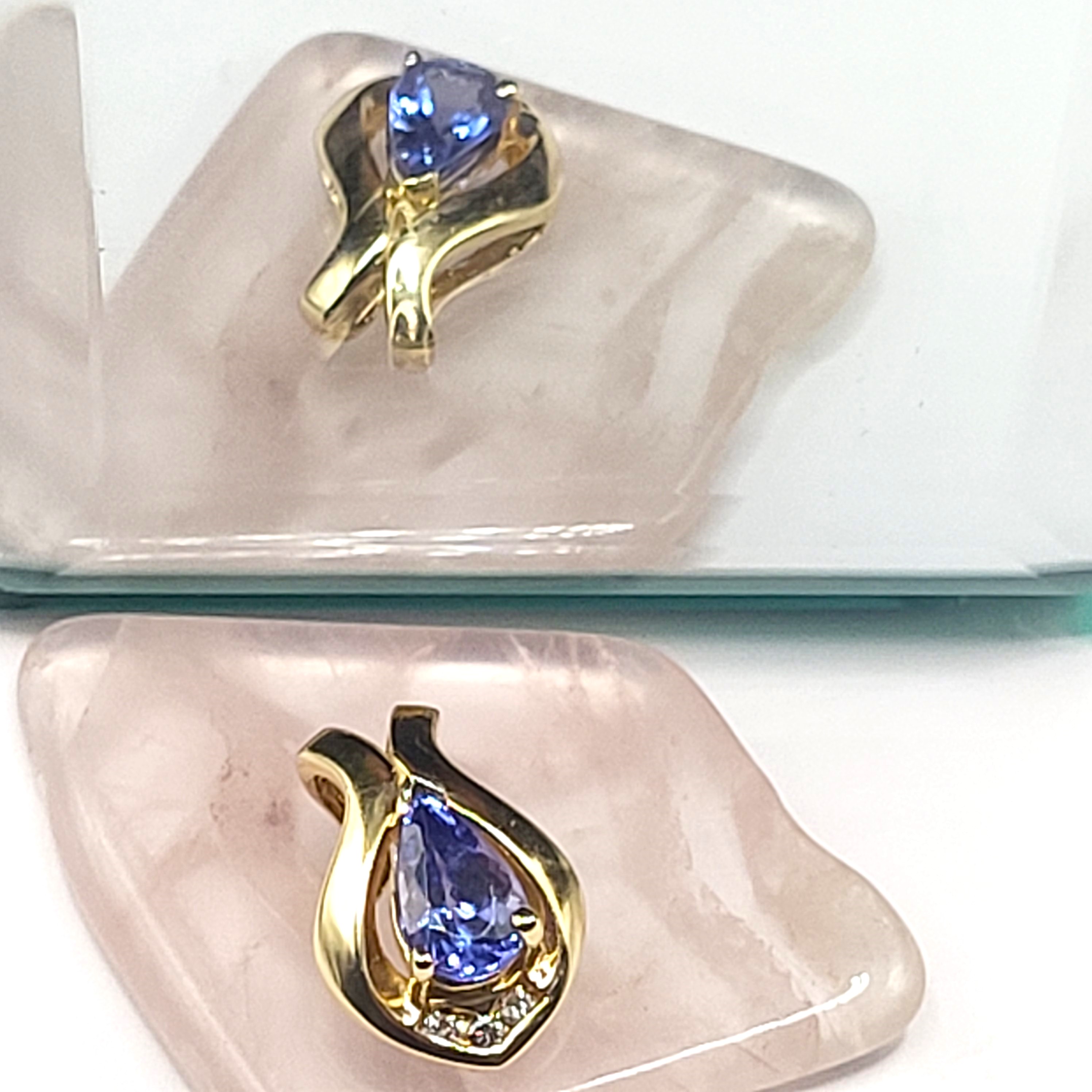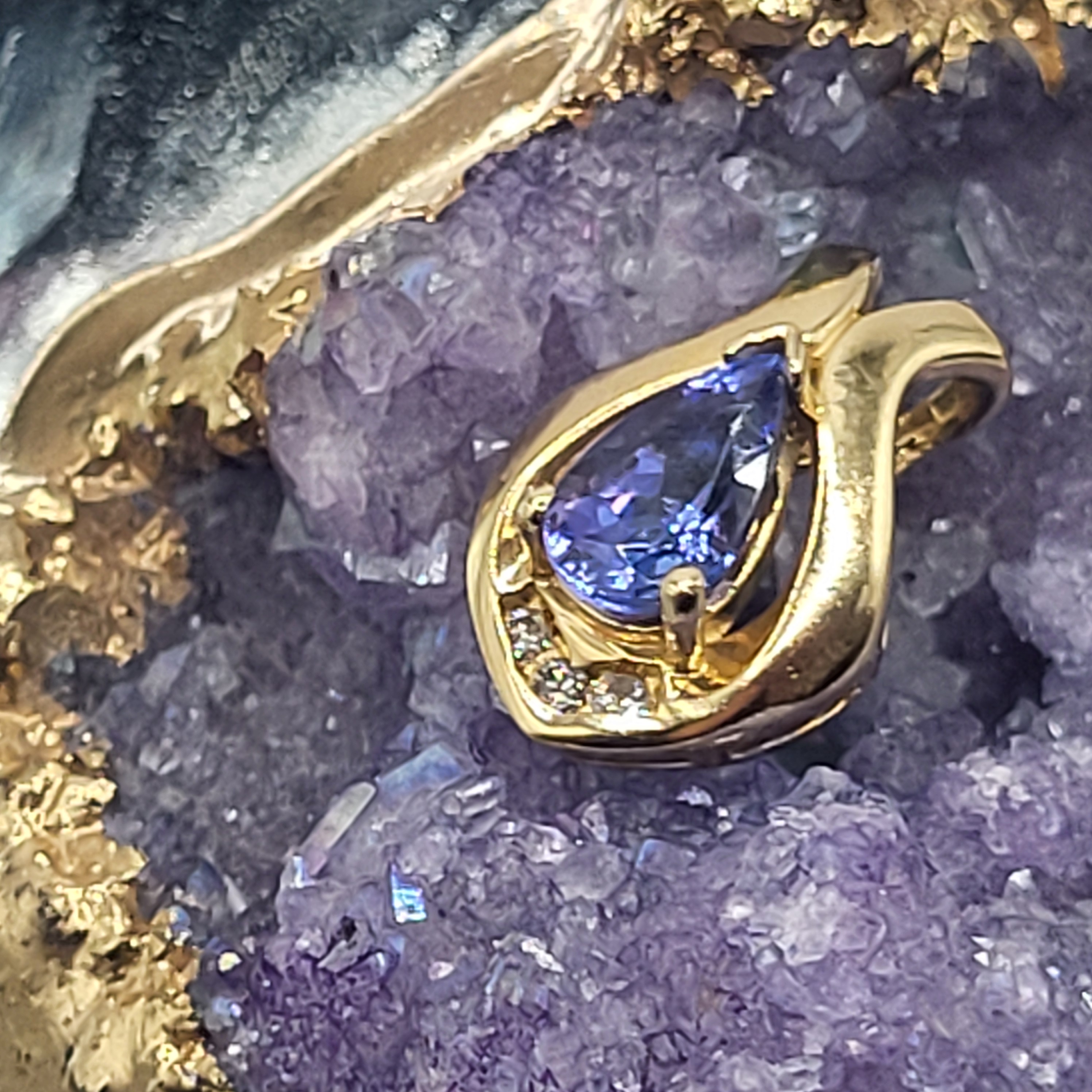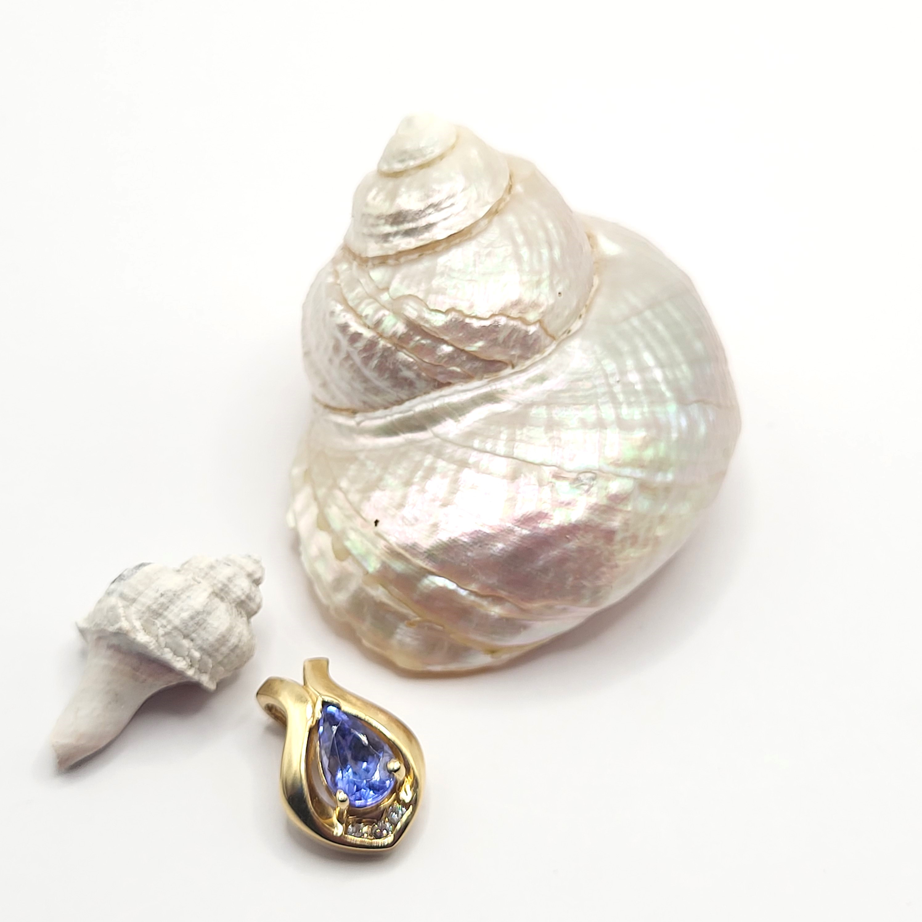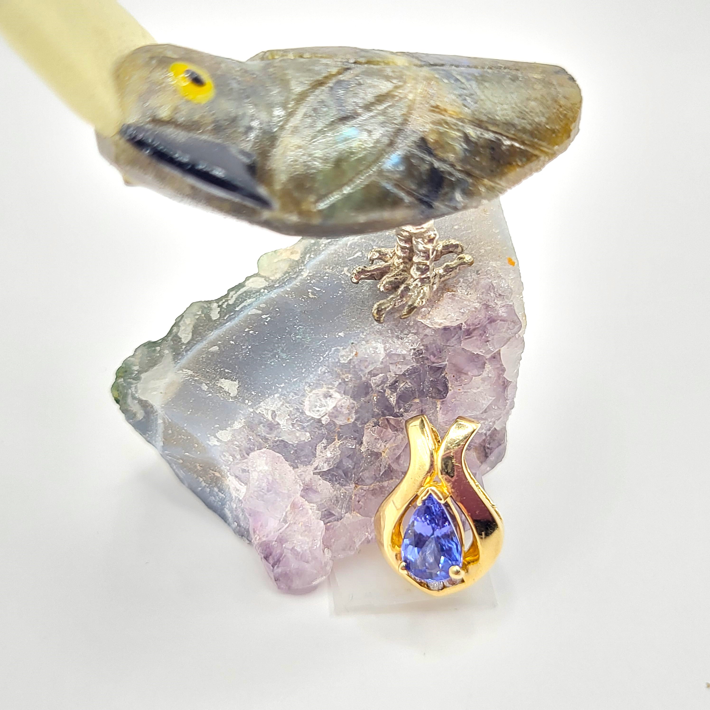 This is a 14 karat yellow gold pendant that features a 1.12 carat pear-cut, prong-set, rich bluish purple, genuine tanzanite. Channel-set at the bottom of the curvy yellow gold frame are .05 carats of round, brilliant-cut, H, SI2 clarity accent diamonds. The pendant is approximately 5/8" diameter and has a built-in bail that can accommodate an approximate 3.75mm wide chain. Admin: G11241/15grt