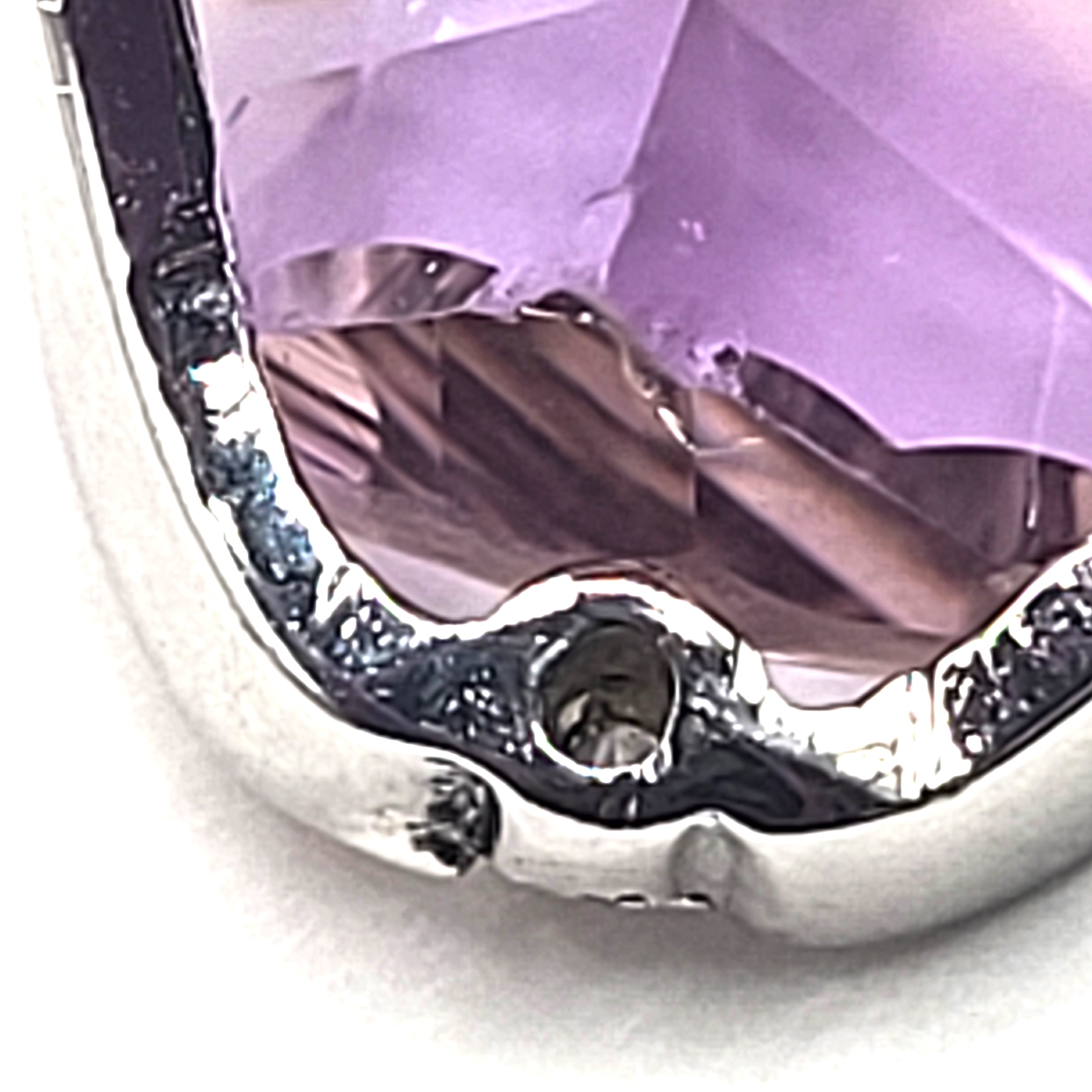 This 14K white gold, laser-cut pendant can also be called a wearable piece of techno-art! It is a unisex pendant, can be worn by either gender. It features an approximate 4.00 carat, laser-cut with scalloped edges and a sunburst pavilion or keel, light purple and yellow ametrine. There is approximately .08 carats total weight of round, brilliant-cut, H-I, SI2 diamonds as accent. This pendant is approximately 1 1/8" long and 1/2" wide with a built-in bail that can accommodate an approximate 4mm chain. It is stamped EG inside a square frame cartouche. NOTE: The ametrine has a tiny chip at the bottom point that is noticeable under 10x magnification. Please see all photographs. The chip was difficult to capture. Admin: 33110/3bin
