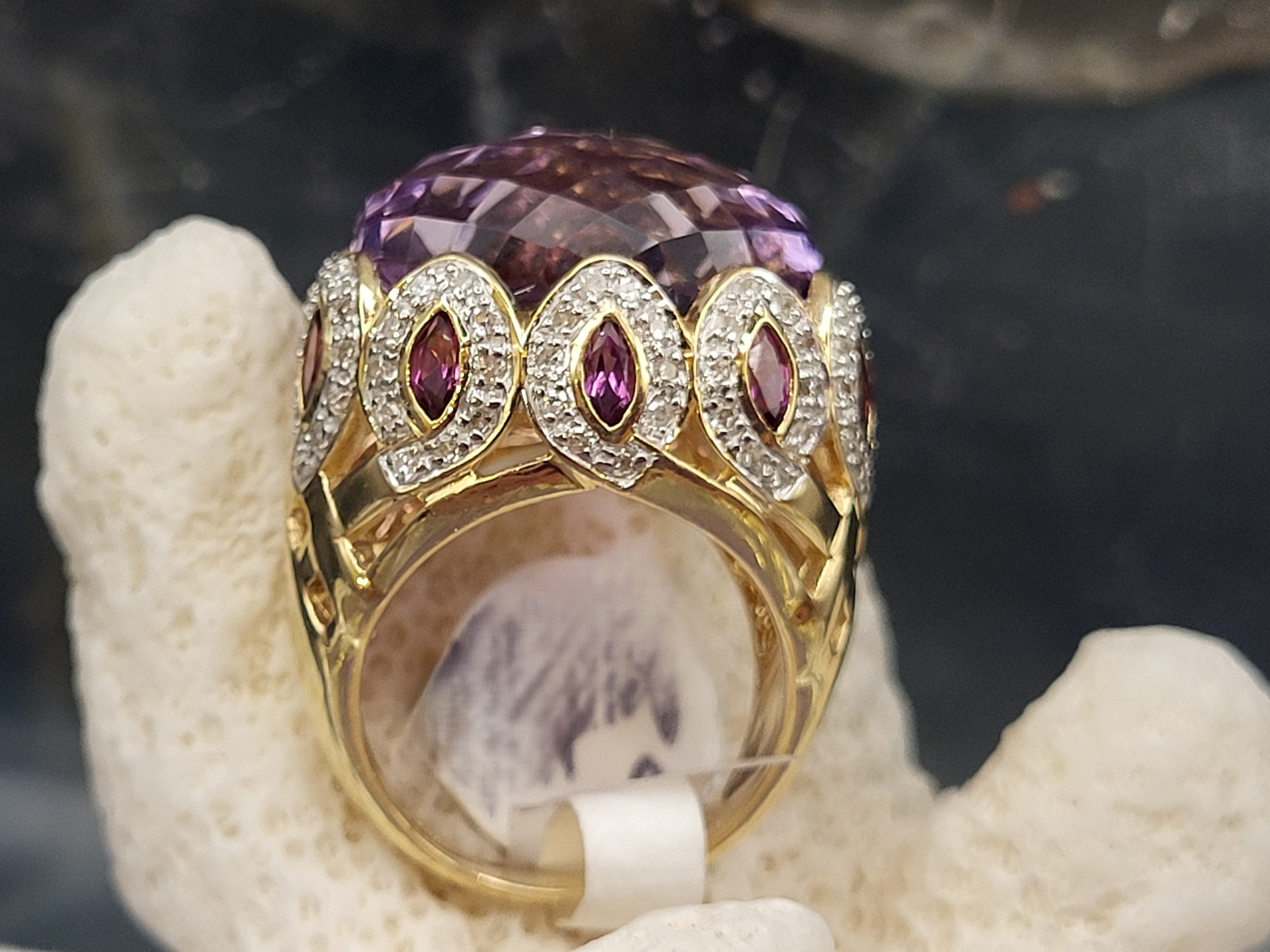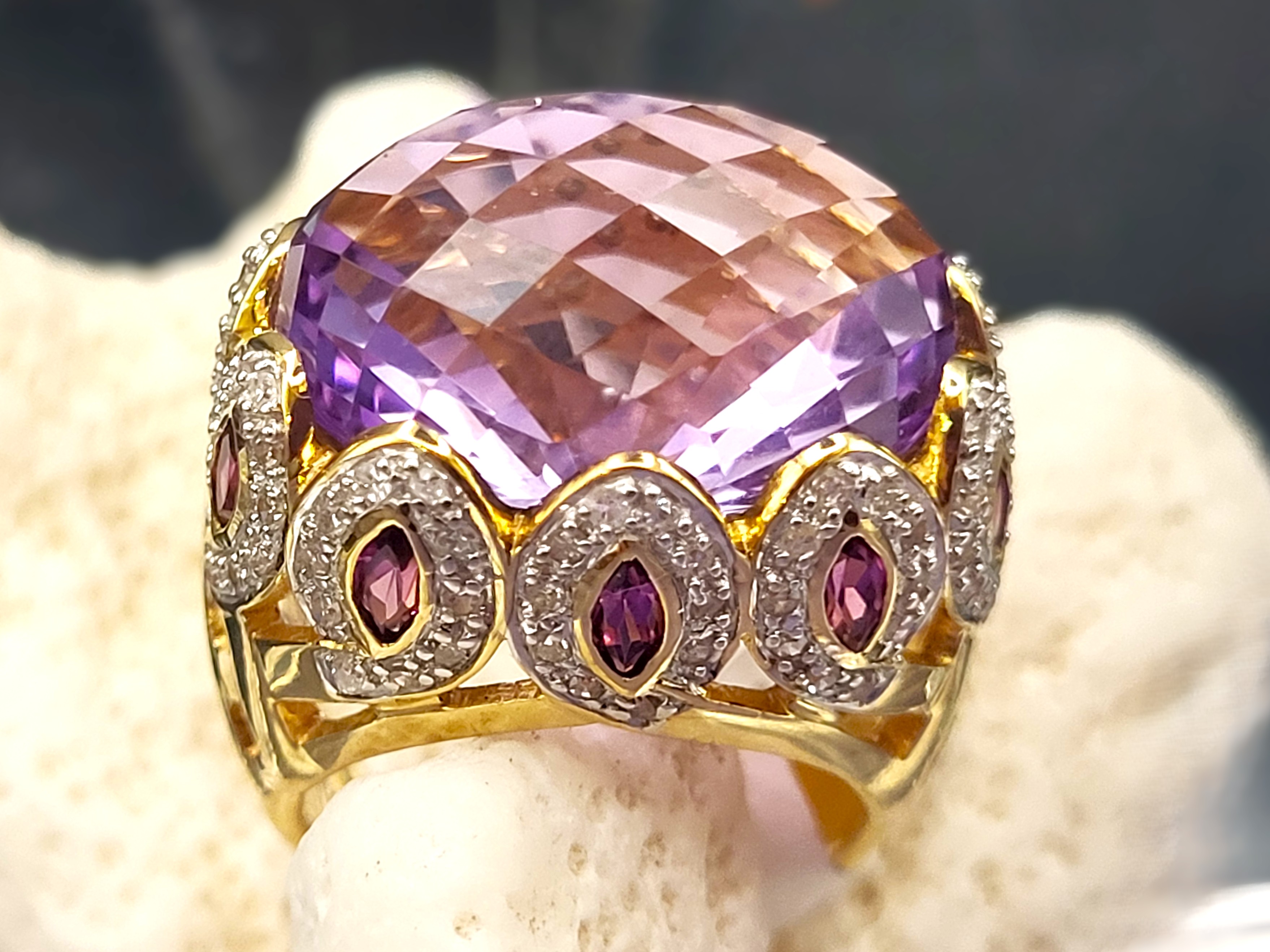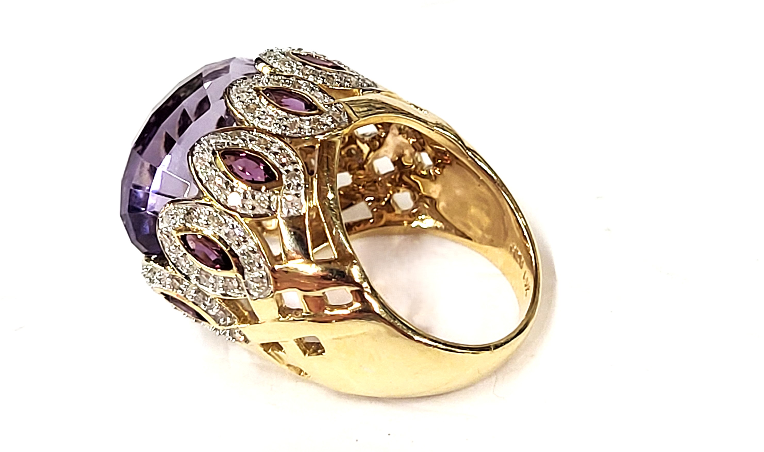 This truly bold 14 karat yellow gold ring features a 12.00 carat, oval-cut, faceted, genuine Rose De France that is bezel-set in a ’10 point crown’ design using 1.25 carats total weight marquise-cut purple amethysts, and one carat total weight of round, faceted, H-I color, I1 clarity diamonds in the navette-shaped "points". The tall, straight shoulders ease down to a reticulated basket-style midsection, before tapering to a 3.25mm ring shank. The ring is US size 4.75 and has an open gallery, indicating it could fit up to a size 5.5 finger.