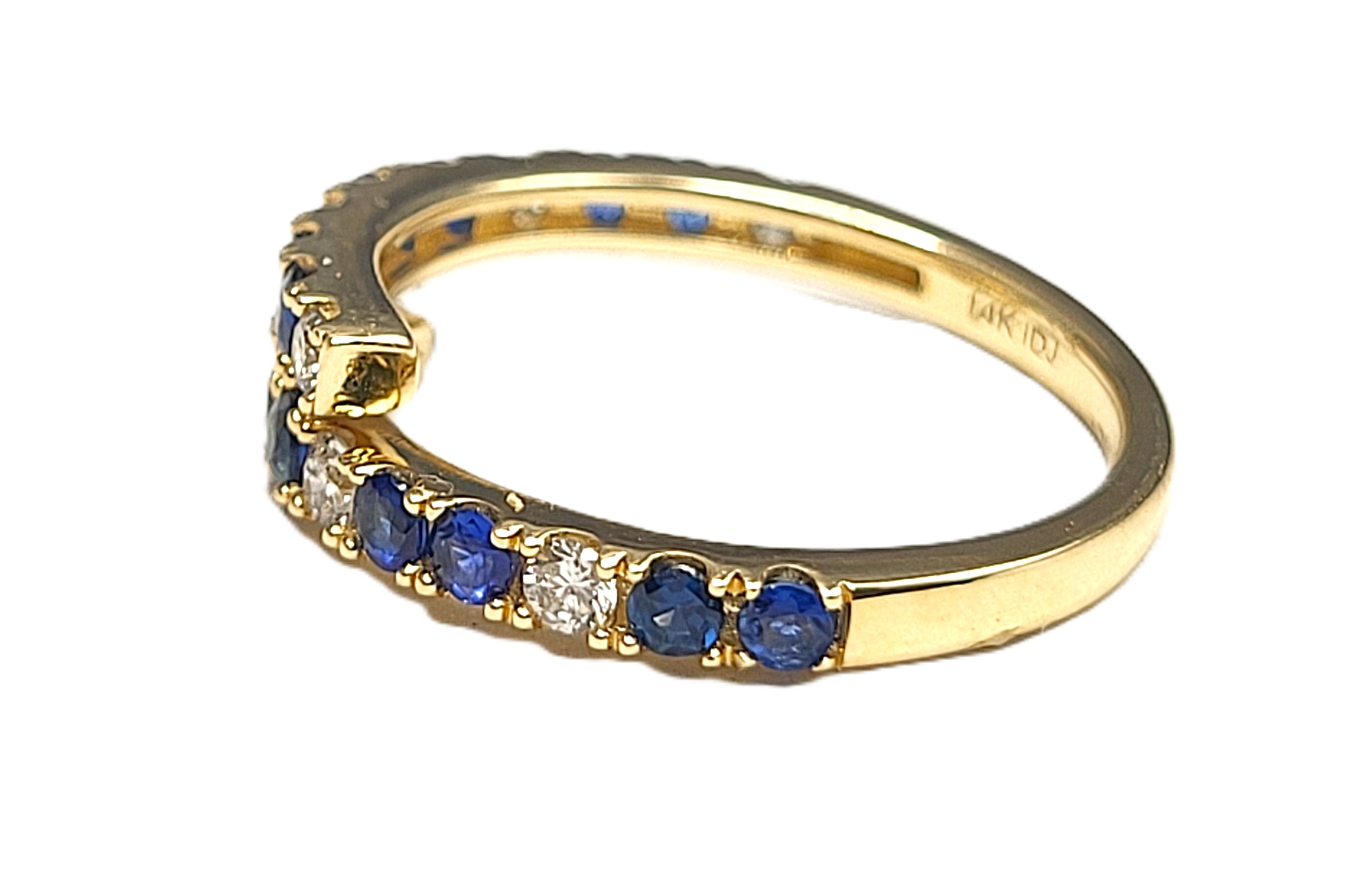 This 14 karat yellow gold ring features .72 carats of round, faceted, genuine, royal blue sapphires that are bordered with .29 carats of round, brilliant-cut, Earth-mined, G-I colored, SI1-I1 diamonds. The ring wraps from the 2.25mm smooth, polished shank up to the top of the finger on each side as one sparkling ribbon sweeps past the other. This ring is US size 7 and due to the nature of the ring, no sizing options are offered. See below for important details about this ring. 3g AdminCode: 6282/24-grr