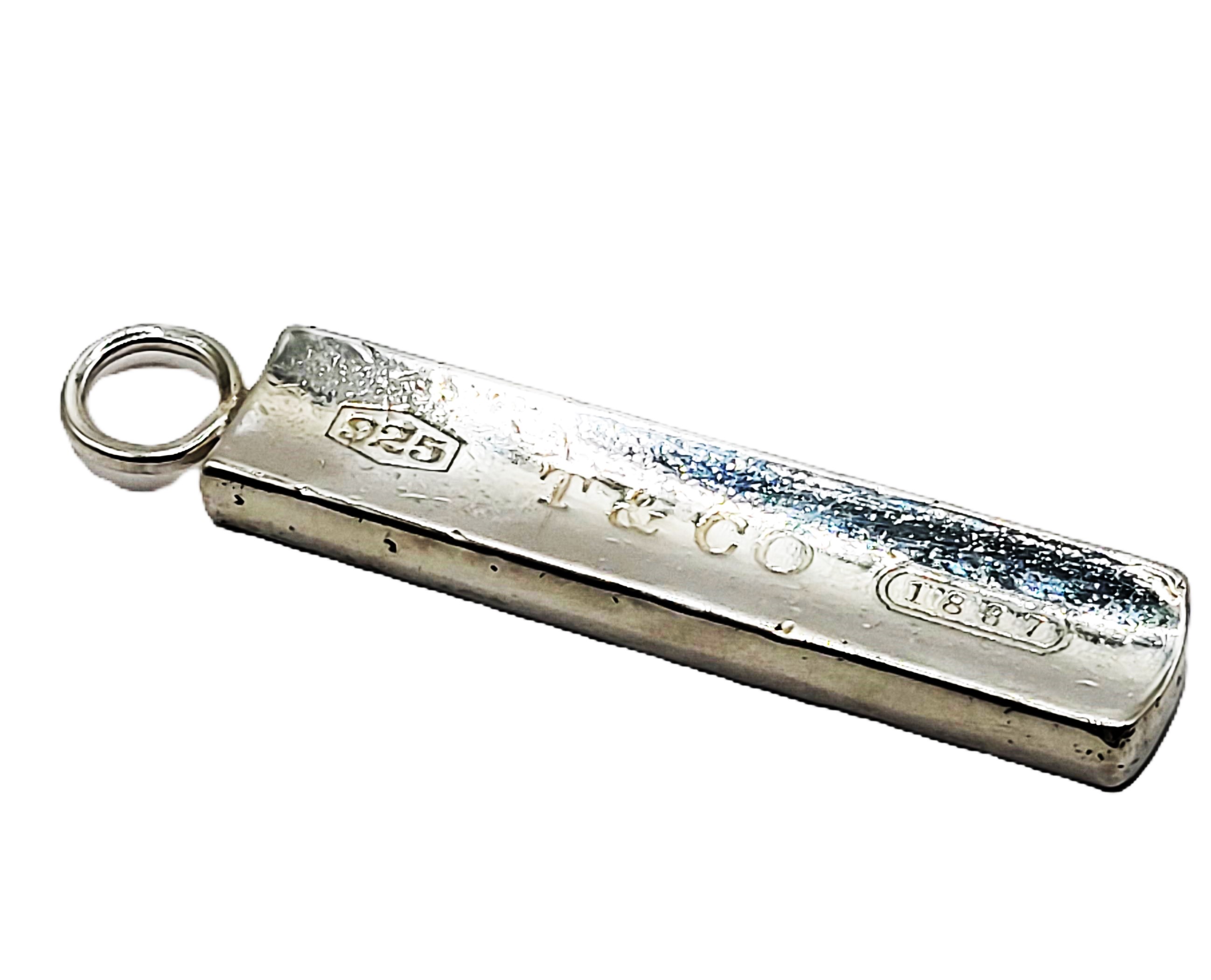 This is a vintage sterling silver Tiffany & Co. keychain fob that could also be worn as a pendant or used as a fob for a purse or tote. The bar is approximately 2.25" X 1/2" and engraved "T & CO 1837 with the .925 marking on a concave surface. It is approximately 5.25mm thick with a soldered ring at the top has an opening that is approximately 6.75mm. This is an estate item that has evidently been loved. It has noticeable dents and scratches that are to be expected on a metal as soft as sterling silver. However, it remains a remarkable item that can still be enjoyed for years to come! Admin:F1226/25hhh1