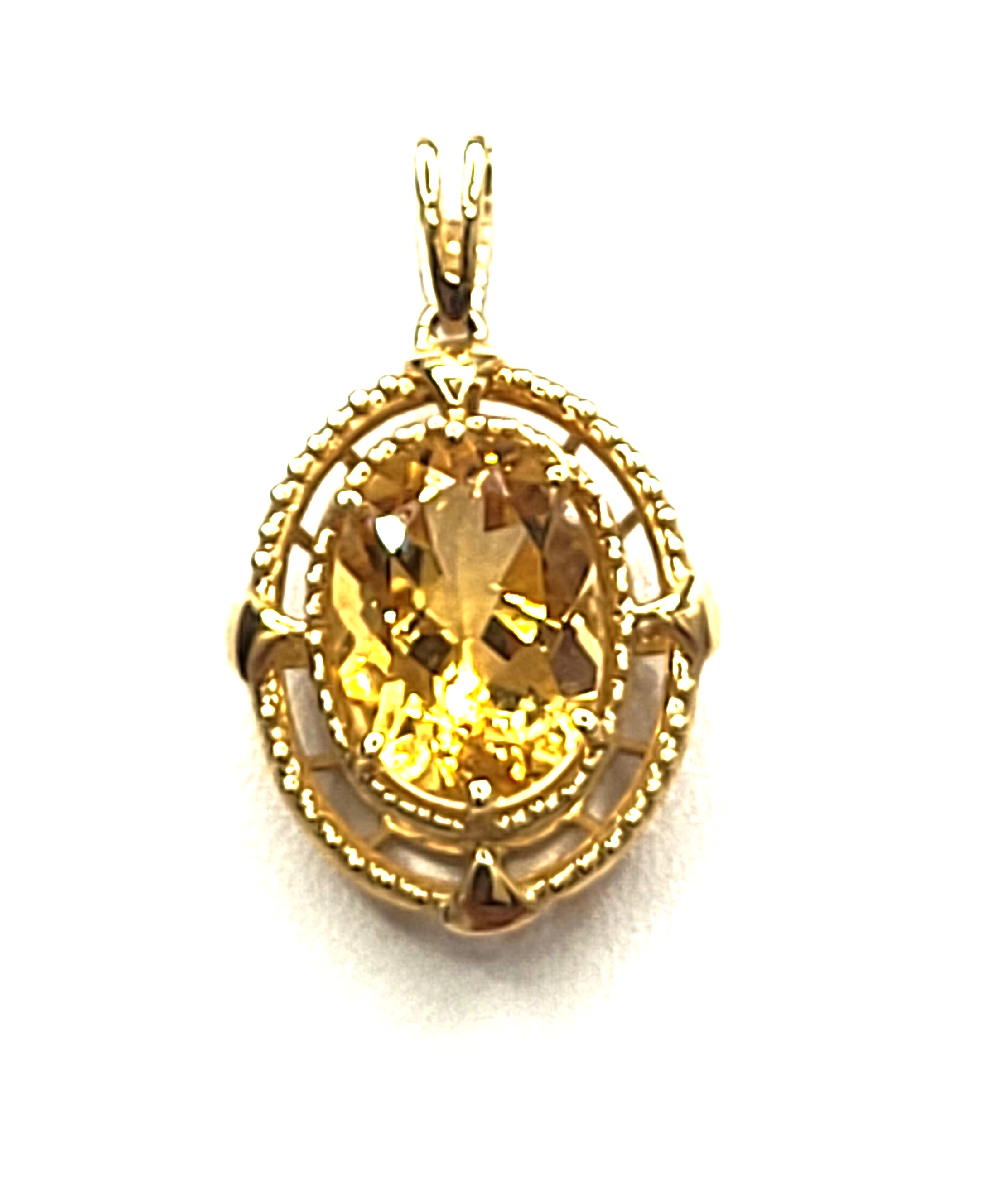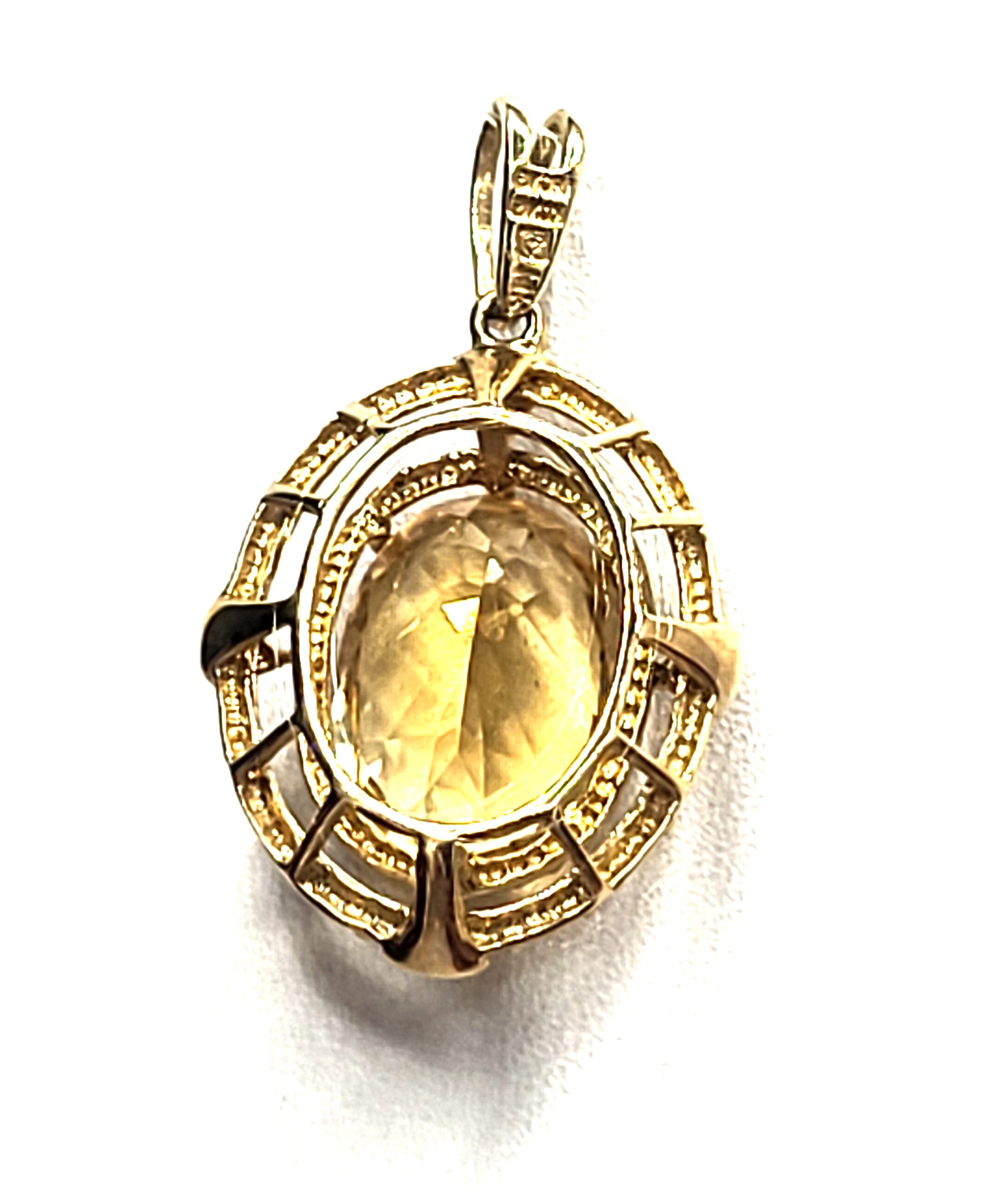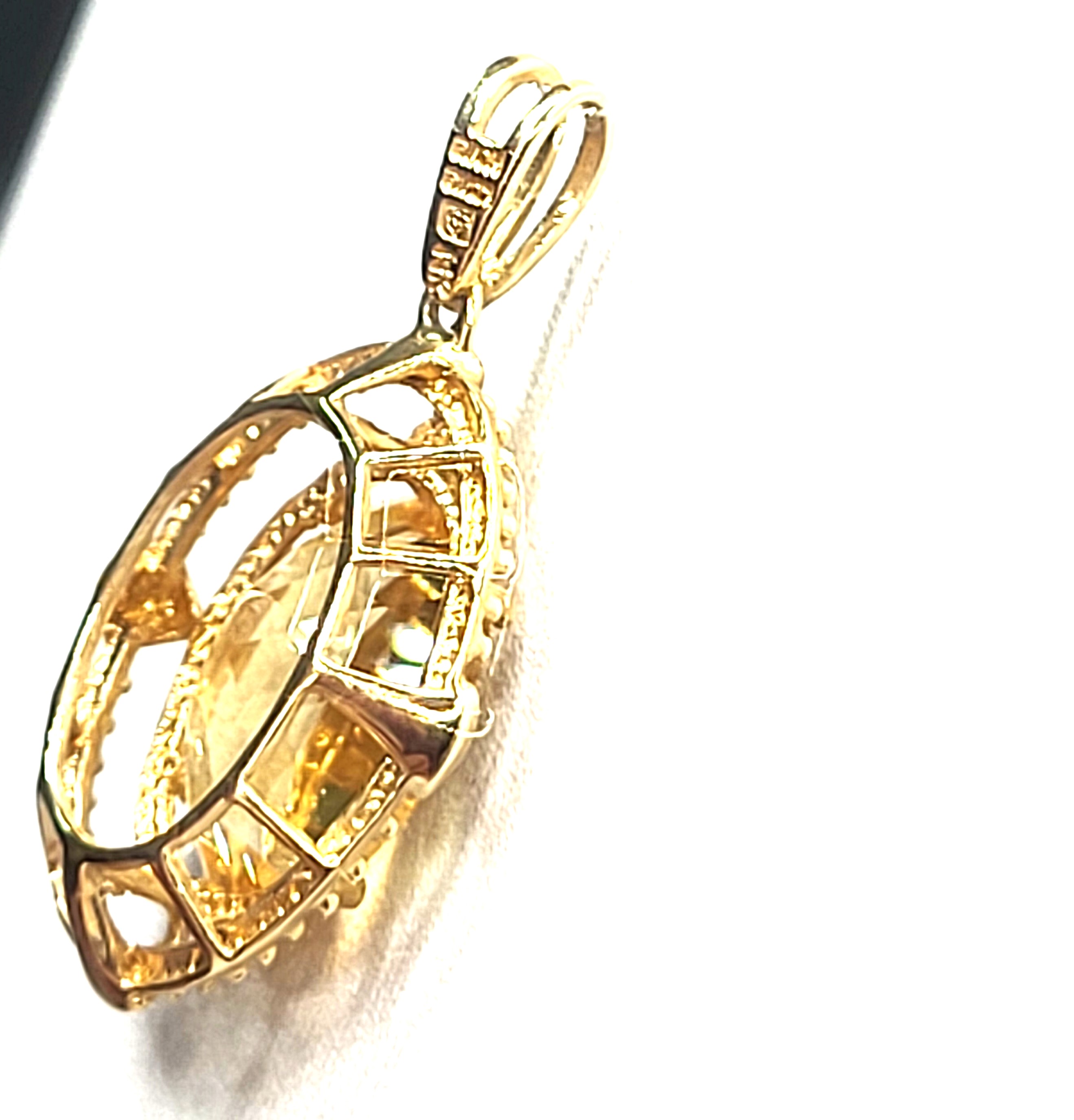 This is a wonderful 14 karat yellow gold pendant with an approximate 5.00 carat oval-cut, golden citrine that is set with 6-prongs inside concentric oval-shaped hobnail frames. There is a rabbit ear bail that is affixed to a permanent ring at the top of the pendant and it can accommodate an approximate 3.5mm chain. The pendant is approximately 1 3/8" long x 3/4" wide and bears the mark LJ for Lorenzo Jewelry, Hong Kong (one of the largest suppliers of colored stone jewelry in the industry). This pendant makes a great companion with the citrine ring in Lot 36! Admin:33110/13baa