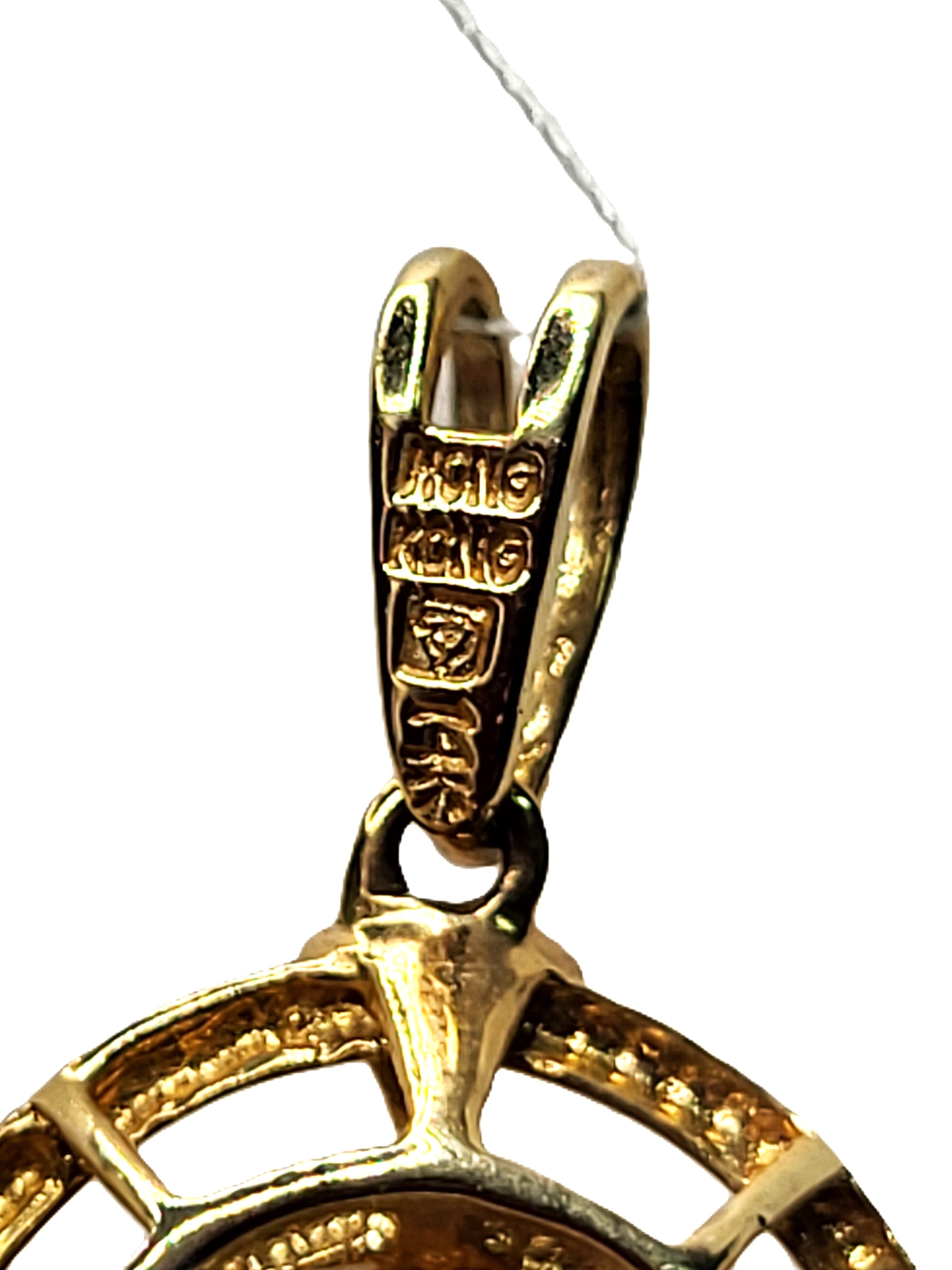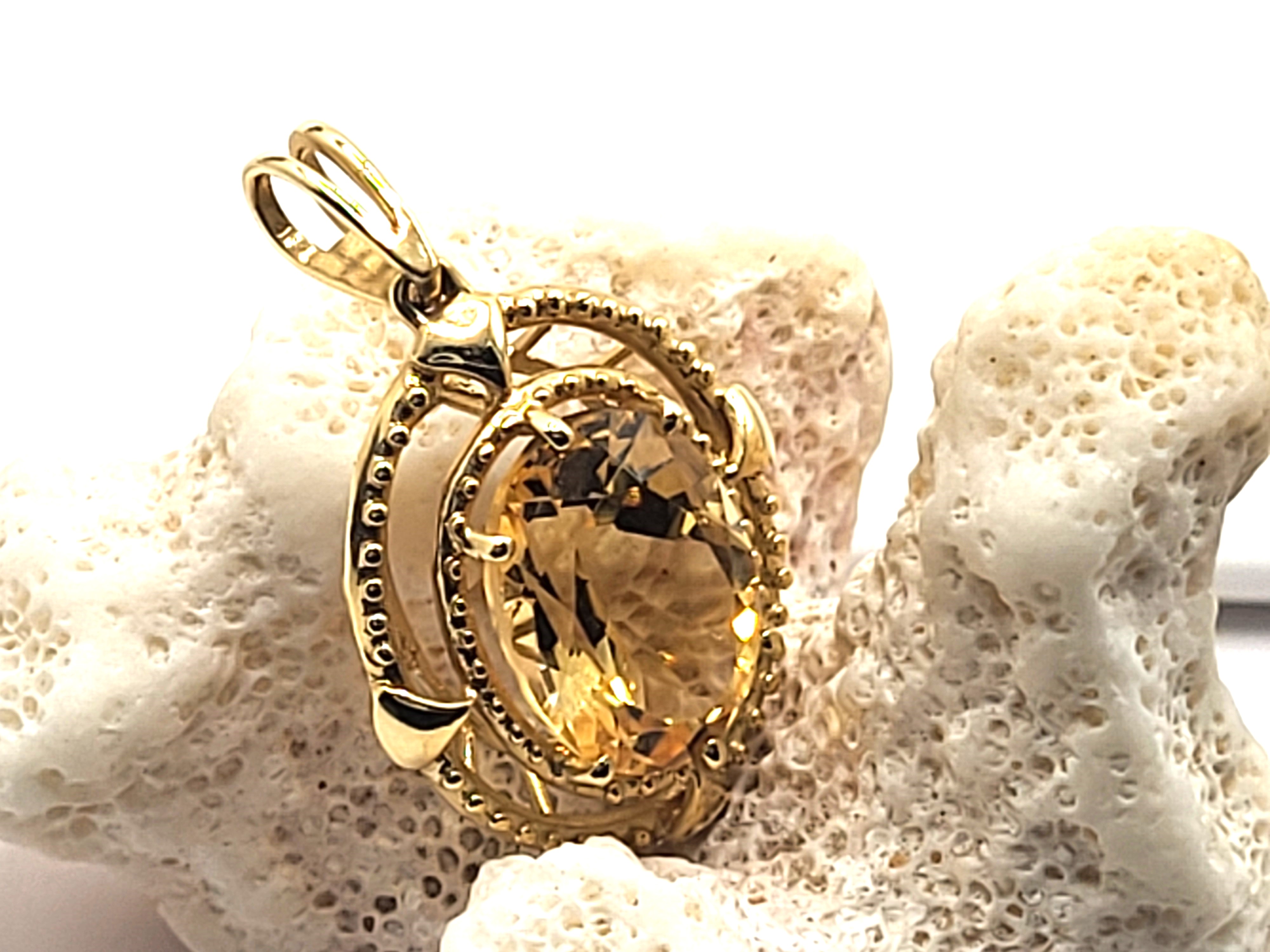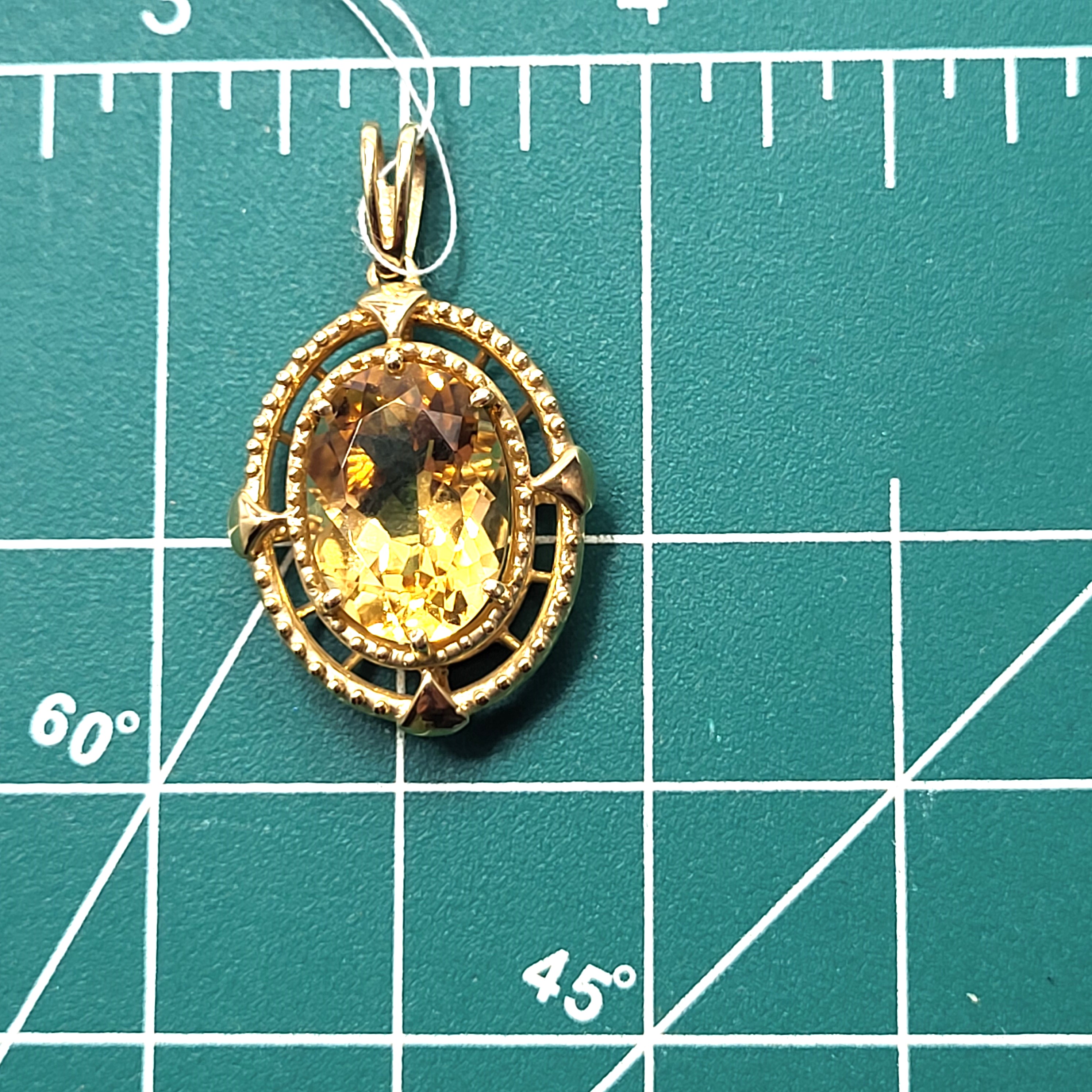 This is a wonderful 14 karat yellow gold pendant with an approximate 5.00 carat oval-cut, golden citrine that is set with 6-prongs inside concentric oval-shaped hobnail frames. There is a rabbit ear bail that is affixed to a permanent ring at the top of the pendant and it can accommodate an approximate 3.5mm chain. The pendant is approximately 1 3/8" long x 3/4" wide and bears the mark LJ for Lorenzo Jewelry, Hong Kong (one of the largest suppliers of colored stone jewelry in the industry). This pendant makes a great companion with the citrine ring in Lot 36! Admin:33110/13baa