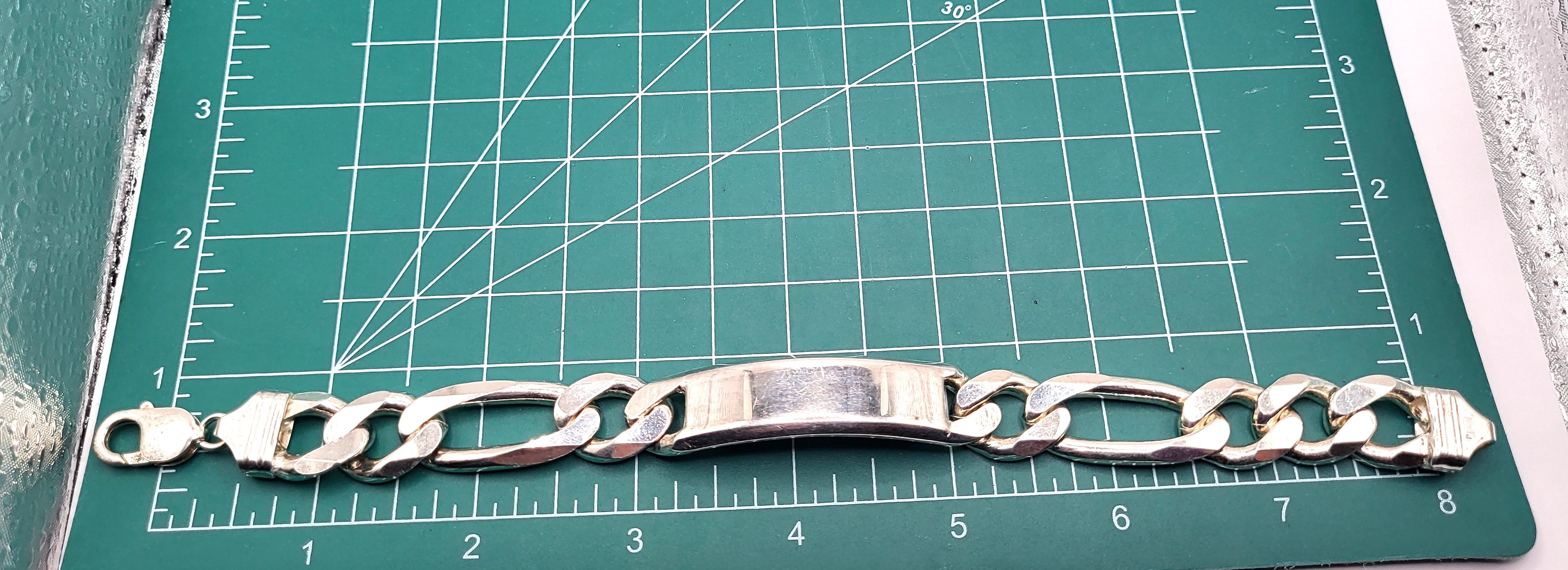 This is a very heavy sterling silver ID bracelet that is 8.25" long and has a lobster clasp. The convex, engravable plate is approximately 2" long, 5/8" wide, and 4.25mm thick. The figaro links are approximately 17mm wide. Admin: 33120/3ae
