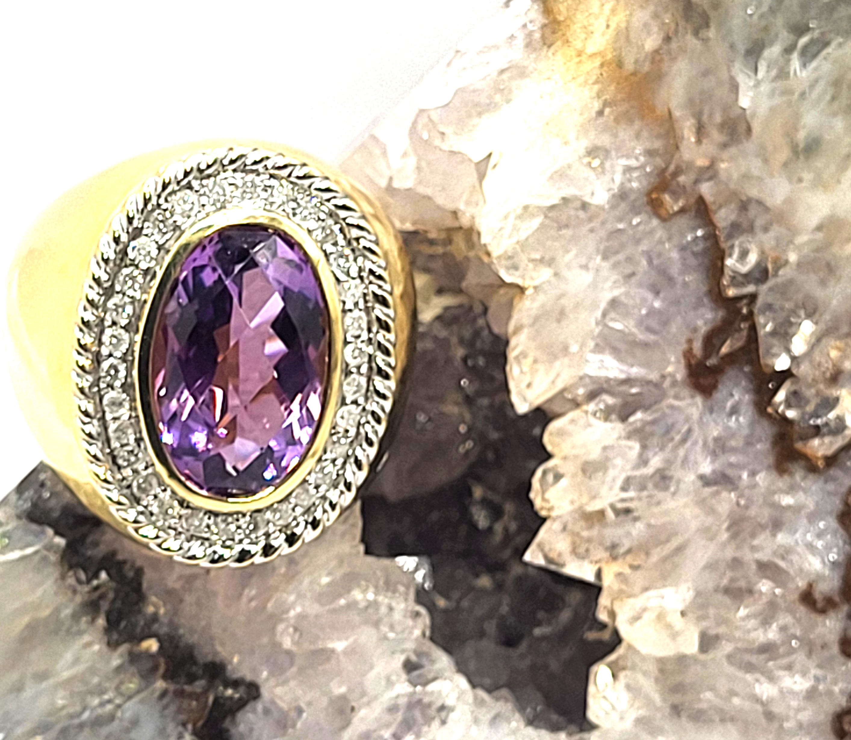 This 14 karat yellow gold ring features an approximate 8.00, carat top-faceted amethyst with wide polished shoulders twisted rope frame . The top of the ring is approximately 1 1/8" along the top of the finger and has a supportive gallery. The shank is approximately 5.5mm. This ring is US size 8 and can be sized for an additional charge. Please contact Bidfair Fine Jewelry for sizing details. Admin:33109/17eal