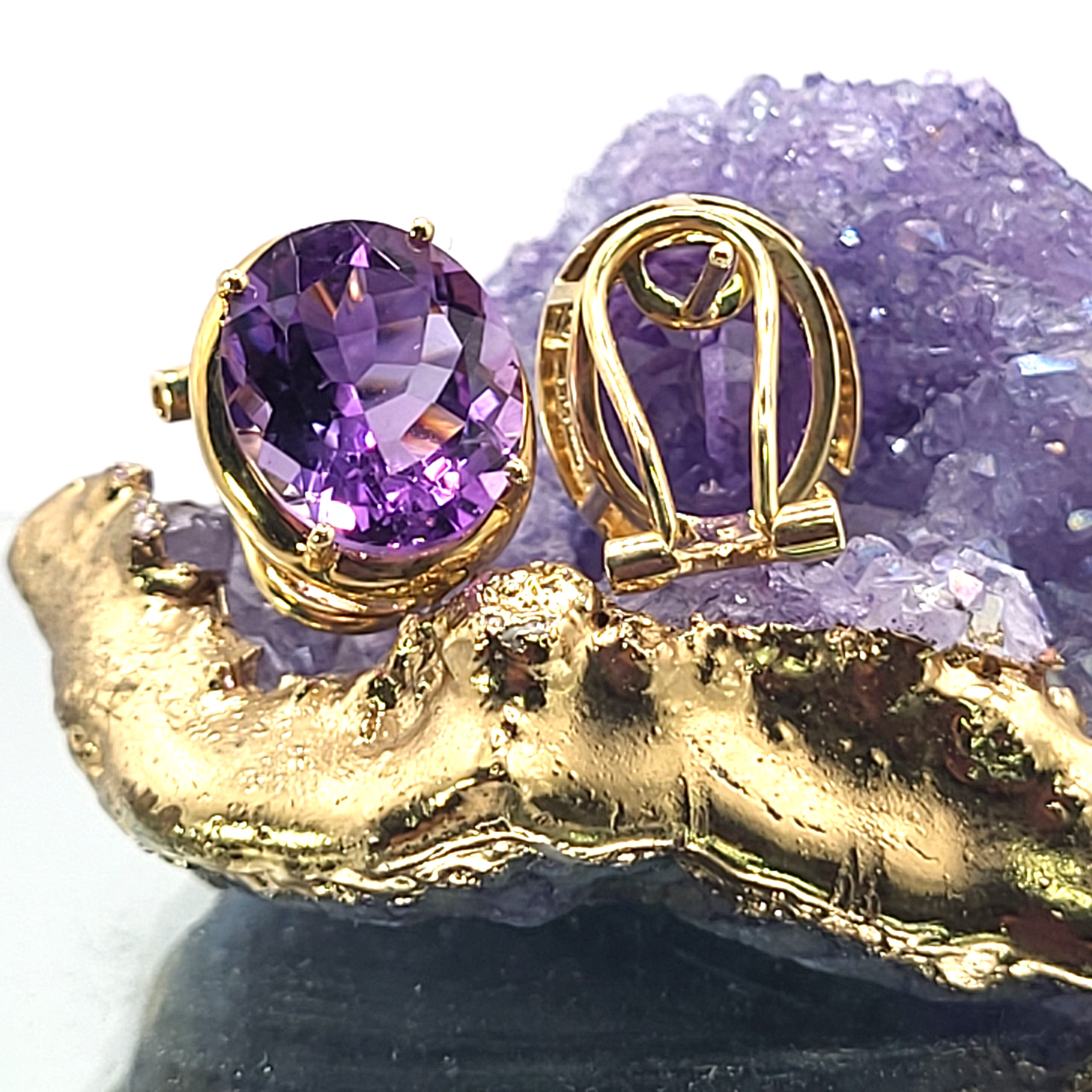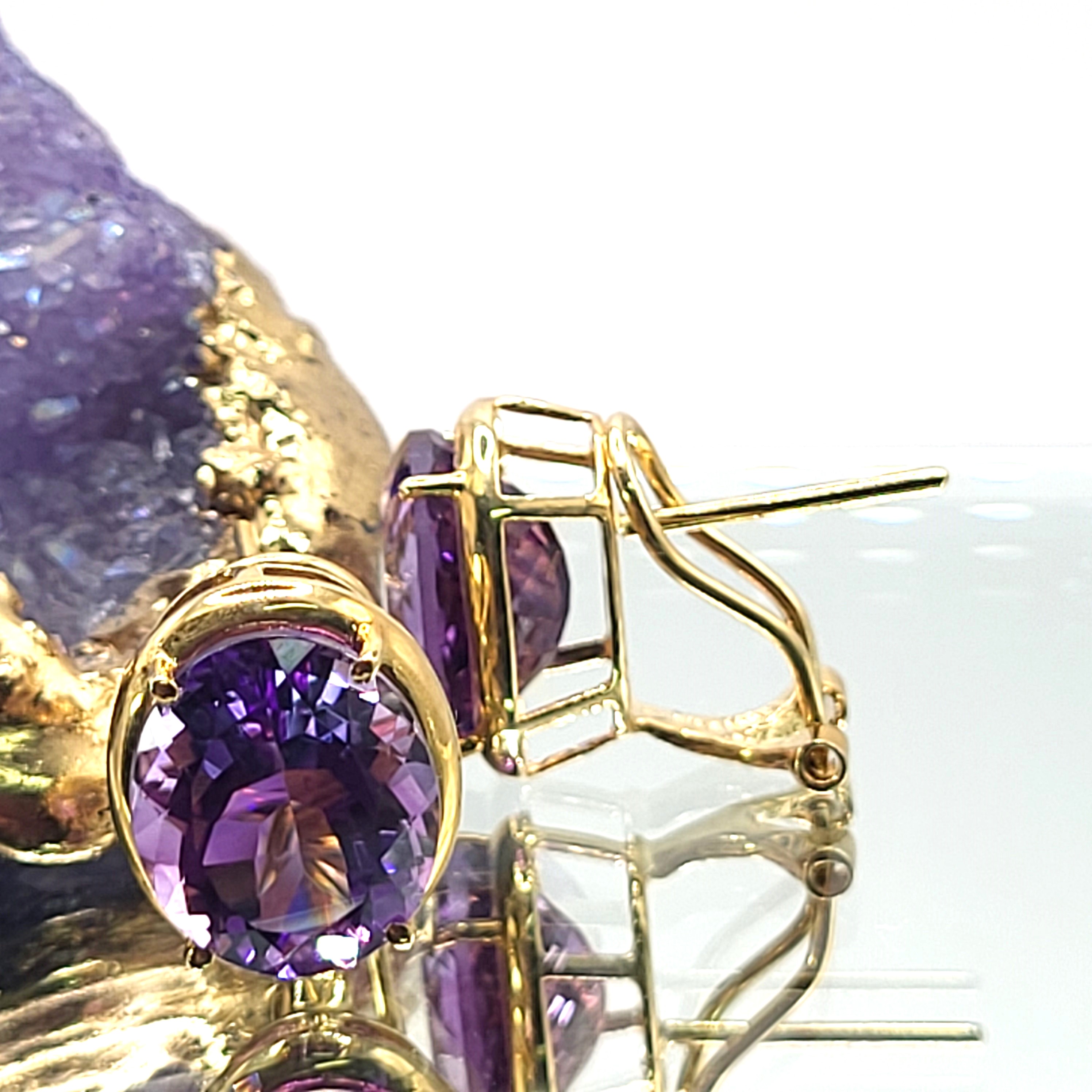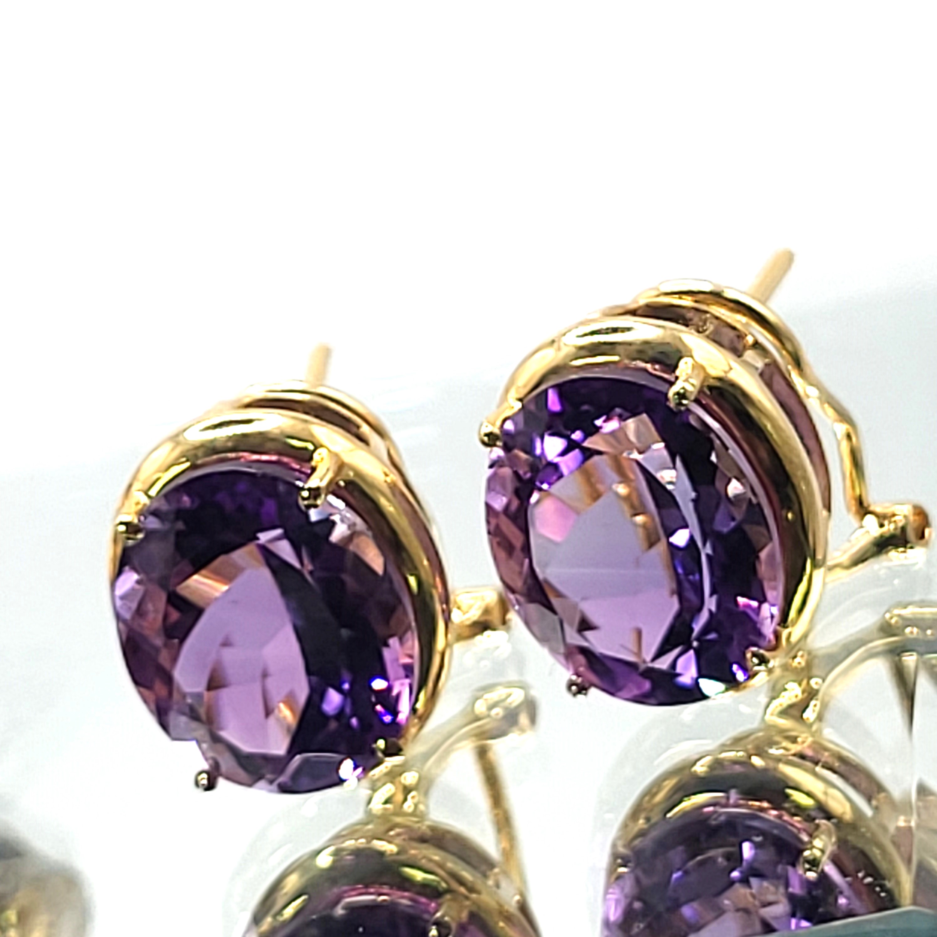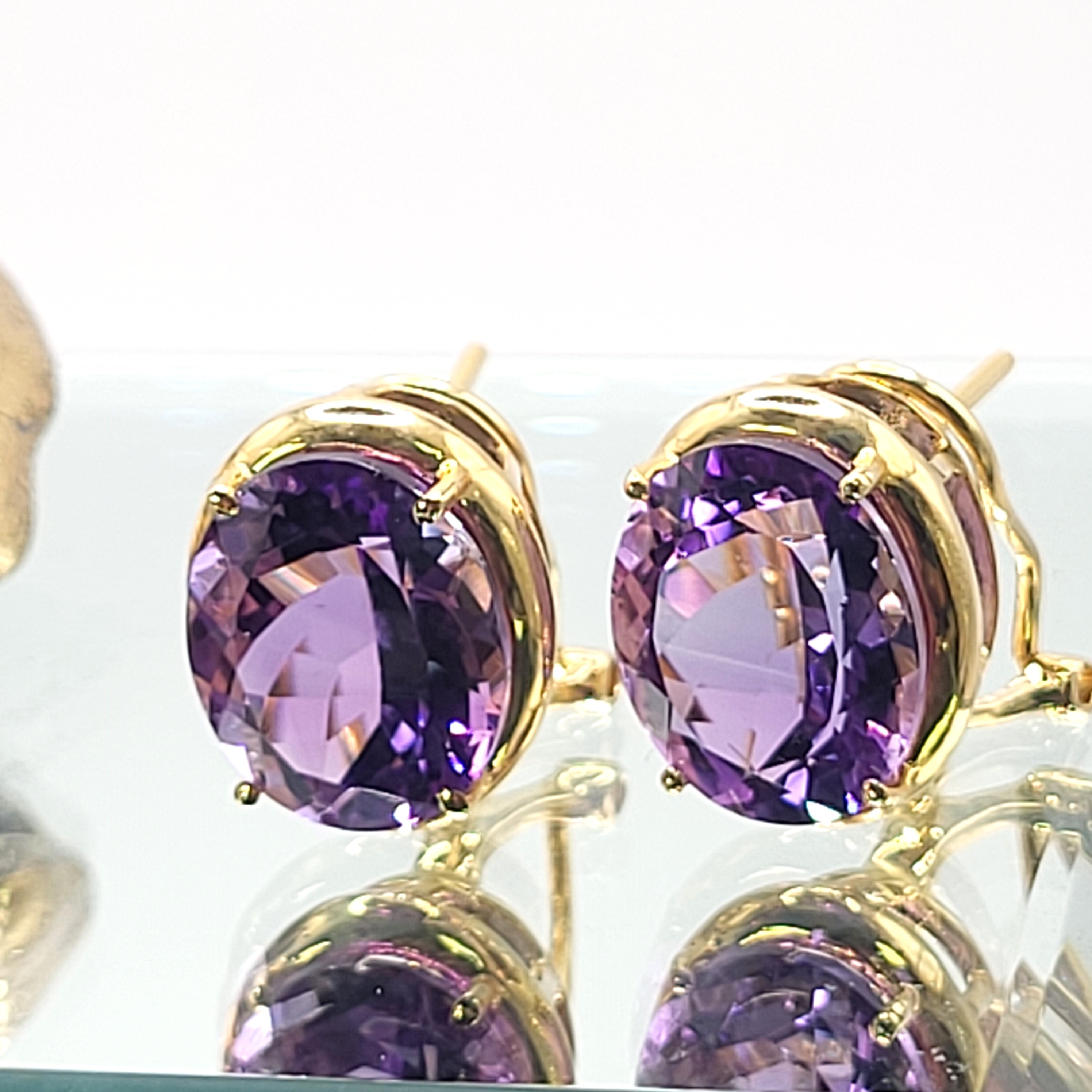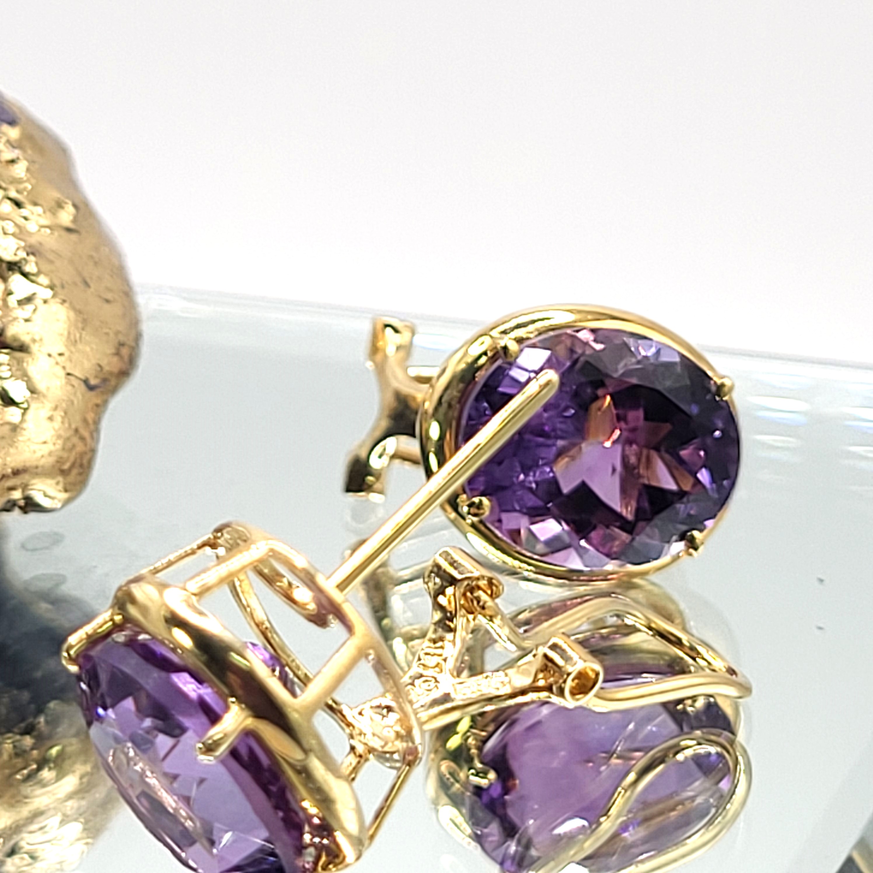 These 14 karat yellow gold earrings feature approximately 9.00 carats total weight of oval-cut, prong-set, genuine amethysts. The earrings attach to the earlobe with posts and Omega backs. : 33109/11arr