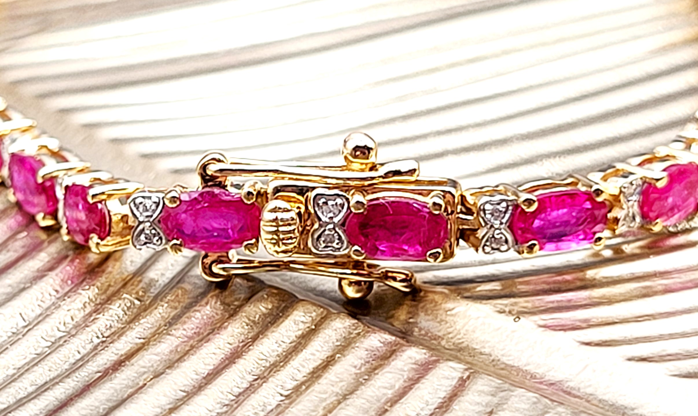 This 14 karat yellow gold bracelet contains over 5.00 carats of genuine, oval-cut rubies and each ruby represents an individual link. The links are separated by diamond-accentuated bow-tie shaped hinge covers. That means this bracelet has 5.87 carats of precious gemstones when you sum up the 5.72 carats total weight of rubies and the .15 carats total weight of round, faceted H-I color, I1 clarity diamonds! The bracelet is 7" long and has a hidden box clasp with 2 figure-eight safety clips. Admin: Q5743/31-bigr