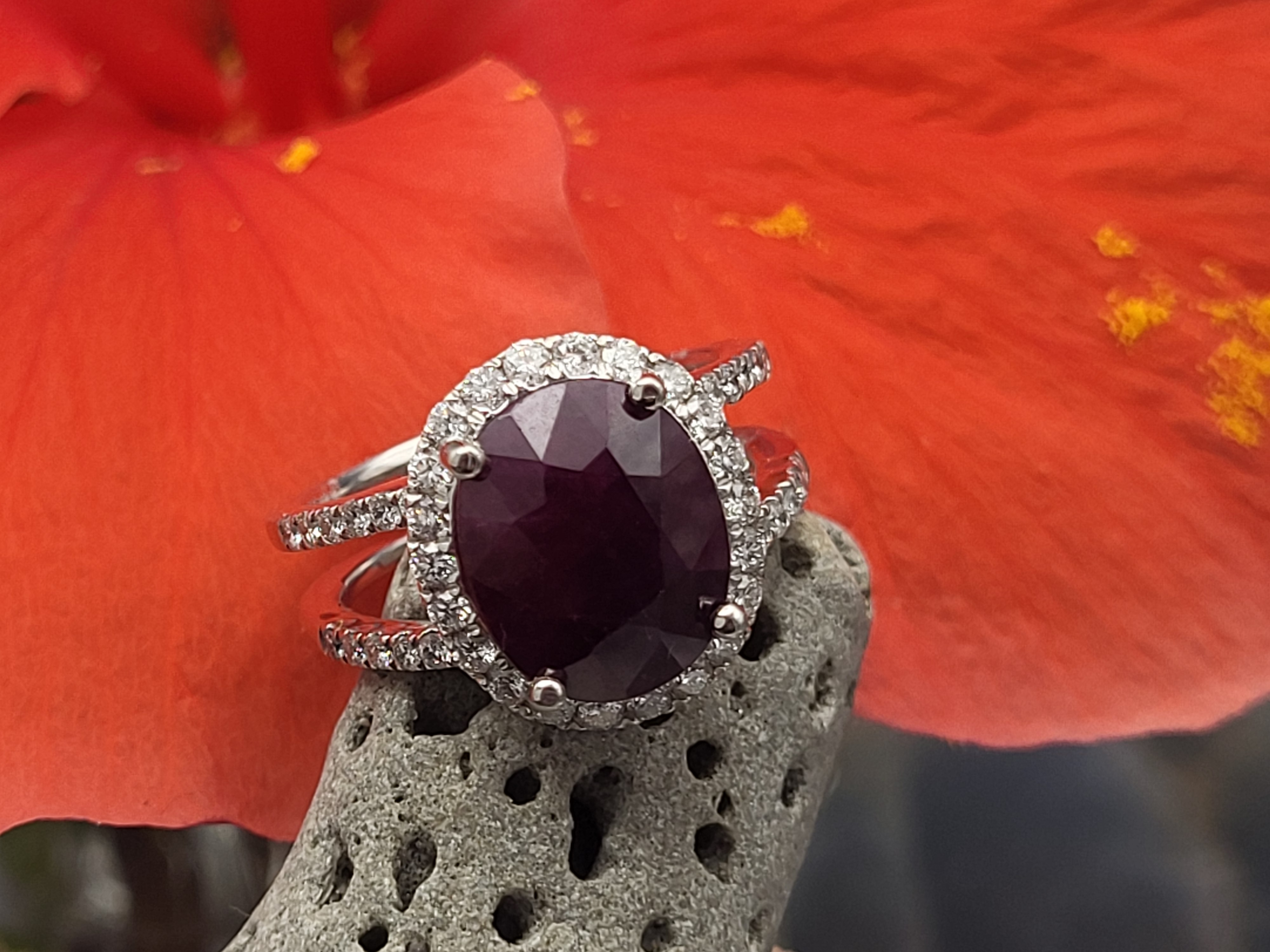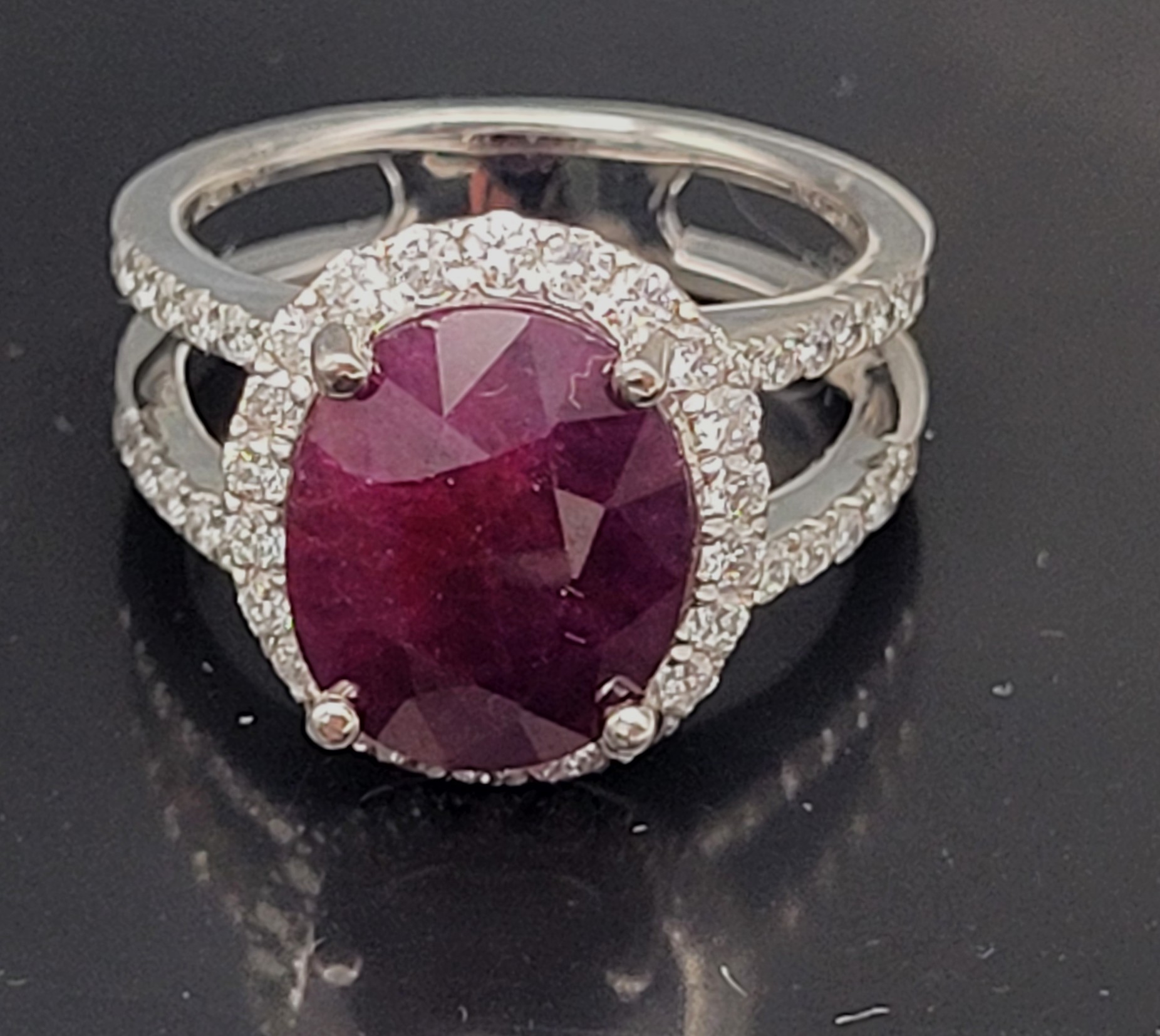 This certified and appraised platinum ring emotes elegance with the trendy dual-shank design and glittering diamond halo. The 5.95 carat, oval-cut, burgundy red, translucent, genuine ruby is prong-set in fine platinum with .70 carats of round, brilliant-cut, G-H color, VS2-SI2 clarity diamonds in the sparkling halo and along the four shoulders. The dual shanks taper to a single shank and the ring is US size 6 and can be sized for an additional charge, if desired.