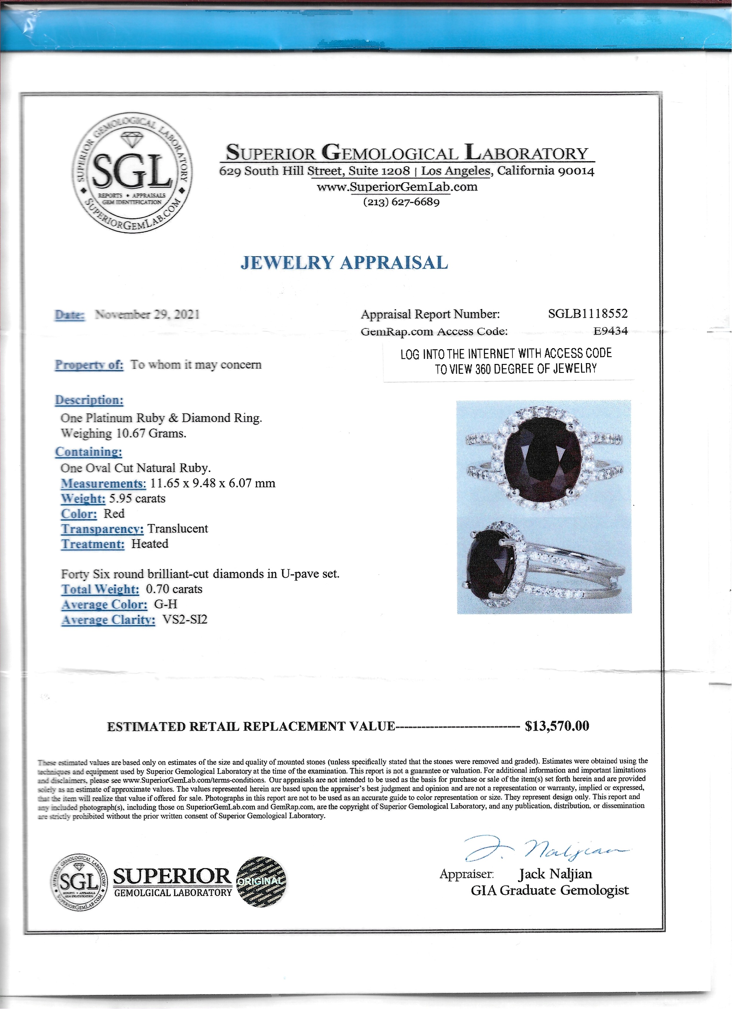 Certificate of Appraisal: Prepared by SGL (Superior Gemological Laboratory) and provided by the consignor