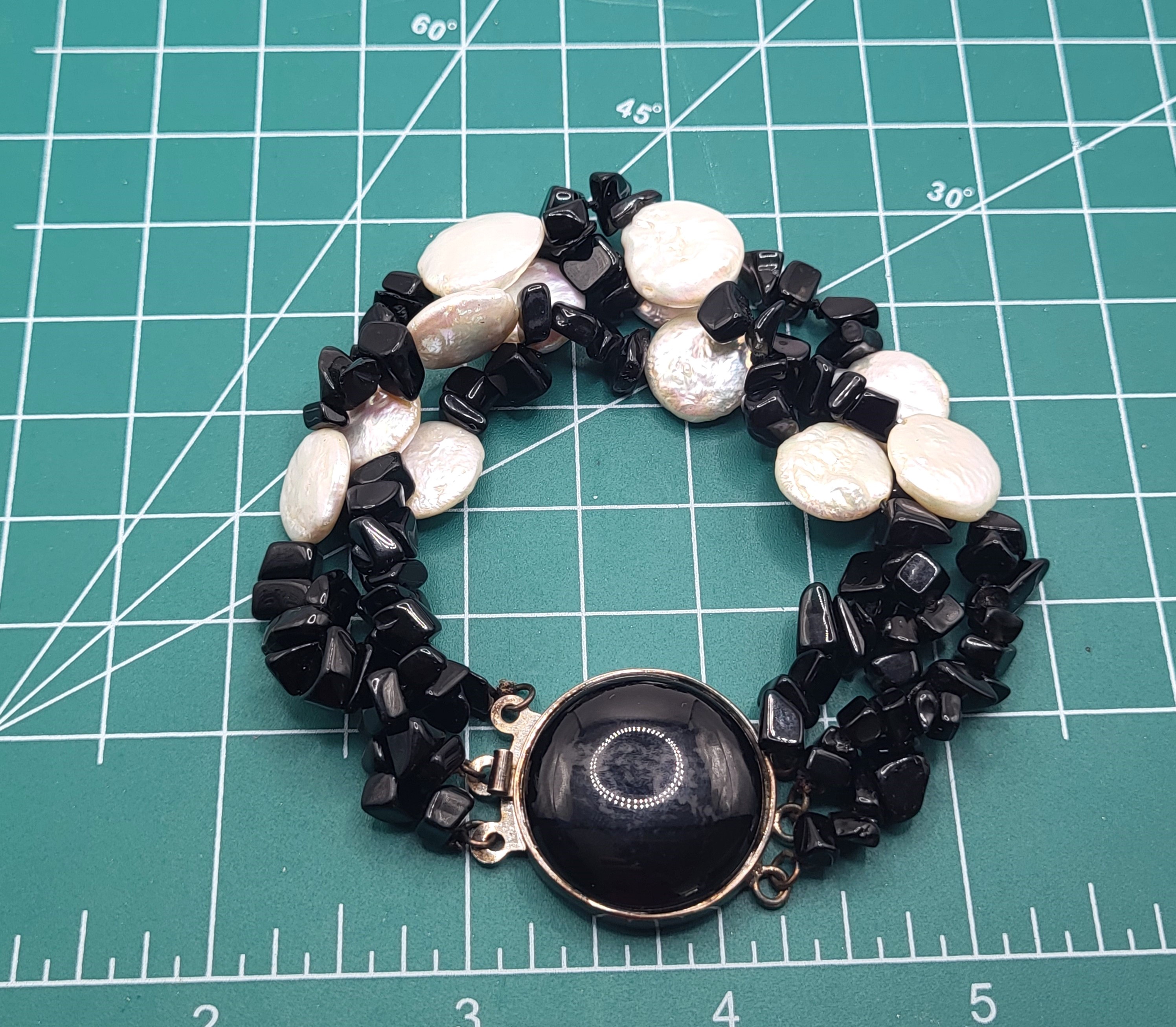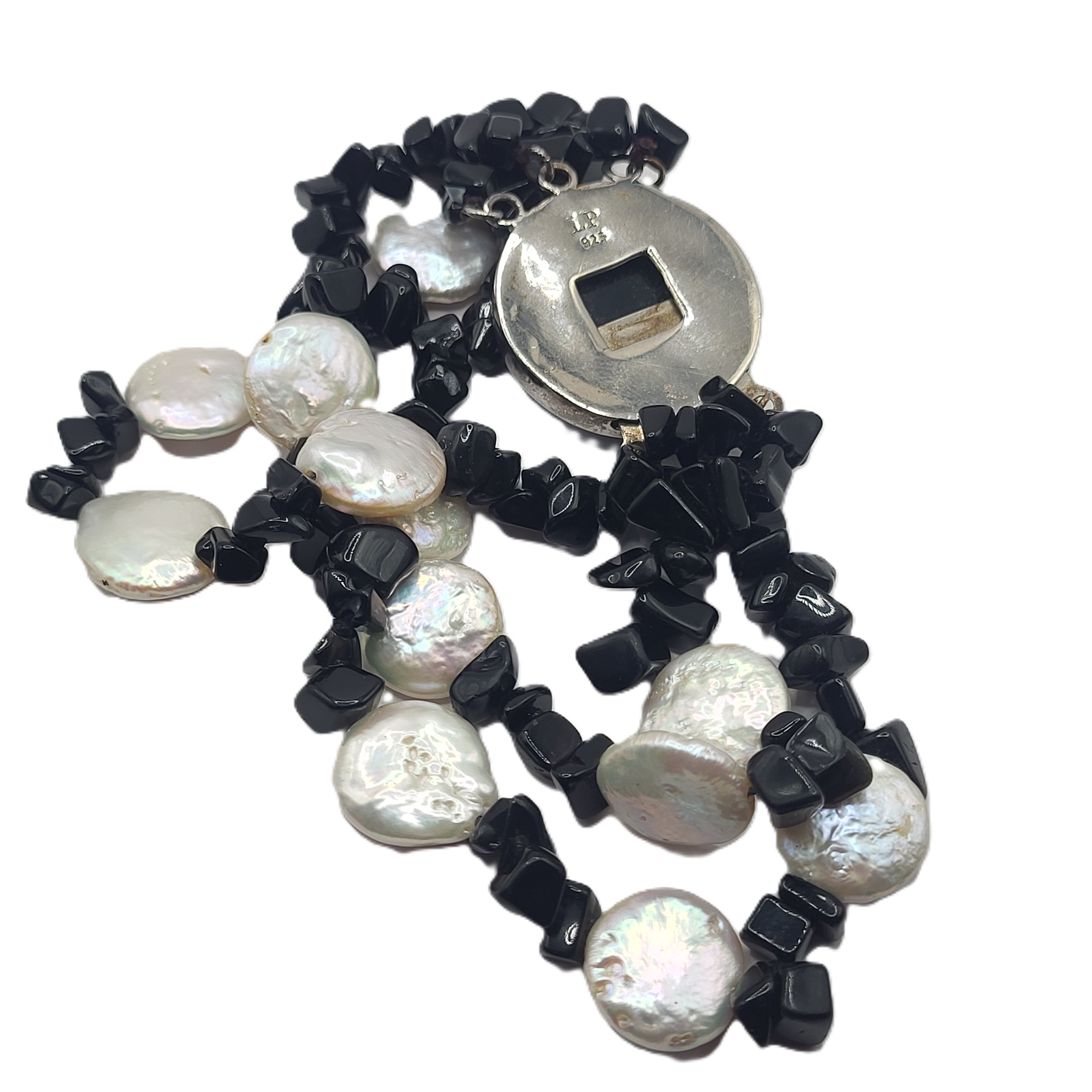 This sterling silver bracelet looks great while worn alone, or layered with other bead bracelets. The bracelet is made with strands of black onyx polished asymmetrical stones, and coin pearls. It is approximately 7" long. The bracelet ends in an approximate 20mm polished cabochon black onyx latch with a plunger style clasp. Admin: K2646/nt