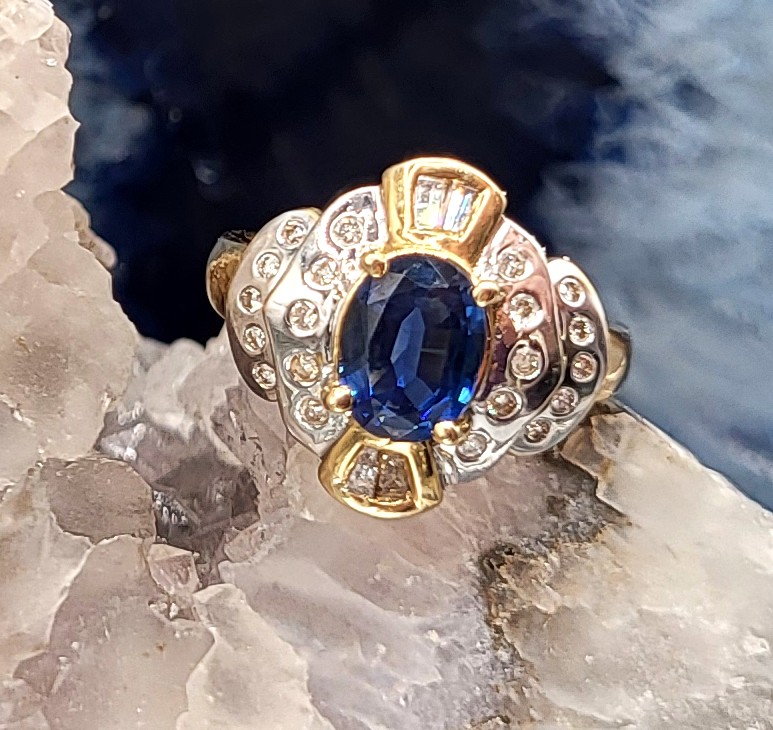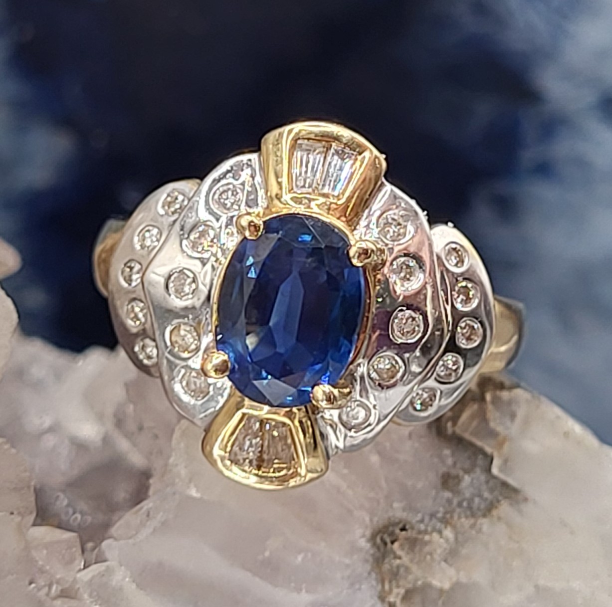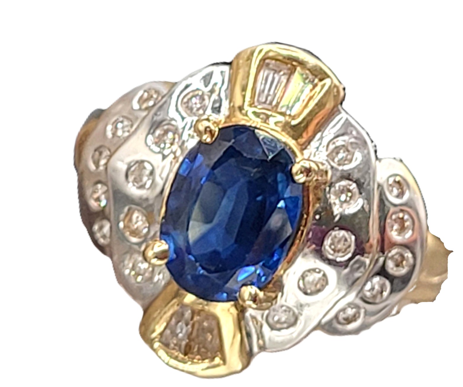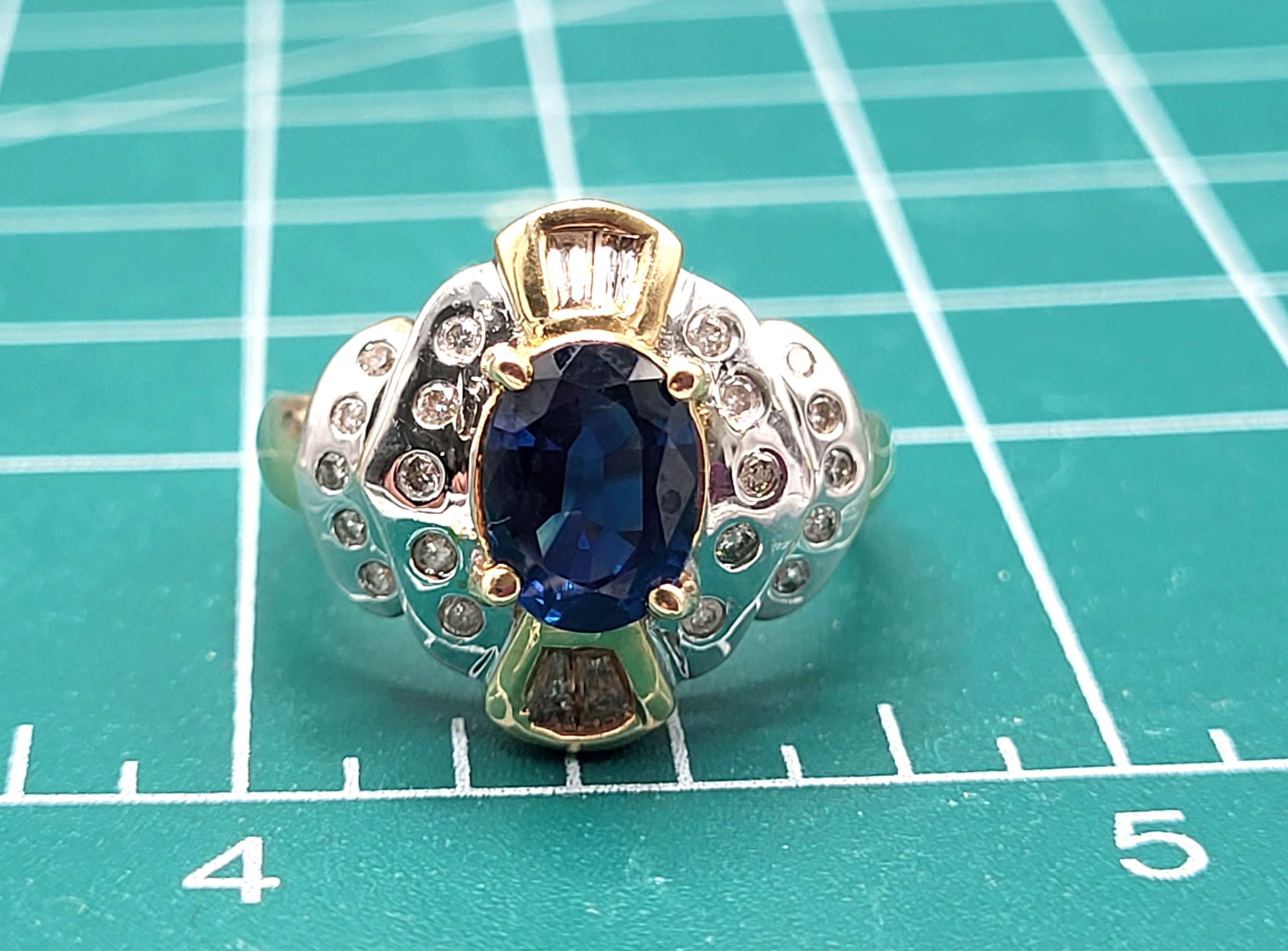 This is a 14 karat yellow and white gold ring with an approximate 2.00 carat oval-cut, prong-set, natural blue sapphire and approximately .50 carats total weight round, brilliant- and baguette cut diamonds on the frame and stepped shoulders. The baguette diamonds are framed and separate the flush-set round diamonds on the frame. The shoulders taper to an approximate 2.5mm shank and the ring is a US size 7, See sizing details below. The round diamonds are flush-set and baguette diamonds are prong-set. Admin:33109/13ltl