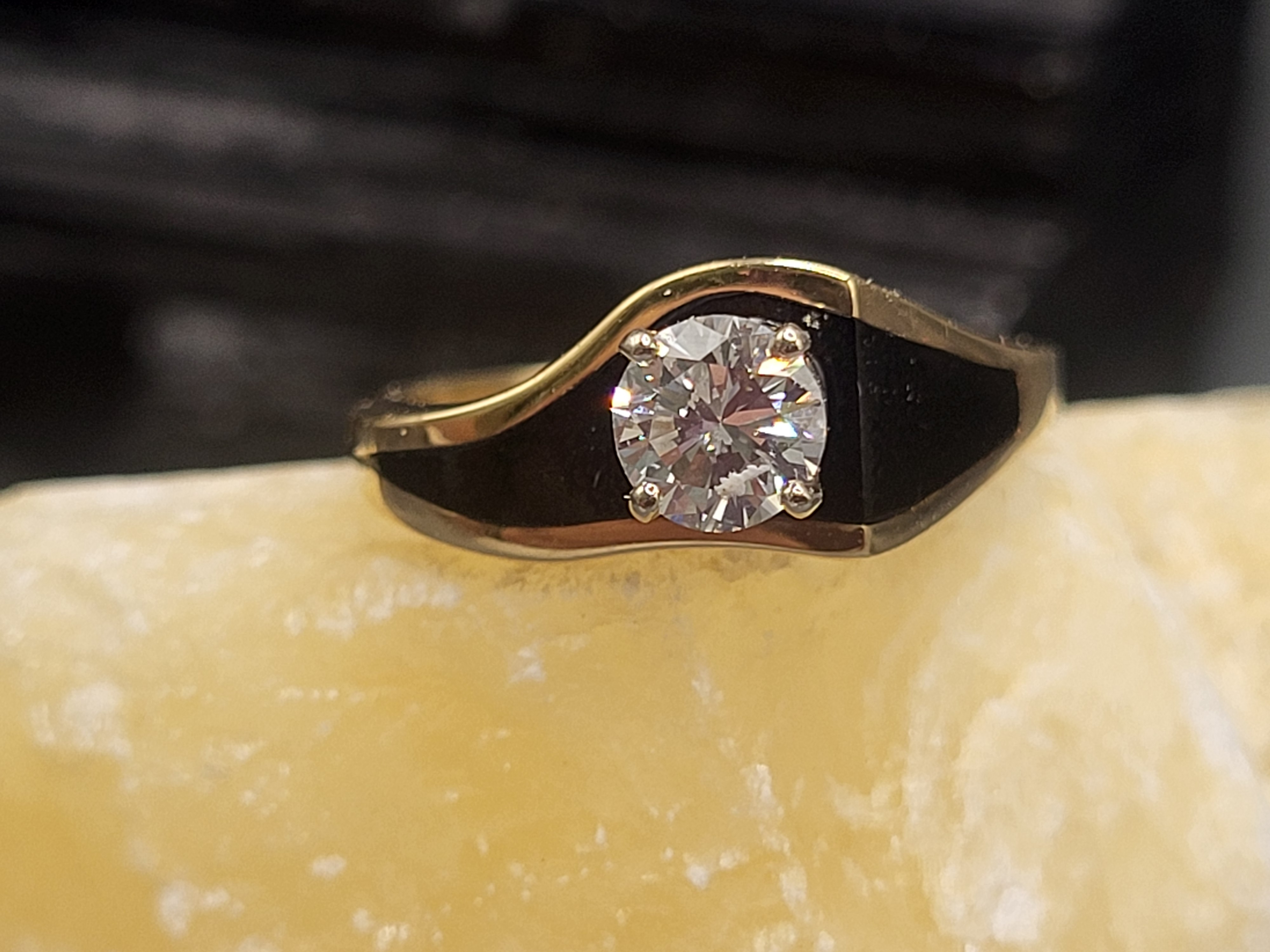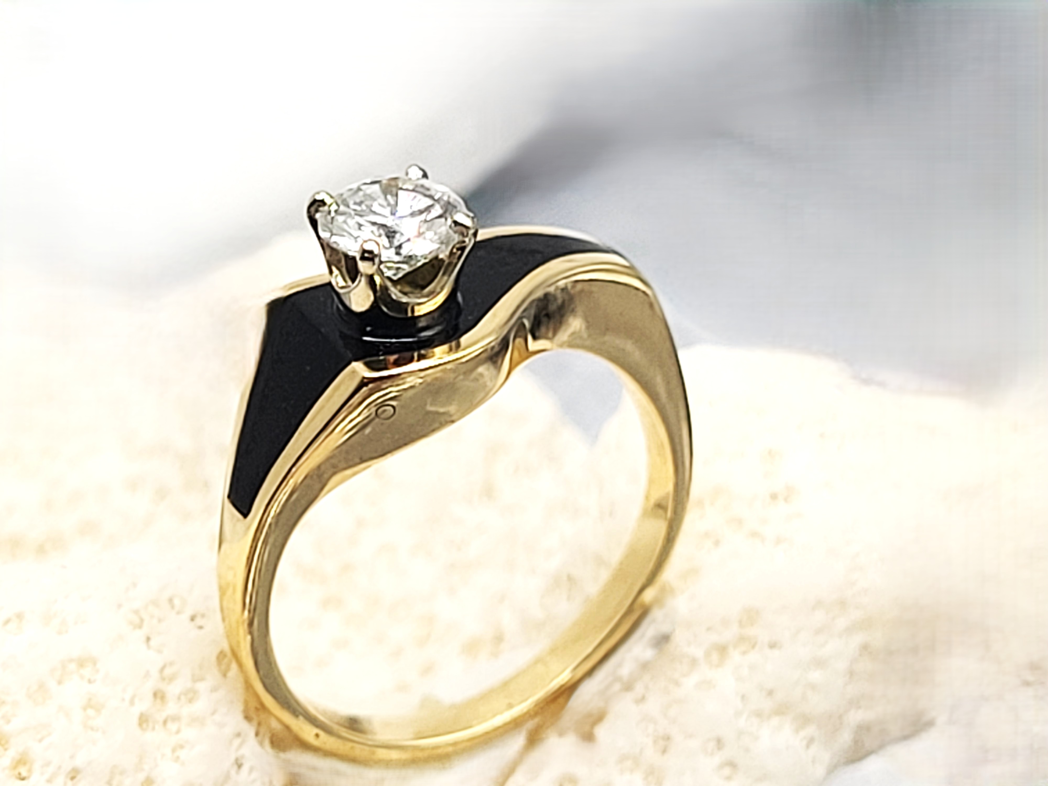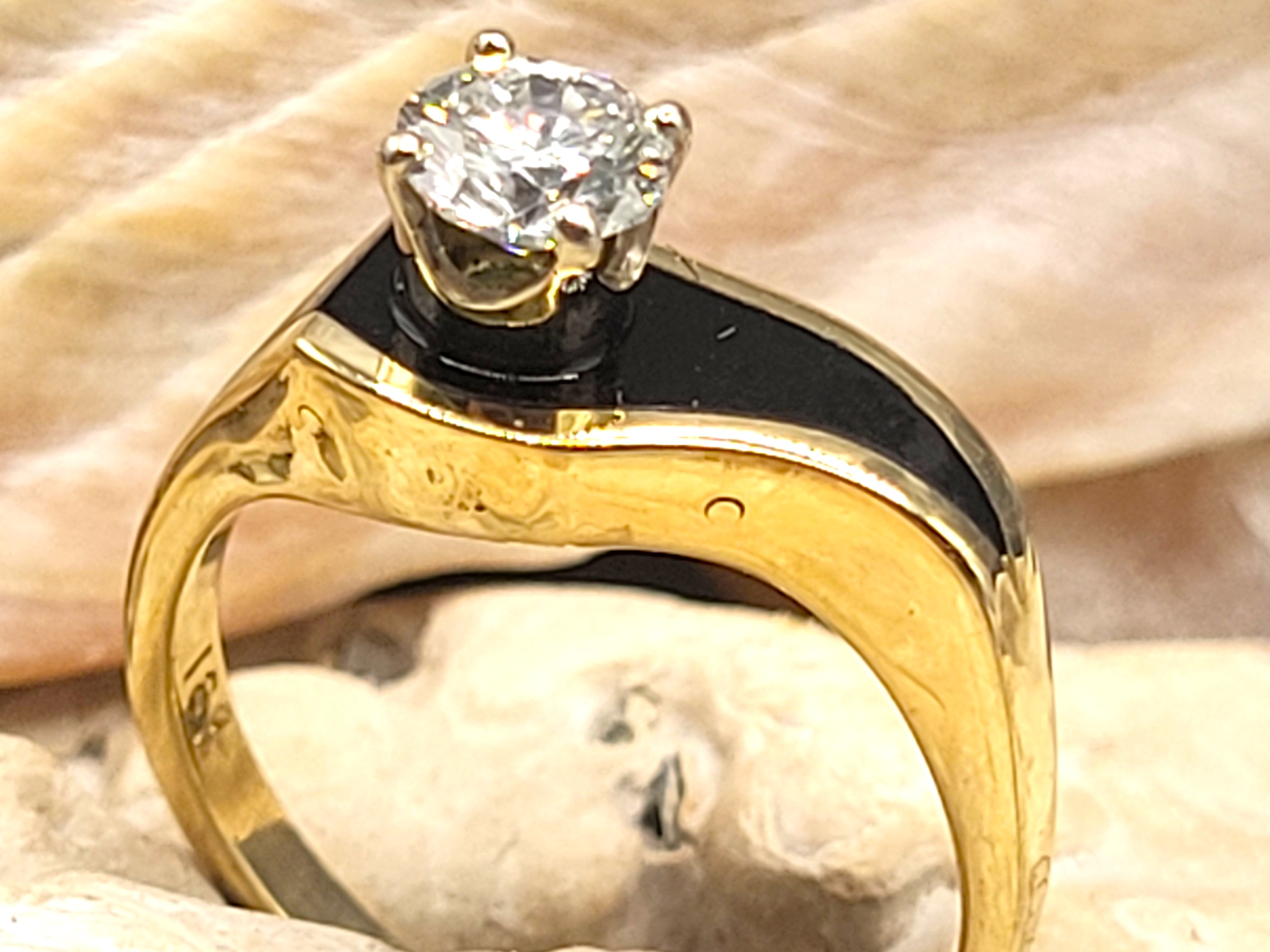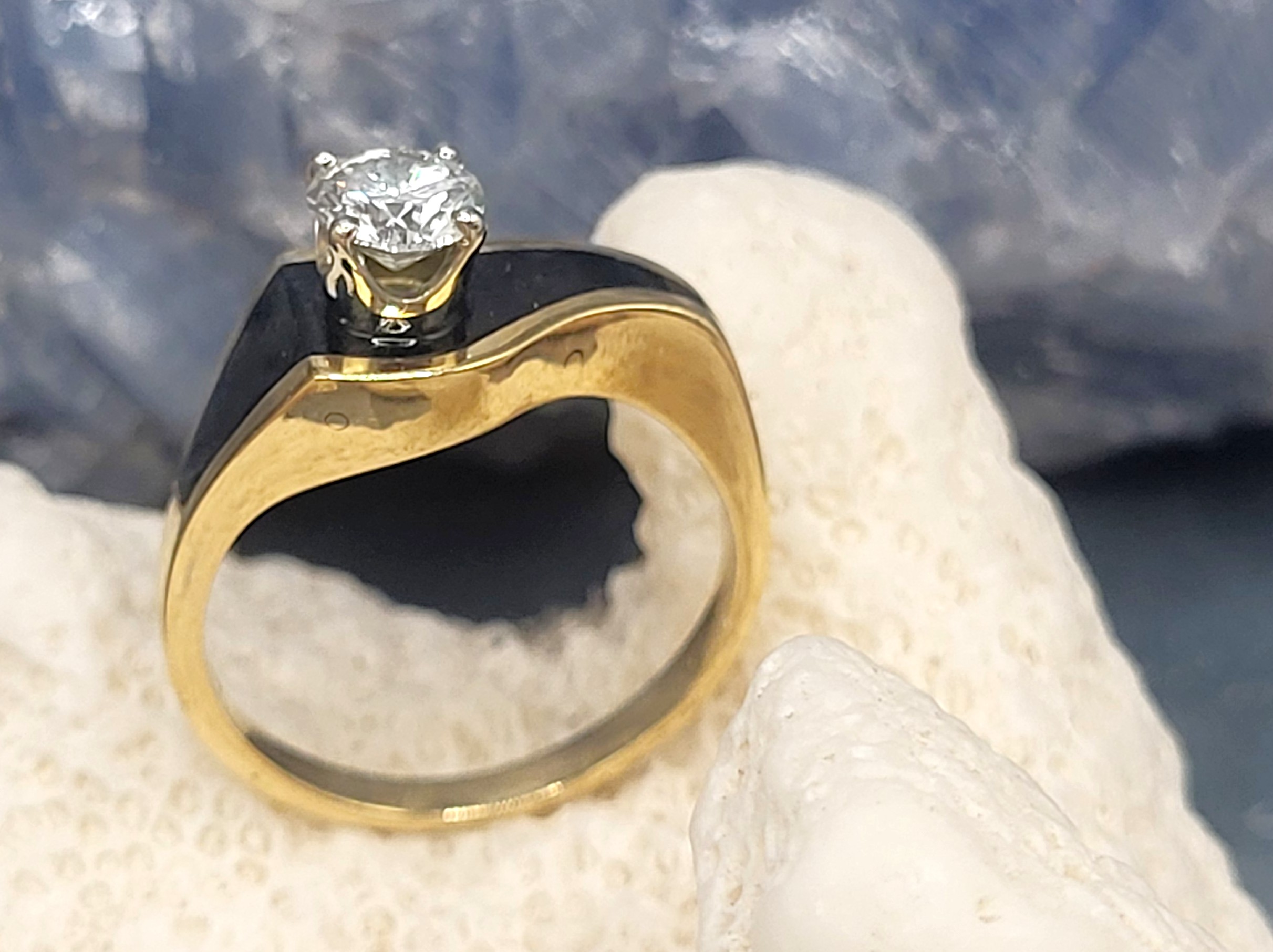 Designed by world-renowned, American sculptor, Bernard K Passman (1929-2007), this 18 karat yellow gold ring is set with sculpted black coral, the medium Mr. Passman is famous for using in his works, and a very exceptional quality earth-mined diamond.  This signed Bernard K Passman creation is called "Wavy". It is a ladies contoured solitaire diamond ring with sculpted black coral inlaid on the top surface with the shape of undulating waves and alluring curves, before sharply plunging down the diamond-bearing shoulder and tapering to an approximate 2.25mm ring shank. For this ring, Mr. Passman chose to set a round, brilliant-cut, natural, VVS2 clarity, H color, earth-mined diamond that weighs approximately one half carat (.50 ct), in a four-prong, white gold head and sturdy basket.  As in almost all of Mr. Passman’s jewelry designs, the initials "BKP" are hand-etched, most likely with a hand-held rotary tool, approximately 1/3rd of the way down the outside shoulder opposite the diamond. This ring is US size 5.5 and is extremely limited to alterations, due to the nature of the black coral.  Please inquire with Bidfair Fine Jewelry for sizing capabilities and associated charges. The provenance of this ring is located at the bottom of this page, along with a brief history of Mr. Passman’s interesting life works.