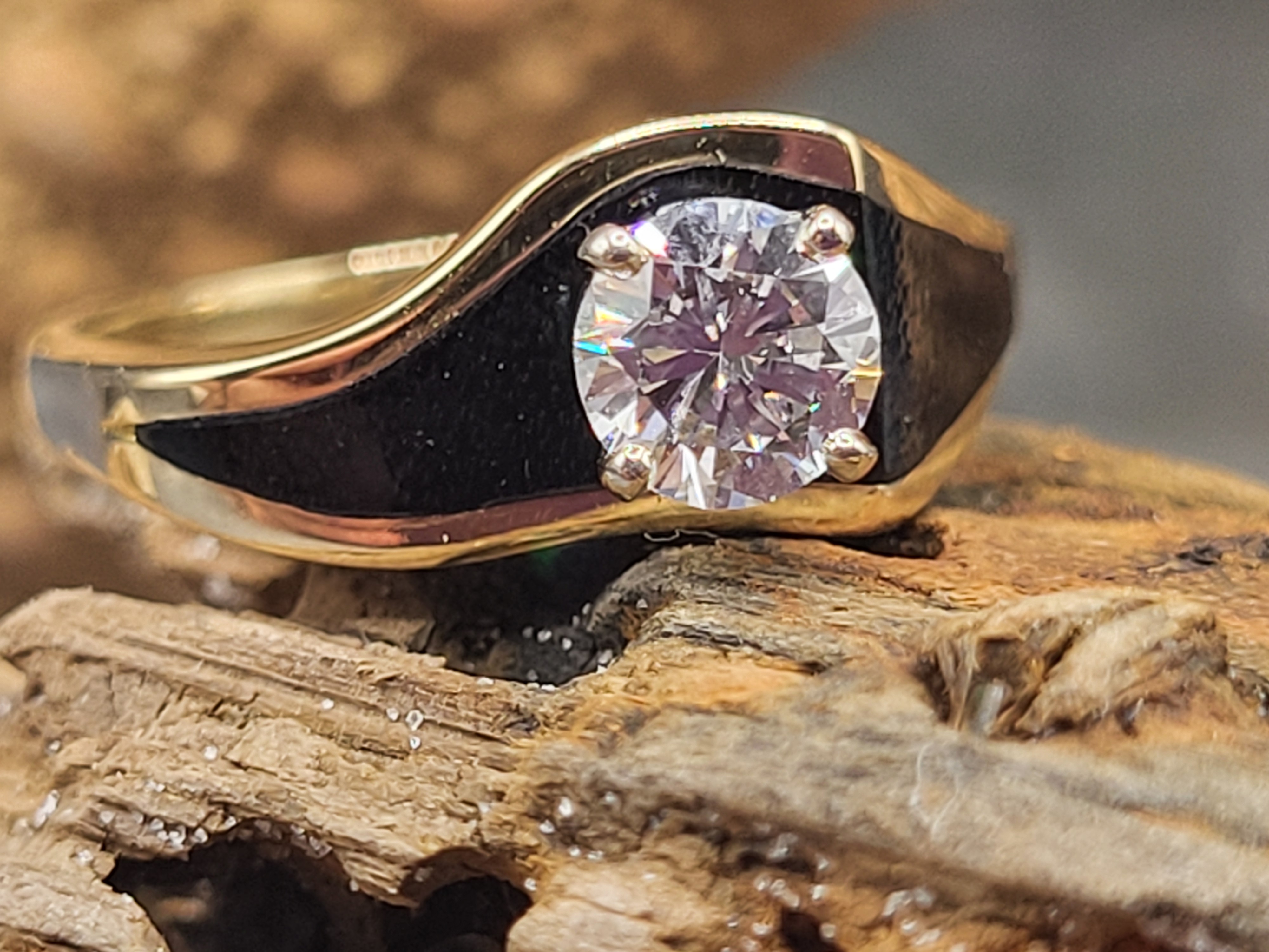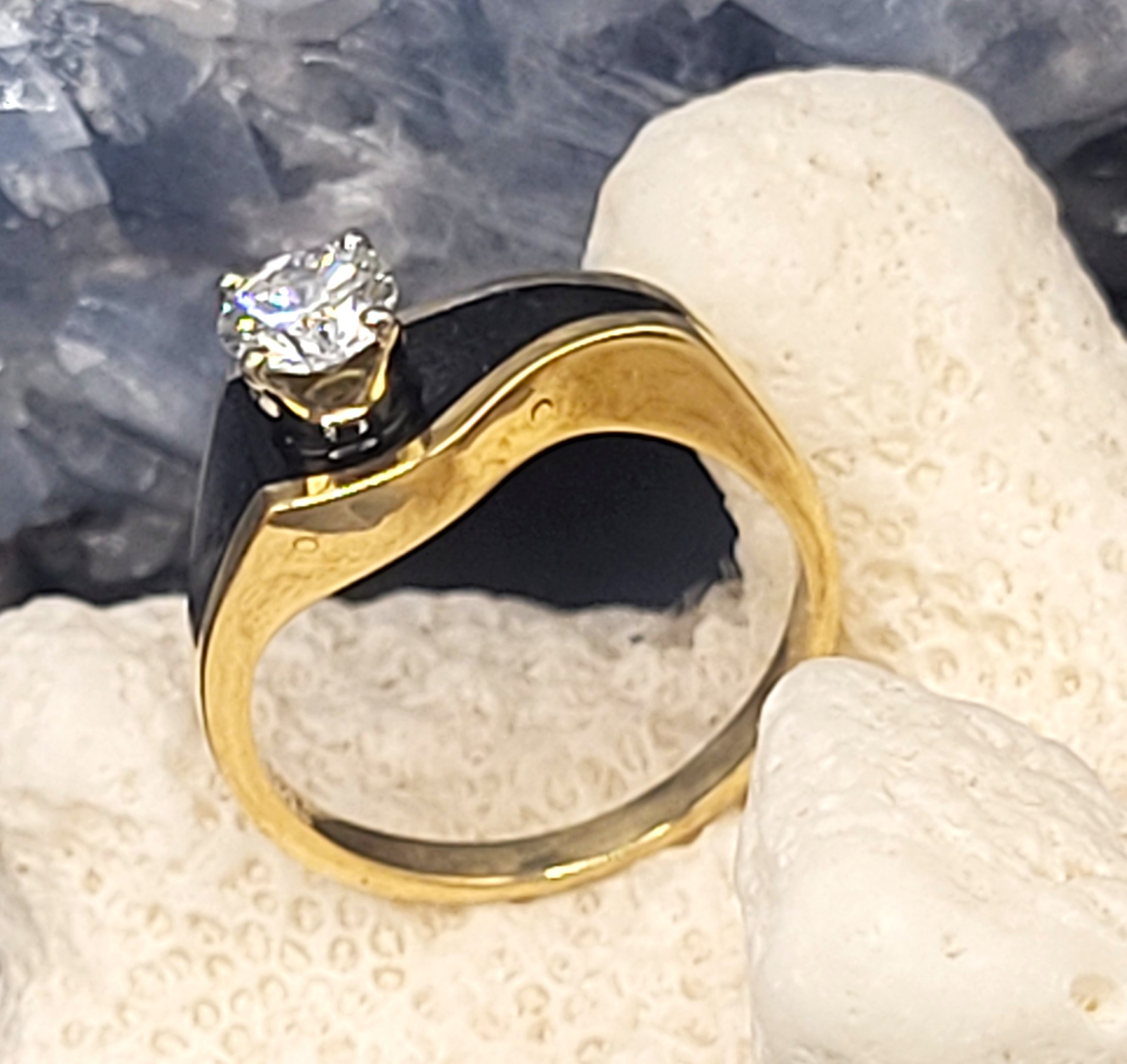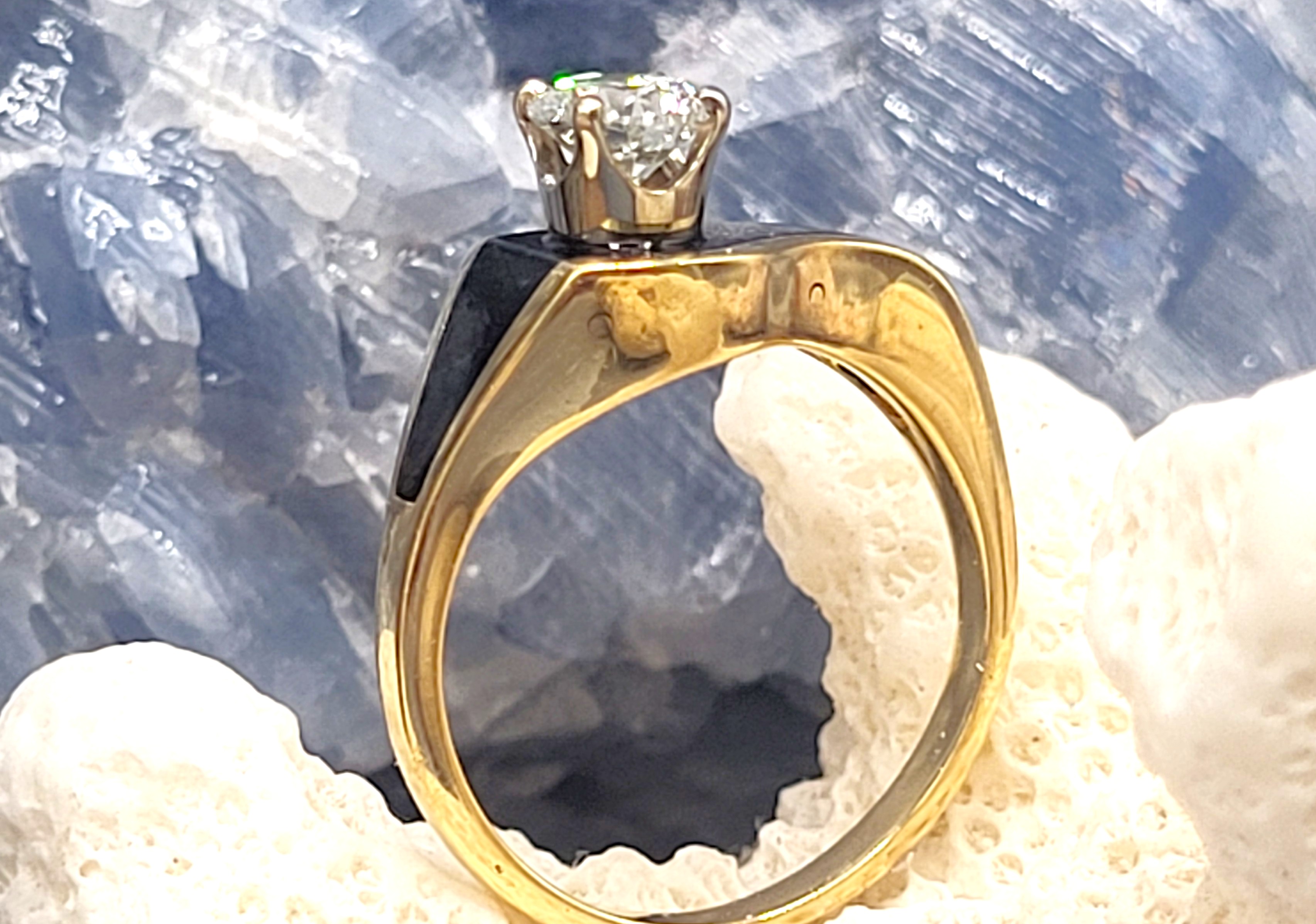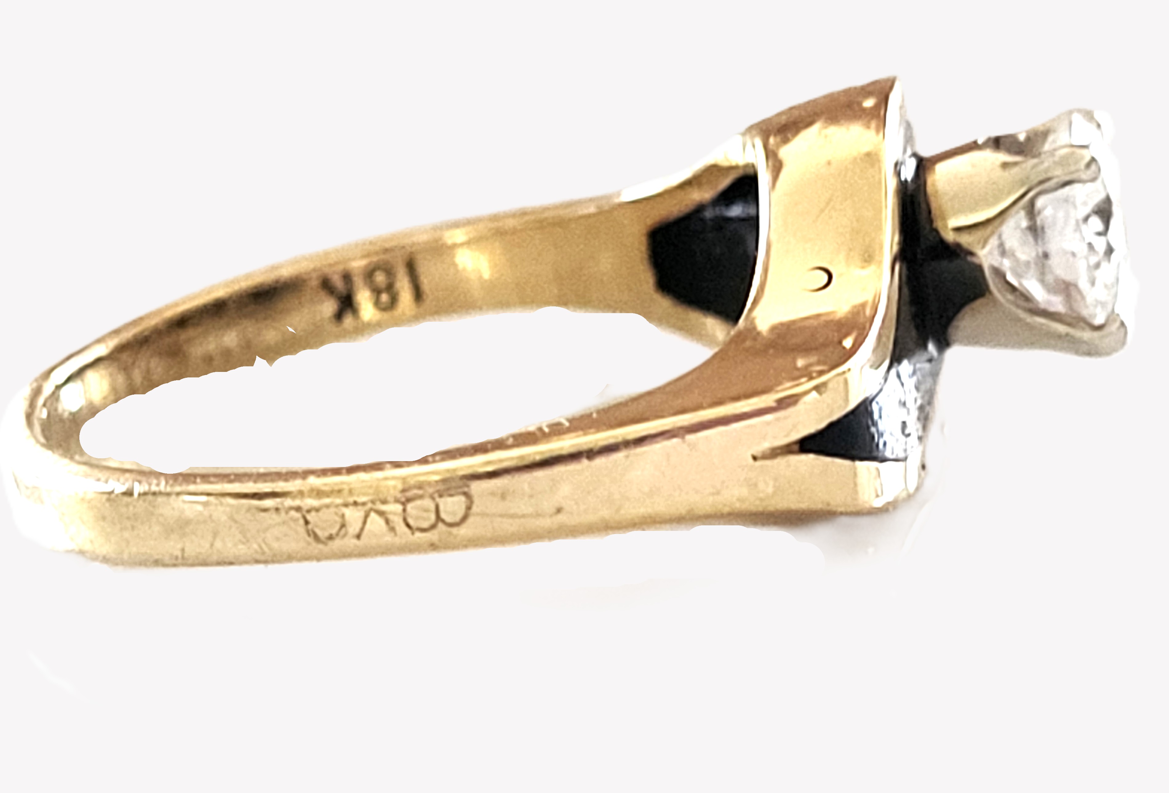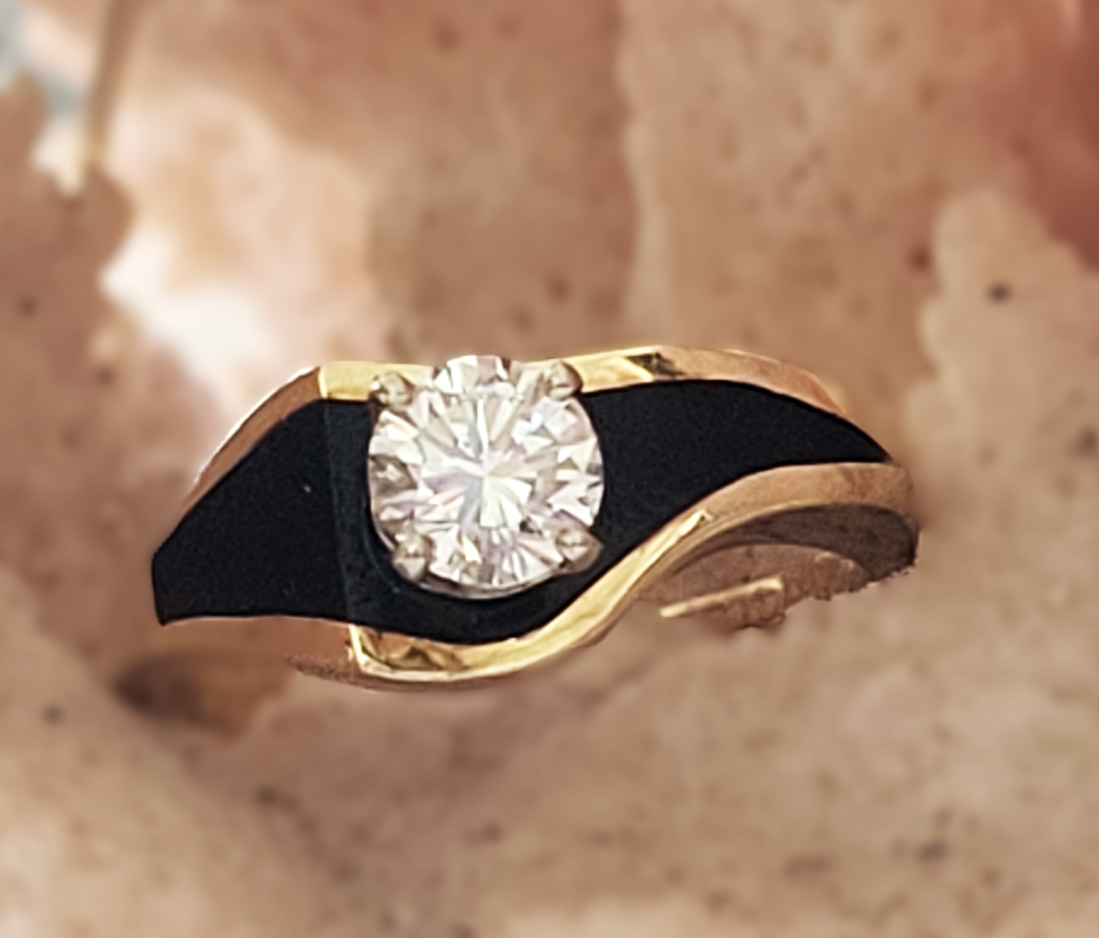 Designed by world-renowned, American sculptor, Bernard K Passman (1929-2007), this 18 karat yellow gold ring is set with sculpted black coral, the medium Mr. Passman is famous for using in his works, and a very exceptional quality earth-mined diamond.  This signed Bernard K Passman creation is called "Wavy". It is a ladies contoured solitaire diamond ring with sculpted black coral inlaid on the top surface with the shape of undulating waves and alluring curves, before sharply plunging down the diamond-bearing shoulder and tapering to an approximate 2.25mm ring shank. For this ring, Mr. Passman chose to set a round, brilliant-cut, natural, VVS2 clarity, H color, earth-mined diamond that weighs approximately one half carat (.50 ct), in a four-prong, white gold head and sturdy basket.  As in almost all of Mr. Passman’s jewelry designs, the initials "BKP" are hand-etched, most likely with a hand-held rotary tool, approximately 1/3rd of the way down the outside shoulder opposite the diamond. This ring is US size 5.5 and is extremely limited to alterations, due to the nature of the black coral.  Please inquire with Bidfair Fine Jewelry for sizing capabilities and associated charges. The provenance of this ring is located at the bottom of this page, along with a brief history of Mr. Passman’s interesting life works.