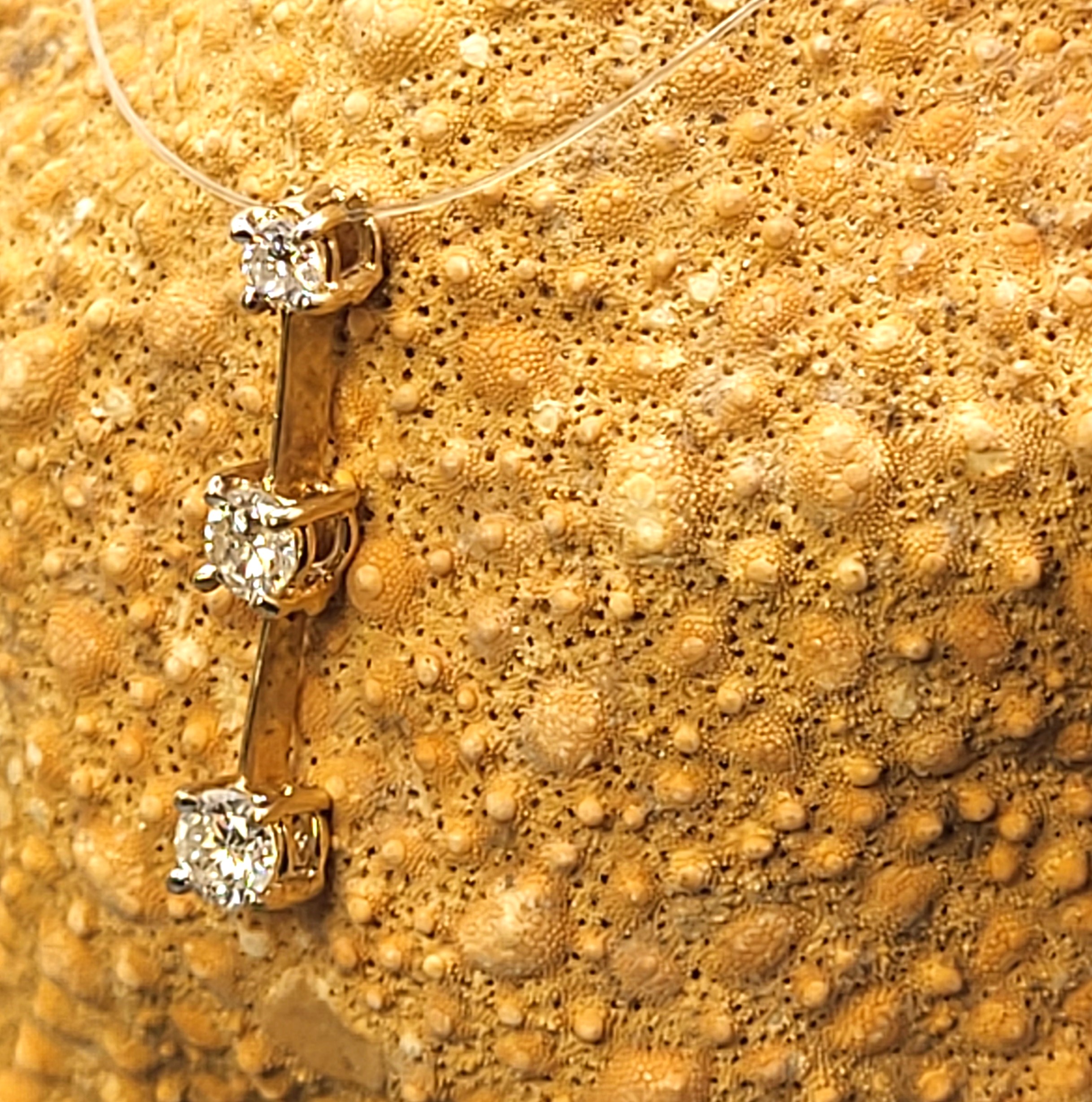 This is a 14 karat yellow gold pendant with three diamonds in a vertical row, that has long been associated with the Past, Present, and Future! There are approximately .60 carats total weight of H, SI2, round, brilliant-cut diamonds. The vertical pendant is constructed with 2 segments that are hinged together, allowing the pendant to move, as a dangling earring would. The pendant is approximately 7/8" long with a built-in bail. The pendant bears the hallmark CI, for Caspian International, a jewelry manufacturing company that is/was in North Carolina. Admin: 12kj329/hh