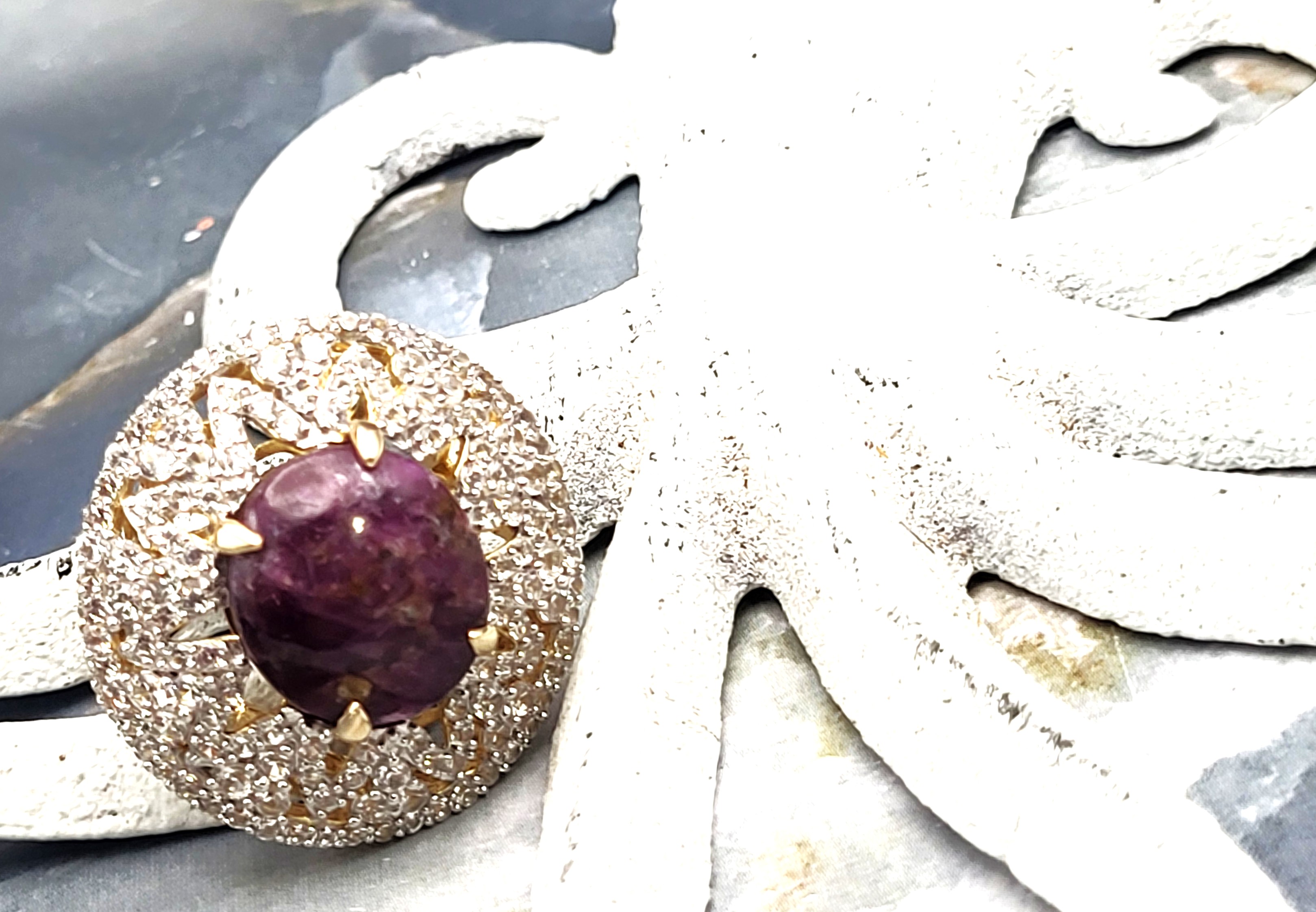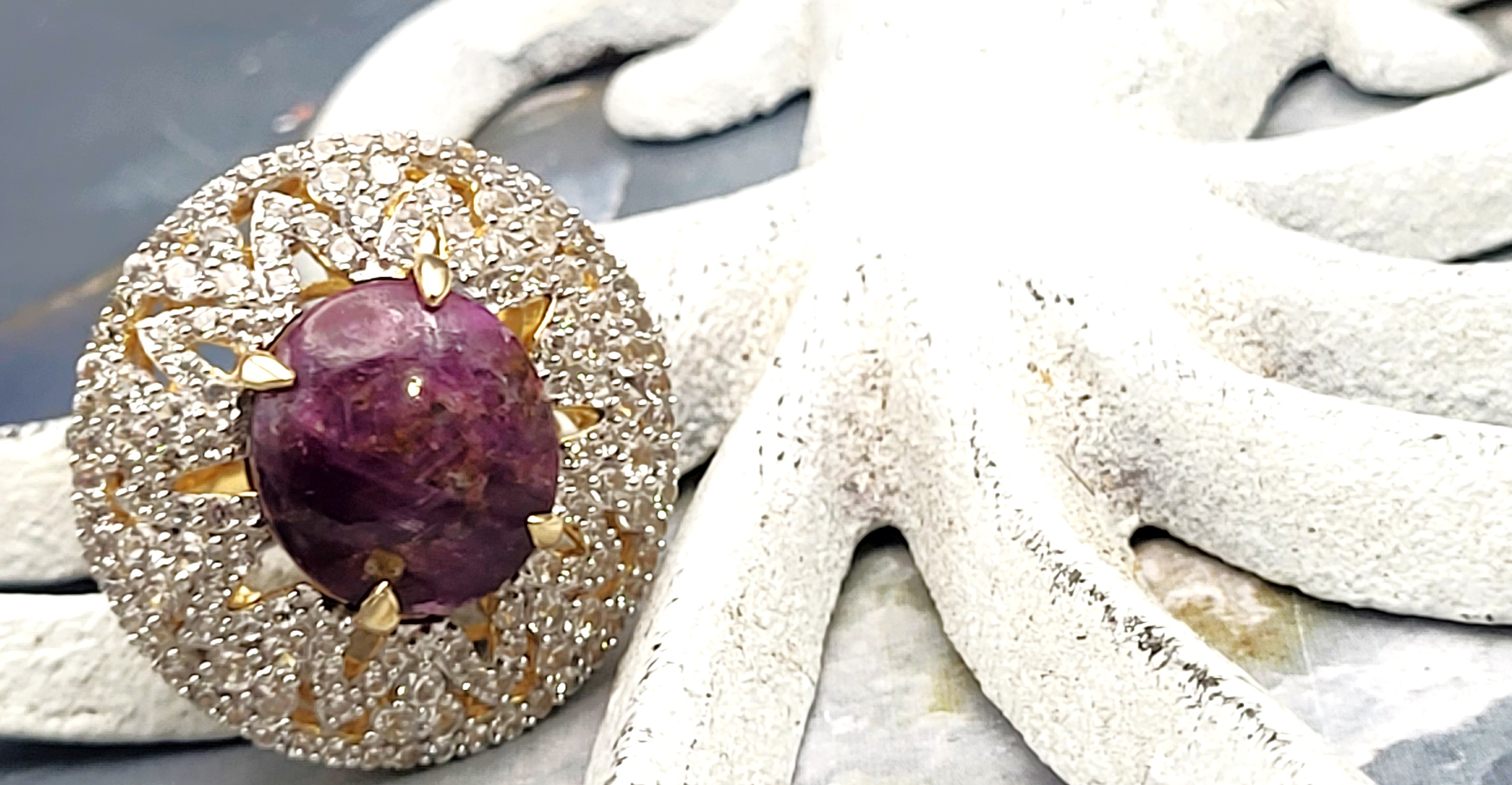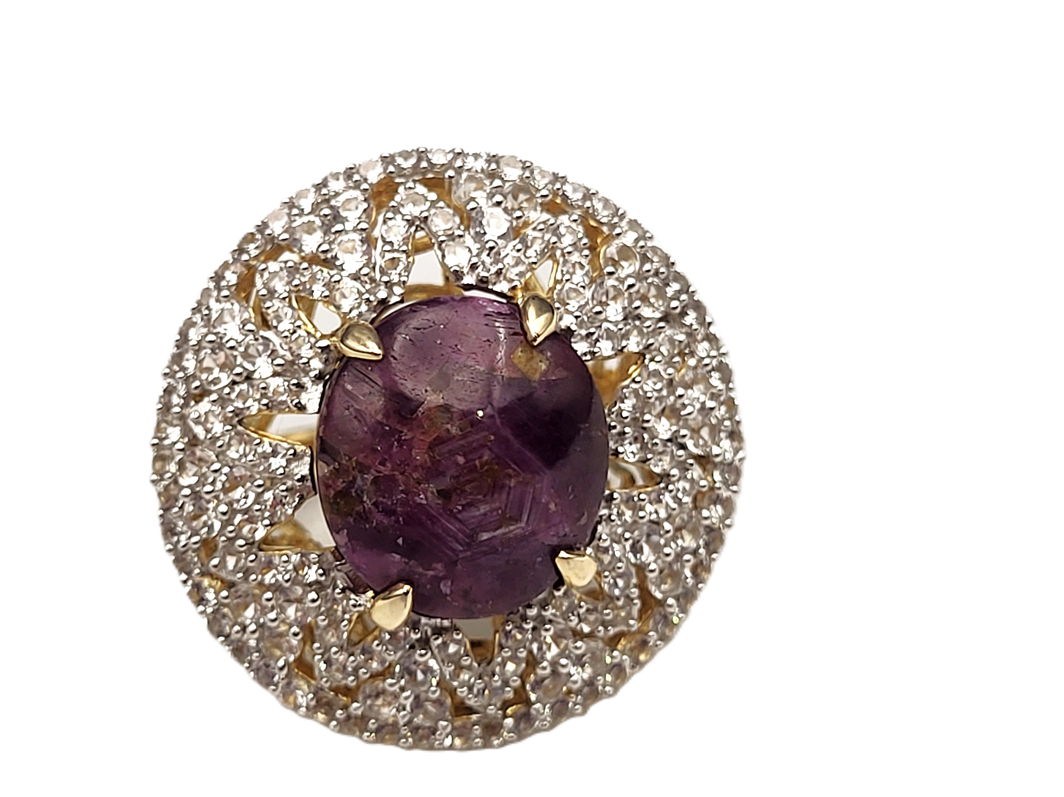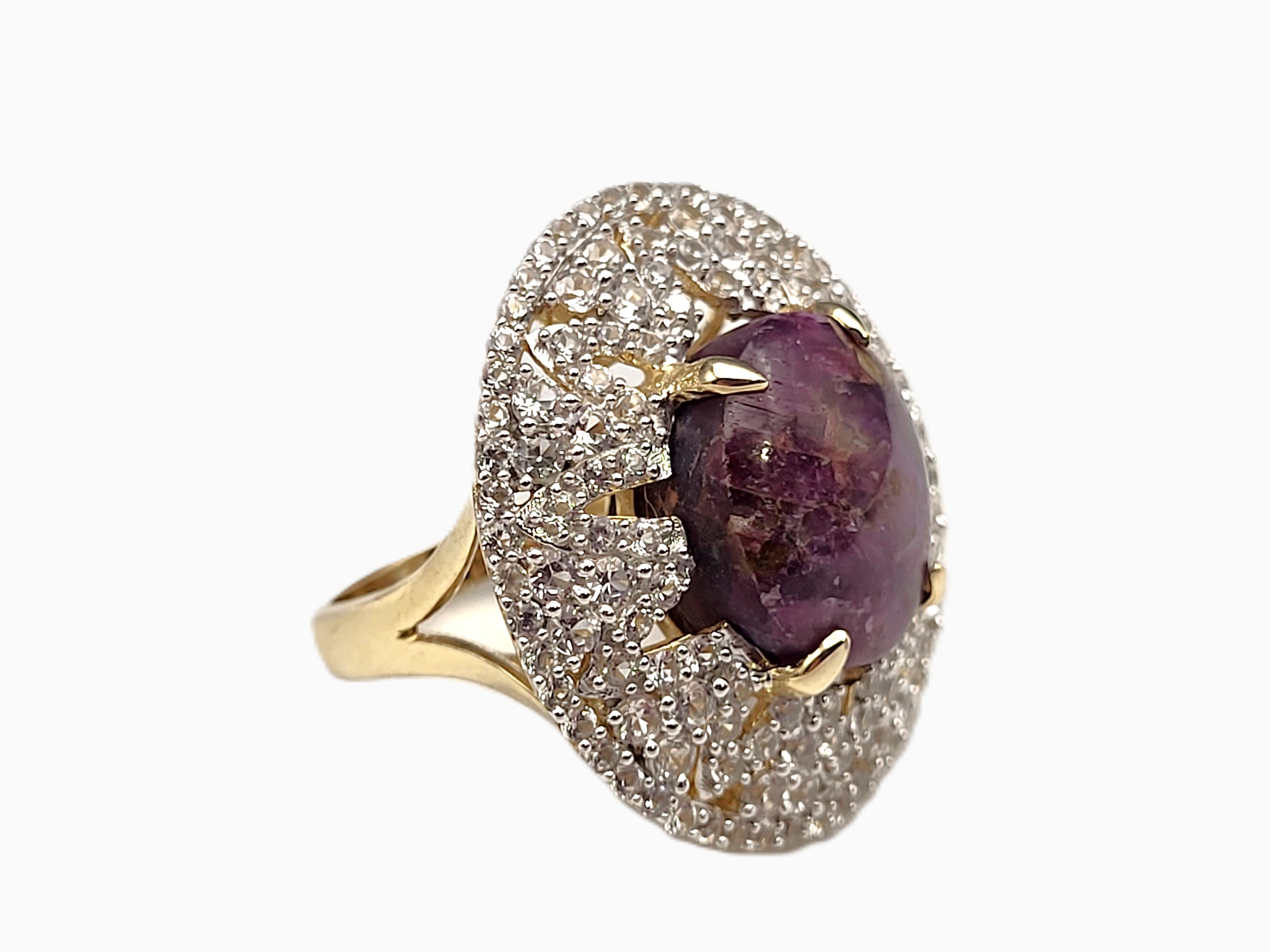 The contrast between the elegant, etoile-style, finely-set, genuine white sapphires and the deep, purplish-red, genuine natural star ruby that would still be considered rough ore, but for the low dome, oval-cut and enough of a polish to expose the faint, 5-ray star, creates a most dynamic statement ring. Pair it with the matching pendant in Lot 145 and the bold statement becomes "Gasp-Worthy"! It is cast in sterling silver with a 14 karat yellow gold overlay and features an approximate 21.00 carat round, cabochon-polished and claw prong set, genuine, certified natural, star ruby that is claw-set in an enormous "skirt", aka triple halo, comprised of 3.90 carats of round, fully faceted, genuine white sapphires. The ring measures approximately 1 1/8" wide at the top of the finger, and balance is assisted by the lovely lattice under gallery that supports the scrolling side gallery and gemstones. The split shoulders taper to a durable ring shank. The ring is US size 8.5. No sizing options are not offered on this ring, but a professional jeweler with the equipment necessary to work on vermeil in your area should be able to adjust the size. Admin: 7159/16-lhh