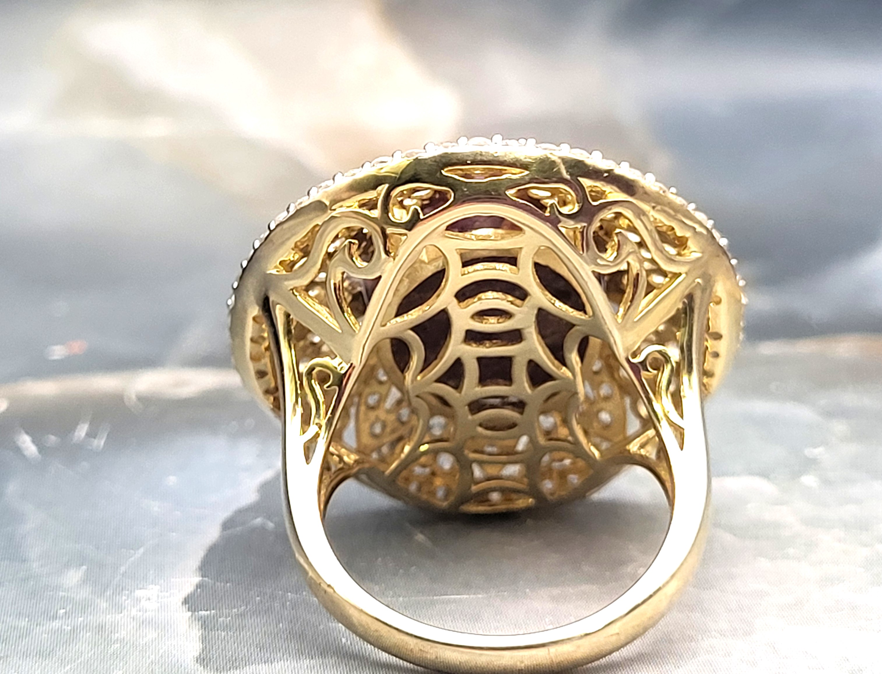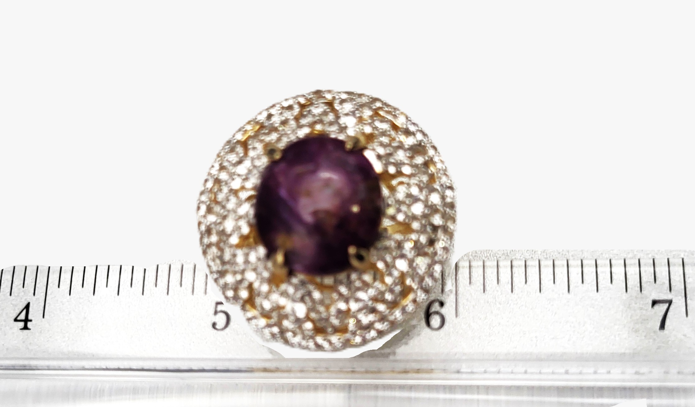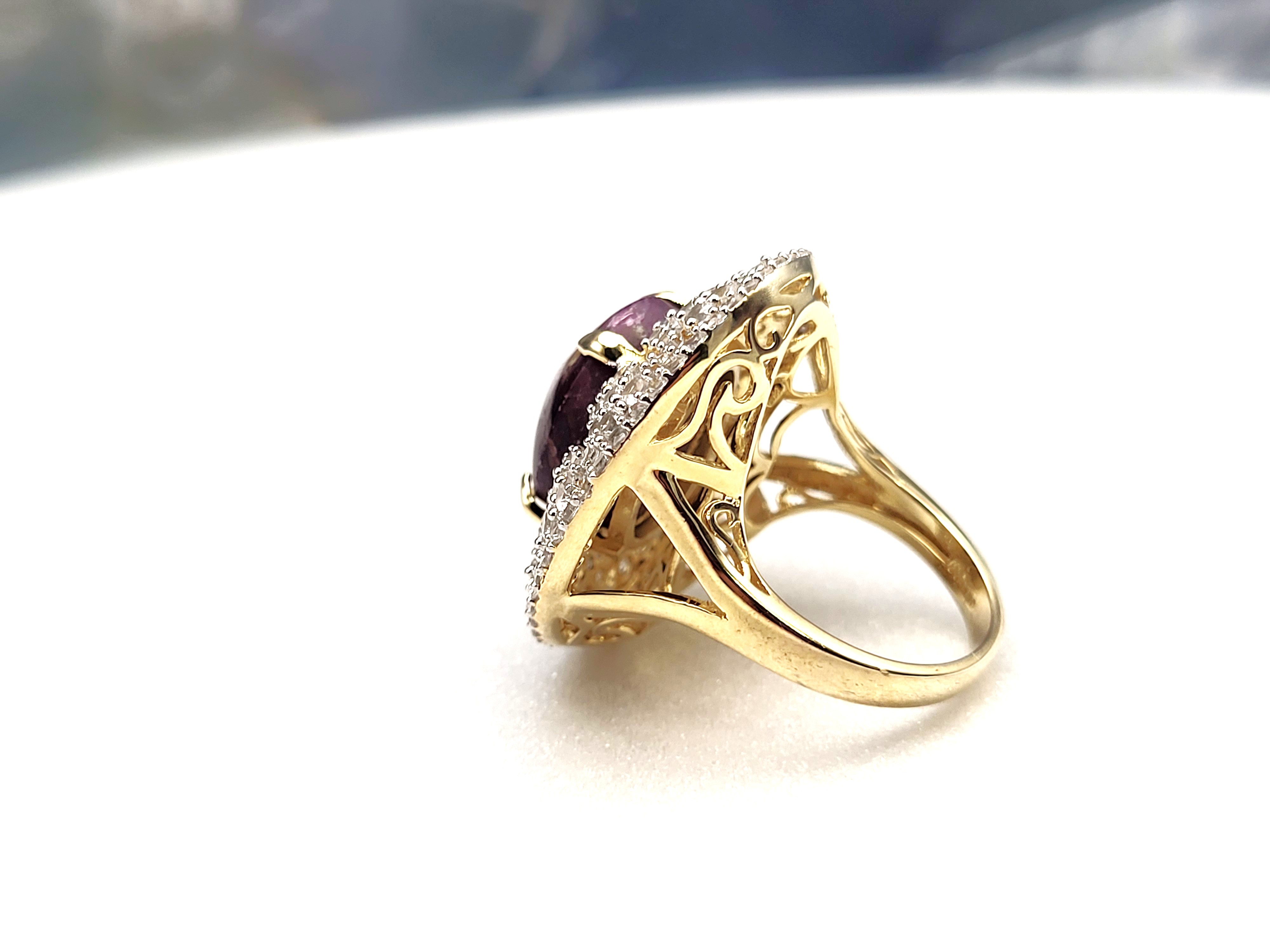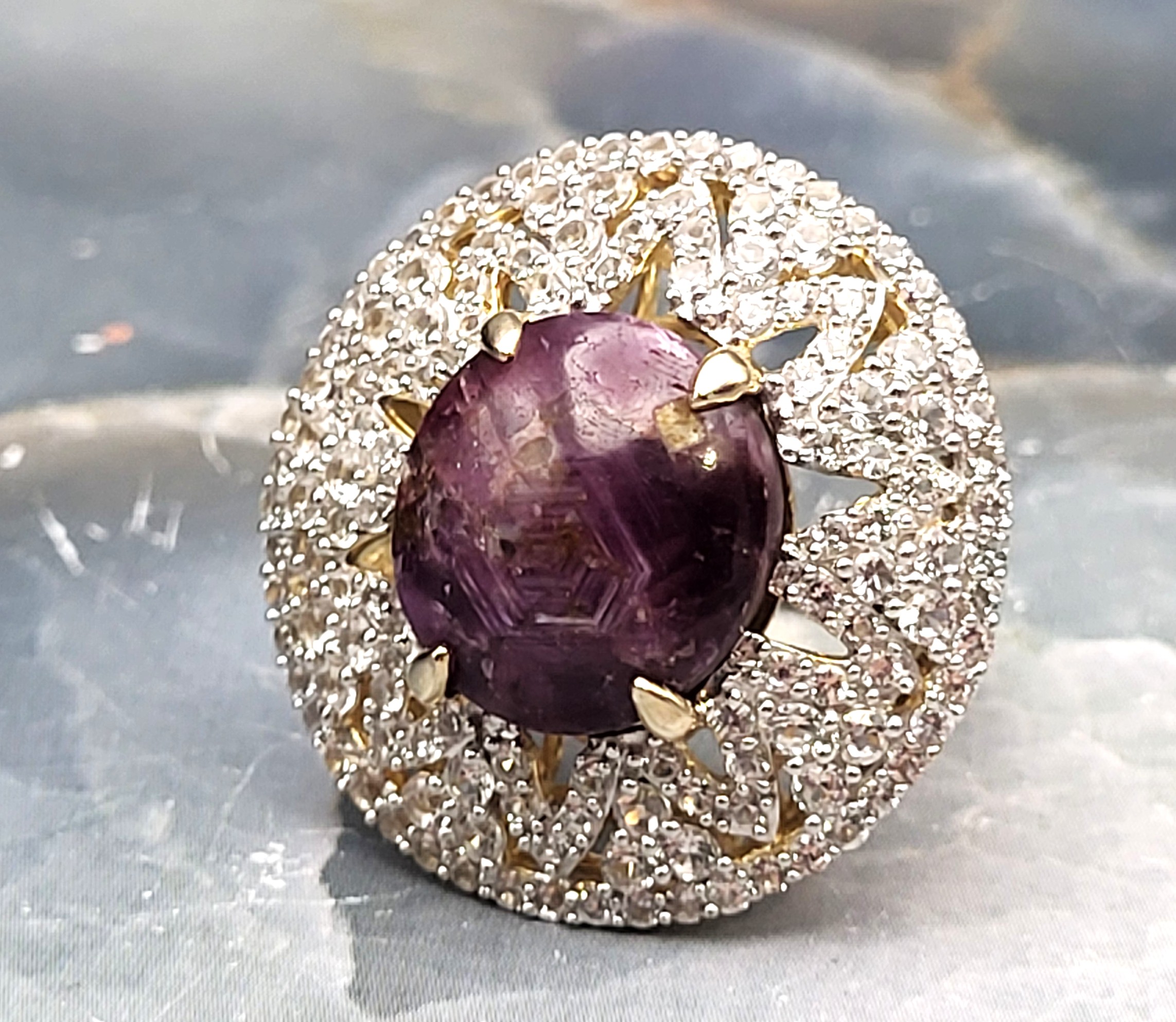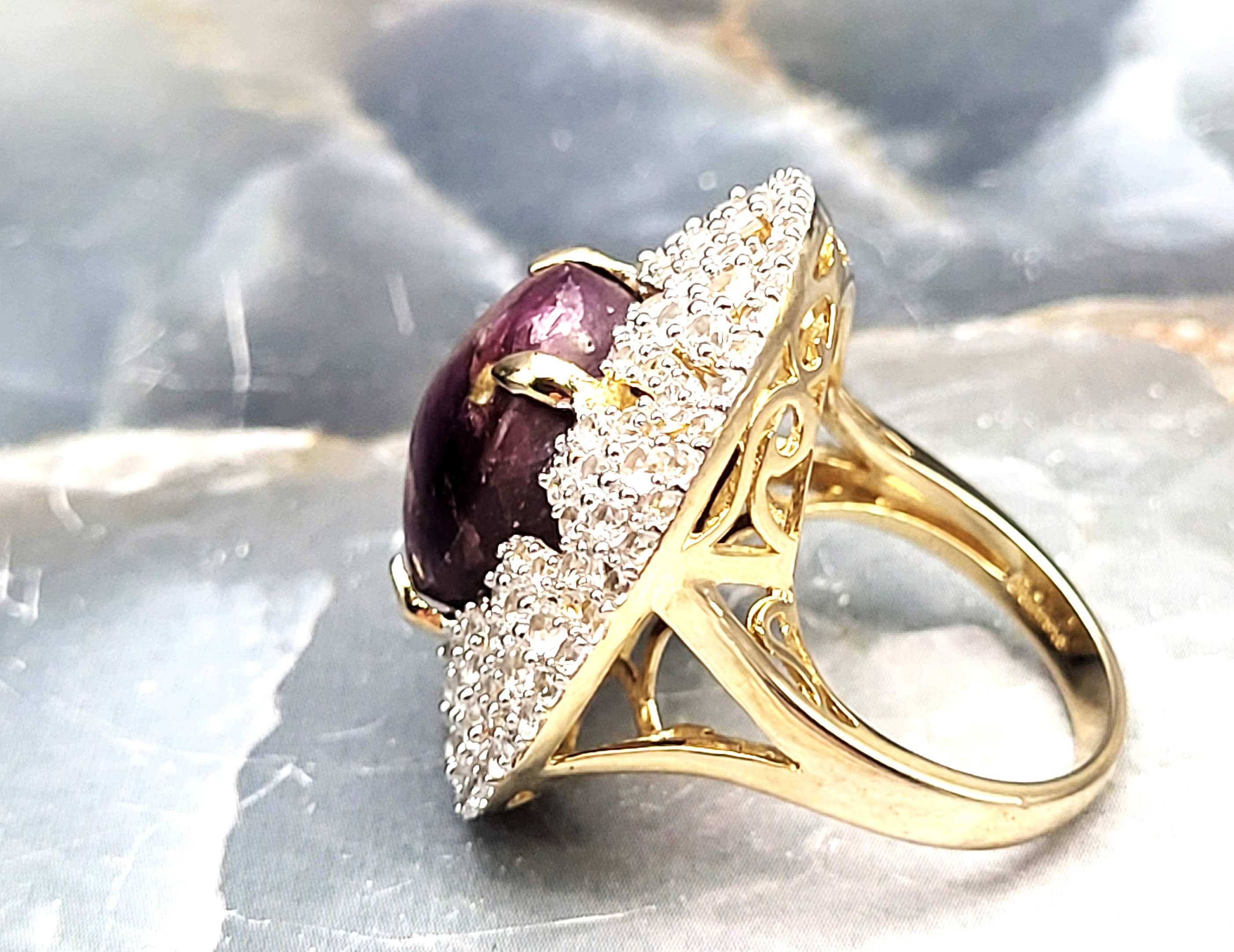 The contrast between the elegant, etoile-style, finely-set, genuine white sapphires and the deep, purplish-red, genuine natural star ruby that would still be considered rough ore, but for the low dome, oval-cut and enough of a polish to expose the faint, 5-ray star, creates a most dynamic statement ring. Pair it with the matching pendant in Lot 145 and the bold statement becomes "Gasp-Worthy"! It is cast in sterling silver with a 14 karat yellow gold overlay and features an approximate 21.00 carat round, cabochon-polished and claw prong set, genuine, certified natural, star ruby that is claw-set in an enormous "skirt", aka triple halo, comprised of 3.90 carats of round, fully faceted, genuine white sapphires. The ring measures approximately 1 1/8" wide at the top of the finger, and balance is assisted by the lovely lattice under gallery that supports the scrolling side gallery and gemstones. The split shoulders taper to a durable ring shank. The ring is US size 8.5. No sizing options are not offered on this ring, but a professional jeweler with the equipment necessary to work on vermeil in your area should be able to adjust the size. Admin: 7159/16-lhh
