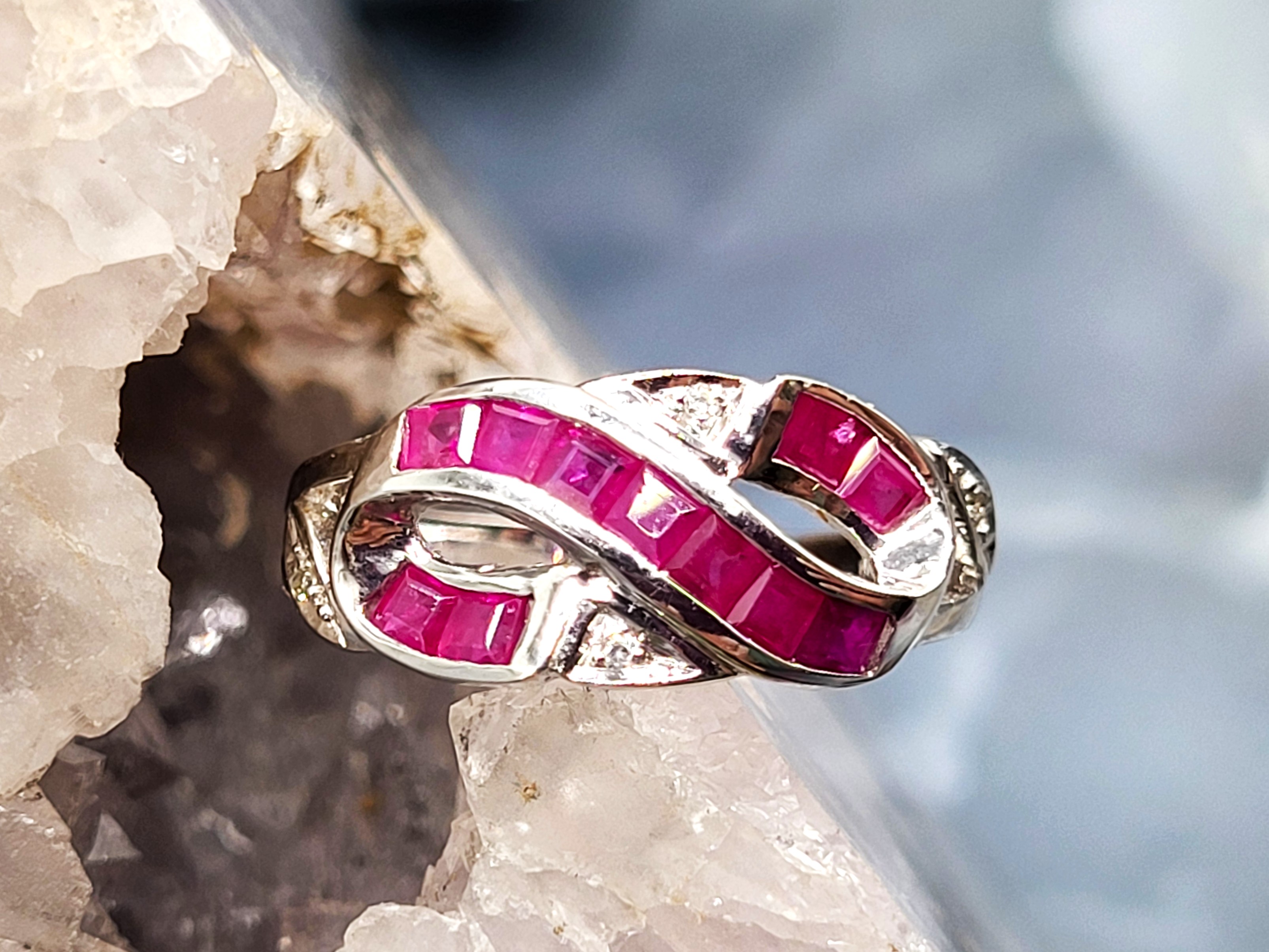 This 14 karat white gold ring features approximately 1.00 carats total weight of square-cut, channel- and invisible-set, genuine rubies with a ribbon-like flow in an infinity symbol pattern. There are four round, faceted accent diamonds for additional sparkle. This ring is US size 7 and can be sized for an additional charge. Please contact Bidfair Fine Jewelry for sizing details.