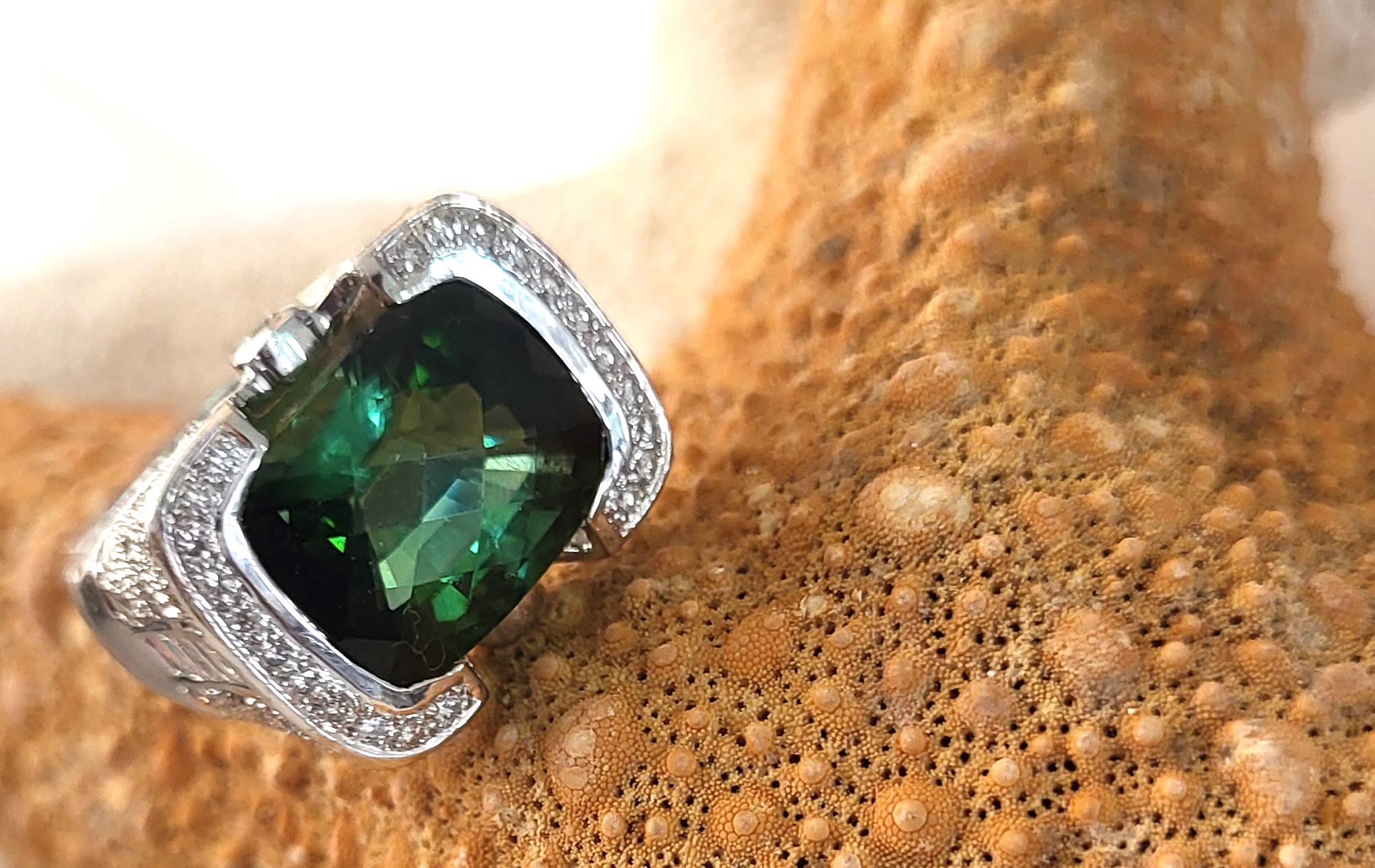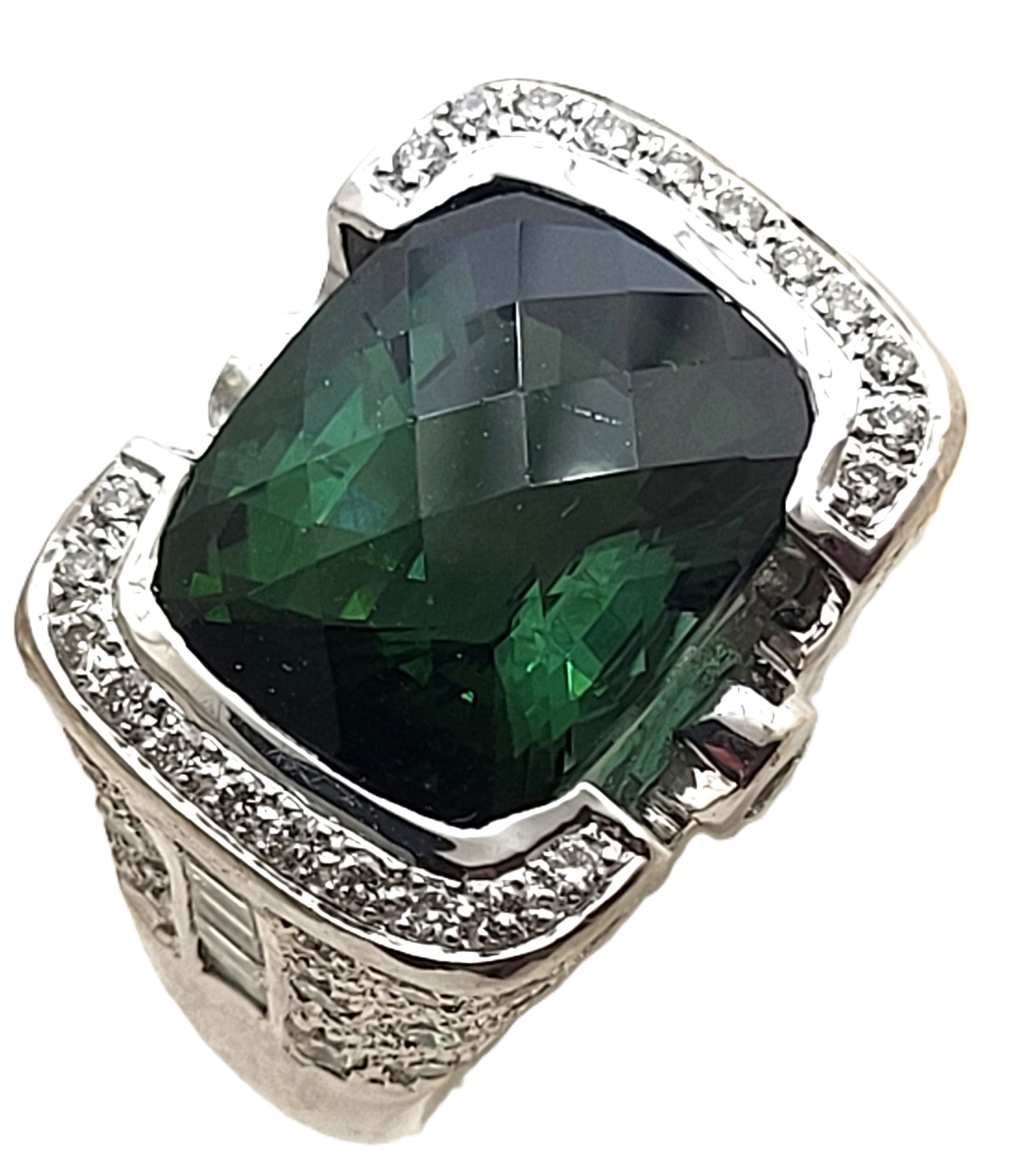 This is a phenomenal ring that is cast in 18 karat white gold and semi-bezel set with an approximate 9.00 carat, antique cushion-cut, top-faceted forest green tourmaline (verdelite) with an East-West orientation with approximately 1.50 carats of round, brilliiant- and baguette cut, approximate H color, SI2 clarity diamonds. The frame of the bezel has bead-set diamonds in a channel and the bridges each have a single bezel-set diamond. The four shoulders have pave’ diamonds and the east and west shoulders have channel-set baguette diamonds. The ring has a supportive gallery beneath the shoulders and bears "JCR" hallmark. The green tourmaline is amazing. It is not so dark that it appears to be black. You can truly see the green emanating from it. And, the design is captivating. The ring is a US size 5.75. See sizing details and other information below. Admin:3310 / 8